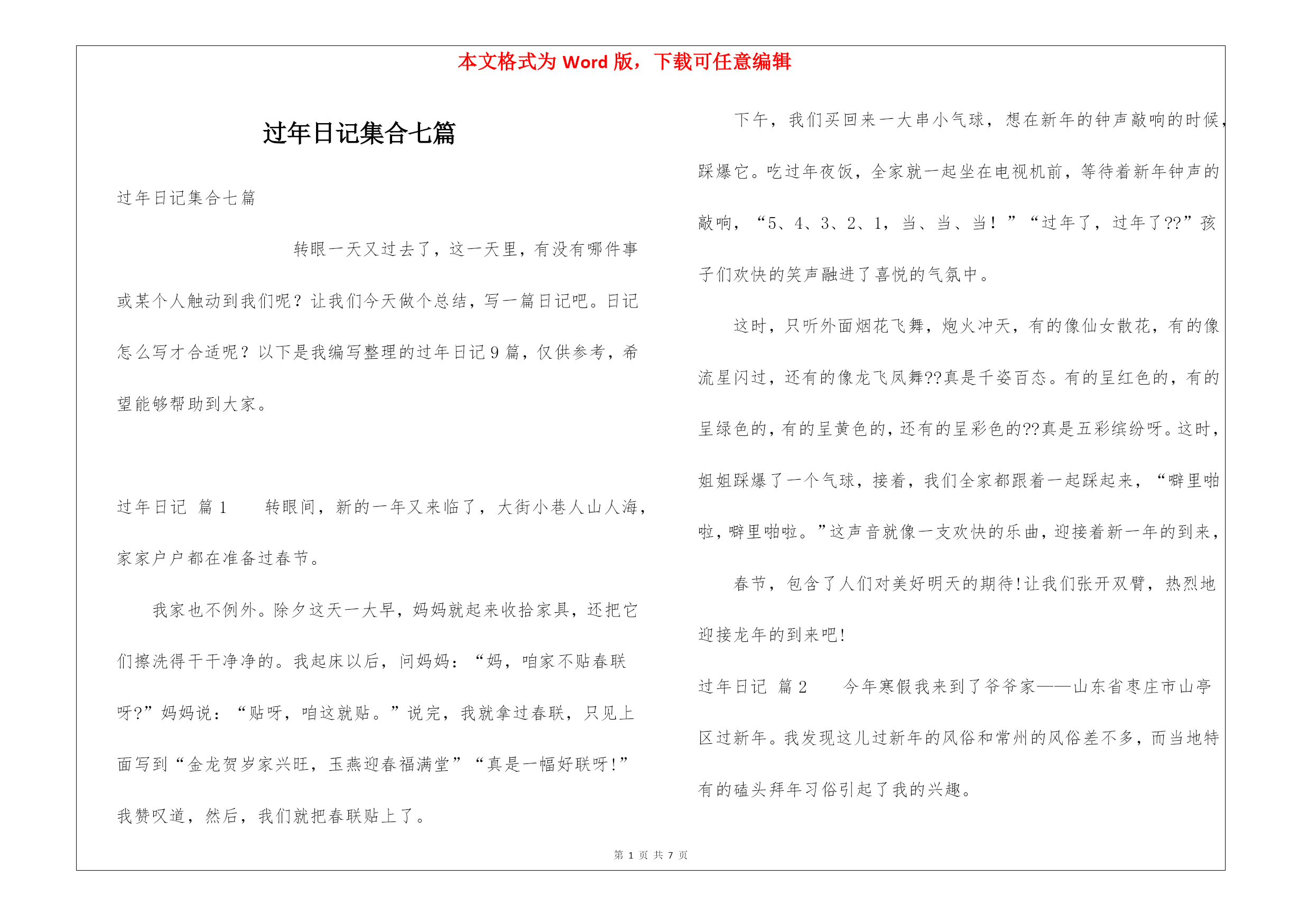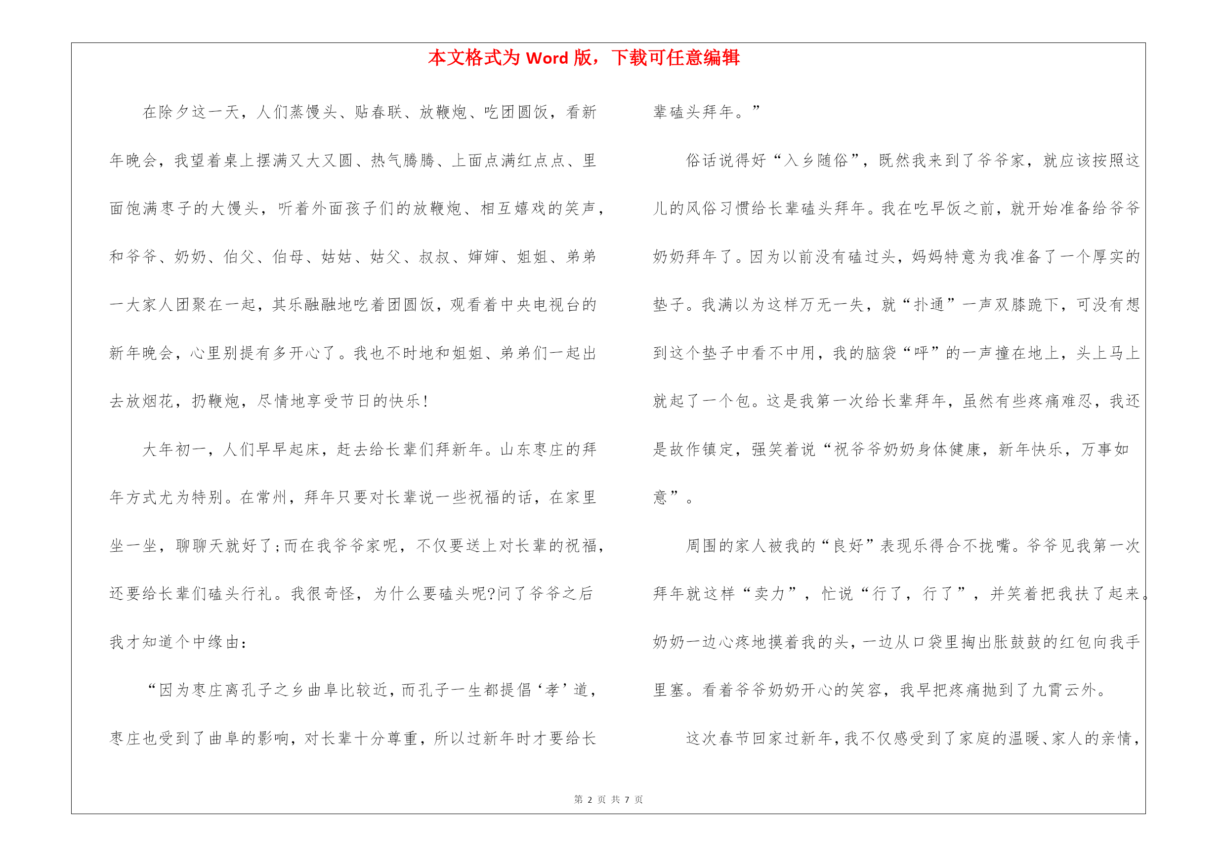 本文格式为Word版,下载可任意编辑第PAGE\*MERGEFORMAT7页共NUMPAGES\*MERGEFORMAT7页过年日记集合七篇过年日记集合七篇转眼一天又过去了,这一天里,有没有哪件事或某个人触动到我们呢?让我们今天做个总结,写一篇日记吧。日记怎么写才合适呢?以下是我编写整理的过年日记9篇,仅供参考,希望能够帮助到大家。过年日记篇1转眼间,新的一年又来临了,大街小巷人山人海,家家户户都在准备过春节。我家也不例外。除夕这天一大早,妈妈就起来收拾家具,还把它们擦洗得干干净净的。我起床以后,问妈妈:“妈,咱家不贴春联呀?”妈妈说:“贴呀,咱这就贴。”说完,我就拿过春联,只见上面写到“金龙贺岁家兴旺,玉燕迎春福满堂”“真是一幅好联呀!”我赞叹道,然后,我们就把春联贴上了。下午,我们买回来一大串小气球,想在新年的钟声敲响的时候,踩爆它。吃过年夜饭,全家就一起坐在电视机前,等待着新年钟声的敲响,“5、4、3、2、1,当、当、当!”“过年了,过年了??”孩子们欢快的笑声融进了喜悦的气氛中。这时,只听外面烟花飞舞,炮火冲天,有的像仙女散花,有的像流星闪过,还有的像龙飞凤舞??真是千姿百态。有的呈红色的,有的呈绿色的,有的呈黄色的,还有的呈彩色的??真是五彩缤纷呀。这时,姐姐踩爆了一个气球,接着,我们全家都跟着一起踩起来,“噼里啪啦,噼里啪啦。”这声音就像一支欢快的乐曲,迎接着新一年的到来,春节,包含了人们对美好明天的期待!让我们张开双臂,热烈地迎接龙年的到来吧!过年日记篇2今年寒假我来到了爷爷家——山东省枣庄市山亭区过新年。我发现这儿过新年的风俗和常州的风俗差不多,而当地特有的磕头拜年习俗引起了我的兴趣。在除夕这一天,人们蒸馒头、贴春联、放鞭炮、吃团圆饭,看新年晚会,我望着桌上摆满又大又圆、热气腾腾、上面点满红点点、里面饱满枣子的大馒头,听着外面孩子们的放鞭炮、相互嬉戏的笑声,和爷爷、奶奶、伯父、伯母、姑姑、姑父、叔叔、婶婶、姐姐、弟弟一大家人团聚在一起,其乐融融地吃着团圆饭,观看着中央电视台的新年晚会,心里别提有多开心了。我也不时地和姐姐、弟弟们一起出去放烟花,扔鞭炮,尽情地享受节日的快乐!大年初一,人们早早起床,赶去给长辈们拜新年。山东枣庄的拜年方式尤为特别。在常州,拜年只要对长辈说一些祝福的话,在家里坐一坐,聊聊天就好了;而在我爷爷家呢,不仅要送上对长辈的祝福,还要给长辈们磕头行礼。我很奇怪,为什么要磕头呢?问了爷爷之后我才知道个中缘由:“因为枣庄离孔子之乡曲阜比较近,而孔子一生都提倡‘孝’道,枣庄也受到了曲阜的影响,对长辈十分尊重,所以过新年时才要给长辈磕头拜年。”俗话说得好“入乡随俗”,既然我来到了爷爷家,就应该按照这儿的风俗习惯给长辈磕头拜年。我在吃早饭之前,就开始准备给爷爷奶奶拜年了。因为以前没有磕过头,妈妈特意为我准备了一个厚实的垫子。我满以为这样万无一失,就“扑通”一声双膝跪下,可没有想到这个垫子中看不中用,我的脑袋“呯”的一声撞在地上,头上马上就起了一个包。这是我第一次给长辈拜年,虽然有些疼痛难忍,我还是故作镇定,强笑着说“祝爷爷奶奶身体健康,新年快乐,万事如意”。周围的家人被我的“良好”表现乐得合不拢嘴。爷爷见我第一次拜年就这样“卖力”,忙说“行了,行了”,并笑着把我扶了起来。奶奶一边心疼地摸着我的头,一边从口袋里掏出胀鼓鼓的红包向我手里塞。看着爷爷奶奶开心的笑容,我早把疼痛抛到了九霄云外。这次春节回家过新年,我不仅感受到了家庭的温暖、家人的亲情,还体验了爷爷家特有的拜年习俗,真是一举两得啊!蛇年春节已过,我期待着马年春节的到来,更期待着与亲人的再一次团聚!过年日记篇3过年了,家家户户的窗子上都贴上了各式各样的窗花,象征着来年的日子红红火火、吉祥如意,深受人们的喜爱。今天,我和几个小伙伴,跟随居委会的阿姨们,一起为一位年迈的奶奶剪窗花。老奶奶住在一栋古老又破旧的房子里,敲开门,看到我们,老奶奶的脸上露出惊讶而又高兴的表情,沧桑而又慈祥的脸上露出了微笑,紧跟着脸上的皱纹立刻聚集在一起,眼睛眯成了一条线。我们坐在炕上,拿起居委会准备的红纸,开始为老奶奶剪窗花。我不是特别会剪,只是随着事先折出来的线,慢慢地剪,生怕剪错,不一会一个“福”字就从我的剪刀下出现,我还在脑海里仔细寻找合适的图案来给这个窗花加点装饰,让这个福字变得更加漂亮。哇,我终于剪成了一个漂亮的窗花了,有漂亮的花边,还有弯曲的小蛇。记者问我的窗花有什么含义?我说祝福老奶奶蛇年吉祥如意,幸福安康。然后把窗花贴在窗玻璃上,又开始第二张作品。这时,其他人的作品也陆陆续续地完成了,有连环苹果、连环小人、长狗等等,令人眼花撩论、赏心悦目。老奶奶仔细端详着这些漂亮的窗花,夸口不绝,还有这么多活泼可爱的小朋友的'陪伴,脸上露出了幸福的笑容,眼神里