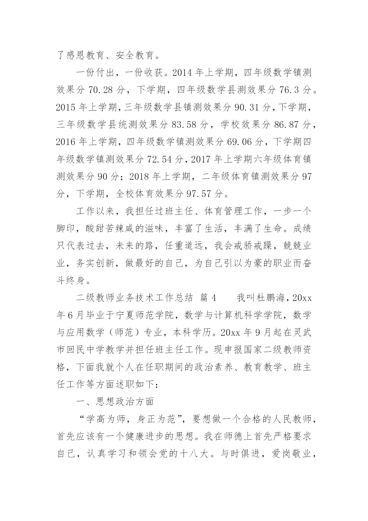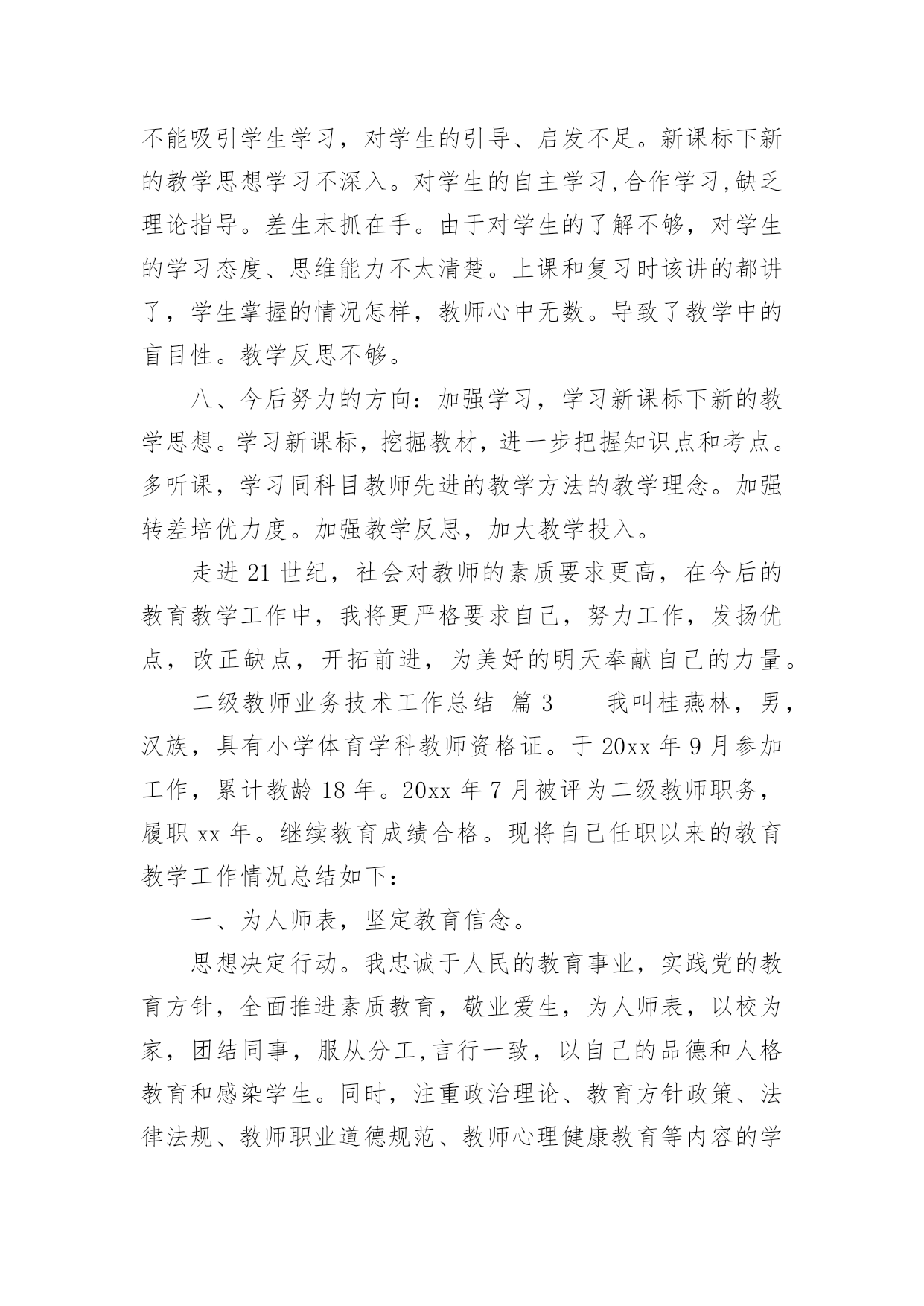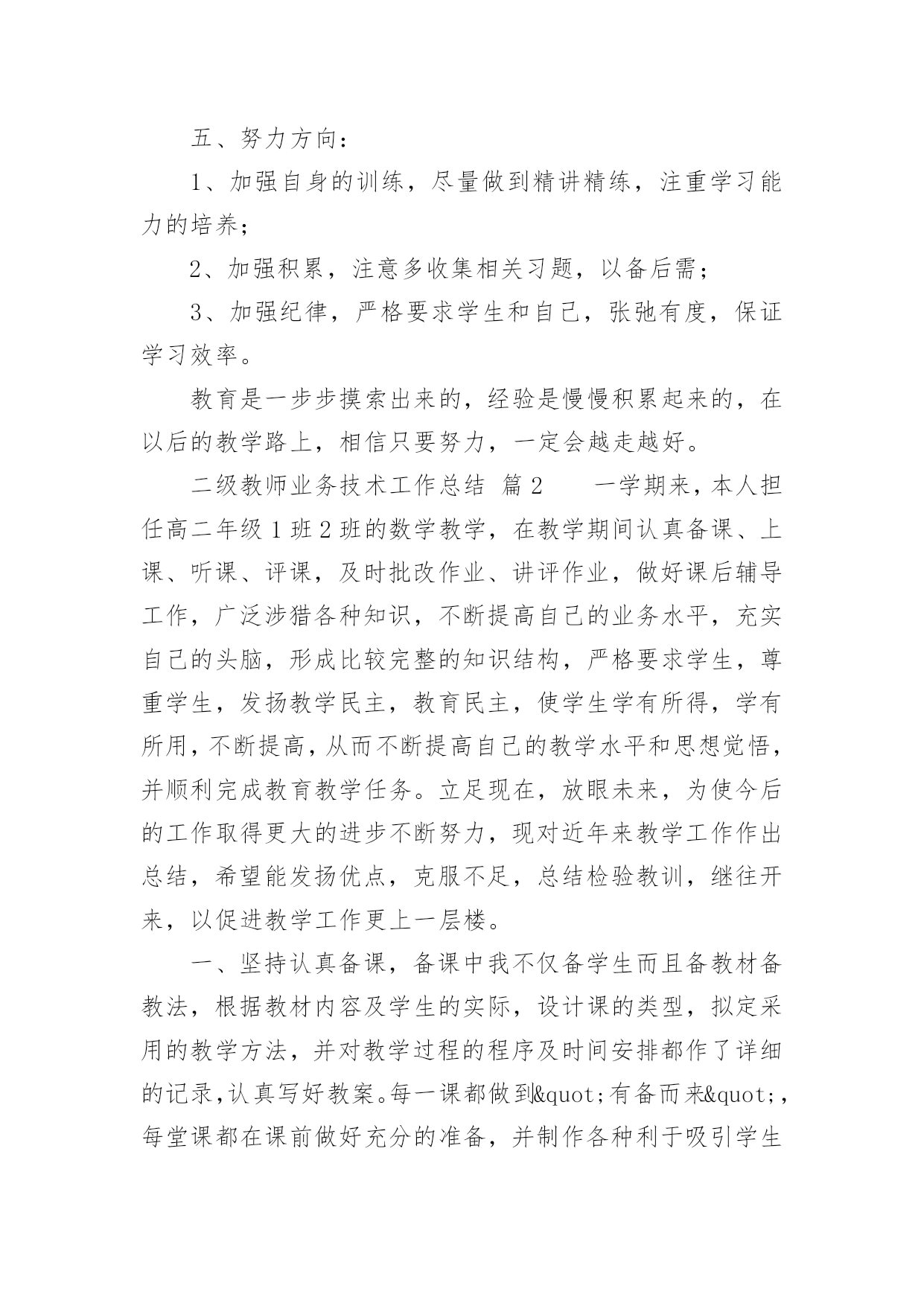 二级教师业务技术工作总结二级教师业务技术工作总结(精选18篇)时光在流逝,从不停歇,一段时间的工作已经结束了,回顾坚强走过的这段时间,取得的成绩实则来之不易,不妨坐下来好好写写工作总结吧!相信很多朋友都不知道工作总结该怎么写吧,下面是小编精心整理的二级教师业务技术工作总结,仅供参考,希望能够帮助到大家。二级教师业务技术工作总结篇1本学期我担任高二(4、5、6、9、10)班的地理教学工作,并肩负着其中三个理科班的会考任务,任务艰巨。一学期来,本人认真备课、上课、听课、评课,及时批改作业、讲评作业,做好课后辅导工作,广泛涉猎各种知识,形成比较完整的知识结构,严格要求学生,尊重学生,发扬教学民主,使学生学有所得,不断提高,从而不断提高自己的教学水平和思想觉悟,并顺利完成教育教学任务。现将一学期来的工作情况做个总结:一、统筹规划,制定学期工作进度,严格按计划进行对于理科班而言,本学期的教学任务比较多,除了完成必修三的学习外,还必须参加会考,从而必须再把三本必修重新复习,结合纲要的练习,最后还得进行模拟训练,课时不多,非常紧张,所以要求必须严格按照计划进行。必修二与三,背诵部分较多,可以整个知识结构即可让学生自行背去,可不用花费太多时间,必修一重在理解,需要结合更多的练习加强训练和巩固。二、提高教学质量,把好练习关,即时反馈在第一轮复习时就应尽量做到基本扫盲,及时对纲要题目进行讲解,并严格抓好学生的笔记关;在第二轮复习时则重点讲,尤其在给差生进行扶差时,应抓住重点,不应在过多顾及全面,避免事倍功半,差生的练习要更多,可多次重复简单的题型,而后逐渐提高难度。纲要的某些题目也要重点讲,尤其是可能的变形题。关于必修一的扶差最好提早进行,避免影响后面的进度,要让学生有学习的成就感,提高学习兴趣。应及时把握好学生的学习反馈情况,并进行相应的调整,确保学生跟上。三、积极参与听课、评课,虚心向同行学习教学方法,博采众长,提高教学水平。由于是第一次带会考,经验不足,如何安排会考进度,如何抓好会考,如何处理学生的学习问题等等,都成了我的重大问题,因此必须请教其他有经验的老师,感谢老师们的不吝赐教,让我获益不少。四、善于发挥学生的作用,生生帮扶学生在一起的时间比我们长,让学生来带学生,有时比我们老师的辅导来得更容易接受,而且更容易把握学习进度。两者相互促进,有助于形成良好的学习氛围,从而带动班级学习情绪。尤其在会考当中,班级多,差生也多,老师不可能全面顾及到,因此,应积极发挥学生的作用,提高学习效率。五、努力方向:1、加强自身的训练,尽量做到精讲精练,注重学习能力的培养;2、加强积累,注意多收集相关习题,以备后需;3、加强纪律,严格要求学生和自己,张弛有度,保证学习效率。教育是一步步摸索出来的,经验是慢慢积累起来的,在以后的教学路上,相信只要努力,一定会越走越好。二级教师业务技术工作总结篇2一学期来,本人担任高二年级1班2班的数学教学,在教学期间认真备课、上课、听课、评课,及时批改作业、讲评作业,做好课后辅导工作,广泛涉猎各种知识,不断提高自己的业务水平,充实自己的头脑,形成比较完整的知识结构,严格要求学生,尊重学生,发扬教学民主,教育民主,使学生学有所得,学有所用,不断提高,从而不断提高自己的教学水平和思想觉悟,并顺利完成教育教学任务。立足现在,放眼未来,为使今后的工作取得更大的进步不断努力,现对近年来教学工作作出总结,希望能发扬优点,克服不足,总结检验教训,继往开来,以促进教学工作更上一层楼。一、坚持认真备课,备课中我不仅备学生而且备教材备教法,根据教材内容及学生的实际,设计课的类型,拟定采用的教学方法,并对教学过程的程序及时间安排都作了详细的记录,认真写好教案。每一课都做到"有备而来",每堂课都在课前做好充分的准备,并制作各种利于吸引学生注意力的有趣教具,课后及时对该课作出总结,写好教学小记。二、努力增强我的上课技能,提高教学质量,使讲解清晰化,条理化,准确化,条理化,准确化,情感化,生动化,做到线索清晰,层次分明,言简意赅,深入浅出。在课堂上特别注意调动学生的积极性,加强师生交流,充分体现学生的主作用,让学生学得容易,学得轻松,学得愉快;注意精讲精练,在课堂上老师讲得尽量少,学生动口动手动脑尽量多;同时在每一堂课上都充分考虑每一个层次的学生学习需求和学习能力,让各个层次的学生都得到提高。现在学生普遍反映喜欢上数学课,就连以前极讨厌数学的学生都乐于上课了。三、与同事交流,虚心请教其他老师。在教学上,有疑必问。在各个章节的学习上都积极征求其他老师的意见,学习他们的方法,同时,多听老师的课,做到边听边讲,学习别人的优点,克服自己的不足,并常常邀请其他老师来听课,征求他们的意见,改进工作。四、完善批改作业:布置作业做到精读精练。有针