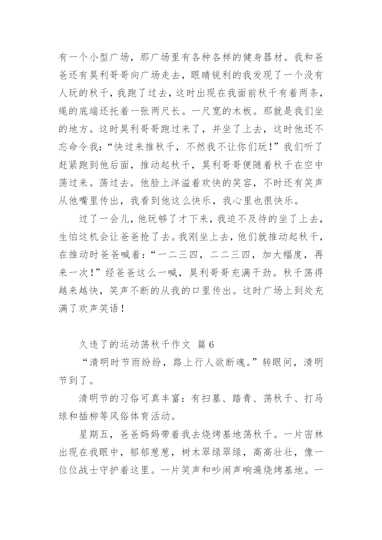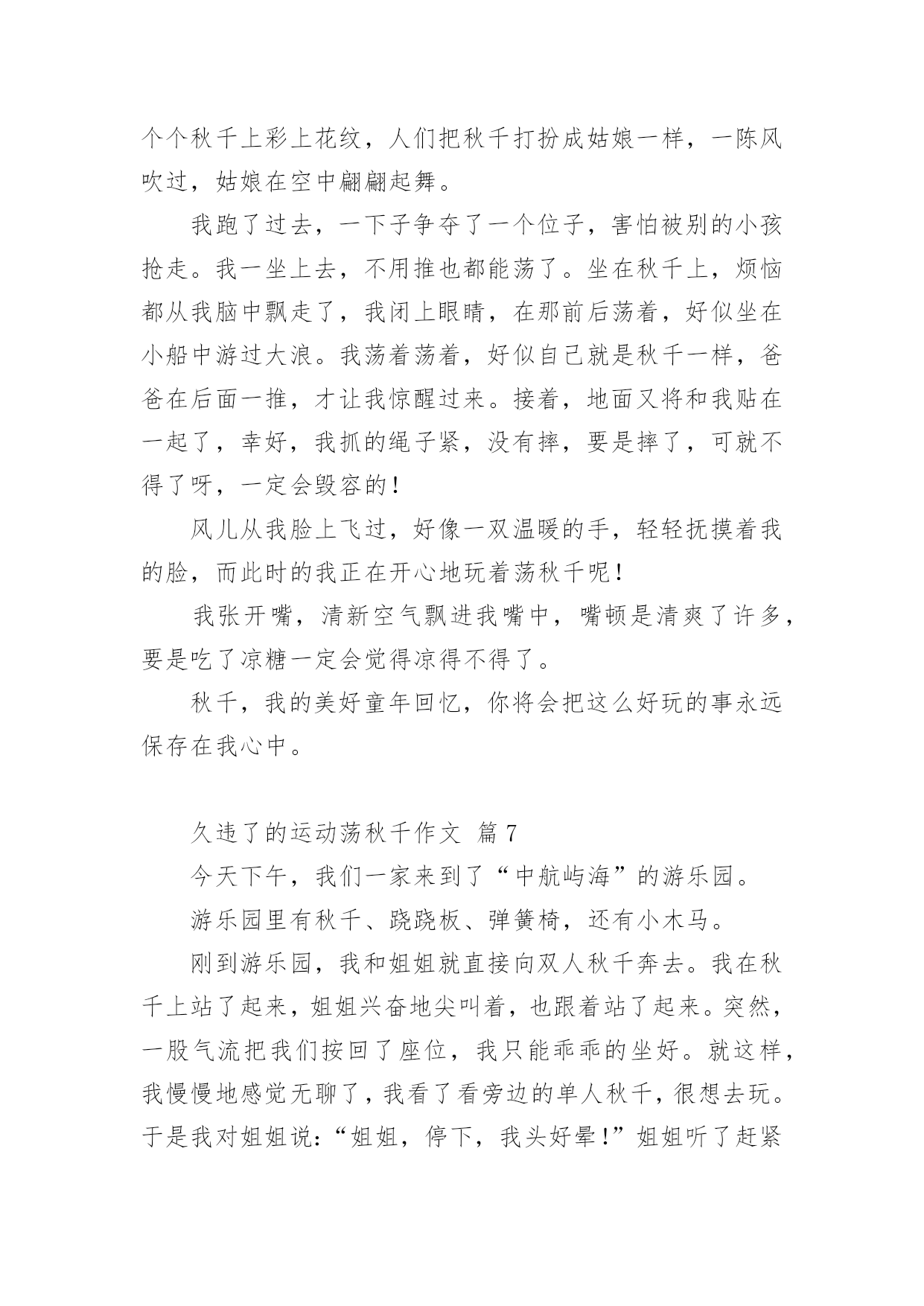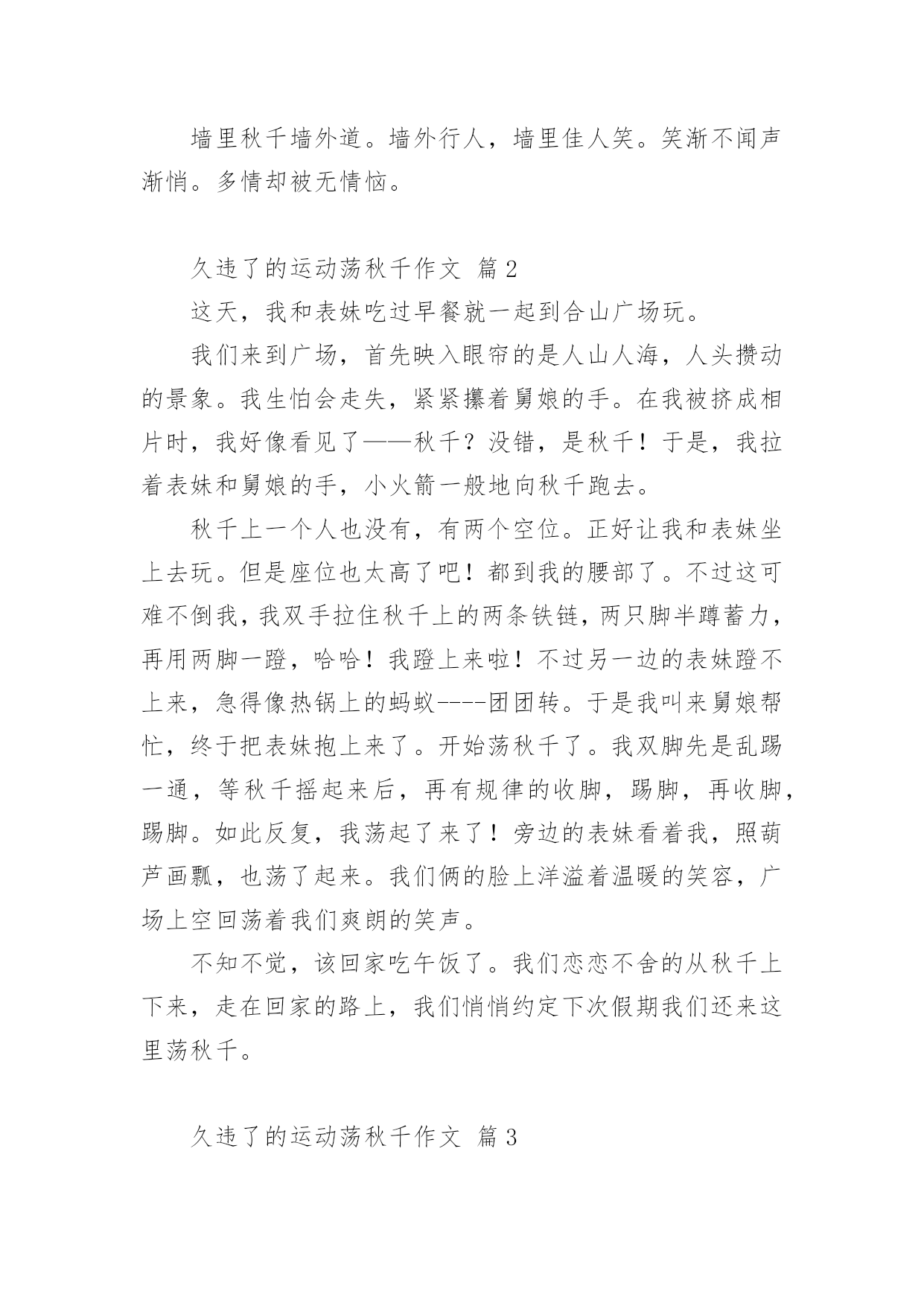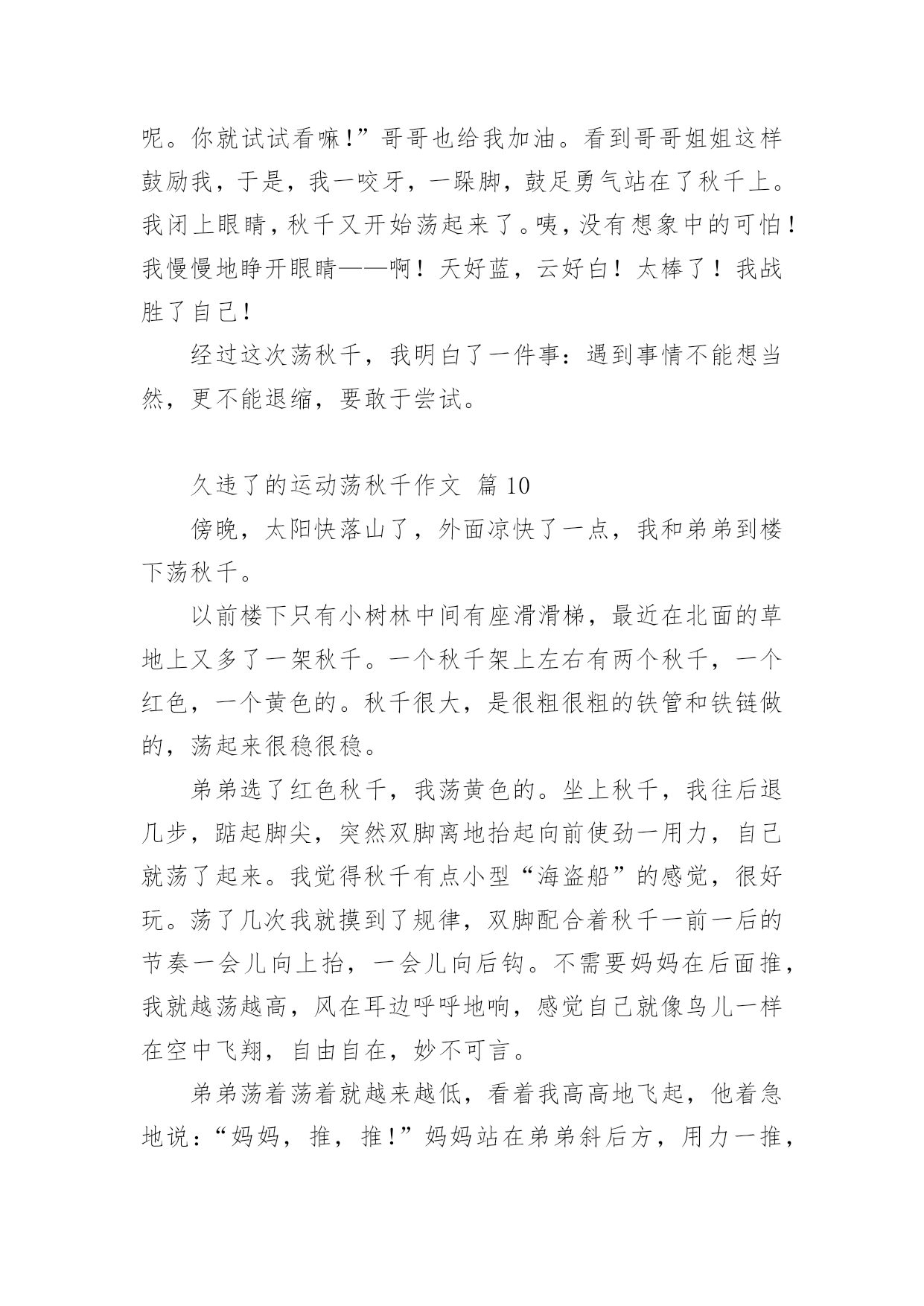 久违了的运动荡秋千作文久违了的运动荡秋千作文(精选21篇)在日常学习、工作和生活中,说到作文,大家肯定都不陌生吧,根据写作命题的特点,作文可以分为命题作文和非命题作文。还是对作文一筹莫展吗?下面是小编为大家收集的久违了的运动荡秋千作文,仅供参考,欢迎大家阅读。久违了的运动荡秋千作文篇1过年时,石路几个人来了兴致,齐心协力,在龙拱桥下的稻田里,竖起了一架久围了的秋千。昨日下午,小外甥散步至此,见此晃荡的秋千,顿觉兴奋。玩耍了一阵后,因等待的人多,不可独占,而又意犹未尽,只得怏怏而归,放下话儿,明早七点,叫上我外公,带我来玩过够。我既受他所托,七点准时将他叫醒,谁知他竟因天冷不去为由,赖得爬起床来。那知我刚读出“言必信,行必果”后,只看他一骨碌就爬起了床。尔后迅速漱洗,俩人一路向目的地走去。竖秋千的稻田离家不远,大约也就三五百来米,已入春季,太阳公公刚冒出山峦,已露出了圆圆的,彤红彤红的脸。早晨的晨曦,给大地罩上了一层淡淡的金色。使得龙拱桥桥下的流水,波光绚丽,也像镀上了一层薄薄的金。秋千是由两组三棵大树,梱绑成两个三角架来组成,上面置一横梁。过去是要在横梁上钉上竹片当钉子,用来固定两个梱草绳的篾圈圈。现在方便多了,直接把两根小儿手臂粗的麻绳子梱上去,它既结实而一又省却了许多麻烦。外甥计划还是对路的,这时候的大人还不得闲,小孩还不出门。可惜的是,这个平时劲头来了,不管你多强势,多高大,就是打不赢都要打的八岁娃儿,竟然不敢站着荡秋千。他只能坐着要我推送,凭着惯性荡秋千,而且荡时还不宜推送得太高,否则他就会发出恐怖的尖叫。因为麻绳太粗,手掌握力有点吃力,再加上手掌有点冰凉,荡不了几分钟就要下来把手搓热一下。同时告诉我,在空中荡起来时,就有想撒尿的感觉,我想,这可能就是轻微失重的身体反应。趁秋千空闲之时,我也站在秋千上,想来体验一把年轻时荡秋千的风采。谁知一站上去,抓紧麻绳,两腿一蹲,本想用力一蹬,使秋千慢慢荡起来。那晓得两腿一蹲,双膝就发酸发软,根本不听使唤了,这才知道,岁月不饶人,过去已成梦。然而,外甥通过几次训练,胆儿也大了,荡的高度也高了,再也不会发出尖叫了,还有的就是,在空中再也没有想撒尿的感觉了。从此看来,也的确是进步了。一进步,一退步如此交换之快,也许就是淘汰生命的自然法则吧!偶尔想起,苏轼的《蝶恋花·春景》来作结尾。花褪残红青杏小。燕子飞时,绿水人家绕。枝上柳绵吹又少。天涯何处无芳草。墙里秋千墙外道。墙外行人,墙里佳人笑。笑渐不闻声渐悄。多情却被无情恼。久违了的运动荡秋千作文篇2这天,我和表妹吃过早餐就一起到合山广场玩。我们来到广场,首先映入眼帘的是人山人海,人头攒动的景象。我生怕会走失,紧紧攥着舅娘的手。在我被挤成相片时,我好像看见了——秋千?没错,是秋千!于是,我拉着表妹和舅娘的手,小火箭一般地向秋千跑去。秋千上一个人也没有,有两个空位。正好让我和表妹坐上去玩。但是座位也太高了吧!都到我的腰部了。不过这可难不倒我,我双手拉住秋千上的两条铁链,两只脚半蹲蓄力,再用两脚一蹬,哈哈!我蹬上来啦!不过另一边的表妹蹬不上来,急得像热锅上的蚂蚁----团团转。于是我叫来舅娘帮忙,终于把表妹抱上来了。开始荡秋千了。我双脚先是乱踢一通,等秋千摇起来后,再有规律的收脚,踢脚,再收脚,踢脚。如此反复,我荡起了来了!旁边的表妹看着我,照葫芦画瓢,也荡了起来。我们俩的脸上洋溢着温暖的笑容,广场上空回荡着我们爽朗的笑声。不知不觉,该回家吃午饭了。我们恋恋不舍的从秋千上下来,走在回家的路上,我们悄悄约定下次假期我们还来这里荡秋千。久违了的运动荡秋千作文篇3今天晚上妈妈去打针,我和小姨去世景园荡秋千。在那里我和小姨玩双飞(两个人一起荡秋千,)玩着玩着,有个小朋友向我走过来了。她说她想玩秋千,我就把秋千让给了她。然后我就去玩别的了,玩了十几分钟我又回到了荡秋千的地方。我对那小朋友说“我也想玩秋千”,她说“不”。然后那个小朋友的妈妈说“你们可以每人荡十下”我去找其他小朋友一起玩荡秋千。我给秋千旁边的那个小朋友说“我们可以一起玩他说吗?”“行”我就和他一起玩,我骑着车子他来追我,我就骑到小姨那里。小姨开玩笑说“打劫”,我就直接骑了过去。昨天下午,舅舅带我和表妹到翠湖公园玩。公园有跳跳床,打地鼠,旋转木马,独木桥,荡秋千......我和表妹同时看到了秋千,我们高兴的飞奔过去。我最喜欢玩荡秋千。我站在木板上,双手紧紧抓住秋千两边的绳子,双脚同时用力一蹬,秋千就荡起来了。我不断地蹬,秋千越荡越高。我觉得耳边有呼呼的声音,我好象一只蝴蝶展开翅膀,在天空中飞舞,紧张的心情一下子放松了。我玩得愉快极了!可是妹妹就很害怕,只能坐在上面,让舅舅在后面推着她。我嘲笑妹妹胆子小,妹妹却生气的撅着嘴。昨天玩的真开心呀,我最喜欢玩荡秋千了!久违了的运动荡秋千作文篇4面对我