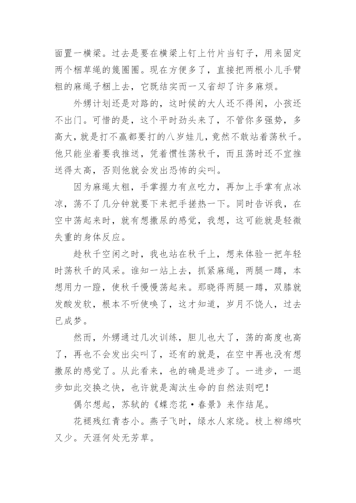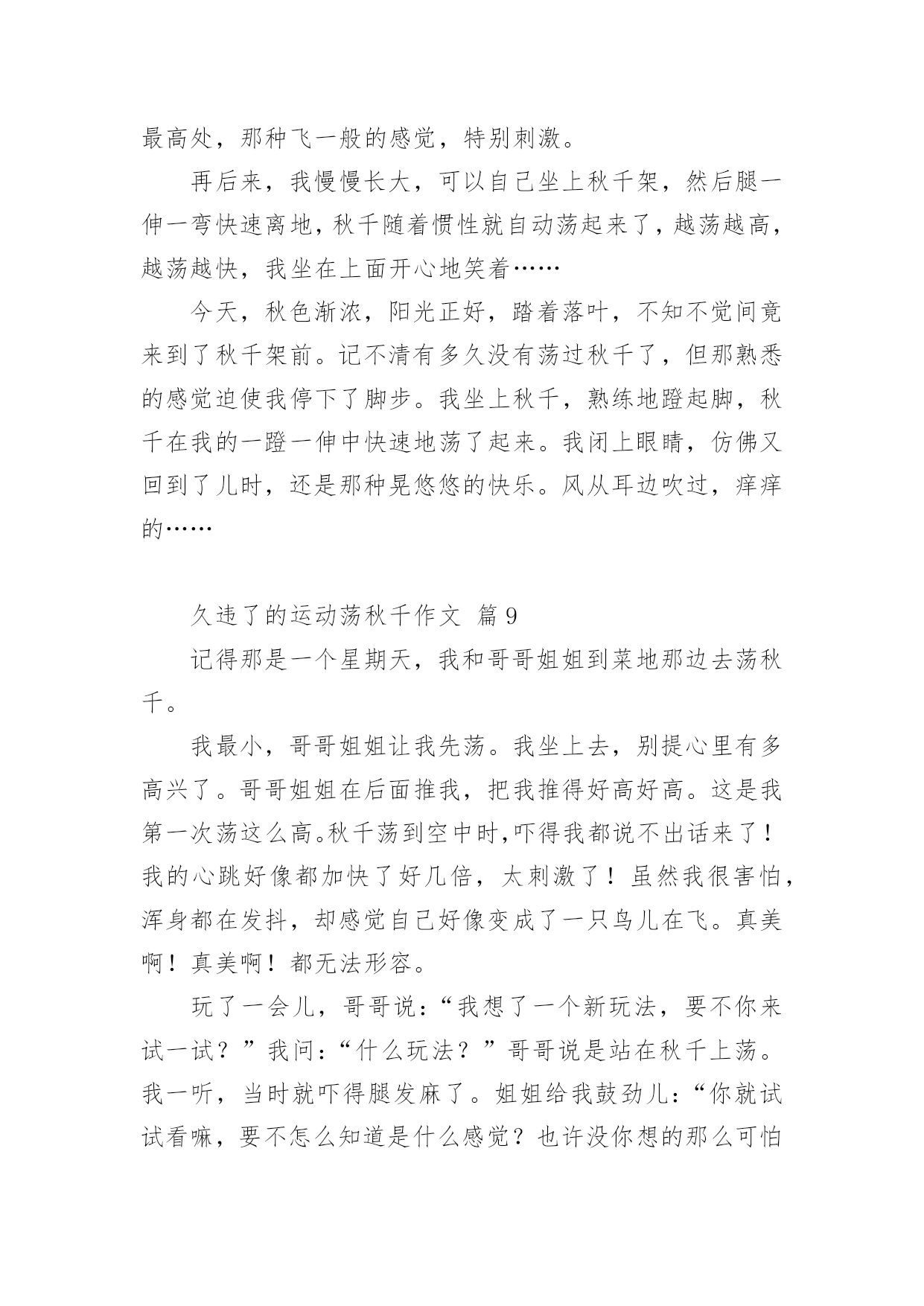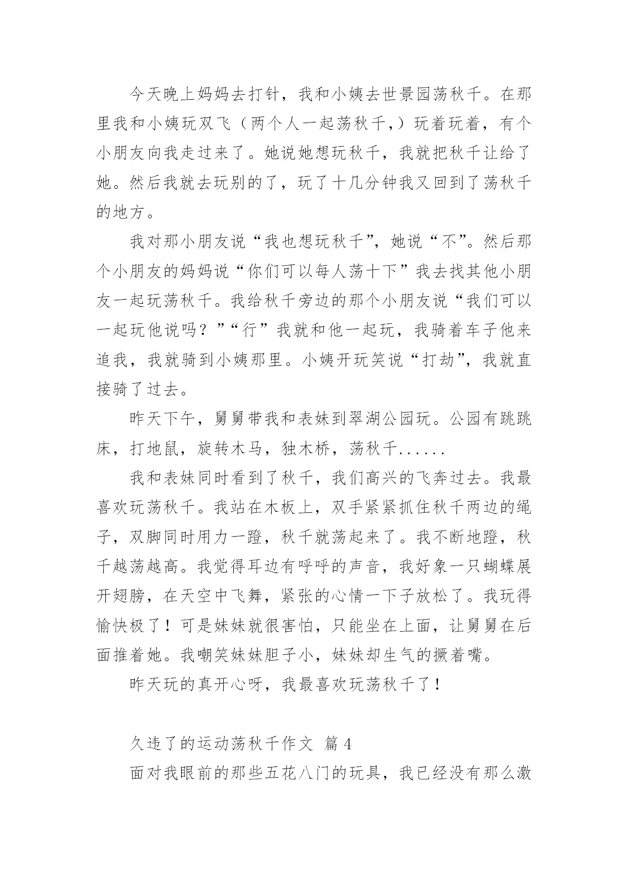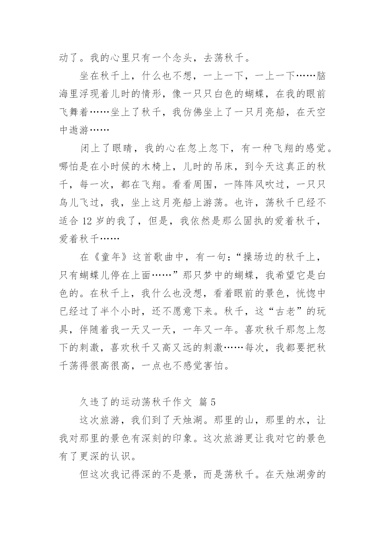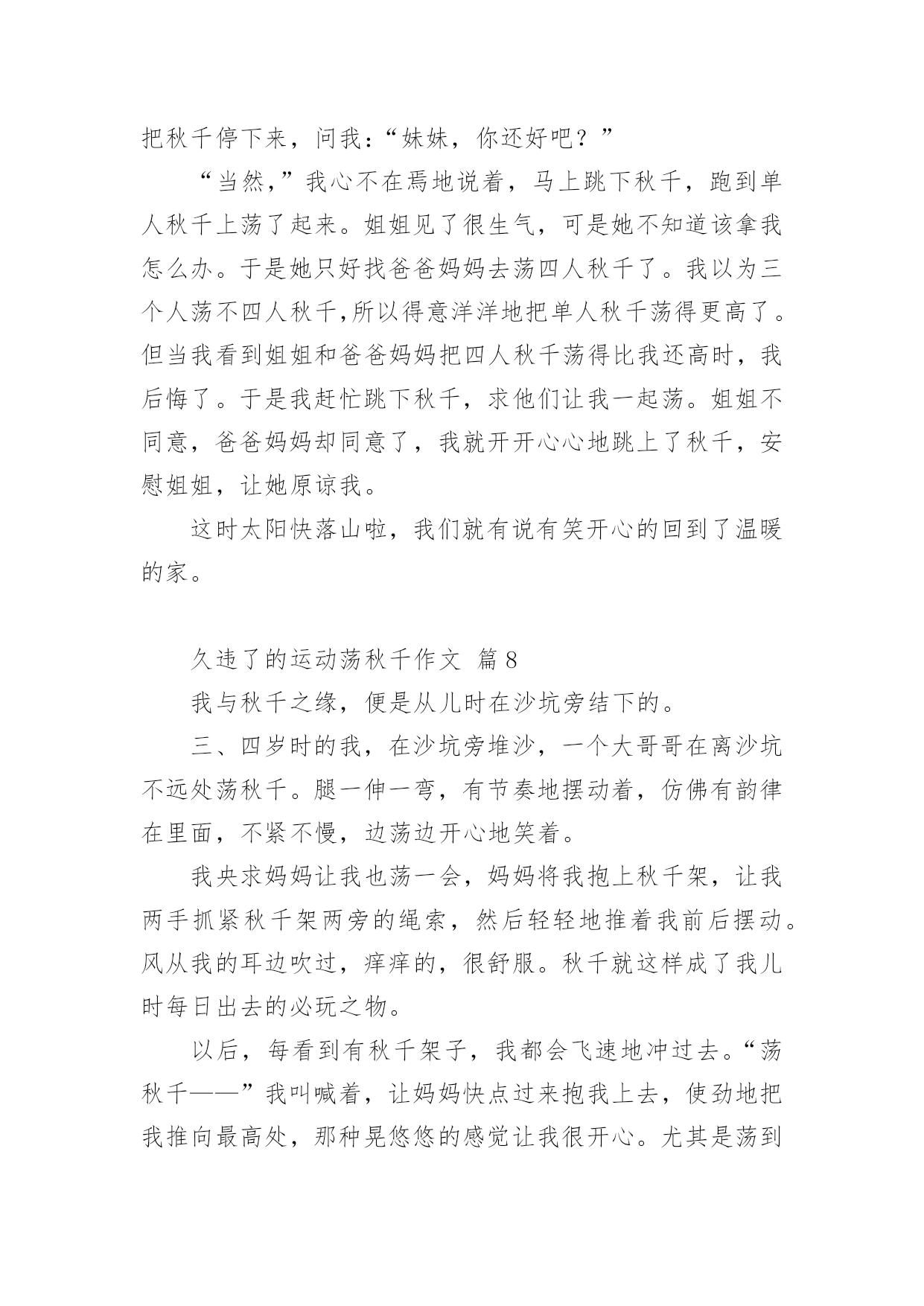 久违了的运动荡秋千作文久违了的运动荡秋千作文(精选21篇)在日常学习、工作和生活中,说到作文,大家肯定都不陌生吧,根据写作命题的特点,作文可以分为命题作文和非命题作文。还是对作文一筹莫展吗?下面是小编为大家收集的久违了的运动荡秋千作文,仅供参考,欢迎大家阅读。久违了的运动荡秋千作文篇1过年时,石路几个人来了兴致,齐心协力,在龙拱桥下的稻田里,竖起了一架久围了的秋千。昨日下午,小外甥散步至此,见此晃荡的秋千,顿觉兴奋。玩耍了一阵后,因等待的人多,不可独占,而又意犹未尽,只得怏怏而归,放下话儿,明早七点,叫上我外公,带我来玩过够。我既受他所托,七点准时将他叫醒,谁知他竟因天冷不去为由,赖得爬起床来。那知我刚读出“言必信,行必果”后,只看他一骨碌就爬起了床。尔后迅速漱洗,俩人一路向目的地走去。竖秋千的稻田离家不远,大约也就三五百来米,已入春季,太阳公公刚冒出山峦,已露出了圆圆的,彤红彤红的脸。早晨的晨曦,给大地罩上了一层淡淡的金色。使得龙拱桥桥下的流水,波光绚丽,也像镀上了一层薄薄的金。秋千是由两组三棵大树,梱绑成两个三角架来组成,上面置一横梁。过去是要在横梁上钉上竹片当钉子,用来固定两个梱草绳的篾圈圈。现在方便多了,直接把两根小儿手臂粗的麻绳子梱上去,它既结实而一又省却了许多麻烦。外甥计划还是对路的,这时候的大人还不得闲,小孩还不出门。可惜的是,这个平时劲头来了,不管你多强势,多高大,就是打不赢都要打的八岁娃儿,竟然不敢站着荡秋千。他只能坐着要我推送,凭着惯性荡秋千,而且荡时还不宜推送得太高,否则他就会发出恐怖的尖叫。因为麻绳太粗,手掌握力有点吃力,再加上手掌有点冰凉,荡不了几分钟就要下来把手搓热一下。同时告诉我,在空中荡起来时,就有想撒尿的感觉,我想,这可能就是轻微失重的身体反应。趁秋千空闲之时,我也站在秋千上,想来体验一把年轻时荡秋千的风采。谁知一站上去,抓紧麻绳,两腿一蹲,本想用力一蹬,使秋千慢慢荡起来。那晓得两腿一蹲,双膝就发酸发软,根本不听使唤了,这才知道,岁月不饶人,过去已成梦。然而,外甥通过几次训练,胆儿也大了,荡的高度也高了,再也不会发出尖叫了,还有的就是,在空中再也没有想撒尿的感觉了。从此看来,也的确是进步了。一进步,一退步如此交换之快,也许就是淘汰生命的自然法则吧!偶尔想起,苏轼的《蝶恋花·春景》来作结尾。花褪残红青杏小。燕子飞时,绿水人家绕。枝上柳绵吹又少。天涯何处无芳草。墙里秋千墙外道。墙外行人,墙里佳人笑。笑渐不闻声渐悄。多情却被无情恼。久违了的运动荡秋千作文篇2这天,我和表妹吃过早餐就一起到合山广场玩。我们来到广场,首先映入眼帘的是人山人海,人头攒动的景象。我生怕会走失,紧紧攥着舅娘的手。在我被挤成相片时,我好像看见了——秋千?没错,是秋千!于是,我拉着表妹和舅娘的手,小火箭一般地向秋千跑去。秋千上一个人也没有,有两个空位。正好让我和表妹坐上去玩。但是座位也太高了吧!都到我的腰部了。不过这可难不倒我,我双手拉住秋千上的两条铁链,两只脚半蹲蓄力,再用两脚一蹬,哈哈!我蹬上来啦!不过另一边的表妹蹬不上来,急得像热锅上的蚂蚁----团团转。于是我叫来舅娘帮忙,终于把表妹抱上来了。开始荡秋千了。我双脚先是乱踢一通,等秋千摇起来后,再有规律的收脚,踢脚,再收脚,踢脚。如此反复,我荡起了来了!旁边的表妹看着我,照葫芦画瓢,也荡了起来。我们俩的脸上洋溢着温暖的笑容,广场上空回荡着我们爽朗的笑声。不知不觉,该回家吃午饭了。我们恋恋不舍的从秋千上下来,走在回家的路上,我们悄悄约定下次假期我们还来这里荡秋千。久违了的运动荡秋千作文篇3今天晚上妈妈去打针,我和小姨去世景园荡秋千。在那里我和小姨玩双飞(两个人一起荡秋千,)玩着玩着,有个小朋友向我走过来了。她说她想玩秋千,我就把秋千让给了她。然后我就去玩别的了,玩了十几分钟我又回到了荡秋千的地方。我对那小朋友说“我也想玩秋千”,她说“不”。然后那个小朋友的妈妈说“你们可以每人荡十下”我去找其他小朋友一起玩荡秋千。我给秋千旁边的那个小朋友说“我们可以一起玩他说吗?”“行”我就和他一起玩,我骑着车子他来追我,我就骑到小姨那里。小姨开玩笑说“打劫”,我就直接骑了过去。昨天下午,舅舅带我和表妹到翠湖公园玩。公园有跳跳床,打地鼠,旋转木马,独木桥,荡秋千......我和表妹同时看到了秋千,我们高兴的飞奔过去。我最喜欢玩荡秋千。我站在木板上,双手紧紧抓住秋千两边的绳子,双脚同时用力一蹬,秋千就荡起来了。我不断地蹬,秋千越荡越高。我觉得耳边有呼呼的声音,我好象一只蝴蝶展开翅膀,在天空中飞舞,紧张的心情一下子放松了。我玩得愉快极了!可是妹妹就很害怕,只能坐在上面,让舅舅在后面推着她。我嘲笑妹妹胆子小,妹妹却生气的撅着嘴。昨天玩的真开心呀,我最喜欢玩荡秋千了!久违了的运动荡秋千作文篇4面对我
