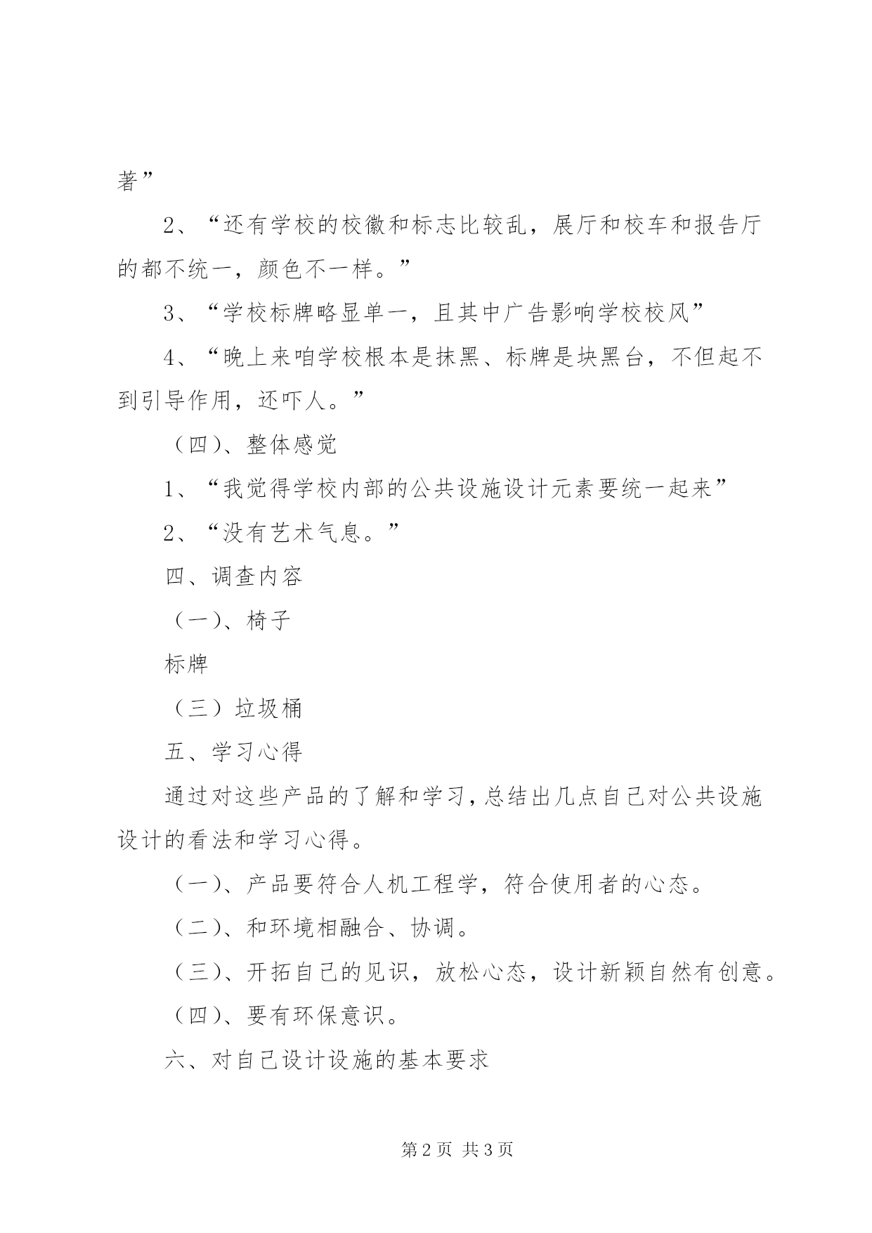 第PAGE\*Arabic\*MERGEFORMAT3页共NUMPAGES\*MERGEFORMAT3页校园公共设施调研报告一、地点:兰州理工大学时间;2011.08.28二、调查对象:学校公共设施(椅子、标牌、垃圾筒、任何可以装饰校园的东西)三、答卷内容(一)、椅子1、“学校设施应该再多一点,至于颜色应该多是绿色的,至于材质,我想应该是一些环保的例如说是木头的”。2、“篮球场附近少椅子。”3、“椅子通常都很脏没法坐,”4、“长椅质量太差,被人随意摆放”5、“长椅数量太少一到晚上就被人占去几乎没人空位”(二)、垃圾桶1、“垃圾桶里的垃圾不能及时处理掉很难闻,应该设计成那种把垃圾丢进去之后就能处理掉的”2、“垃圾桶可以做出很多不同形状的、”3、“现在的垃圾桶都很普通跟其他的学校都一样突显不出我们艺术学校的风格”(三)、标牌1、“标牌设计的显著点颜色应该是绿的或者红的,比较显著”2、“还有学校的校徽和标志比较乱,展厅和校车和报告厅的都不统一,颜色不一样。”3、“学校标牌略显单一,且其中广告影响学校校风”4、“晚上来咱学校根本是抹黑、标牌是块黑台,不但起不到引导作用,还吓人。”(四)、整体感觉1、“我觉得学校内部的公共设施设计元素要统一起来”2、“没有艺术气息。”四、调查内容(一)、椅子标牌(三)垃圾桶五、学习心得通过对这些产品的了解和学习,总结出几点自己对公共设施设计的看法和学习心得。(一)、产品要符合人机工程学,符合使用者的心态。(二)、和环境相融合、协调。(三)、开拓自己的见识,放松心态,设计新颖自然有创意。(四)、要有环保意识。六、对自己设计设施的基本要求(一)、产品要符合人机工程学,符合学校使用者的需求。(二)、符合我们学校的整体自然和人文特色。(三).色调大气、活泼、有生气。(四)、绿色生态设计,形态自然不拘束。(五)、找到合理的放置位置。