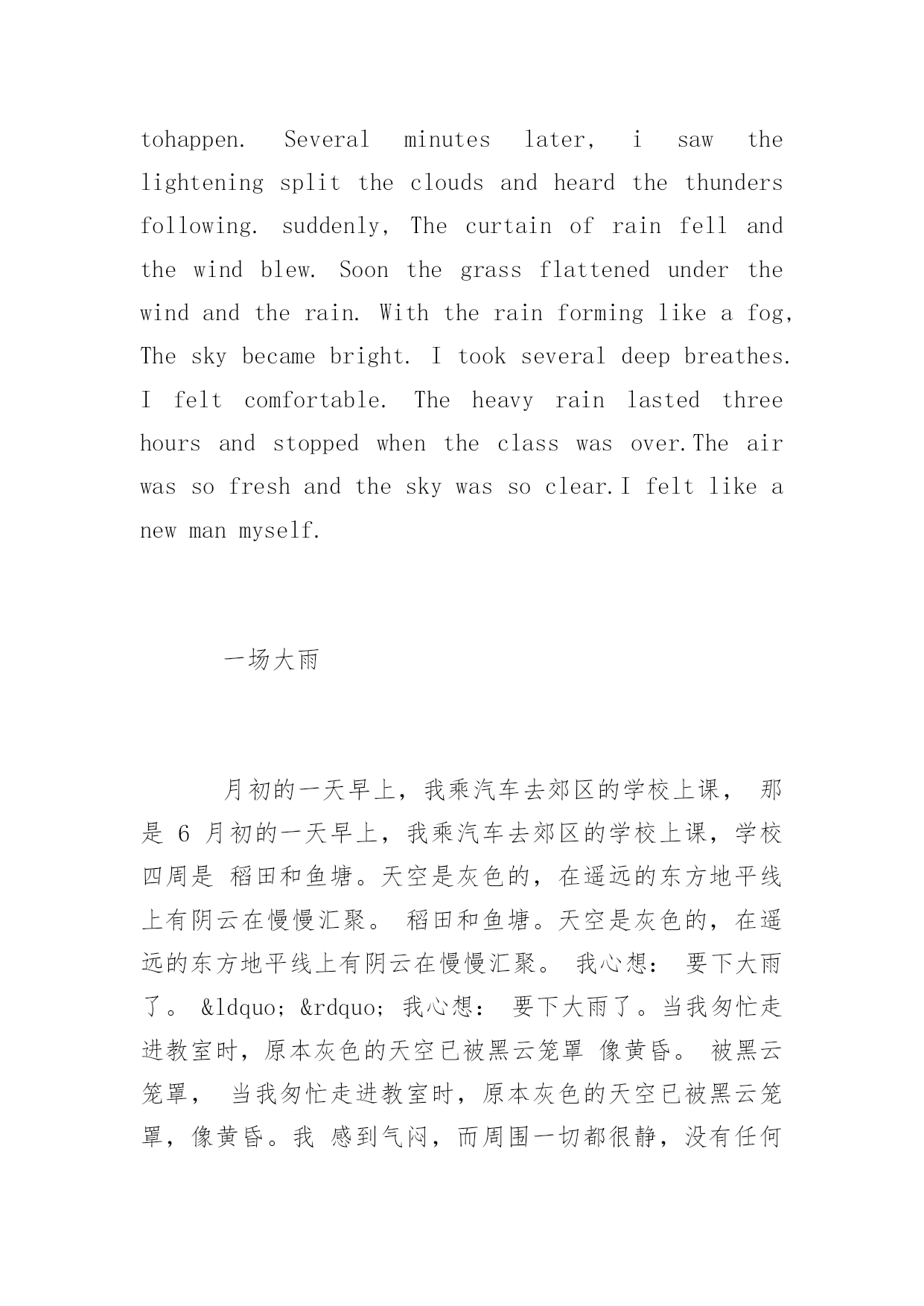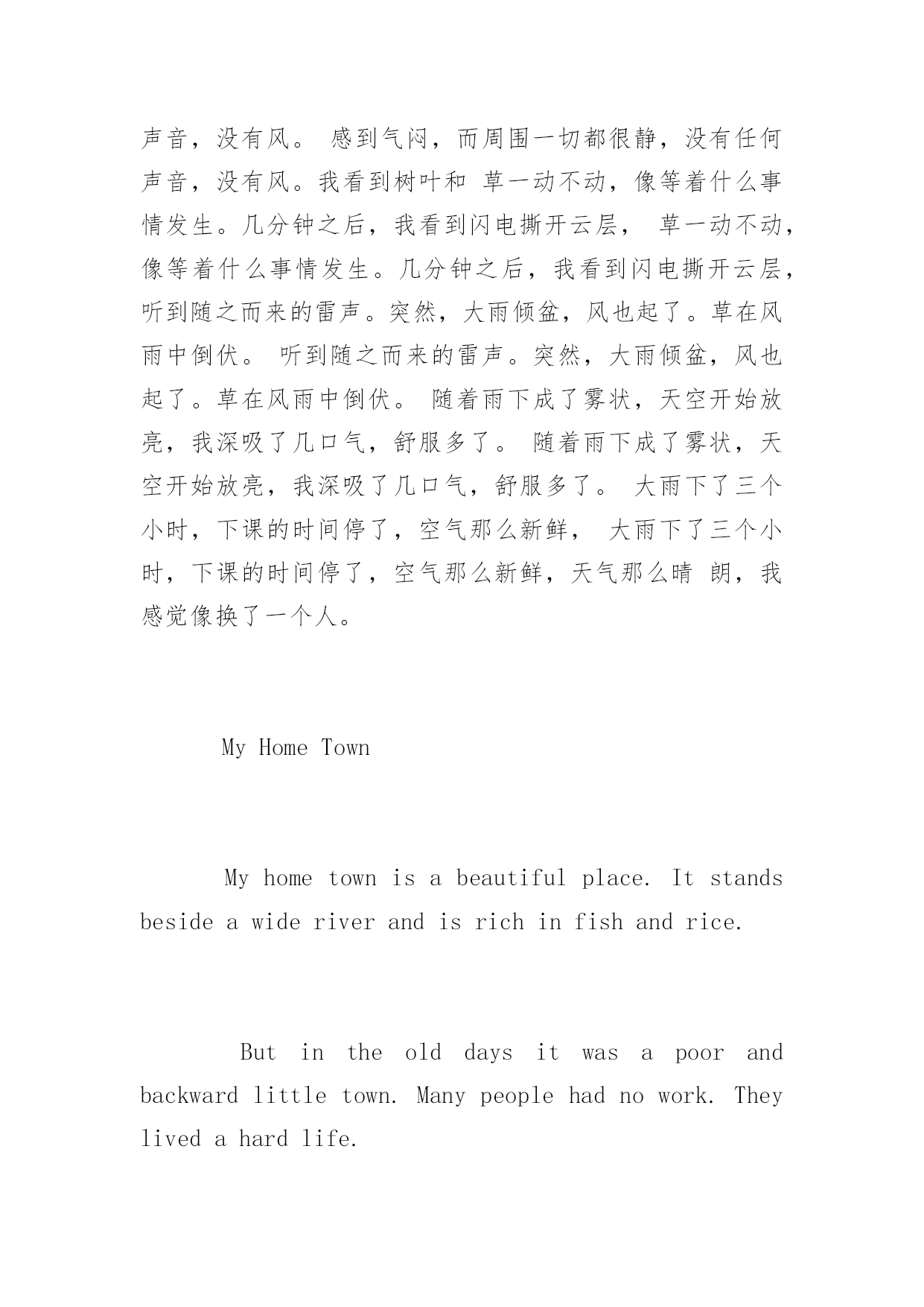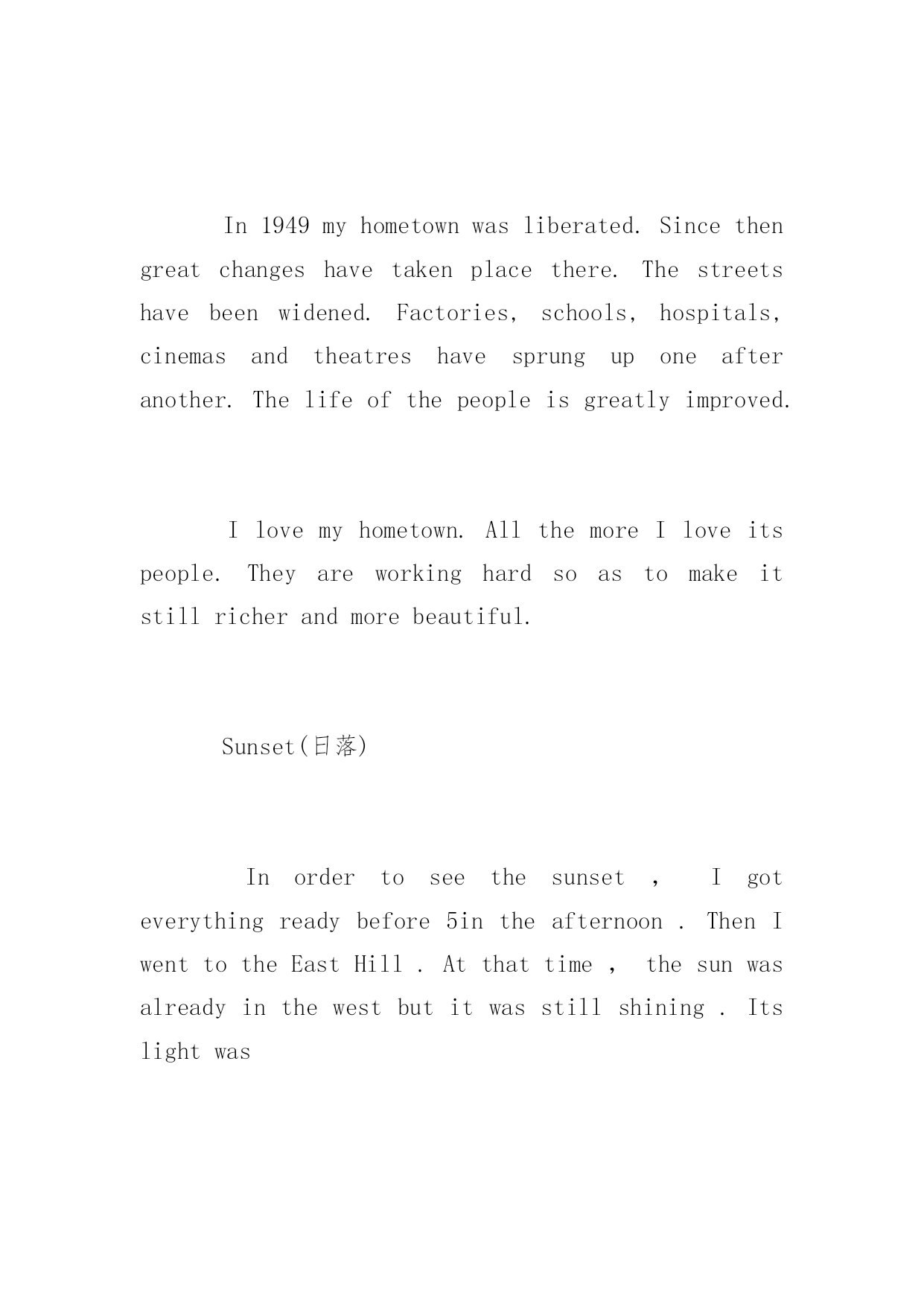 高频中考英语作文优秀高频中考英语作文优秀范文导语:阅读让生活充实”,在不同的心境下,可以选择翻阅情调各异的文章。下面是小编为大家整理的,英语范文,想要知更多的资讯,请多多留意CNFLA学习网!aheavyrainThatwasamorningintheearlyofjune.Itookabustomyschoolinthesuburbwhichwassurroundedbyricepaddiesandponds.Theskywasgraywiththegloomycloudscongregatinggraduallyalongthefareasternhorizon."Theremustbeaheavyrainsoon."Ispoketomyself.Whenihurriedintotheclassroom,thesky,graybefore,wasshroudednowbyblackclouds,darkentotwilight,Ifeltquitestuffy,whileitwasquitecalm,Withoutwind.Isawtheleavesoftreesandgrassstatic,whichseemtoawaitsomethingtohappen.Severalminuteslater,isawthelighteningsplitthecloudsandheardthethundersfollowing.suddenly,Thecurtainofrainfellandthewindblew.Soonthegrassflattenedunderthewindandtherain.Withtherainforminglikeafog,Theskybecamebright.Itookseveraldeepbreathes.Ifeltcomfortable.Theheavyrainlastedthreehoursandstoppedwhentheclasswasover.Theairwassofreshandtheskywassoclear.Ifeltlikeanewmanmyself.一场大雨月初的一天早上,我乘汽车去郊区的学校上课,那是6月初的一天早上,我乘汽车去郊区的学校上课,学校四周是稻田和鱼塘。天空是灰色的,在遥远的东方地平线上有阴云在慢慢汇聚。稻田和鱼塘。天空是灰色的,在遥远的东方地平线上有阴云在慢慢汇聚。我心想:要下大雨了。“”我心想:要下大雨了。当我匆忙走进教室时,原本灰色的天空已被黑云笼罩像黄昏。被黑云笼罩,当我匆忙走进教室时,原本灰色的天空已被黑云笼罩,像黄昏。我感到气闷,而周围一切都很静,没有任何声音,没有风。感到气闷,而周围一切都很静,没有任何声音,没有风。我看到树叶和草一动不动,像等着什么事情发生。几分钟之后,我看到闪电撕开云层,草一动不动,像等着什么事情发生。几分钟之后,我看到闪电撕开云层,听到随之而来的雷声。突然,大雨倾盆,风也起了。草在风雨中倒伏。听到随之而来的雷声。突然,大雨倾盆,风也起了。草在风雨中倒伏。随着雨下成了雾状,天空开始放亮,我深吸了几口气,舒服多了。随着雨下成了雾状,天空开始放亮,我深吸了几口气,舒服多了。大雨下了三个小时,下课的时间停了,空气那么新鲜,大雨下了三个小时,下课的时间停了,空气那么新鲜,天气那么晴朗,我感觉像换了一个人。MyHomeTownMyhometownisabeautifulplace.Itstandsbesideawideriverandisrichinfishandrice.Butintheolddaysitwasapoorandbackwardlittletown.Manypeoplehadnowork.Theylivedahardlife.In1949myhometownwasliberated.Sincethengreatchangeshavetakenplacethere.Thestreetshavebeenwidened.Factories,schools,hospitals,cinemasandtheatreshavesprunguponeafteranother.Thelifeofthepeopleisgreatlyimproved.Ilovemyhometown.AllthemoreIloveitspeople.Theyareworkinghardsoastomakeitstillricherandmorebeautiful.Sunset(日落)Inordertoseethesunset,Igoteverythingreadybefore5inth