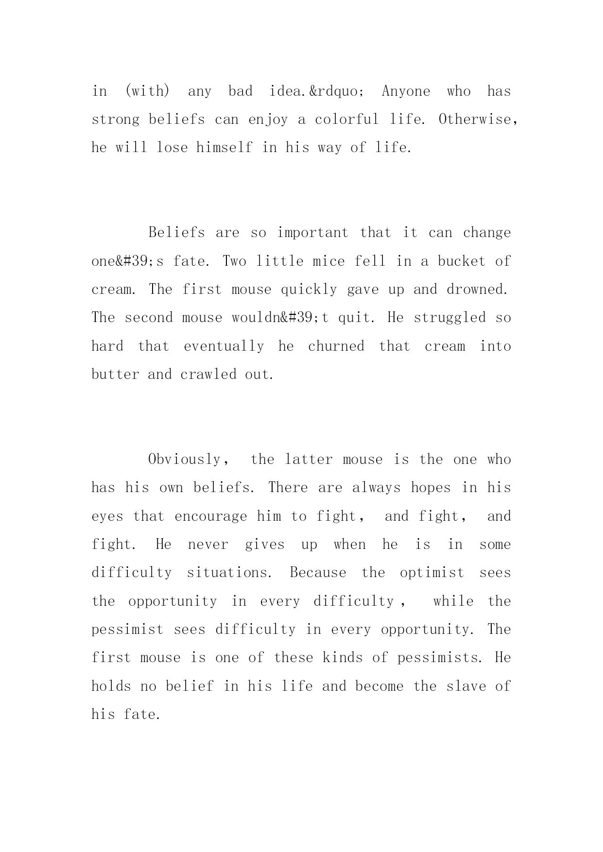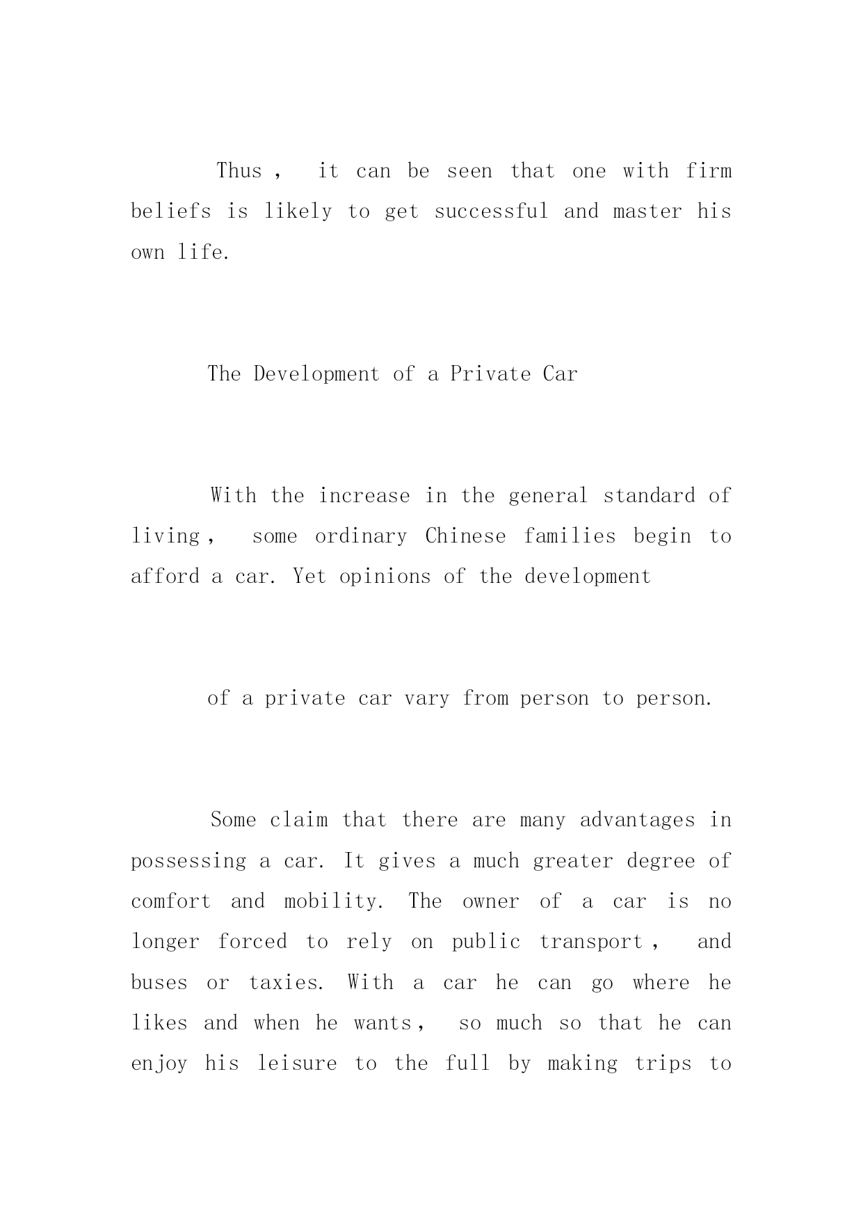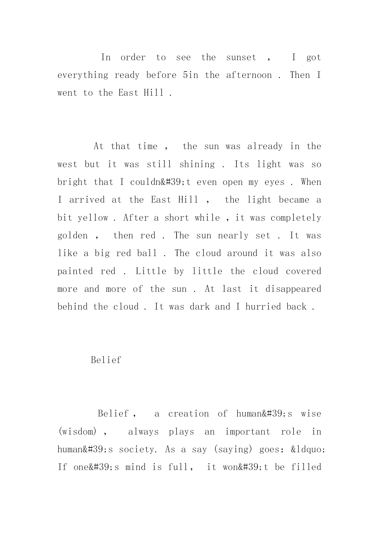 高频中考英语作文优秀高频中考英语作文优秀范文导语:阅读让生活充实”,在不同的心境下,可以选择翻阅情调各异的文章。下面是小编为大家整理的,英语范文,想要知更多的资讯,请多多留意CNFLA学习网!aheavyrainThatwasamorningintheearlyofjune.Itookabustomyschoolinthesuburbwhichwassurroundedbyricepaddiesandponds.Theskywasgraywiththegloomycloudscongregatinggraduallyalongthefareasternhorizon."Theremustbeaheavyrainsoon."Ispoketomyself.Whenihurriedintotheclassroom,thesky,graybefore,wasshroudednowbyblackclouds,darkentotwilight,Ifeltquitestuffy,whileitwasquitecalm,Withoutwind.Isawtheleavesoftreesandgrassstatic,whichseemtoawaitsomethingtohappen.Severalminuteslater,isawthelighteningsplitthecloudsandheardthethundersfollowing.suddenly,Thecurtainofrainfellandthewindblew.Soonthegrassflattenedunderthewindandtherain.Withtherainforminglikeafog,Theskybecamebright.Itookseveraldeepbreathes.Ifeltcomfortable.Theheavyrainlastedthreehoursandstoppedwhentheclasswasover.Theairwassofreshandtheskywassoclear.Ifeltlikeanewmanmyself.一场大雨月初的一天早上,我乘汽车去郊区的学校上课,那是6月初的一天早上,我乘汽车去郊区的学校上课,学校四周是稻田和鱼塘。天空是灰色的,在遥远的东方地平线上有阴云在慢慢汇聚。稻田和鱼塘。天空是灰色的,在遥远的东方地平线上有阴云在慢慢汇聚。我心想:要下大雨了。“”我心想:要下大雨了。当我匆忙走进教室时,原本灰色的天空已被黑云笼罩像黄昏。被黑云笼罩,当我匆忙走进教室时,原本灰色的天空已被黑云笼罩,像黄昏。我感到气闷,而周围一切都很静,没有任何声音,没有风。感到气闷,而周围一切都很静,没有任何声音,没有风。我看到树叶和草一动不动,像等着什么事情发生。几分钟之后,我看到闪电撕开云层,草一动不动,像等着什么事情发生。几分钟之后,我看到闪电撕开云层,听到随之而来的雷声。突然,大雨倾盆,风也起了。草在风雨中倒伏。听到随之而来的雷声。突然,大雨倾盆,风也起了。草在风雨中倒伏。随着雨下成了雾状,天空开始放亮,我深吸了几口气,舒服多了。随着雨下成了雾状,天空开始放亮,我深吸了几口气,舒服多了。大雨下了三个小时,下课的时间停了,空气那么新鲜,大雨下了三个小时,下课的时间停了,空气那么新鲜,天气那么晴朗,我感觉像换了一个人。MyHomeTownMyhometownisabeautifulplace.Itstandsbesideawideriverandisrichinfishandrice.Butintheolddaysitwasapoorandbackwardlittletown.Manypeoplehadnowork.Theylivedahardlife.In1949myhometownwasliberated.Sincethengreatchangeshavetakenplacethere.Thestreetshavebeenwidened.Factories,schools,hospitals,cinemasandtheatreshavesprunguponeafteranother.Thelifeofthepeopleisgreatlyimproved.Ilovemyhometown.AllthemoreIloveitspeople.Theyareworkinghardsoastomakeitstillricherandmorebeautiful.Sunset(日落)Inordertoseethesunset,Igoteverythingreadybefore5inth