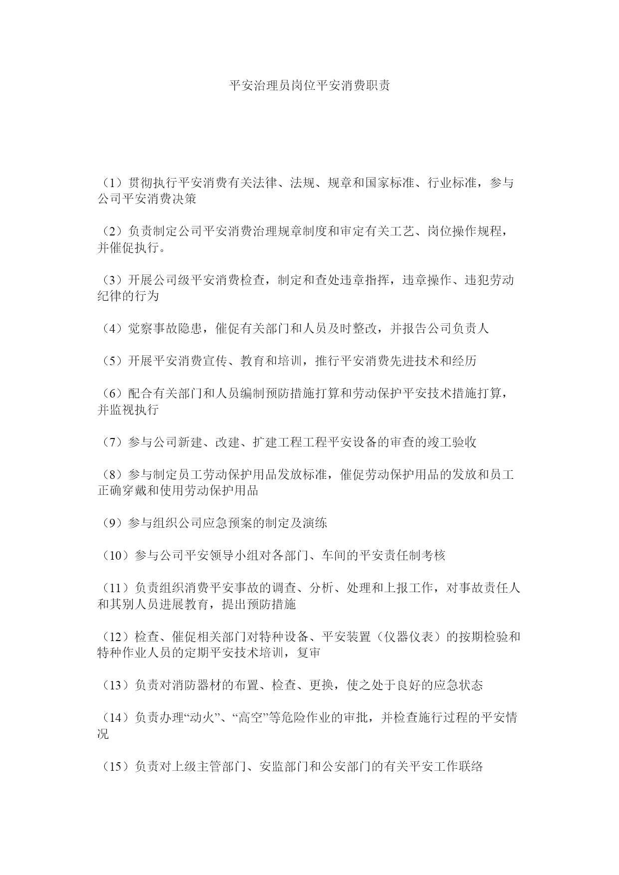 平安治理员岗位平安消费职责(1)贯彻执行平安消费有关法律、法规、规章和国家标准、行业标准,参与公司平安消费决策(2)负责制定公司平安消费治理规章制度和审定有关工艺、岗位操作规程,并催促执行。(3)开展公司级平安消费检查,制定和查处违章指挥,违章操作、违犯劳动纪律的行为(4)觉察事故隐患,催促有关部门和人员及时整改,并报告公司负责人(5)开展平安消费宣传、教育和培训,推行平安消费先进技术和经历(6)配合有关部门和人员编制预防措施打算和劳动保护平安技术措施打算,并监视执行(7)参与公司新建、改建、扩建工程工程平安设备的审查的竣工验收(8)参与制定员工劳动保护用品发放标准,催促劳动保护用品的发放和员工正确穿戴和使用劳动保护用品(9)参与组织公司应急预案的制定及演练(10)参与公司平安领导小组对各部门、车间的平安责任制考核(11)负责组织消费平安事故的调查、分析、处理和上报工作,对事故责任人和其别人员进展教育,提出预防措施(12)检查、催促相关部门对特种设备、平安装置(仪器仪表)的按期检验和特种作业人员的定期平安技术培训,复审(13)负责对消防器材的布置、检查、更换,使之处于良好的应急状态(14)负责办理“动火”、“高空”等危险作业的审批,并检查施行过程的平安情况(15)负责对上级主管部门、安监部门和公安部门的有关平安工作联络(16)按照公司有关要求,及时做好各类平安台账?