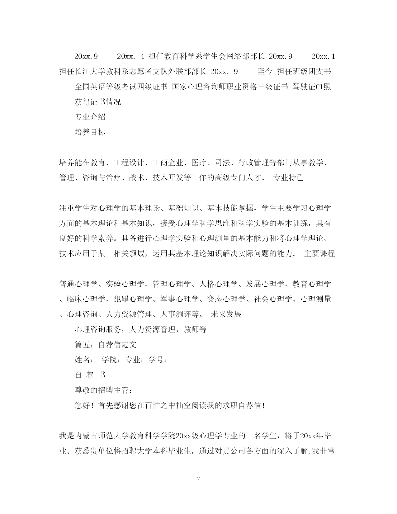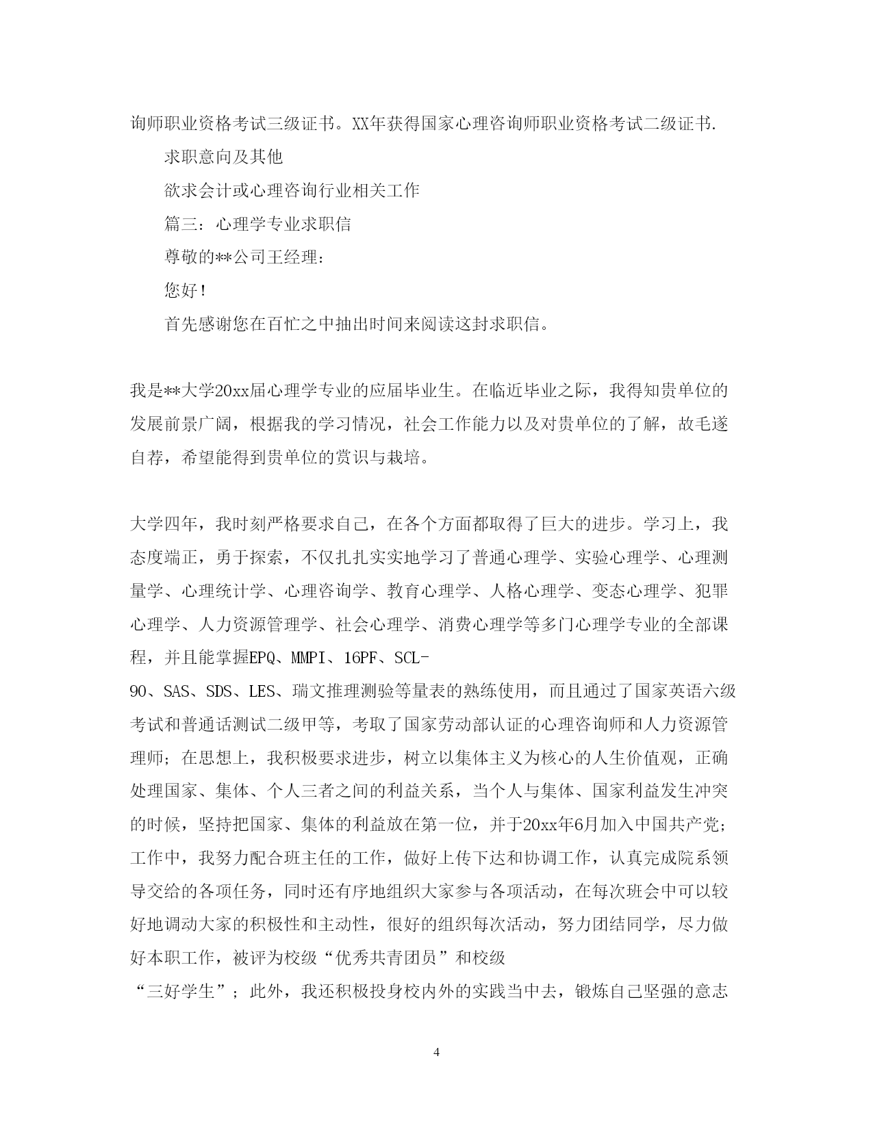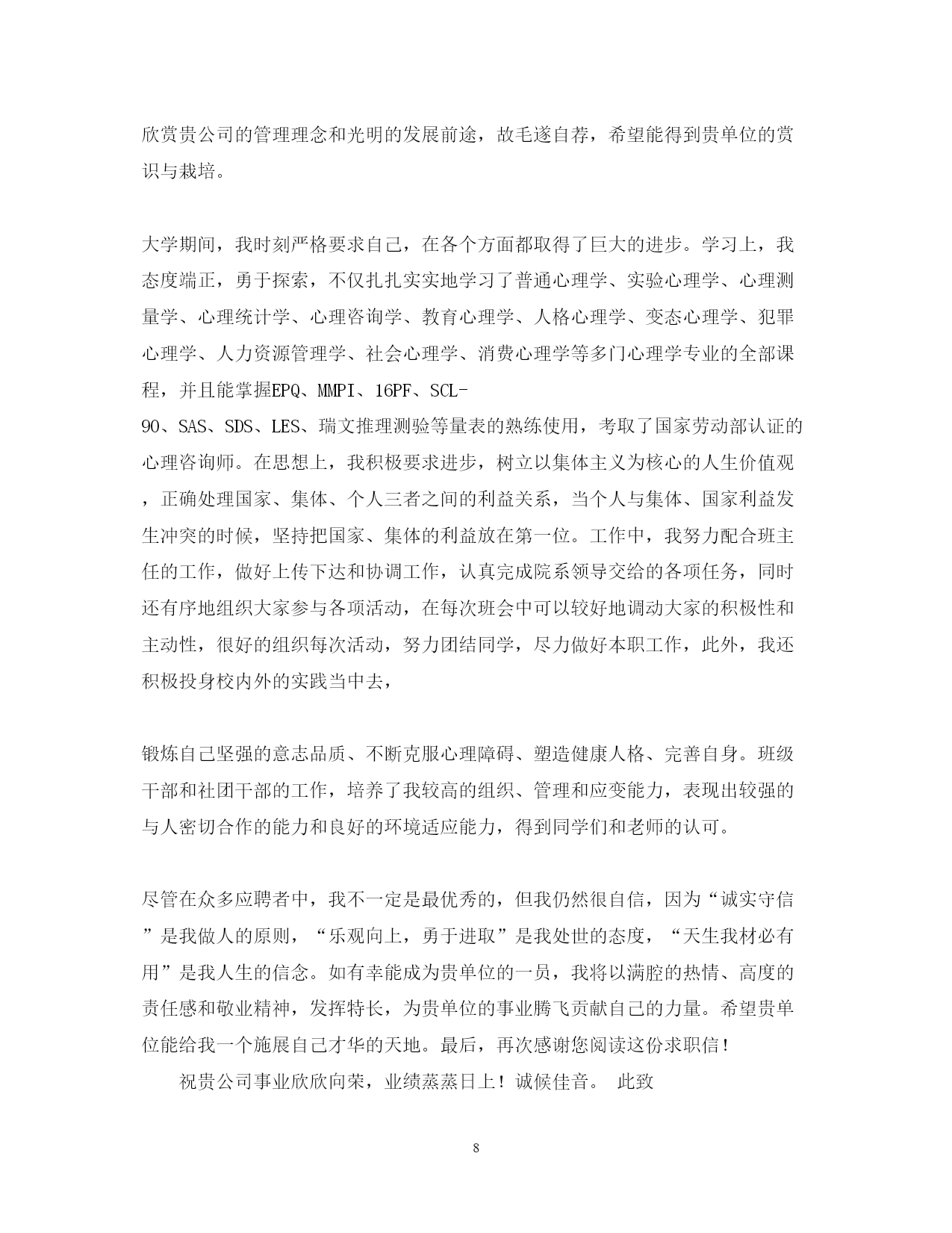 此资料由网络收集而来,如有侵权请告知上传者立即删除。资料共分享,我们负责传递知识。PAGEPAGE9心理咨询师求职信范文篇一:应用心理学毕业生求职信尊敬的公司领导:您好!我是福建医科大学应用心理学专业09届的的一名刚刚走出大学校门的学子,前段时间通过贵公司的网上公开招聘公告了解到贵公司的纳贤需求,怀着对贵公司的尊重与向往,我真挚地写了这封自荐信,向您展示一个完全真实的我,希望贵公司能接纳我成为其中的一员。通过四年的专业学习,我深深地喜爱自己的专业。专业的学习让我熟知心理学专业和人力资源管理相关知识,包括普通心理学、心理测量学、管理心理学、人力资源管理的员工的招聘、培训、绩效考评及薪酬管理等方面的知识。结合贵公司的职位要求,我想应聘贵单位的人才测评的相关职位。在校四年期间,我学习认真刻苦。经过努力我拿到了国家英语四级证书、福建省计算机一级证书、二级证书。并在大三拿到了国家心理咨询师(三级)证书。为了更好地锻炼和发展自己,在校期间我积极参加各种活动。曾任职校学生会传媒事业部副部长,参与创建校学生会网站和团委网站。通过自学和培训掌握计算机技能技巧,网页编辑设计技能。同时通过与团队人员的分工合作制定网站的发展规划和运营管理机制。并负责管理监督部门的各种活动,如首届校园DV大赛、医大讲坛等。在关注学校的活动同时,积极参加社会实践活动,加入阳光志愿者协会,成为青年志愿者行列的一员,参与各种志愿活动,深入社区和街道服务。如学习手语与聋哑者交流,义卖报纸等。在文艺才能方面,积极参加学院组织的各种活动,迎新晚会上表演话剧和唱歌,参加心理短剧大赛、传统风俗大赛等。把自己的才能和智慧发挥出来,给大家带来欢乐。大量的实践活动使我有机会接触各种各样的人,同时也碰到各种各样的困难。在处理这些问题的同时我锻炼了自身的处事能力,能全面思考问题,对事物有自己的见解。这些既培养了我的团队合作精神,又使我能袒诚面对自身的问题。求职之途,百舸争流,学业初成,便要直面真正的人生,内心因不经沧桑忐忑不安。但我坚信,在一个精诚团结,锐意进取的集体中,在仁爱领导的明泽和提携下,初谙世事的学子足能兵可成将、木可成树。踏踏实实做人,是父母对我的谆谆教诲,知识和汗水是我对您善视和爱护的无限回报。对于事业与未来,我会执着追求;对于失败与挫折,我会坦然面对。我有足够的勇气与毅力,去迎接生命里的每一次挑战!我不敢断言我是最优秀的,但请相信我定将是最努力!最积极的!若为惠纳,我将尽心竭力。相信您的选择,我将更加努力。如有幸成为贵公司一员,我定全力以赴的投入到工作当中,竭力为公司创造价值!祝贵公司事业蒸蒸日上!求职者:xx20xx年9月14日篇二:心理咨询师个人求职简历范文姓名:年龄:学历:居住区域:户口所在地:**************性别:身高:工作年限:*******求职信文静的知识女性,党员,身高160,39岁.为人真诚,善于沟通,热爱学习,寻求上进,有着积极地工作态度和进取精神。曾做过文秘,管理和会计工作,为了个人成长学习几年心理学,并考取国家咨询师资格证书。另获得有会计证、会计电算化证和服务行业技师证书,并考取计算机等级二级合格证书。(本人寻找心理或会计工作,要求全职薪酬五险一金后不低于2500,兼职每日150元,最好兼职,如果贵公司不能承诺这个愿望,请不要给我信息或电话,以免耽误彼此宝贵时间。谢谢)工作经历在北京旅游局下属旅游公司工作18年曾从事办公室文秘6年,主要从事公文写作和对外宣传。后又在管理科工作3年,担任管理组组长,主要是对外接待和协助领导做人事管理,为新员工做入岗培训,协助领导组织、筹备各种大型旅游接待活动,按时向上级汇报整体工作情况。从事8年的会计工作,主要从事公司总账会计工作。能够独立制单、记账、报表,熟练使用用友及久其财务软件,有着丰富的会计工作经验,能够处理复杂的财务往来业务。本人工作态度认真努力,热爱学习不断上进,能够高效完成日常工作。原单位多次被领导和同事评选为年度个人先进工作者。教育经历1993年毕业于北京商业学院XX——XX在北京华夏心理学校学习心理学.获得计算机等级二级证书,有会计证和服务行业技师证书。XX年获得国家心理咨询师职业资格考试三级证书。XX年获得国家心理咨询师职业资格考试二级证书.求职意向及其他欲求会计或心理咨询行业相关工作篇三:心理学专业求职信尊敬的**公司王经理:您好!首先感谢您在百忙之中抽出时间来阅读这封求职信。我是**大学20xx届心理学专业的应届毕业生。在临近毕业之际,我得知贵单位的发展前景广阔,根据我的学习情况,社会工作能力以及对贵单位的了解,故毛遂自荐,希望能得到贵单位的赏识与栽培。大学四年,我时刻严格要求自己,在各个