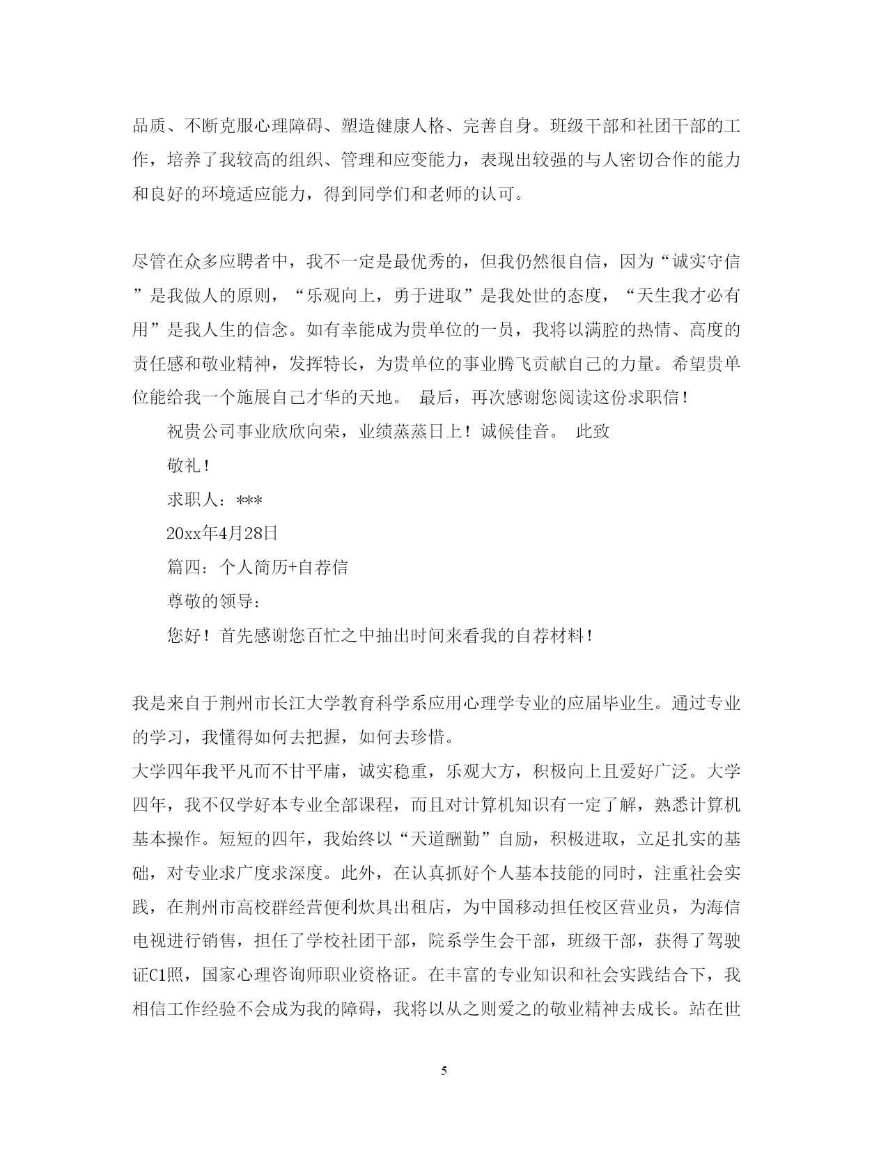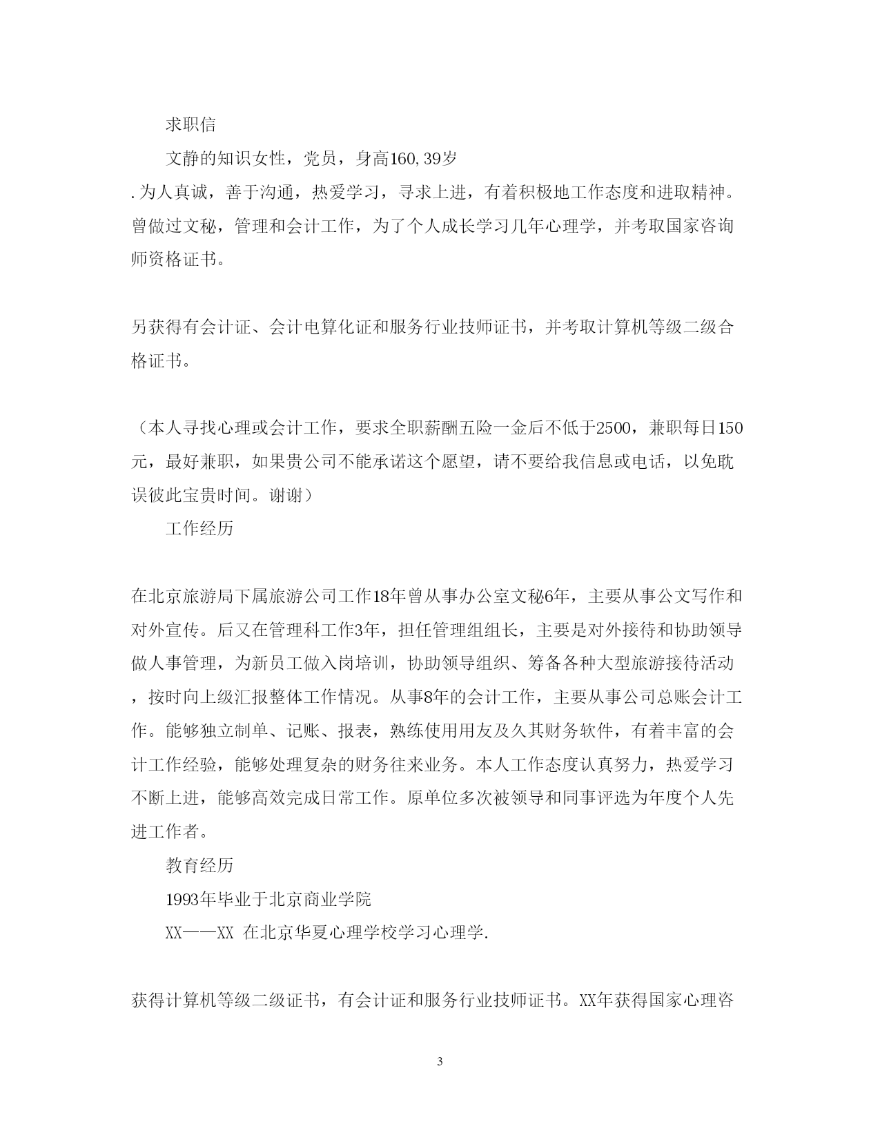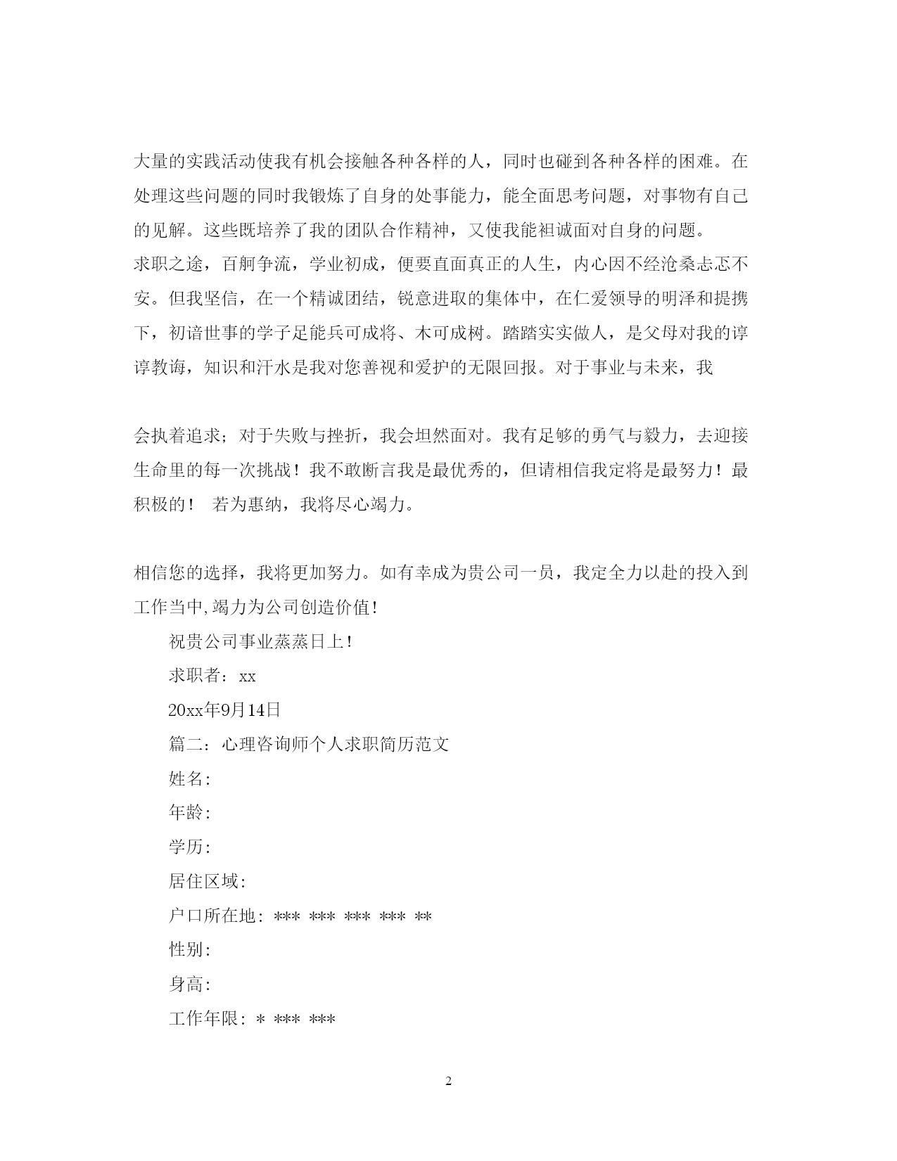 此资料由网络收集而来,如有侵权请告知上传者立即删除。资料共分享,我们负责传递知识。PAGEPAGE9心理咨询师求职信范文篇一:应用心理学毕业生求职信尊敬的公司领导:您好!我是福建医科大学应用心理学专业09届的的一名刚刚走出大学校门的学子,前段时间通过贵公司的网上公开招聘公告了解到贵公司的纳贤需求,怀着对贵公司的尊重与向往,我真挚地写了这封自荐信,向您展示一个完全真实的我,希望贵公司能接纳我成为其中的一员。通过四年的专业学习,我深深地喜爱自己的专业。专业的学习让我熟知心理学专业和人力资源管理相关知识,包括普通心理学、心理测量学、管理心理学、人力资源管理的员工的招聘、培训、绩效考评及薪酬管理等方面的知识。结合贵公司的职位要求,我想应聘贵单位的人才测评的相关职位。在校四年期间,我学习认真刻苦。经过努力我拿到了国家英语四级证书、福建省计算机一级证书、二级证书。并在大三拿到了国家心理咨询师(三级)证书。为了更好地锻炼和发展自己,在校期间我积极参加各种活动。曾任职校学生会传媒事业部副部长,参与创建校学生会网站和团委网站。通过自学和培训掌握计算机技能技巧,网页编辑设计技能。同时通过与团队人员的分工合作制定网站的发展规划和运营管理机制。并负责管理监督部门的各种活动,如首届校园DV大赛、医大讲坛等。在关注学校的活动同时,积极参加社会实践活动,加入阳光志愿者协会,成为青年志愿者行列的一员,参与各种志愿活动,深入社区和街道服务。如学习手语与聋哑者交流,义卖报纸等。在文艺才能方面,积极参加学院组织的各种活动,迎新晚会上表演话剧和唱歌,参加心理短剧大赛、传统风俗大赛等。把自己的才能和智慧发挥出来,给大家带来欢乐。大量的实践活动使我有机会接触各种各样的人,同时也碰到各种各样的困难。在处理这些问题的同时我锻炼了自身的处事能力,能全面思考问题,对事物有自己的见解。这些既培养了我的团队合作精神,又使我能袒诚面对自身的问题。求职之途,百舸争流,学业初成,便要直面真正的人生,内心因不经沧桑忐忑不安。但我坚信,在一个精诚团结,锐意进取的集体中,在仁爱领导的明泽和提携下,初谙世事的学子足能兵可成将、木可成树。踏踏实实做人,是父母对我的谆谆教诲,知识和汗水是我对您善视和爱护的无限回报。对于事业与未来,我会执着追求;对于失败与挫折,我会坦然面对。我有足够的勇气与毅力,去迎接生命里的每一次挑战!我不敢断言我是最优秀的,但请相信我定将是最努力!最积极的!若为惠纳,我将尽心竭力。相信您的选择,我将更加努力。如有幸成为贵公司一员,我定全力以赴的投入到工作当中,竭力为公司创造价值!祝贵公司事业蒸蒸日上!求职者:xx20xx年9月14日篇二:心理咨询师个人求职简历范文姓名:年龄:学历:居住区域:户口所在地:**************性别:身高:工作年限:*******求职信文静的知识女性,党员,身高160,39岁.为人真诚,善于沟通,热爱学习,寻求上进,有着积极地工作态度和进取精神。曾做过文秘,管理和会计工作,为了个人成长学习几年心理学,并考取国家咨询师资格证书。另获得有会计证、会计电算化证和服务行业技师证书,并考取计算机等级二级合格证书。(本人寻找心理或会计工作,要求全职薪酬五险一金后不低于2500,兼职每日150元,最好兼职,如果贵公司不能承诺这个愿望,请不要给我信息或电话,以免耽误彼此宝贵时间。谢谢)工作经历在北京旅游局下属旅游公司工作18年曾从事办公室文秘6年,主要从事公文写作和对外宣传。后又在管理科工作3年,担任管理组组长,主要是对外接待和协助领导做人事管理,为新员工做入岗培训,协助领导组织、筹备各种大型旅游接待活动,按时向上级汇报整体工作情况。从事8年的会计工作,主要从事公司总账会计工作。能够独立制单、记账、报表,熟练使用用友及久其财务软件,有着丰富的会计工作经验,能够处理复杂的财务往来业务。本人工作态度认真努力,热爱学习不断上进,能够高效完成日常工作。原单位多次被领导和同事评选为年度个人先进工作者。教育经历1993年毕业于北京商业学院XX——XX在北京华夏心理学校学习心理学.获得计算机等级二级证书,有会计证和服务行业技师证书。XX年获得国家心理咨询师职业资格考试三级证书。XX年获得国家心理咨询师职业资格考试二级证书.求职意向及其他欲求会计或心理咨询行业相关工作篇三:心理学专业求职信尊敬的**公司王经理:您好!首先感谢您在百忙之中抽出时间来阅读这封求职信。我是**大学20xx届心理学专业的应届毕业生。在临近毕业之际,我得知贵单位的发展前景广阔,根据我的学习情况,社会工作能力以及对贵单位的了解,故毛遂自荐,希望能得到贵单位的赏识与栽培。大学四年,我时刻严格要求自己,在各个
