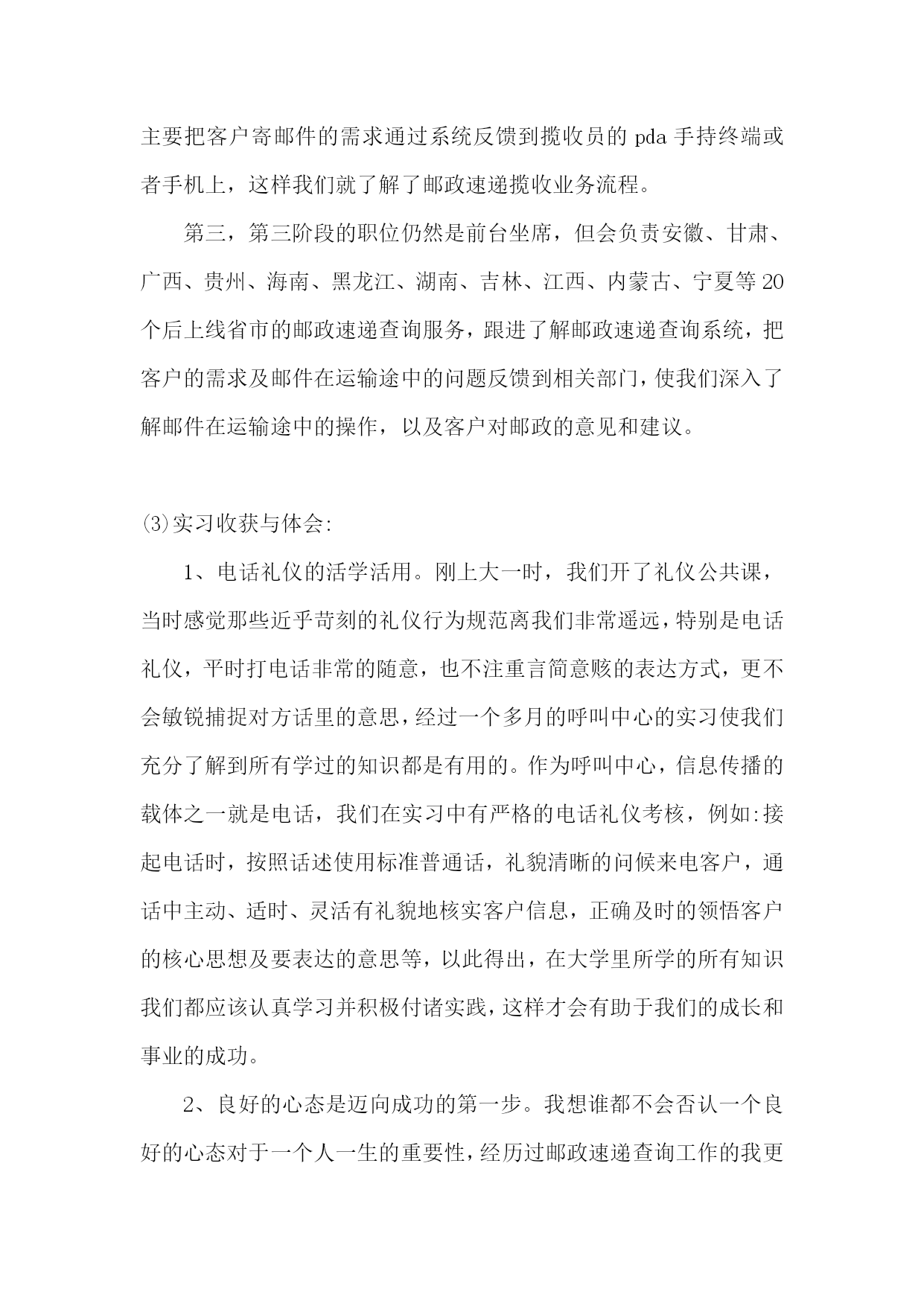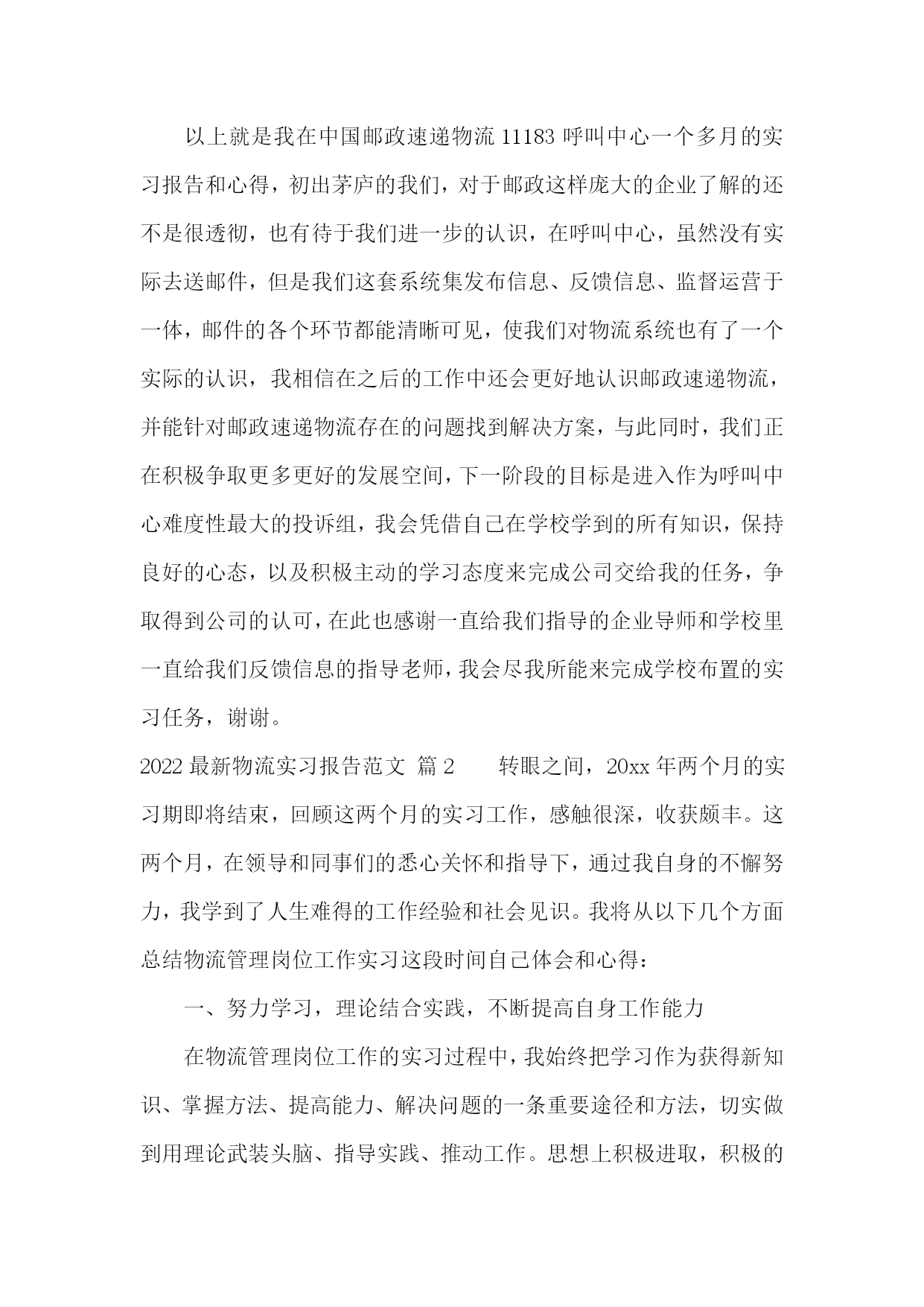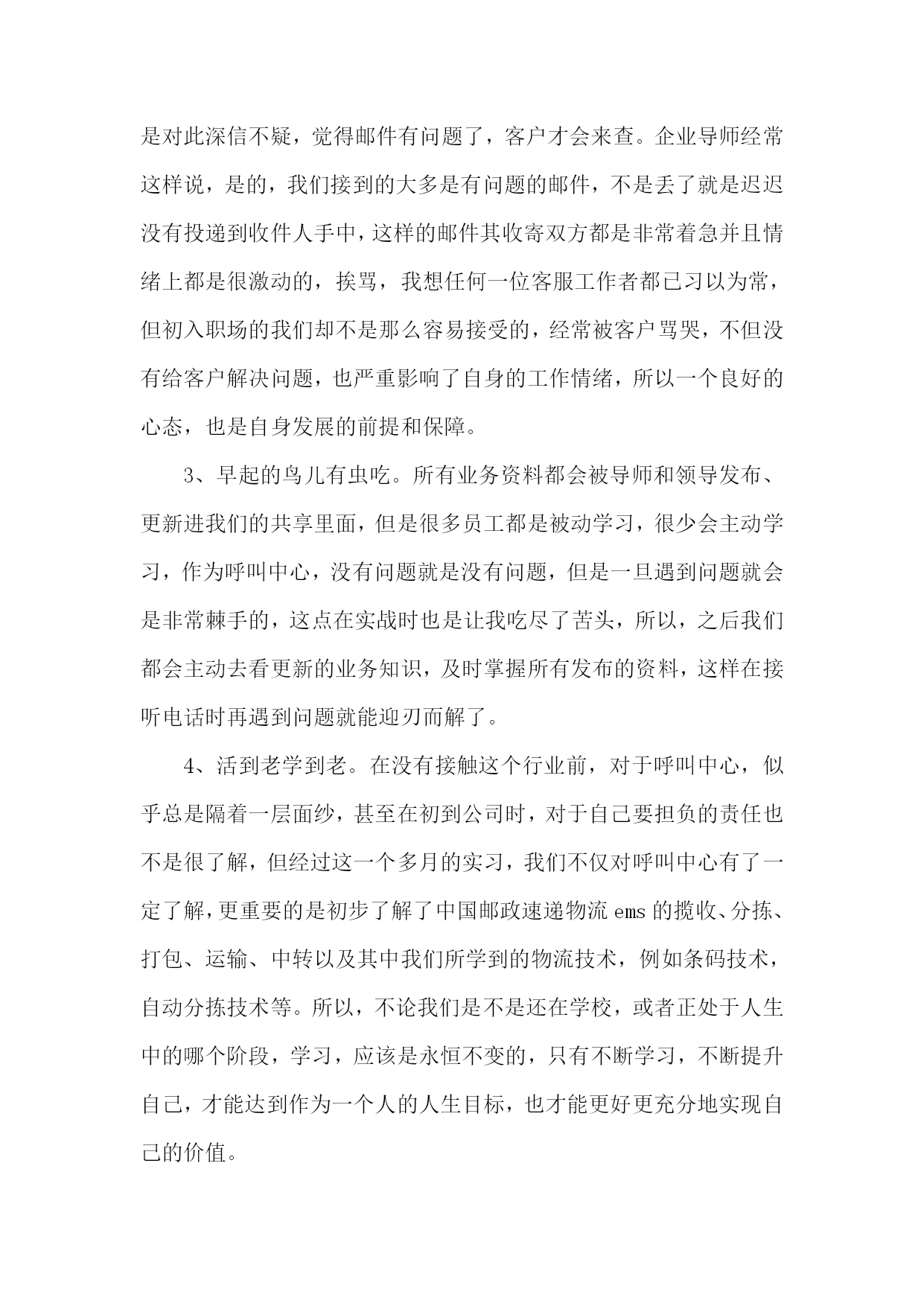 2022最新物流实习报告范文2022最新物流实习报告范文篇1按照培养方案要求,我们08级商贸系的学生要进行为期三个月的毕业实习。根据自己的就业意向,通过各种途径,找到实习单位。本人自3月1日开始在中国邮政速递物流11183呼叫中心实习。现将一个多月的实习情况汇报如下。(1)实习单位情况介绍:邮政速递物流客户服务中心(11183)是11185客户服务中心在速递物流客户服务方面的强化和升级,增强了专业的服务手段和效果,弥补了邮政综合客户服务平台对竞争性业务服务支撑不到位的短板问题,与整体速递物流业务流程的嵌合更为紧密,服务效率要求更高。速递物流客户服务中心定位为速递物流专业服务,主要支撑全国速递物流核心业务、专业客户维护和国际业务深度服务,速递物流客户服务中心的服务质量管理由速递物流总部负责。(2)实习主要内容:首先,第一个阶段,也是所有实习生必备的阶段,进入公司的初期,由企业导师给我们进行了专业化的培训,由来自全国各地的老师来讲解他们各自省市内的地理情况和邮政速递业务,主要针对业务知识进行了重点培训。第二,在经过了为期两周的业务培训后,开始试上线,实习岗位为前台坐席,主要负责福建、湖北和浙江三省的邮政速递揽收业务。主要把客户寄邮件的需求通过系统反馈到揽收员的pda手持终端或者手机上,这样我们就了解了邮政速递揽收业务流程。第三,第三阶段的职位仍然是前台坐席,但会负责安徽、甘肃、广西、贵州、海南、黑龙江、湖南、吉林、江西、内蒙古、宁夏等20个后上线省市的邮政速递查询服务,跟进了解邮政速递查询系统,把客户的需求及邮件在运输途中的问题反馈到相关部门,使我们深入了解邮件在运输途中的操作,以及客户对邮政的意见和建议。(3)实习收获与体会:1、电话礼仪的活学活用。刚上大一时,我们开了礼仪公共课,当时感觉那些近乎苛刻的礼仪行为规范离我们非常遥远,特别是电话礼仪,平时打电话非常的随意,也不注重言简意赅的表达方式,更不会敏锐捕捉对方话里的意思,经过一个多月的呼叫中心的实习使我们充分了解到所有学过的知识都是有用的。作为呼叫中心,信息传播的载体之一就是电话,我们在实习中有严格的电话礼仪考核,例如:接起电话时,按照话述使用标准普通话,礼貌清晰的问候来电客户,通话中主动、适时、灵活有礼貌地核实客户信息,正确及时的领悟客户的核心思想及要表达的意思等,以此得出,在大学里所学的所有知识我们都应该认真学习并积极付诸实践,这样才会有助于我们的成长和事业的成功。2、良好的心态是迈向成功的第一步。我想谁都不会否认一个良好的心态对于一个人一生的重要性,经历过邮政速递查询工作的我更是对此深信不疑,觉得邮件有问题了,客户才会来查。企业导师经常这样说,是的,我们接到的大多是有问题的邮件,不是丢了就是迟迟没有投递到收件人手中,这样的邮件其收寄双方都是非常着急并且情绪上都是很激动的,挨骂,我想任何一位客服工作者都已习以为常,但初入职场的我们却不是那么容易接受的,经常被客户骂哭,不但没有给客户解决问题,也严重影响了自身的工作情绪,所以一个良好的心态,也是自身发展的前提和保障。3、早起的鸟儿有虫吃。所有业务资料都会被导师和领导发布、更新进我们的共享里面,但是很多员工都是被动学习,很少会主动学习,作为呼叫中心,没有问题就是没有问题,但是一旦遇到问题就会是非常棘手的,这点在实战时也是让我吃尽了苦头,所以,之后我们都会主动去看更新的业务知识,及时掌握所有发布的资料,这样在接听电话时再遇到问题就能迎刃而解了。4、活到老学到老。在没有接触这个行业前,对于呼叫中心,似乎总是隔着一层面纱,甚至在初到公司时,对于自己要担负的责任也不是很了解,但经过这一个多月的实习,我们不仅对呼叫中心有了一定了解,更重要的是初步了解了中国邮政速递物流ems的揽收、分拣、打包、运输、中转以及其中我们所学到的物流技术,例如条码技术,自动分拣技术等。所以,不论我们是不是还在学校,或者正处于人生中的哪个阶段,学习,应该是永恒不变的,只有不断学习,不断提升自己,才能达到作为一个人的人生目标,也才能更好更充分地实现自己的价值。以上就是我在中国邮政速递物流11183呼叫中心一个多月的实习报告和心得,初出茅庐的我们,对于邮政这样庞大的企业了解的还不是很透彻,也有待于我们进一步的认识,在呼叫中心,虽然没有实际去送邮件,但是我们这套系统集发布信息、反馈信息、监督运营于一体,邮件的各个环节都能清晰可见,使我们对物流系统也有了一个实际的认识,我相信在之后的工作中还会更好地认识邮政速递物流,并能针对邮政速递物流存在的问题找到解决方案,与此同时,我们正在积极争取更多更好的发展空间,下一阶段的目标是进入作为呼叫中心难度性最大的投诉组,我会凭借自己在学校学到的所有知识,保持良好的心态,以及积极主动的学习态度来完成公司