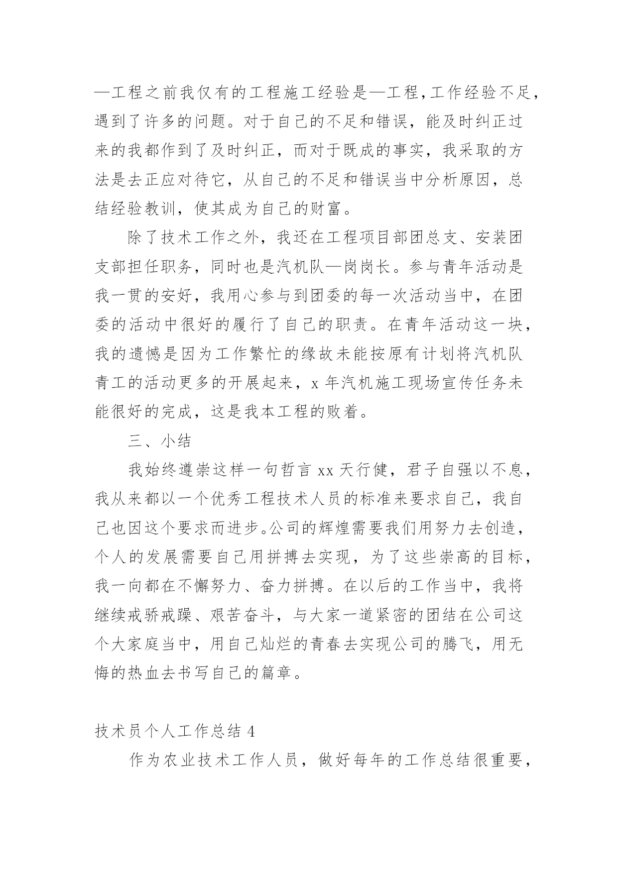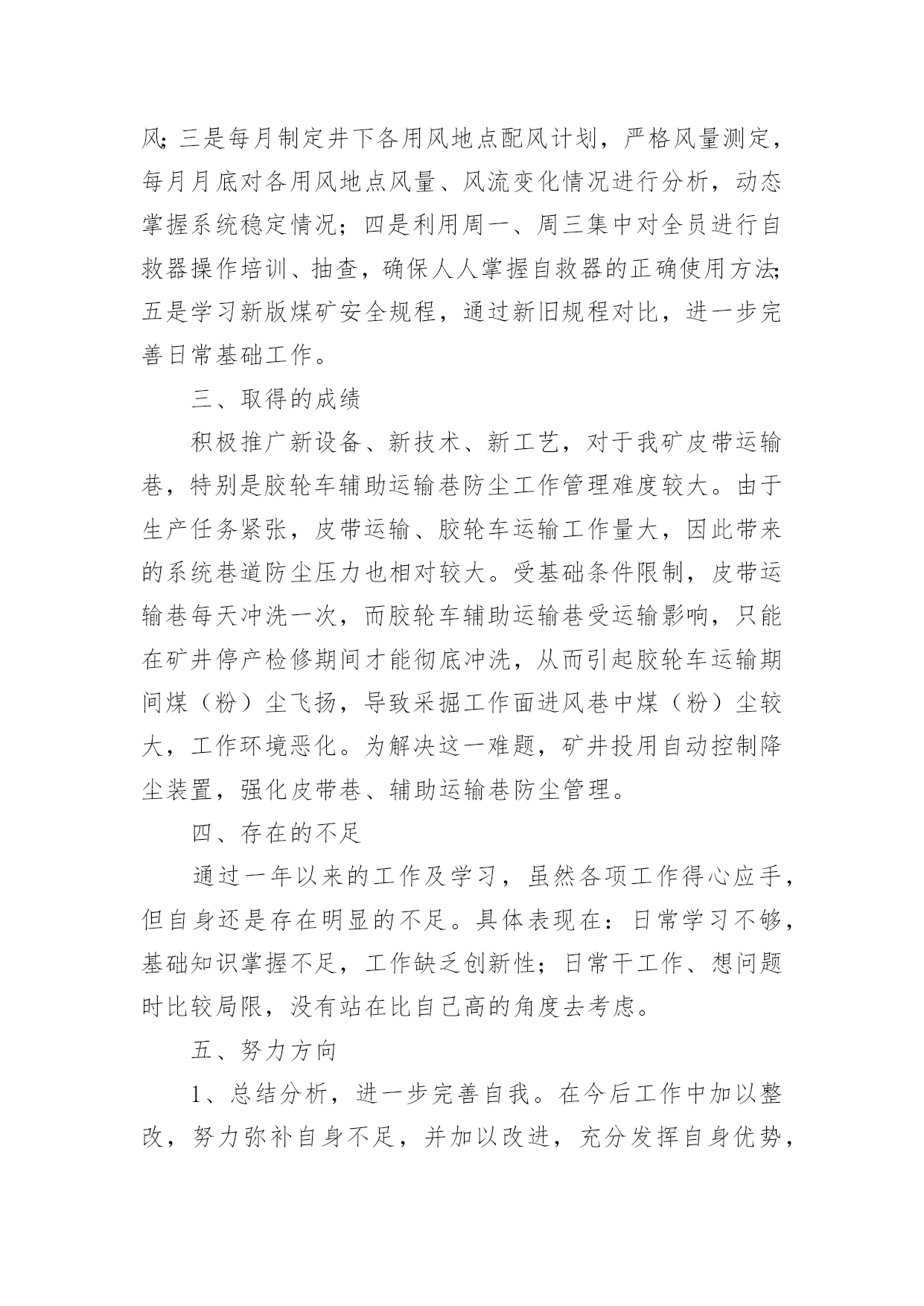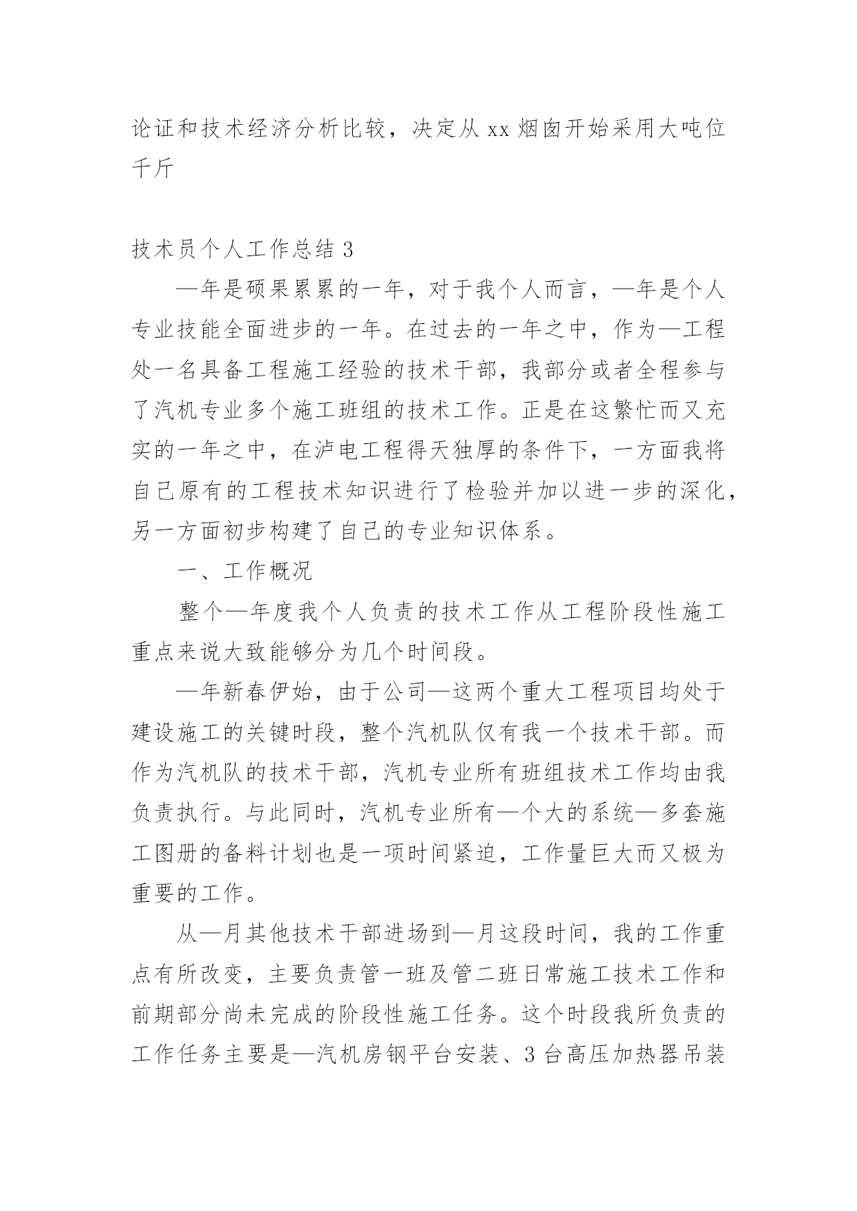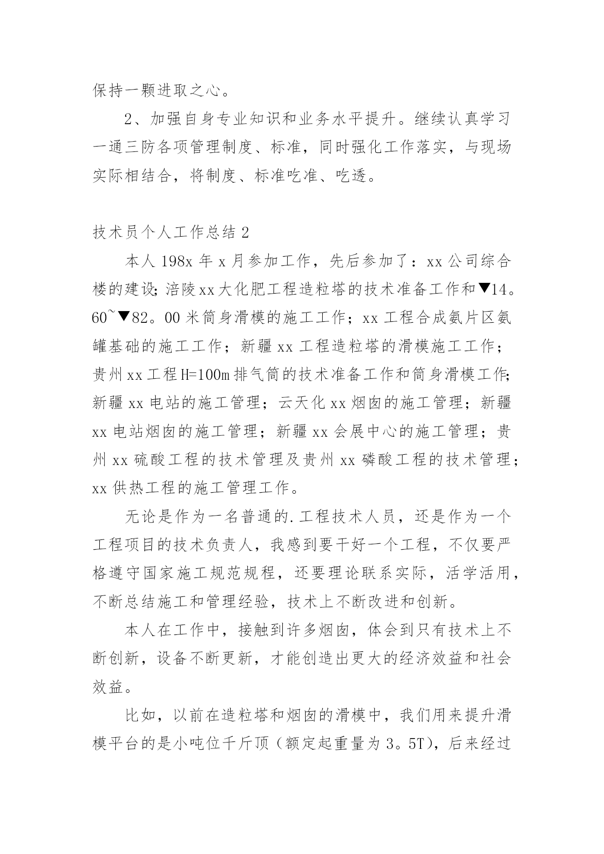 技术员个人工作总结技术员个人工作总结15篇(优秀)总结是对取得的成绩、存在的问题及得到的经验和教训等方面情况进行评价与描述的一种书面材料,它可以明确下一步的工作方向,少走弯路,少犯错误,提高工作效益,不如立即行动起来写一份总结吧。那么总结有什么格式呢?下面是小编收集整理的技术员个人工作总结,仅供参考,希望能够帮助到大家。技术员个人工作总结1近一年来以来,本人能够认真做好自己的本职工作,现结合自己的日常工作、履职履责等情况,进行简要总结如下:一、思想政治方面在日常工作中,积极参加上级公司及我矿组织的各项技术学习和业务培训,认真学习各级公司文件精神,努力学习一通三防专业知识,不断提高自身的'工作能力和业务水平。二、个人履职情况一是编制矿井年度通风能力核定,对照AQ煤矿通风能力核定标准、山西焦煤矿井配风、风量计算标准等相关风量计算要求,认真核算采掘开工作面及系统巷道风量,确保矿井通风系统满足安全生产需求;二是下井过程中重点检查边远、薄弱区的系统、风量配备、设施完好情况,掌握系统配风;三是每月制定井下各用风地点配风计划,严格风量测定,每月月底对各用风地点风量、风流变化情况进行分析,动态掌握系统稳定情况;四是利用周一、周三集中对全员进行自救器操作培训、抽查,确保人人掌握自救器的正确使用方法;五是学习新版煤矿安全规程,通过新旧规程对比,进一步完善日常基础工作。三、取得的成绩积极推广新设备、新技术、新工艺,对于我矿皮带运输巷,特别是胶轮车辅助运输巷防尘工作管理难度较大。由于生产任务紧张,皮带运输、胶轮车运输工作量大,因此带来的系统巷道防尘压力也相对较大。受基础条件限制,皮带运输巷每天冲洗一次,而胶轮车辅助运输巷受运输影响,只能在矿井停产检修期间才能彻底冲洗,从而引起胶轮车运输期间煤(粉)尘飞扬,导致采掘工作面进风巷中煤(粉)尘较大,工作环境恶化。为解决这一难题,矿井投用自动控制降尘装置,强化皮带巷、辅助运输巷防尘管理。四、存在的不足通过一年以来的工作及学习,虽然各项工作得心应手,但自身还是存在明显的不足。具体表现在:日常学习不够,基础知识掌握不足,工作缺乏创新性;日常干工作、想问题时比较局限,没有站在比自己高的角度去考虑。五、努力方向1、总结分析,进一步完善自我。在今后工作中加以整改,努力弥补自身不足,并加以改进,充分发挥自身优势,保持一颗进取之心。2、加强自身专业知识和业务水平提升。继续认真学习一通三防各项管理制度、标准,同时强化工作落实,与现场实际相结合,将制度、标准吃准、吃透。技术员个人工作总结2本人198x年x月参加工作,先后参加了:xx公司综合楼的建设;涪陵xx大化肥工程造粒塔的技术准备工作和▼14。60~▼82。00米筒身滑模的施工工作;xx工程合成氨片区氨罐基础的施工工作;新疆xx工程造粒塔的滑模施工工作;贵州xx工程H=100m排气筒的技术准备工作和筒身滑模工作;新疆xx电站的施工管理;云天化xx烟囱的施工管理;新疆xx电站烟囱的施工管理;新疆xx会展中心的施工管理;贵州xx硫酸工程的技术管理及贵州xx磷酸工程的技术管理;xx供热工程的施工管理工作。无论是作为一名普通的.工程技术人员,还是作为一个工程项目的技术负责人,我感到要干好一个工程,不仅要严格遵守国家施工规范规程,还要理论联系实际,活学活用,不断总结施工和管理经验,技术上不断改进和创新。本人在工作中,接触到许多烟囱,体会到只有技术上不断创新,设备不断更新,才能创造出更大的经济效益和社会效益。比如,以前在造粒塔和烟囱的滑模中,我们用来提升滑模平台的是小吨位千斤顶(额定起重量为3。5T),后来经过论证和技术经济分析比较,决定从xx烟囱开始采用大吨位千斤技术员个人工作总结3—年是硕果累累的一年,对于我个人而言,—年是个人专业技能全面进步的一年。在过去的一年之中,作为—工程处一名具备工程施工经验的技术干部,我部分或者全程参与了汽机专业多个施工班组的技术工作。正是在这繁忙而又充实的一年之中,在泸电工程得天独厚的条件下,一方面我将自己原有的工程技术知识进行了检验并加以进一步的深化,另一方面初步构建了自己的专业知识体系。一、工作概况整个—年度我个人负责的技术工作从工程阶段性施工重点来说大致能够分为几个时间段。—年新春伊始,由于公司—这两个重大工程项目均处于建设施工的关键时段,整个汽机队仅有我一个技术干部。而作为汽机队的技术干部,汽机专业所有班组技术工作均由我负责执行。与此同时,汽机专业所有—个大的系统—多套施工图册的备料计划也是一项时间紧迫,工作量巨大而又极为重要的工作。从—月其他技术干部进场到—月这段时间,我的工作重点有所改变,主要负责管一班及管二班日常施工技术工作和前期部分尚未完成的阶段性施工任务。这个时段我所负责的工作任务主要是—汽机房钢平台安装、3台高压加热器吊装拖运、