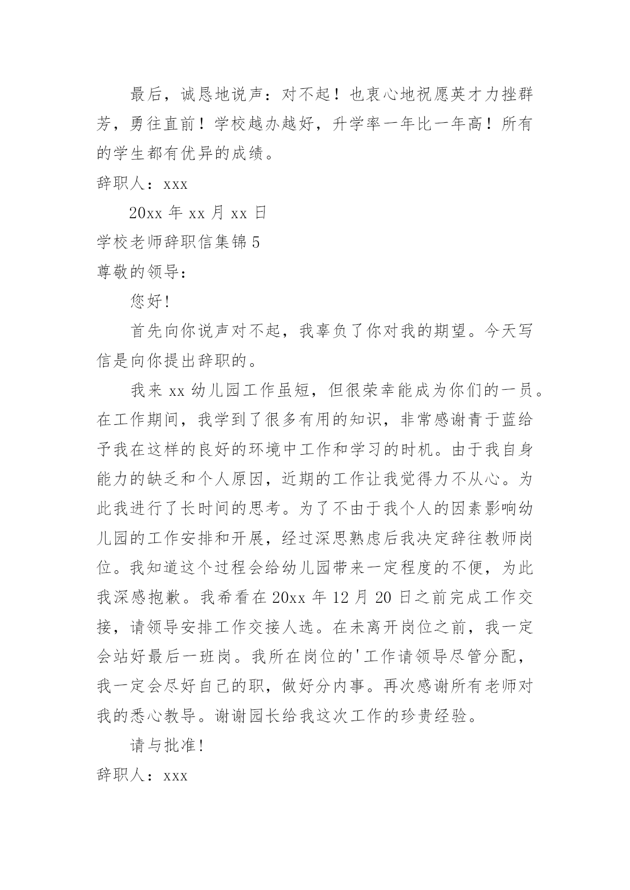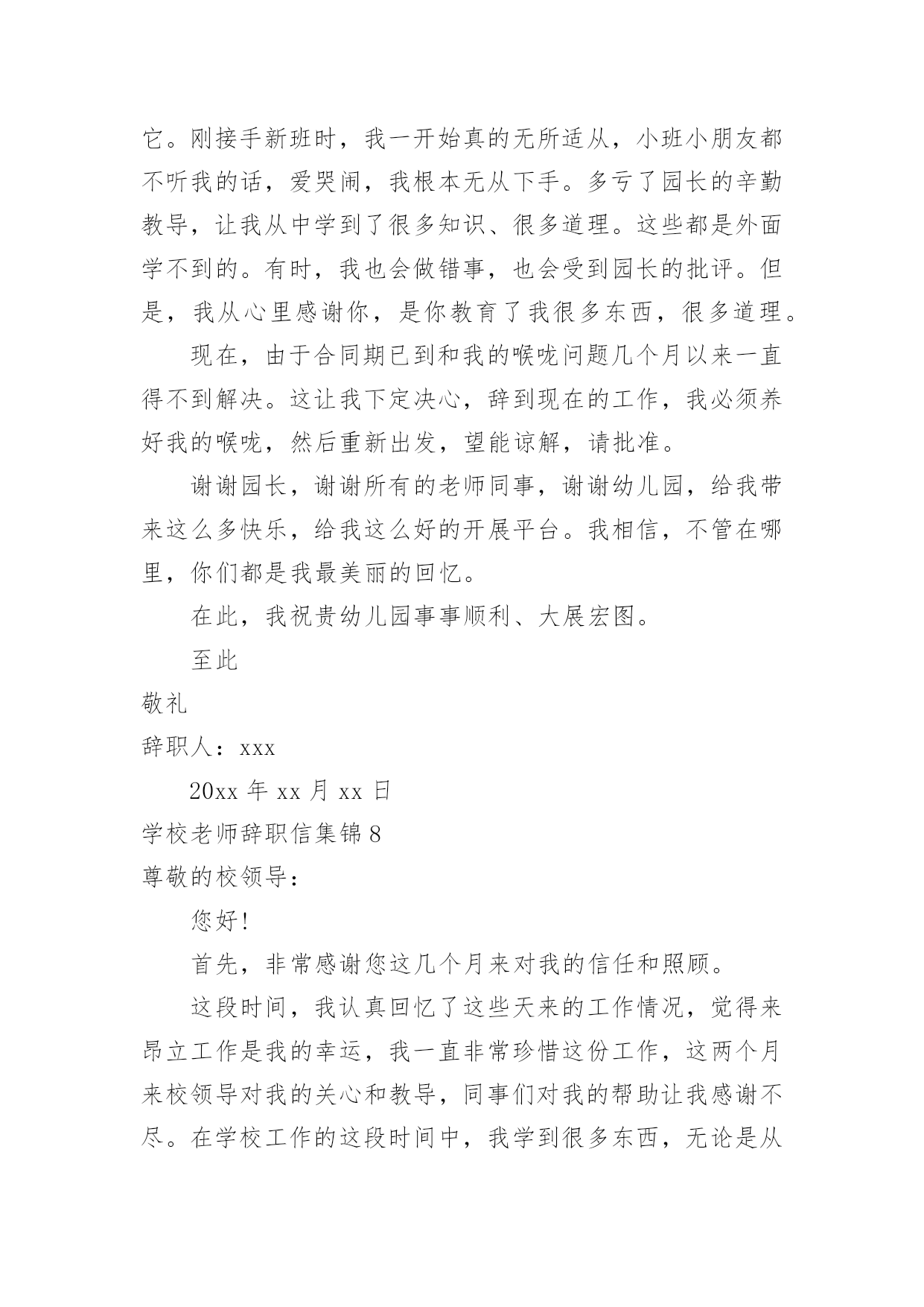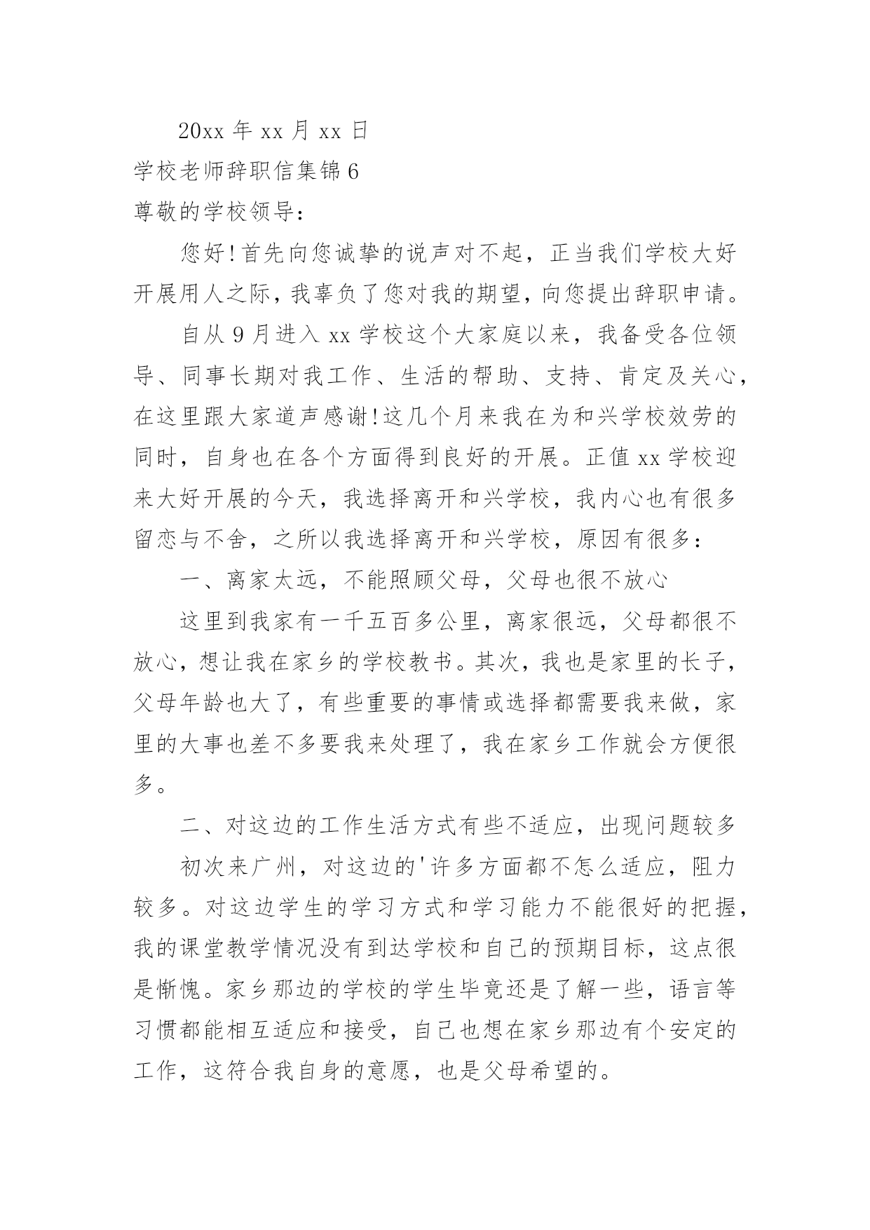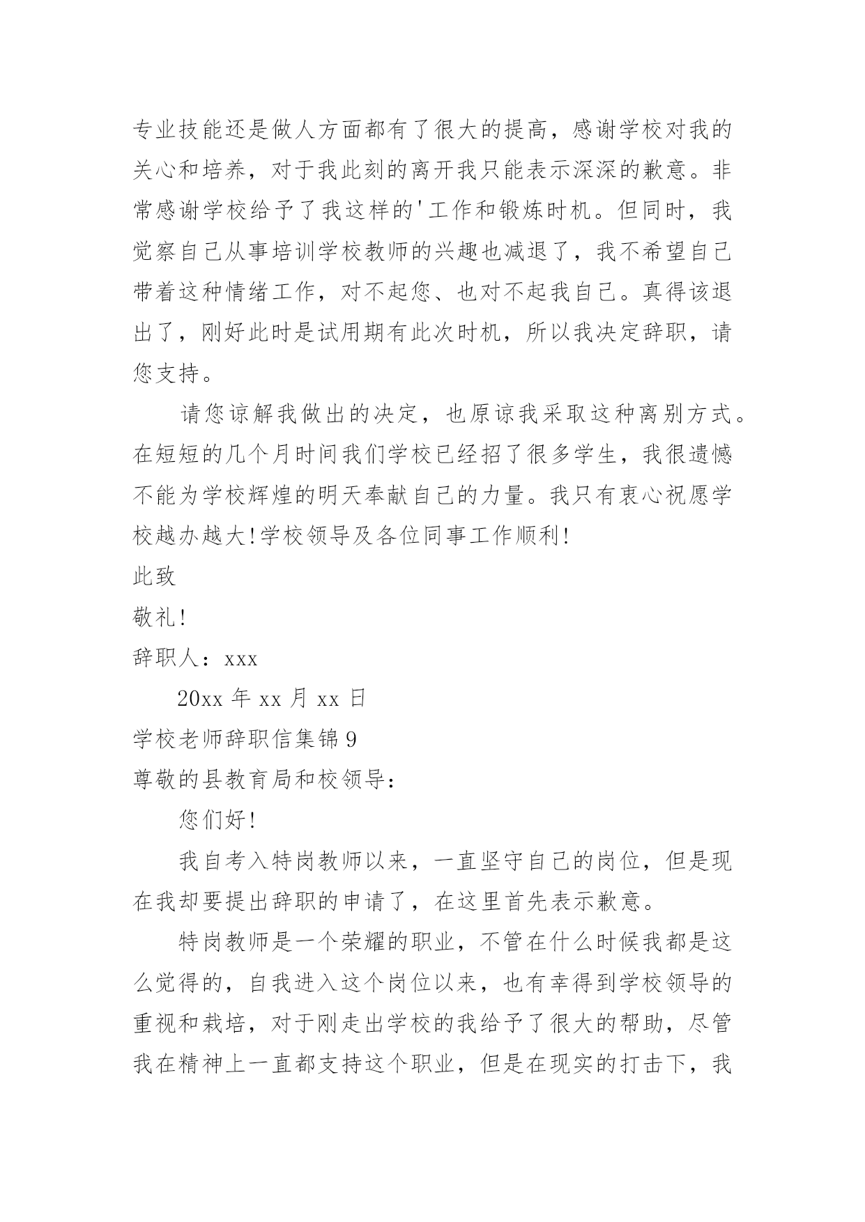 学校老师辞职信学校老师辞职信集锦进入一家公司一段时间后,即使工作很好,但也可能会选择辞职,这时候就要写好辞职信了。现在你是否对辞职信一筹莫展呢?以下是小编整理的学校老师辞职信集锦,仅供参考,欢迎大家阅读。学校老师辞职信集锦1尊敬的校领导:您好!首先我只能说声对不起,我辜负了您们对我的期望,今天写信是向您提出辞职的。自20xx年x月分配到x中以来,我一直受到了教育局和学校的各方面的帮助,尤其是学校领导,x校长,对我工作和生活都很关心,对此我是感恩不尽的。刚大学毕业时,我由一名学生成了一位荣耀的人民教师,对教师这职业我是既熟悉又陌生。记得在我来校的当天,就受到了学校领导和同事们的欢送,心里感到非常的温暖;教学工作也是无私的将许多教学经验传授给我。从备课到讲解,从和学生相处到批改作业,从教态到板书设计,从语言运用到为人处世等等,让我学了不少东西。学校是很器重我的,近三年连续让我教高三。应该说我是很认真很努力地在工作,我敢发誓的说,我没有哪一天,哪一节课是在混日子,在敷衍学生,我都尽我最大的力做好我的本职工作。但今天我决定选择离开x中,有这么几个原因:第一,虽然我很尽力的从事教学工作,但教学还是不如人意,取得的成绩微乎其微,辜负了学校领导对我的期望,我也是很无奈,有时真疑心自己的能力了。想来,可能验证了一句话:本科大学毕业的不如一般大学毕业的,一般大学毕业的不如师专毕业的`,师专毕业的不如高中毕业的。因此,我觉得我不适合在x中工作,再这样下去的话,肯定会影响学校的升学率。在现在如此看中升学率的环境下,请考虑批准我的辞职报告。第二,就是学校的管理。开始的时候觉得还能跟上学校改革的步伐,但越到后面,越觉得难以适应。比方学校规定没有课也要坐班,我也赞同的,也坐班的。但我的课经常是早上4、5节,而学校只能10:00到10:30去吃早点,那样只能来不及,但不吃的话我身体又吃不消,更怕影响教学质量。因此经常9:30去吃,从而违反了学校的规定,要算我脱岗。我想,我是不适应学校的管理了,因此选择离开。第三,就是工资,每个月打到卡上的元,让我很难想象什么时候能买得起按揭的住房,倍感压力重大。四中是强调不为薪水而工作的,而我,还做不到这点。因为我家里还有父母,以后还会成家,会有孩子,都需要薪水。第四,也许是能力有限,我认为我在四中已经没有更大的开展时机了,已经工作了5年多,根本上定型了。因此,我决定选择一个新的工作环境,希望领导批准,敬请早些安排。当然,无论我在哪里,我都会为做力所能及的事情,因为我为我曾经是人而感到骄傲。最后,诚恳地说声:对不起!也衷心地祝愿力挫群芳,永往直前!学校越办越好,升学率一年比一年高!所有的学生都考上重点大学!此致敬礼!辞职人:xxx20xx年xx月xx日学校老师辞职信集锦2尊敬的学校领导:您好!首先感谢您在百忙之中抽出时间阅读我的辞职信。首先祝学校在新的一年中蓬勃开展,取得更加优异的成绩;祝愿学校上下所有领导和员工身体健康,万事如意!我为能在工作过感到无比的荣幸和自豪,我会思念在这里的每时每刻,感谢学校给了我这么一个时机。在学校这xx年多里,学校领导和周围同事给了我无比的照顾和关心,让我深切的感受到了学校倡导的人情化管理给我们带来的亲切和温馨。我深信,学校将沿着通往胜利此岸的高速轨道飞速前进,将一如既往的在领域领航!再次对我的'离职给学校带来的不便表示抱歉,同时我也希望学校能够体恤我的个人实际,对我的申请予以考虑并批准。此致敬礼!辞职人:xxx20xx年xx月xx日学校老师辞职信集锦3尊敬的中学领导:我于年从学院毕业,有幸来到学参加工作,在过去的多时间里,学校领导始终重视青年教师的培养和成长,工作中高标准严要求,生活上问寒问暖、无微不至。学校为我个人的开展给予了良好的学习和锻炼时机,使我不断学习充实了自己,增加自己知识和实践经验。在学校这个充满活力的大家庭中,领导体谅下属,同事们勤奋敬业,在工作中有一股热火朝天的干劲,在生活中又相互照顾,在学校我感受到了家的温暖,在此我对于学校长期的照顾表示衷心的.感谢!20xx年初,我在请示学校领导同意后,参加自治区统一组织的公务员考试,被单位录取。为此我不得不离开我深爱的教育事业,辞别给我温暖和关心的中学。在此,向尊敬的领导提出辞职,非常感谢领导多年来对我的的关心和培养。最后祝愿中学在今后的实践中取得更加优异的成绩,迎来新的辉煌!此致敬礼!辞职人:xxx20xx年xx月xx日学校老师辞职信集锦4尊敬的校长:本人从2月中旬来到英才学校上班,成为其中的一份子。我感到很荣幸,也曾经希望想要把这份工作认真做好。现在我辜负了您的期望,在此我想提出辞职。我一直受到了您的各方面的帮助,对此我是感恩不尽的。刚大学毕业,我由一名学生成了一位荣耀的人民教师,对教师这职业我是既熟悉又陌生。您是很器重我的,