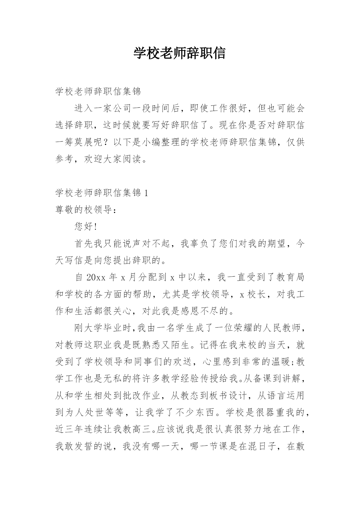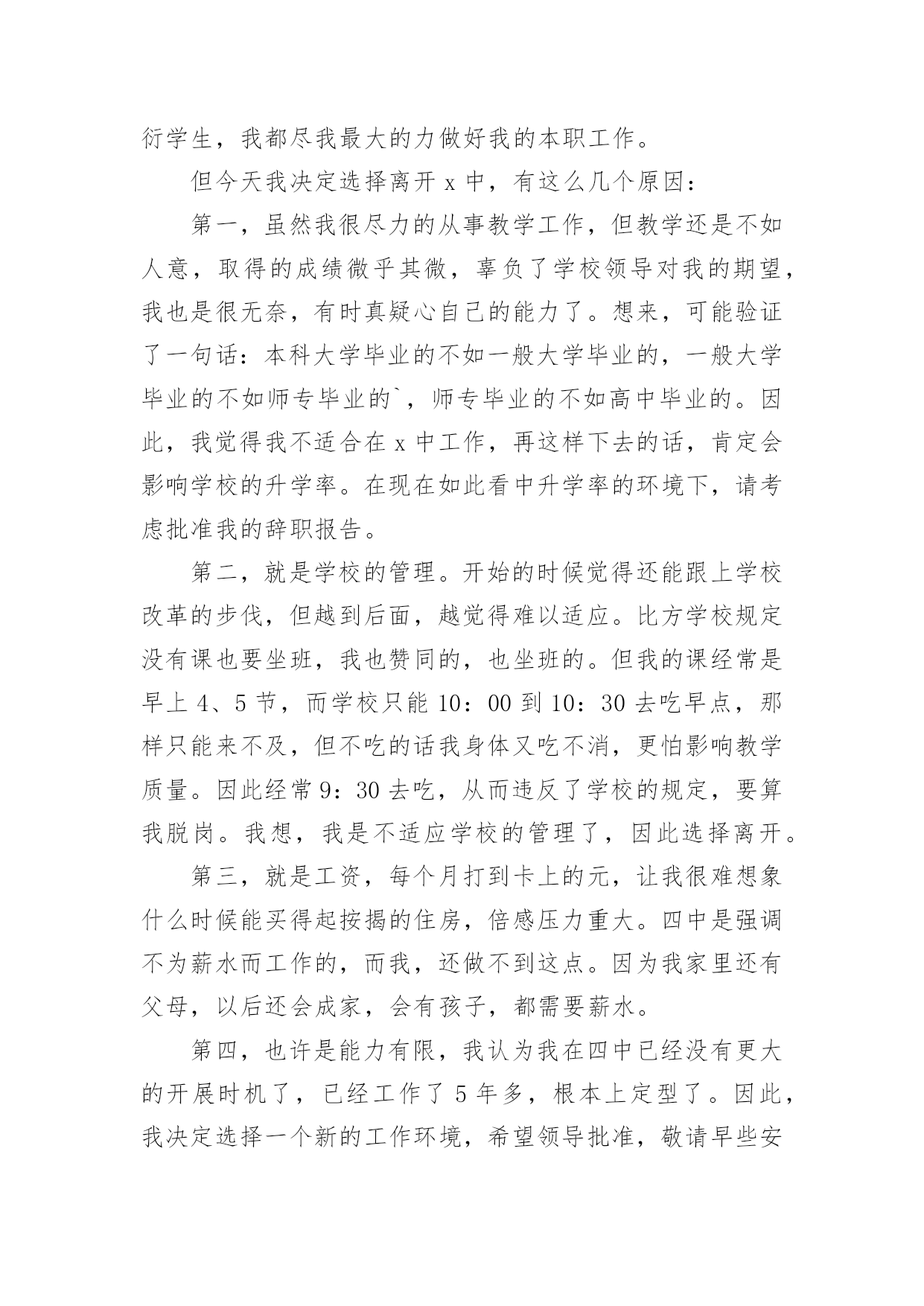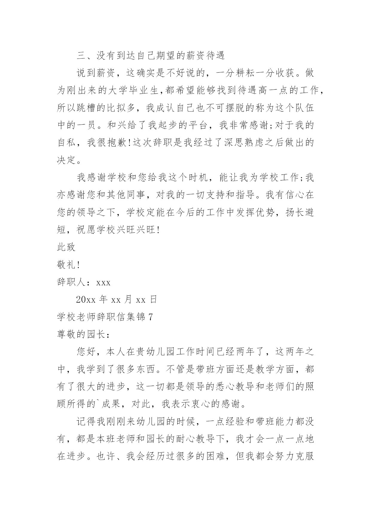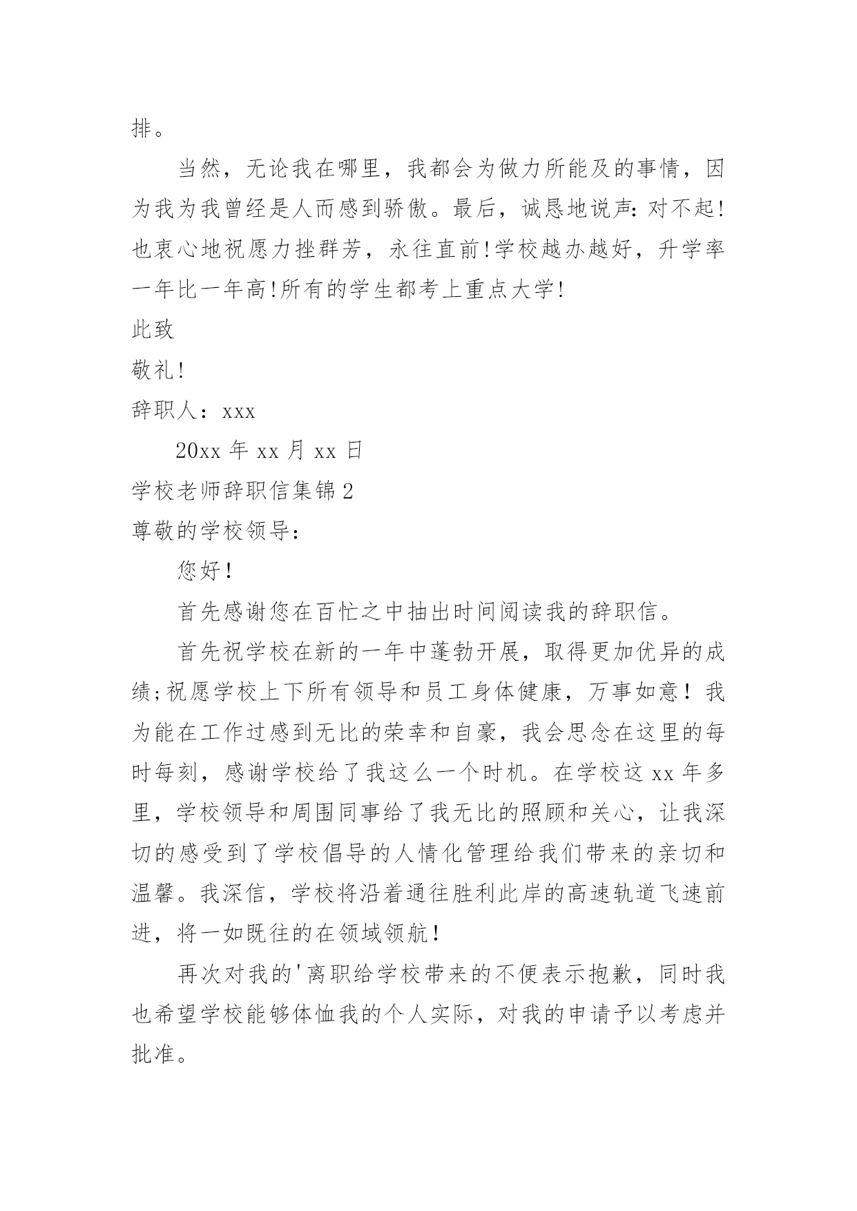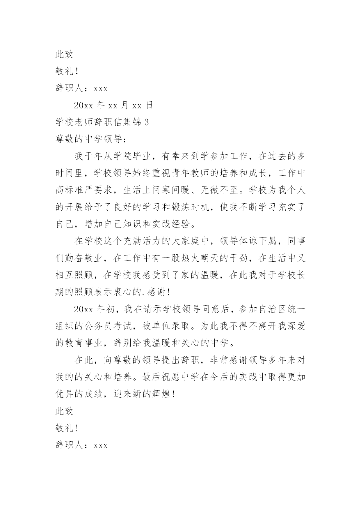 学校老师辞职信学校老师辞职信集锦进入一家公司一段时间后,即使工作很好,但也可能会选择辞职,这时候就要写好辞职信了。现在你是否对辞职信一筹莫展呢?以下是小编整理的学校老师辞职信集锦,仅供参考,欢迎大家阅读。学校老师辞职信集锦1尊敬的校领导:您好!首先我只能说声对不起,我辜负了您们对我的期望,今天写信是向您提出辞职的。自20xx年x月分配到x中以来,我一直受到了教育局和学校的各方面的帮助,尤其是学校领导,x校长,对我工作和生活都很关心,对此我是感恩不尽的。刚大学毕业时,我由一名学生成了一位荣耀的人民教师,对教师这职业我是既熟悉又陌生。记得在我来校的当天,就受到了学校领导和同事们的欢送,心里感到非常的温暖;教学工作也是无私的将许多教学经验传授给我。从备课到讲解,从和学生相处到批改作业,从教态到板书设计,从语言运用到为人处世等等,让我学了不少东西。学校是很器重我的,近三年连续让我教高三。应该说我是很认真很努力地在工作,我敢发誓的说,我没有哪一天,哪一节课是在混日子,在敷衍学生,我都尽我最大的力做好我的本职工作。但今天我决定选择离开x中,有这么几个原因:第一,虽然我很尽力的从事教学工作,但教学还是不如人意,取得的成绩微乎其微,辜负了学校领导对我的期望,我也是很无奈,有时真疑心自己的能力了。想来,可能验证了一句话:本科大学毕业的不如一般大学毕业的,一般大学毕业的不如师专毕业的`,师专毕业的不如高中毕业的。因此,我觉得我不适合在x中工作,再这样下去的话,肯定会影响学校的升学率。在现在如此看中升学率的环境下,请考虑批准我的辞职报告。第二,就是学校的管理。开始的时候觉得还能跟上学校改革的步伐,但越到后面,越觉得难以适应。比方学校规定没有课也要坐班,我也赞同的,也坐班的。但我的课经常是早上4、5节,而学校只能10:00到10:30去吃早点,那样只能来不及,但不吃的话我身体又吃不消,更怕影响教学质量。因此经常9:30去吃,从而违反了学校的规定,要算我脱岗。我想,我是不适应学校的管理了,因此选择离开。第三,就是工资,每个月打到卡上的元,让我很难想象什么时候能买得起按揭的住房,倍感压力重大。四中是强调不为薪水而工作的,而我,还做不到这点。因为我家里还有父母,以后还会成家,会有孩子,都需要薪水。第四,也许是能力有限,我认为我在四中已经没有更大的开展时机了,已经工作了5年多,根本上定型了。因此,我决定选择一个新的工作环境,希望领导批准,敬请早些安排。当然,无论我在哪里,我都会为做力所能及的事情,因为我为我曾经是人而感到骄傲。最后,诚恳地说声:对不起!也衷心地祝愿力挫群芳,永往直前!学校越办越好,升学率一年比一年高!所有的学生都考上重点大学!此致敬礼!辞职人:xxx20xx年xx月xx日学校老师辞职信集锦2尊敬的学校领导:您好!首先感谢您在百忙之中抽出时间阅读我的辞职信。首先祝学校在新的一年中蓬勃开展,取得更加优异的成绩;祝愿学校上下所有领导和员工身体健康,万事如意!我为能在工作过感到无比的荣幸和自豪,我会思念在这里的每时每刻,感谢学校给了我这么一个时机。在学校这xx年多里,学校领导和周围同事给了我无比的照顾和关心,让我深切的感受到了学校倡导的人情化管理给我们带来的亲切和温馨。我深信,学校将沿着通往胜利此岸的高速轨道飞速前进,将一如既往的在领域领航!再次对我的'离职给学校带来的不便表示抱歉,同时我也希望学校能够体恤我的个人实际,对我的申请予以考虑并批准。此致敬礼!辞职人:xxx20xx年xx月xx日学校老师辞职信集锦3尊敬的中学领导:我于年从学院毕业,有幸来到学参加工作,在过去的多时间里,学校领导始终重视青年教师的培养和成长,工作中高标准严要求,生活上问寒问暖、无微不至。学校为我个人的开展给予了良好的学习和锻炼时机,使我不断学习充实了自己,增加自己知识和实践经验。在学校这个充满活力的大家庭中,领导体谅下属,同事们勤奋敬业,在工作中有一股热火朝天的干劲,在生活中又相互照顾,在学校我感受到了家的温暖,在此我对于学校长期的照顾表示衷心的.感谢!20xx年初,我在请示学校领导同意后,参加自治区统一组织的公务员考试,被单位录取。为此我不得不离开我深爱的教育事业,辞别给我温暖和关心的中学。在此,向尊敬的领导提出辞职,非常感谢领导多年来对我的的关心和培养。最后祝愿中学在今后的实践中取得更加优异的成绩,迎来新的辉煌!此致敬礼!辞职人:xxx20xx年xx月xx日学校老师辞职信集锦4尊敬的校长:本人从2月中旬来到英才学校上班,成为其中的一份子。我感到很荣幸,也曾经希望想要把这份工作认真做好。现在我辜负了您的期望,在此我想提出辞职。我一直受到了您的各方面的帮助,对此我是感恩不尽的。刚大学毕业,我由一名学生成了一位荣耀的人民教师,对教师这职业我是既熟悉又陌生。您是很器重我的,