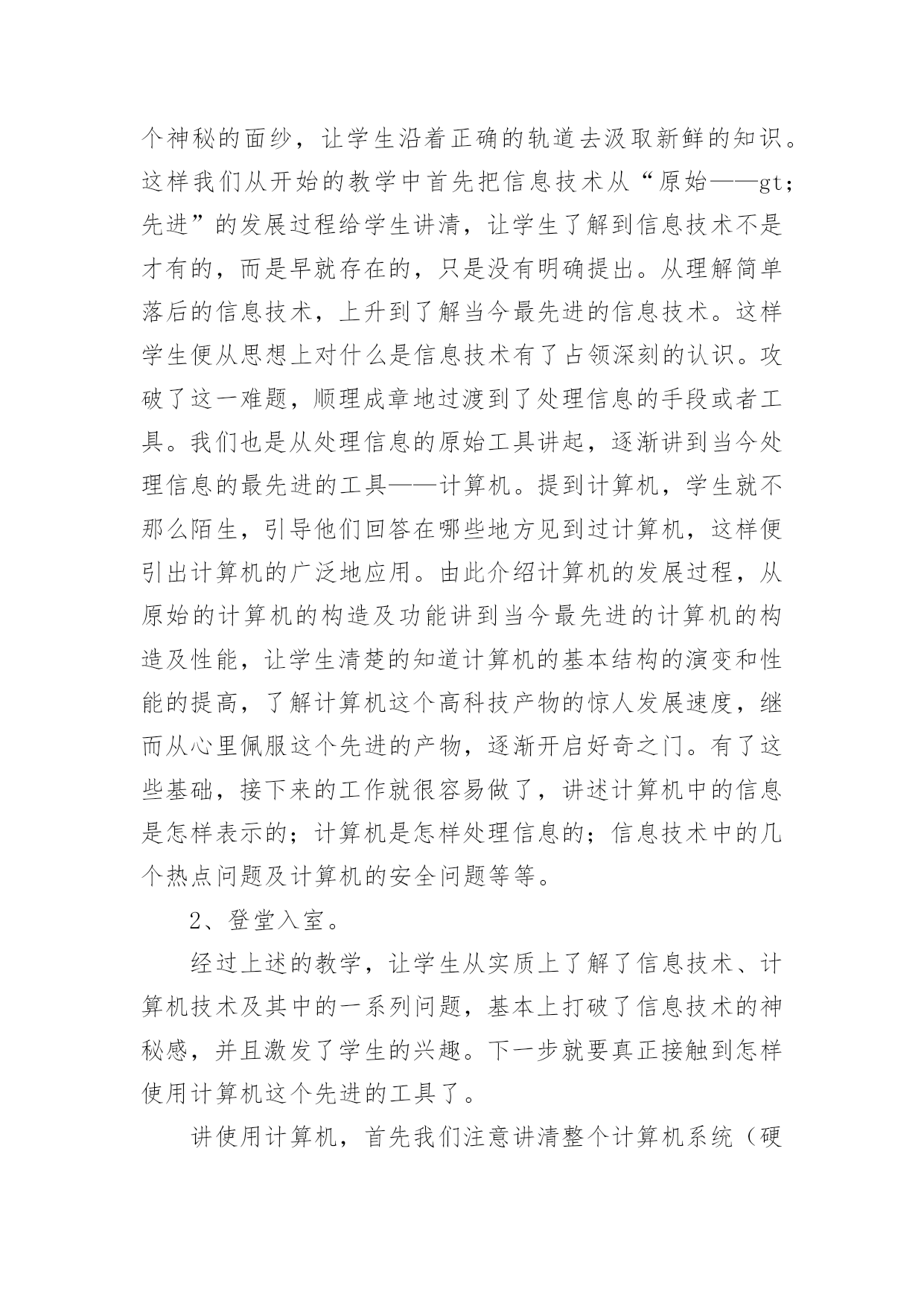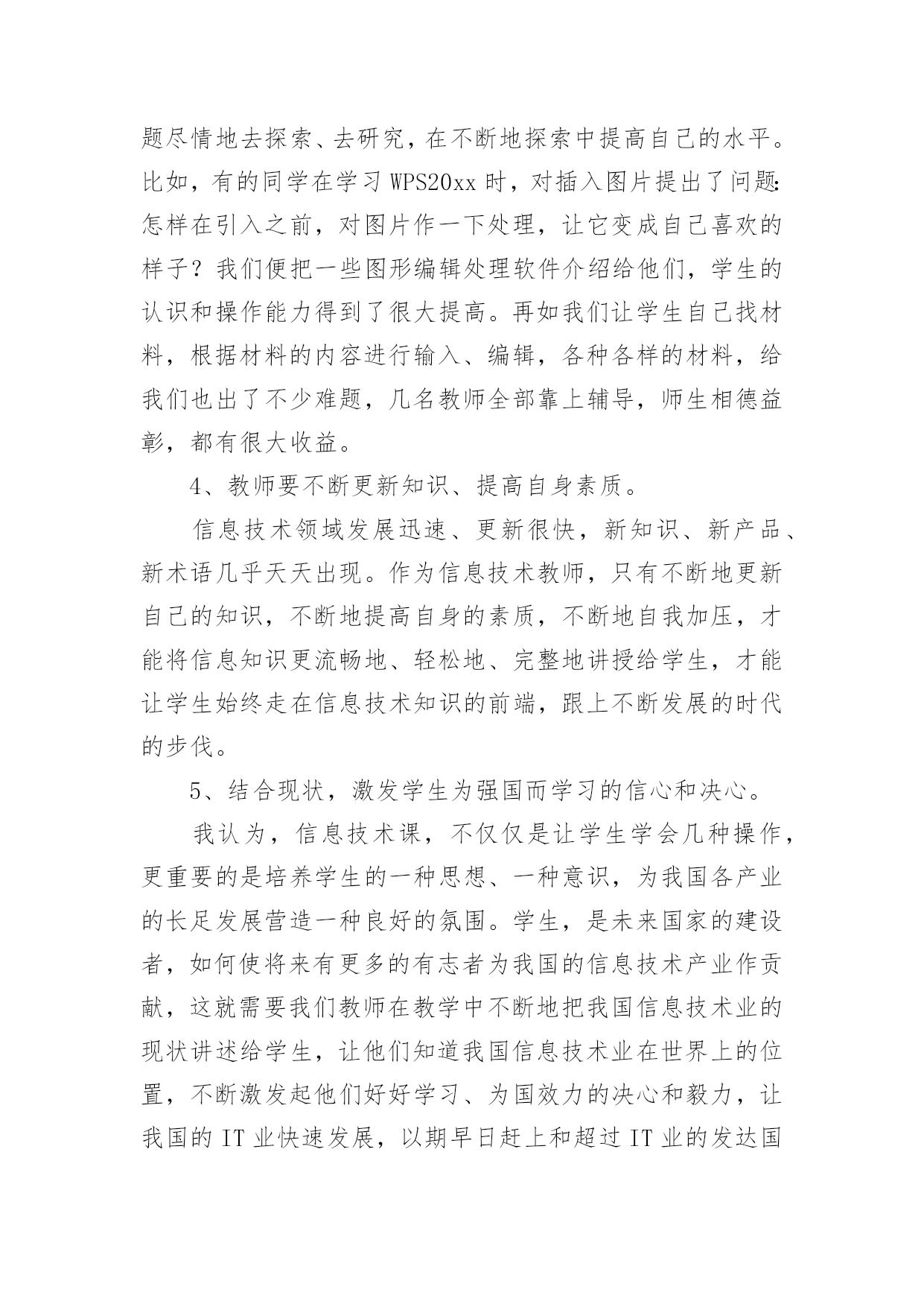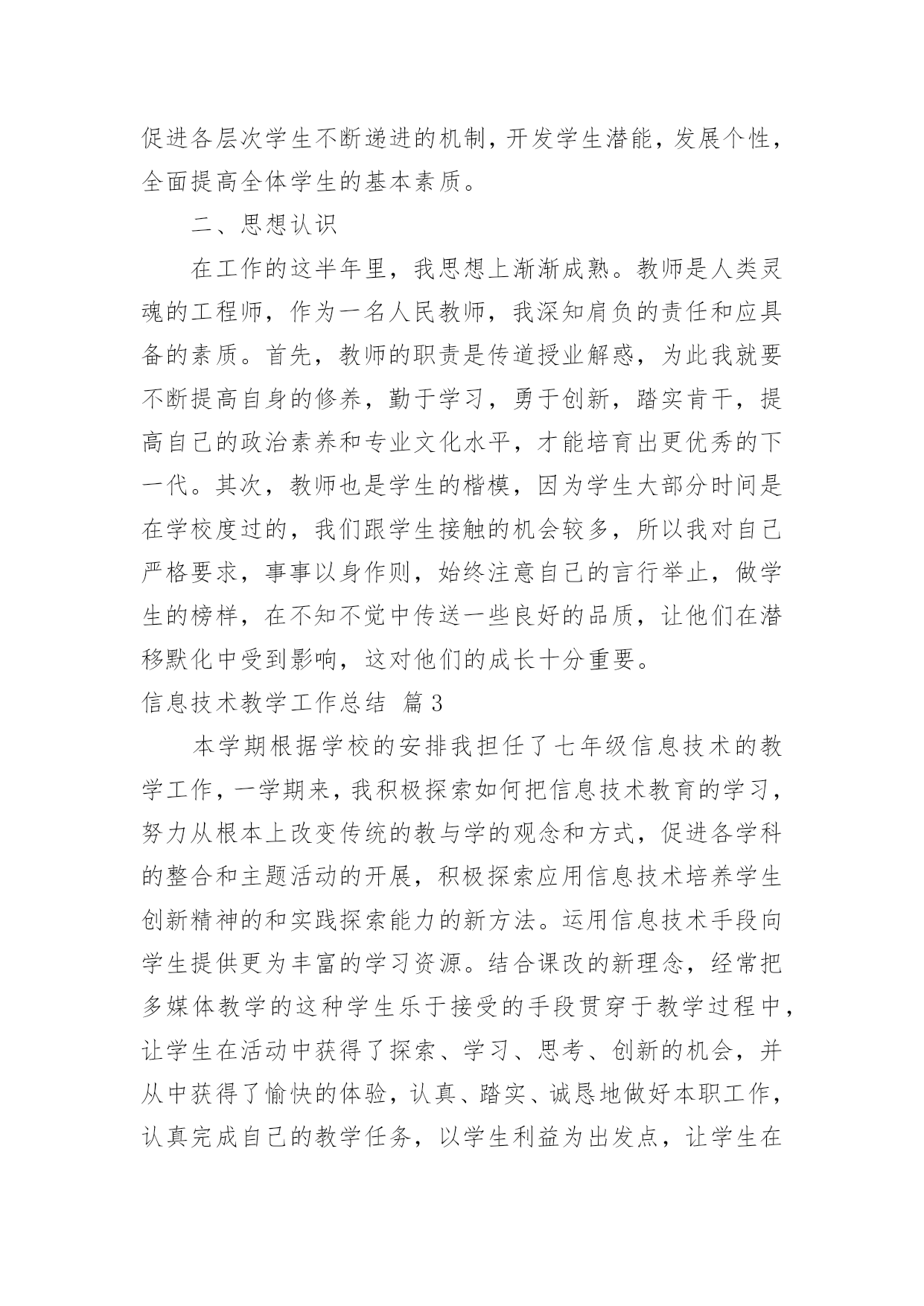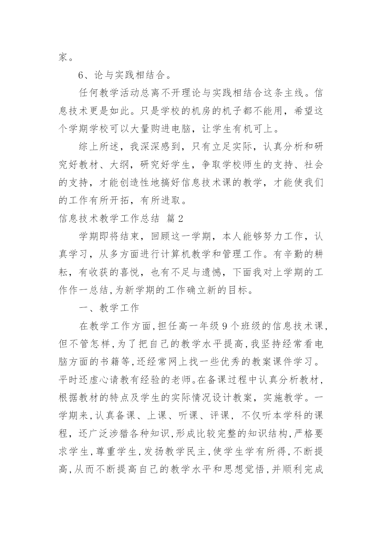 信息技术教学工作总结【精华】信息技术教学工作总结10篇总结是事后对某一时期、某一项目或某些工作进行回顾和分析,从而做出带有规律性的结论,它可以帮助我们有寻找学习和工作中的规律,让我们一起来学习写总结吧。但是总结有什么要求呢?下面是小编精心整理的信息技术教学工作总结10篇,仅供参考,欢迎大家阅读。信息技术教学工作总结篇1信息技术作为一门重要的技术,已经被越来越多的人们所使用。在当今及未来社会,掌握信息技术是对人的一种基本要求,人们都知道不懂得信息技术的人必将被现代社会所淘汰。但是,信息技术课作为一门新课,还很年轻,需要我们教师同行及社会各界人士等不断地关心、支持、探索、交流,使我们的信息技术课教学内容不断更新,教学水平不断提高。这个学期我教高一10个班90—99班和初一年级。以下就是我在一个学期以来的信息技术课教学中的一点感受、体会和总结。怎样让一个从未接触过信息技术知识的学生,熟练地掌握最基本的知识,这是开始上课前首先思考的问题。也是教学研究的第一个课题。1、揭开神秘的面纱。对学生来说,信息技术课是一个陌生学科,大多学生有很大的神秘感。首先我们注意帮助学生揭开“信息技术”这个神秘的面纱,让学生沿着正确的轨道去汲取新鲜的知识。这样我们从开始的教学中首先把信息技术从“原始——gt;先进”的发展过程给学生讲清,让学生了解到信息技术不是才有的,而是早就存在的,只是没有明确提出。从理解简单落后的信息技术,上升到了解当今最先进的信息技术。这样学生便从思想上对什么是信息技术有了占领深刻的认识。攻破了这一难题,顺理成章地过渡到了处理信息的手段或者工具。我们也是从处理信息的原始工具讲起,逐渐讲到当今处理信息的最先进的工具——计算机。提到计算机,学生就不那么陌生,引导他们回答在哪些地方见到过计算机,这样便引出计算机的广泛地应用。由此介绍计算机的发展过程,从原始的计算机的构造及功能讲到当今最先进的计算机的构造及性能,让学生清楚的知道计算机的基本结构的演变和性能的提高,了解计算机这个高科技产物的惊人发展速度,继而从心里佩服这个先进的产物,逐渐开启好奇之门。有了这些基础,接下来的工作就很容易做了,讲述计算机中的信息是怎样表示的;计算机是怎样处理信息的;信息技术中的几个热点问题及计算机的安全问题等等。2、登堂入室。经过上述的教学,让学生从实质上了解了信息技术、计算机技术及其中的一系列问题,基本上打破了信息技术的神秘感,并且激发了学生的兴趣。下一步就要真正接触到怎样使用计算机这个先进的工具了。讲使用计算机,首先我们注意讲清整个计算机系统(硬件系统和软件系统),让学生搞清硬件、软件的作用。明白了这些,就可以学习计算机家族中的小兄弟——微型计算机的使用了。先讲述现在常用的操作系统软件,让学生明白自己所进行的操作都是通过操作系统软件来完成的。接着讲解现在最常用的windows98操作系统。在这里,我们注意了把微机从开机到windows98启动成功这个过程讲清楚,这有助于建立学生的整体意识。讲述windows98时,我们遵循学生的认知规律:先讲清最基本的鼠标操作,让学生反复练习,这里我们增加了一些学生感兴趣的小游戏,如纸牌、扫雷等加强鼠标操作的训练。实践证明,学生很快掌握了鼠标的使用方法。然后可以从最直观的桌面讲起,逐渐扩展到窗口操作、任务栏的作用及各种菜单等等。掌握了这些基本内容,使学生在学习如何对文字信息进行各种简单处理、文件及文件夹的概念、磁盘上的文件及文件夹的各种操作打下了良好的基础。这样,windows98的学习基本完成。实际上,在整个信息技术课中,学习windows98是一项最重要的内容,它是一个桥梁,沟通着用户和微机,只有真正掌握了这一层,用户才能高效率地使用各种其他软件。解决了这个问题,以后的教学就轻松多了。3、自由探寻。通过上述的教学,学生已会简单的使用计算机了。但是,毕竟学生求知欲比较强,这样在后期的教学中,我们采取让学生自主地发现问题、发散思维,让他们对自己感兴趣的问题尽情地去探索、去研究,在不断地探索中提高自己的水平。比如,有的同学在学习WPS20xx时,对插入图片提出了问题:怎样在引入之前,对图片作一下处理,让它变成自己喜欢的样子?我们便把一些图形编辑处理软件介绍给他们,学生的认识和操作能力得到了很大提高。再如我们让学生自己找材料,根据材料的内容进行输入、编辑,各种各样的材料,给我们也出了不少难题,几名教师全部靠上辅导,师生相德益彰,都有很大收益。4、教师要不断更新知识、提高自身素质。信息技术领域发展迅速、更新很快,新知识、新产品、新术语几乎天天出现。作为信息技术教师,只有不断地更新自己的知识,不断地提高自身的素质,不断地自我加压,才能将信息知识更流畅地、轻松地、完整地讲授给学生,才能让学生始终走在信息技术知识的前端,跟上不断发展的时