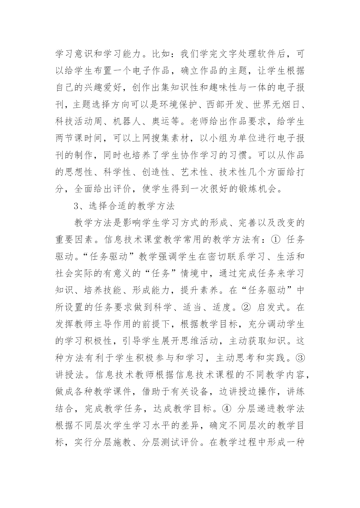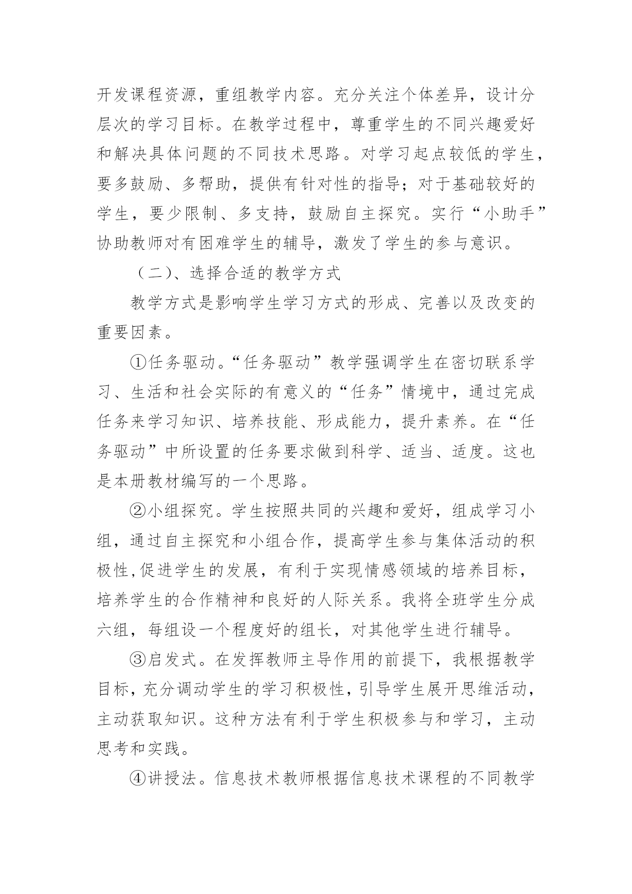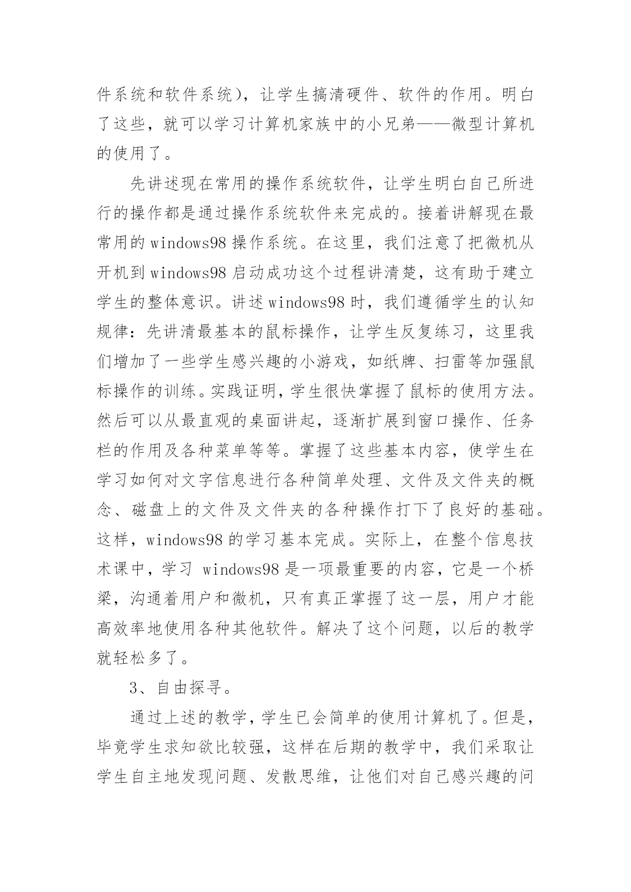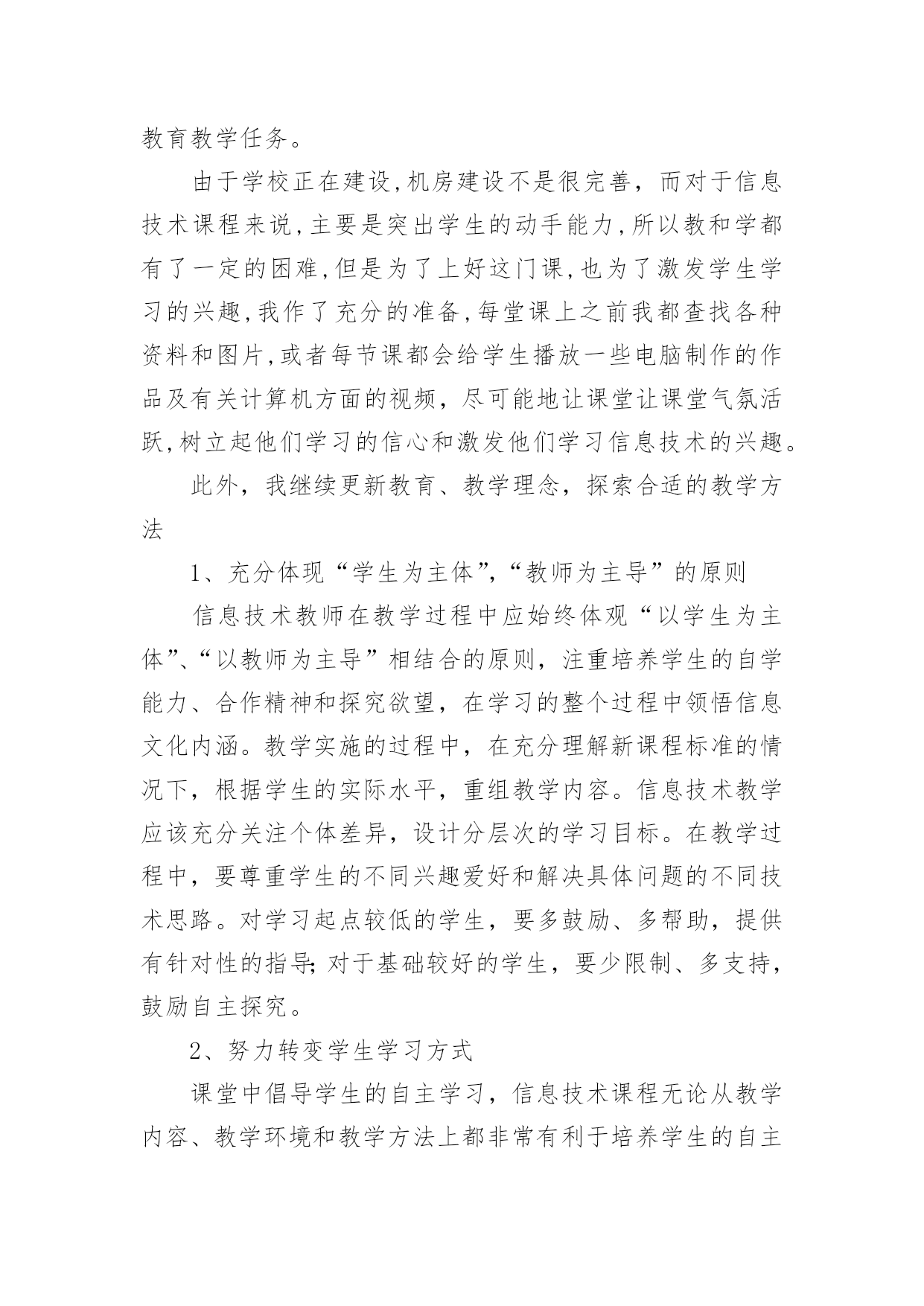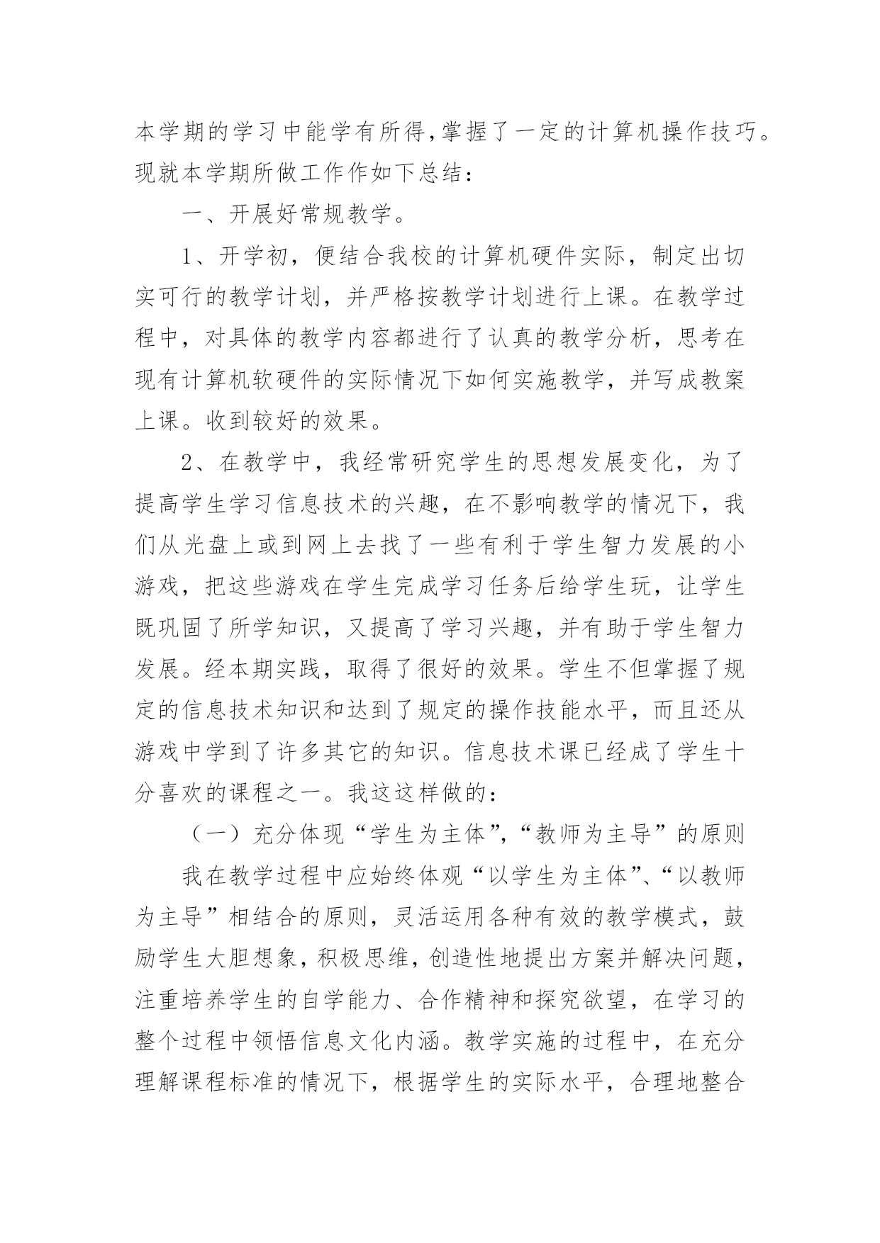 信息技术教学工作总结【精华】信息技术教学工作总结10篇总结是事后对某一时期、某一项目或某些工作进行回顾和分析,从而做出带有规律性的结论,它可以帮助我们有寻找学习和工作中的规律,让我们一起来学习写总结吧。但是总结有什么要求呢?下面是小编精心整理的信息技术教学工作总结10篇,仅供参考,欢迎大家阅读。信息技术教学工作总结篇1信息技术作为一门重要的技术,已经被越来越多的人们所使用。在当今及未来社会,掌握信息技术是对人的一种基本要求,人们都知道不懂得信息技术的人必将被现代社会所淘汰。但是,信息技术课作为一门新课,还很年轻,需要我们教师同行及社会各界人士等不断地关心、支持、探索、交流,使我们的信息技术课教学内容不断更新,教学水平不断提高。这个学期我教高一10个班90—99班和初一年级。以下就是我在一个学期以来的信息技术课教学中的一点感受、体会和总结。怎样让一个从未接触过信息技术知识的学生,熟练地掌握最基本的知识,这是开始上课前首先思考的问题。也是教学研究的第一个课题。1、揭开神秘的面纱。对学生来说,信息技术课是一个陌生学科,大多学生有很大的神秘感。首先我们注意帮助学生揭开“信息技术”这个神秘的面纱,让学生沿着正确的轨道去汲取新鲜的知识。这样我们从开始的教学中首先把信息技术从“原始——gt;先进”的发展过程给学生讲清,让学生了解到信息技术不是才有的,而是早就存在的,只是没有明确提出。从理解简单落后的信息技术,上升到了解当今最先进的信息技术。这样学生便从思想上对什么是信息技术有了占领深刻的认识。攻破了这一难题,顺理成章地过渡到了处理信息的手段或者工具。我们也是从处理信息的原始工具讲起,逐渐讲到当今处理信息的最先进的工具——计算机。提到计算机,学生就不那么陌生,引导他们回答在哪些地方见到过计算机,这样便引出计算机的广泛地应用。由此介绍计算机的发展过程,从原始的计算机的构造及功能讲到当今最先进的计算机的构造及性能,让学生清楚的知道计算机的基本结构的演变和性能的提高,了解计算机这个高科技产物的惊人发展速度,继而从心里佩服这个先进的产物,逐渐开启好奇之门。有了这些基础,接下来的工作就很容易做了,讲述计算机中的信息是怎样表示的;计算机是怎样处理信息的;信息技术中的几个热点问题及计算机的安全问题等等。2、登堂入室。经过上述的教学,让学生从实质上了解了信息技术、计算机技术及其中的一系列问题,基本上打破了信息技术的神秘感,并且激发了学生的兴趣。下一步就要真正接触到怎样使用计算机这个先进的工具了。讲使用计算机,首先我们注意讲清整个计算机系统(硬件系统和软件系统),让学生搞清硬件、软件的作用。明白了这些,就可以学习计算机家族中的小兄弟——微型计算机的使用了。先讲述现在常用的操作系统软件,让学生明白自己所进行的操作都是通过操作系统软件来完成的。接着讲解现在最常用的windows98操作系统。在这里,我们注意了把微机从开机到windows98启动成功这个过程讲清楚,这有助于建立学生的整体意识。讲述windows98时,我们遵循学生的认知规律:先讲清最基本的鼠标操作,让学生反复练习,这里我们增加了一些学生感兴趣的小游戏,如纸牌、扫雷等加强鼠标操作的训练。实践证明,学生很快掌握了鼠标的使用方法。然后可以从最直观的桌面讲起,逐渐扩展到窗口操作、任务栏的作用及各种菜单等等。掌握了这些基本内容,使学生在学习如何对文字信息进行各种简单处理、文件及文件夹的概念、磁盘上的文件及文件夹的各种操作打下了良好的基础。这样,windows98的学习基本完成。实际上,在整个信息技术课中,学习windows98是一项最重要的内容,它是一个桥梁,沟通着用户和微机,只有真正掌握了这一层,用户才能高效率地使用各种其他软件。解决了这个问题,以后的教学就轻松多了。3、自由探寻。通过上述的教学,学生已会简单的使用计算机了。但是,毕竟学生求知欲比较强,这样在后期的教学中,我们采取让学生自主地发现问题、发散思维,让他们对自己感兴趣的问题尽情地去探索、去研究,在不断地探索中提高自己的水平。比如,有的同学在学习WPS20xx时,对插入图片提出了问题:怎样在引入之前,对图片作一下处理,让它变成自己喜欢的样子?我们便把一些图形编辑处理软件介绍给他们,学生的认识和操作能力得到了很大提高。再如我们让学生自己找材料,根据材料的内容进行输入、编辑,各种各样的材料,给我们也出了不少难题,几名教师全部靠上辅导,师生相德益彰,都有很大收益。4、教师要不断更新知识、提高自身素质。信息技术领域发展迅速、更新很快,新知识、新产品、新术语几乎天天出现。作为信息技术教师,只有不断地更新自己的知识,不断地提高自身的素质,不断地自我加压,才能将信息知识更流畅地、轻松地、完整地讲授给学生,才能让学生始终走在信息技术知识的前端,跟上不断发展的时