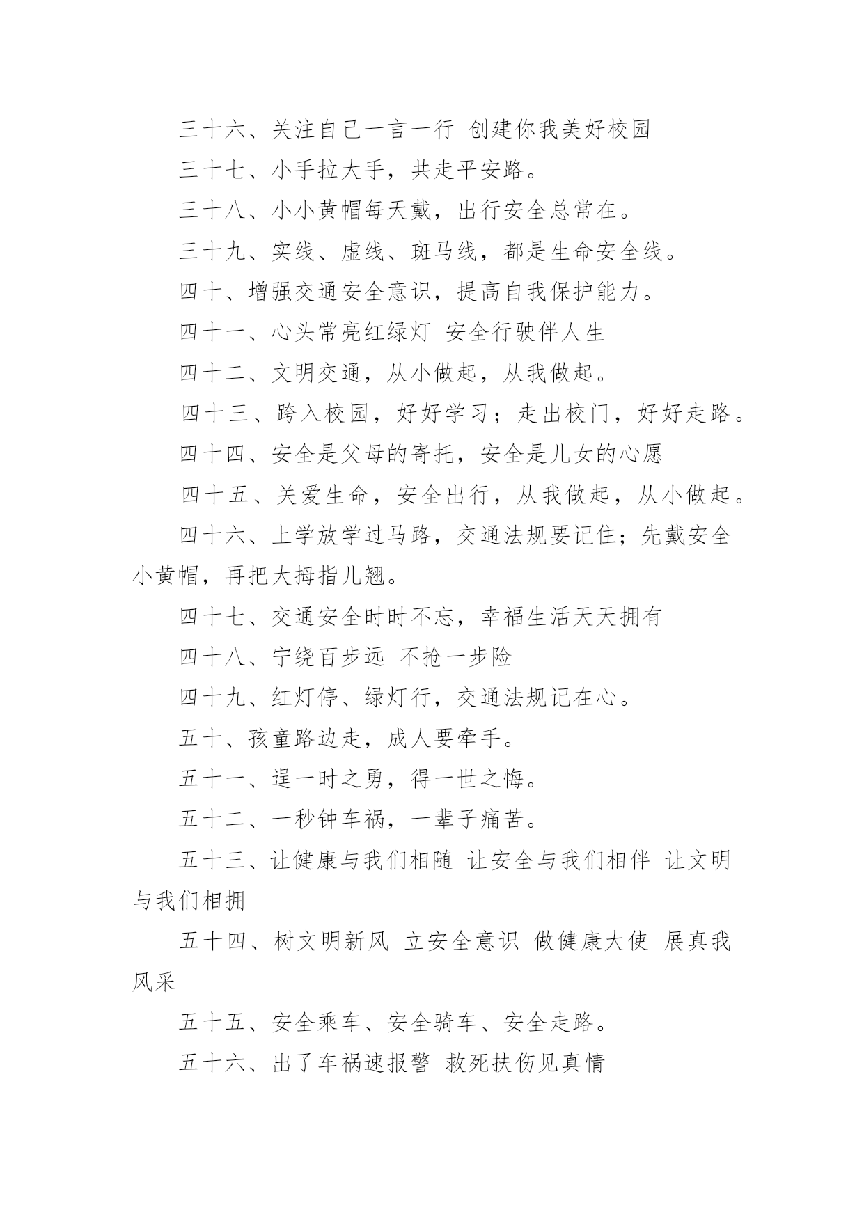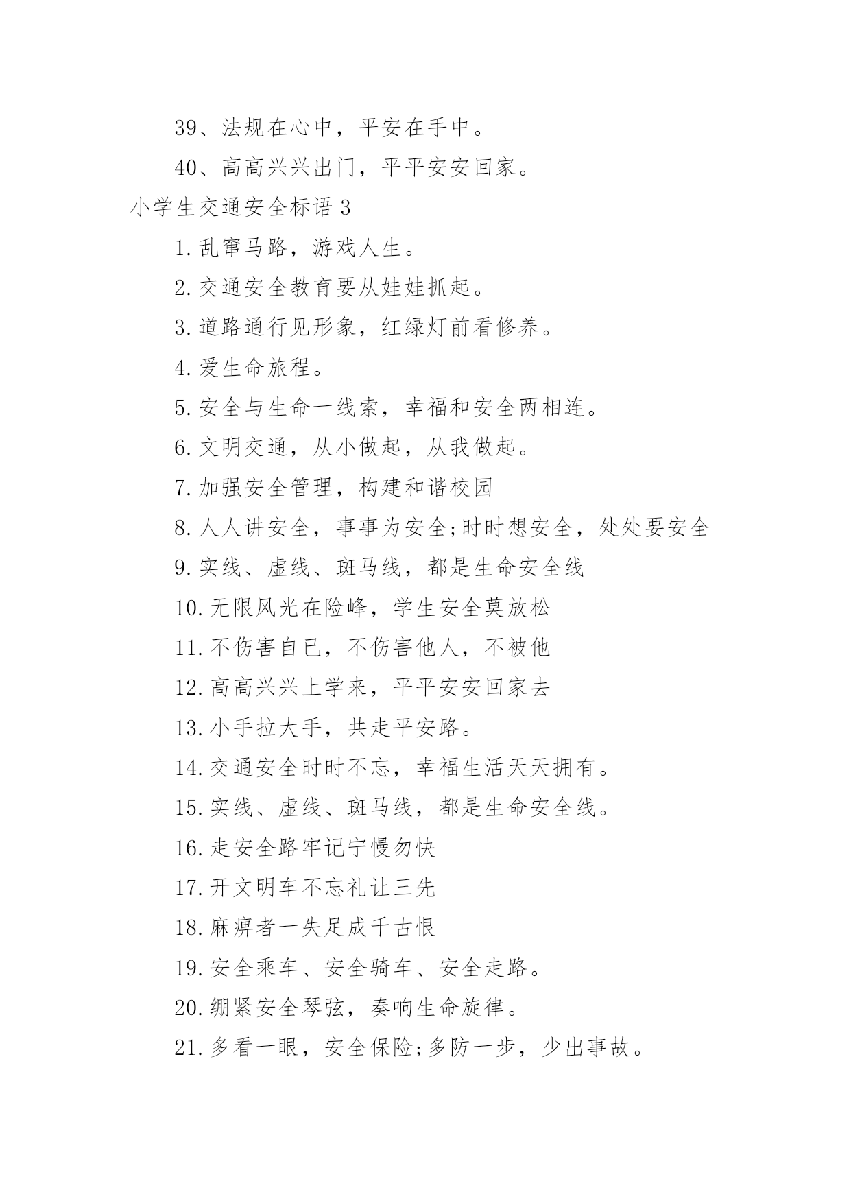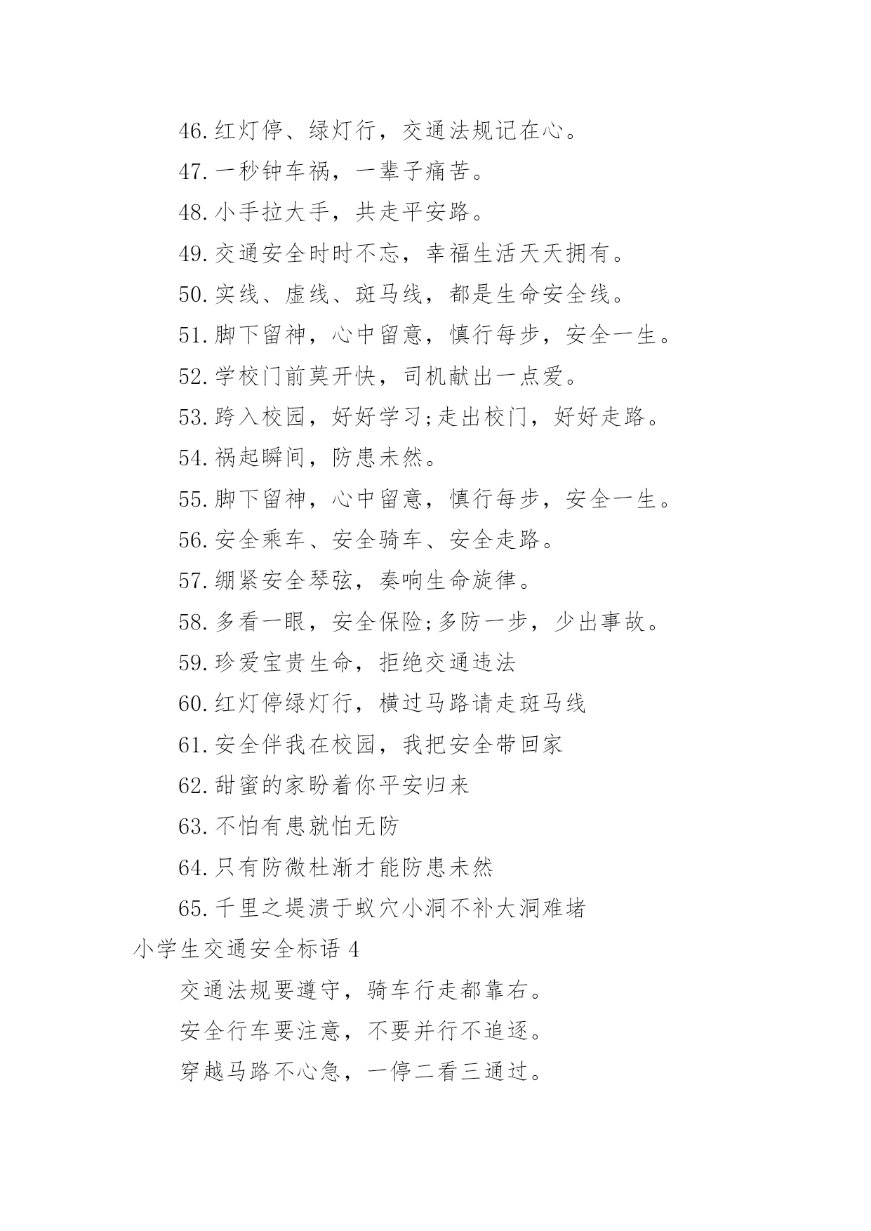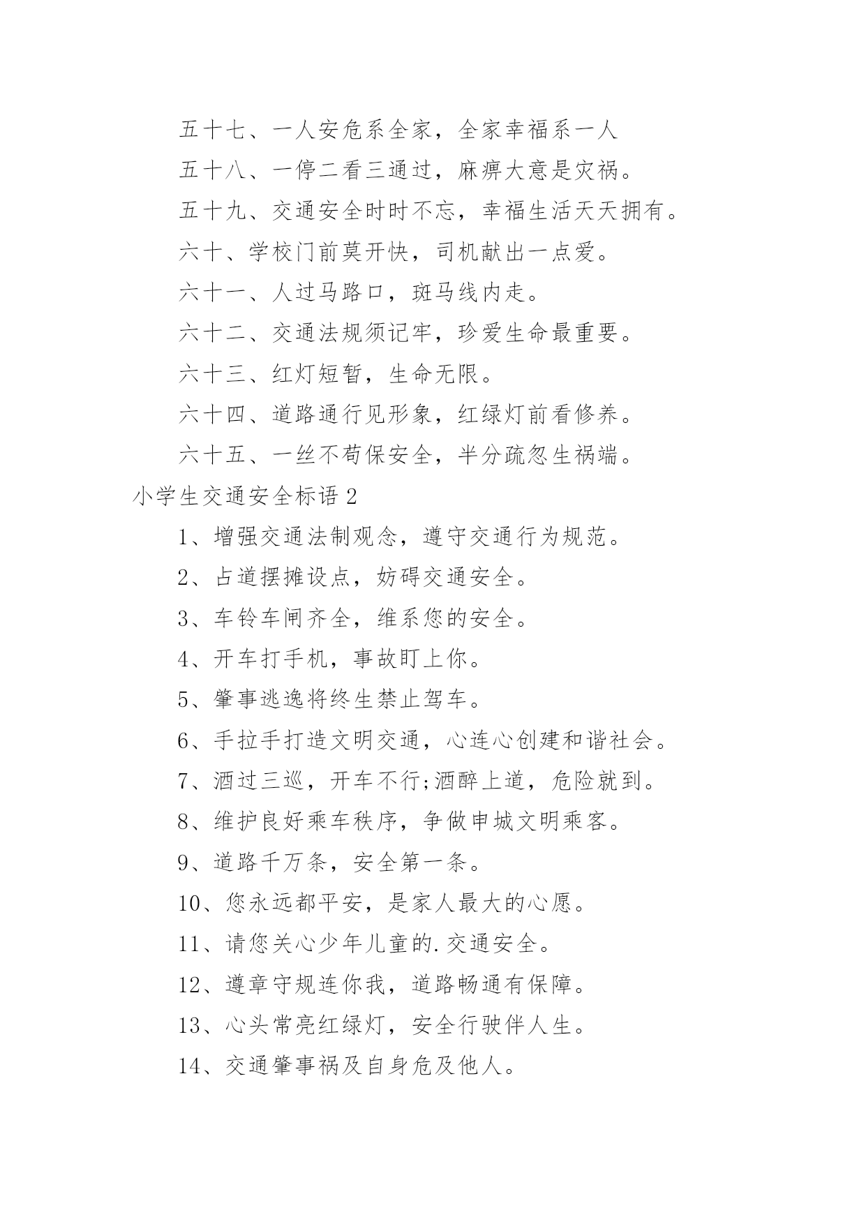 小学生交通安全标语小学生交通安全标语在平平淡淡的学习、工作、生活中,许多人都接触过一些比较经典的标语吧,标语不但折射着时代精神,也体现了执政的方向和智慧,其意义和作用是不容忽视的。那什么样的标语才是经典的呢?以下是小编精心整理的小学生交通安全标语,欢迎大家分享。小学生交通安全标语1一、走过春夏秋,冬安全永驻心中。二、守交通规则,树文明新风。三、安全与守法同在,事故与违法相随。四、生命只有一次,平安伴君一生。五、珍爱生命,安全出行六、生命只有一次,安全伴君一生。七、学校门前莫开快,司机献出一点爱八、千里之行慎于足下九、礼让是美德,安全是幸福。十、遵守交通法规,关爱生命旅程。十一、安全是人类共同的向往、安全是快乐生活的根本。十二、乱窜马路,游戏人生。十三、一秒钟车祸一辈子痛苦十四、遵守交规路路顺畅,文明出行天天平安。十五、交通安全教育要从娃娃抓起。十六、安全在你脚下,生命在你手中。十七、严是爱、松是害,出了事故坑后代。十八、横穿马路:一看、二等、三通过。十九、安全来自警惕,事故出于麻痹。二十、心无交规,路有坎坷。二十一、多看一眼,安全保险;多防一步,少出事故。二十二、安全来自长期警惕,事故源于瞬间麻痹。二十三、礼让三先路畅民安二十四、健康生活文明做人平安每天幸福一生二十五、文明在于细节处理安全在于未然防患二十六、安全与生命一线索,幸福和安全两相连。二十七、安全与幸福携手文明与美丽同行二十八、祸起瞬间,防患未然。二十九、安全意识时时具备不可忘文明之道刻刻铭记你我心三十、绷紧安全琴弦,奏响生命旋律。三十一、工作为了生活好,安全为了活到老。三十二、道路因文明行驶而通畅,生活因出入平安而幸福。三十三、遵守交通法规关爱生命旅程三十四、安全绷紧安全琴弦,奏响生命旋律。三十五、脚下留神,心中留意,慎行每步,安全一生。三十六、关注自己一言一行创建你我美好校园三十七、小手拉大手,共走平安路。三十八、小小黄帽每天戴,出行安全总常在。三十九、实线、虚线、斑马线,都是生命安全线。四十、增强交通安全意识,提高自我保护能力。四十一、心头常亮红绿灯安全行驶伴人生四十二、文明交通,从小做起,从我做起。四十三、跨入校园,好好学习;走出校门,好好走路。四十四、安全是父母的寄托,安全是儿女的心愿四十五、关爱生命,安全出行,从我做起,从小做起。四十六、上学放学过马路,交通法规要记住;先戴安全小黄帽,再把大拇指儿翘。四十七、交通安全时时不忘,幸福生活天天拥有四十八、宁绕百步远不抢一步险四十九、红灯停、绿灯行,交通法规记在心。五十、孩童路边走,成人要牵手。五十一、逞一时之勇,得一世之悔。五十二、一秒钟车祸,一辈子痛苦。五十三、让健康与我们相随让安全与我们相伴让文明与我们相拥五十四、树文明新风立安全意识做健康大使展真我风采五十五、安全乘车、安全骑车、安全走路。五十六、出了车祸速报警救死扶伤见真情五十七、一人安危系全家,全家幸福系一人五十八、一停二看三通过,麻痹大意是灾祸。五十九、交通安全时时不忘,幸福生活天天拥有。六十、学校门前莫开快,司机献出一点爱。六十一、人过马路口,斑马线内走。六十二、交通法规须记牢,珍爱生命最重要。六十三、红灯短暂,生命无限。六十四、道路通行见形象,红绿灯前看修养。六十五、一丝不苟保安全,半分疏忽生祸端。小学生交通安全标语21、增强交通法制观念,遵守交通行为规范。2、占道摆摊设点,妨碍交通安全。3、车铃车闸齐全,维系您的安全。4、开车打手机,事故盯上你。5、肇事逃逸将终生禁止驾车。6、手拉手打造文明交通,心连心创建和谐社会。7、酒过三巡,开车不行;酒醉上道,危险就到。8、维护良好乘车秩序,争做申城文明乘客。9、道路千万条,安全第一条。10、您永远都平安,是家人最大的心愿。11、请您关心少年儿童的.交通安全。12、遵章守规连你我,道路畅通有保障。13、心头常亮红绿灯,安全行驶伴人生。14、交通肇事祸及自身危及他人。15、进一步将受到谴责,退一步将得到尊重。16、酒后开车,先醉人后坠车。17、遵守交通信号,遵守交通标志,遵守交通标线。18、交通法规记心中,安全驾驶万事通。19、麻痹是事故的祸根!20、十次肇事九次快,摩托车族当自爱。21、迎世博,为河源争光。22、一次侥幸暗藏一次危险,一分自觉保证一份安全。23、快速诚可贵,生命价更高。24、交通规则若遵守,全国各地安心走。25、不开争气斗强车争做礼让文明人。26、珍惜生命,拒绝违章。27、开文明礼貌车,愿一生无事故。28、车可修复,人无来生。29、不开带病车上路。30、一身安危系全家,全家幸福系一人。31、马路就像老虎口,不留神就没活口。32、贪一时之快,危险跟着来。33、谨慎驾驶,保证安全。34、疲劳驾驶等于方向失灵。35、您出行的安全牵动着家人的心。36、骑车抢行一秒,危险增加十分。37、挣金山,