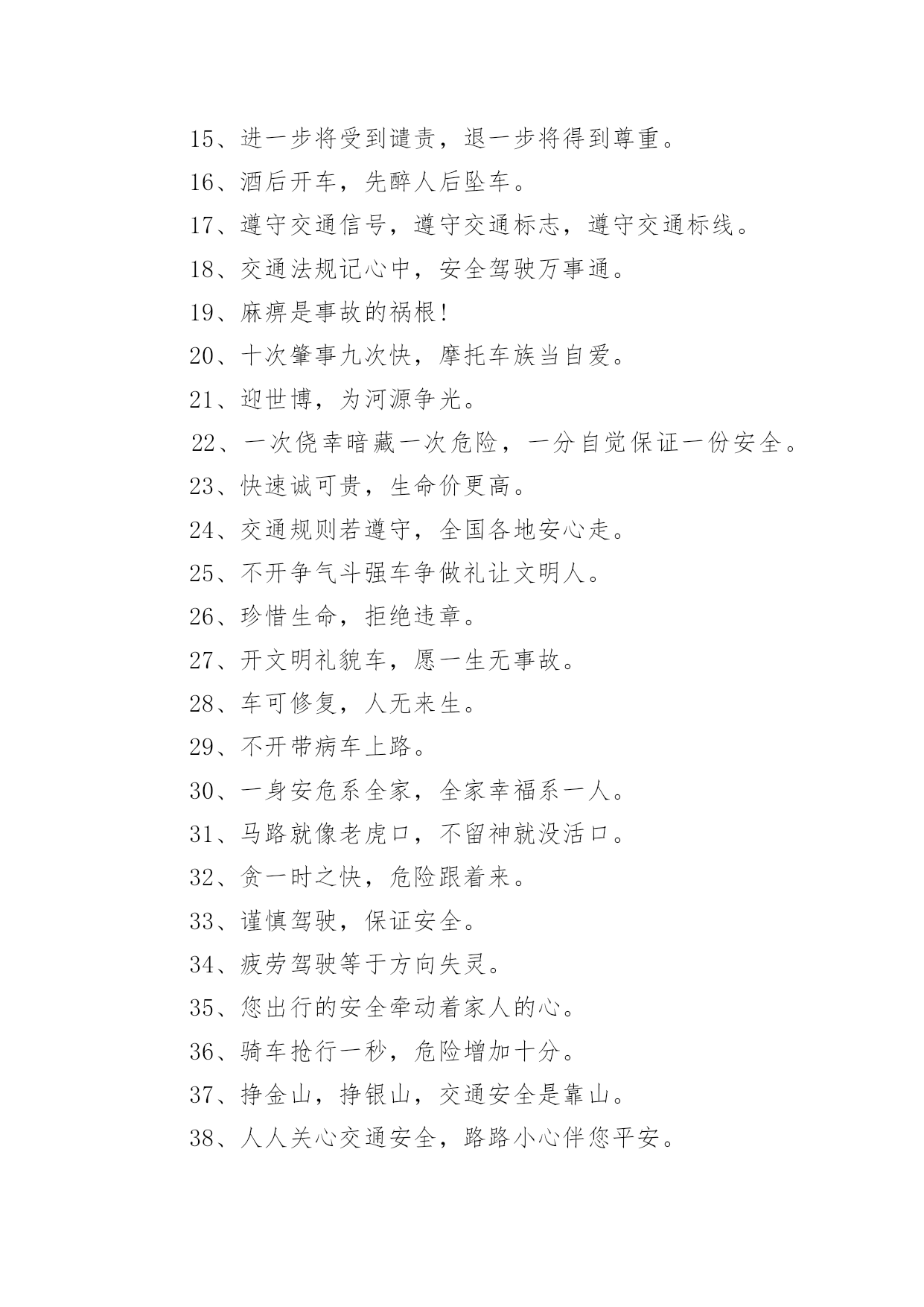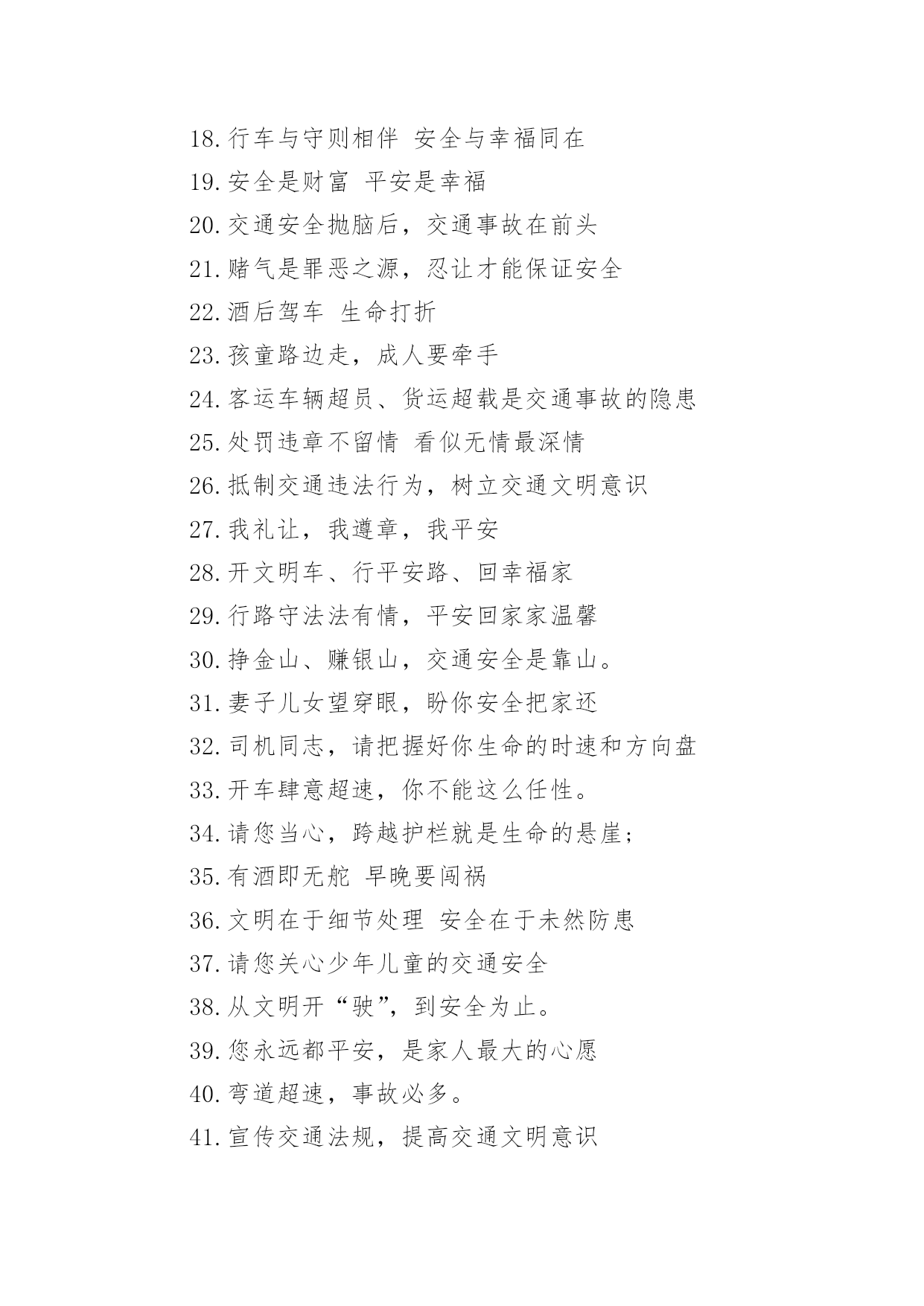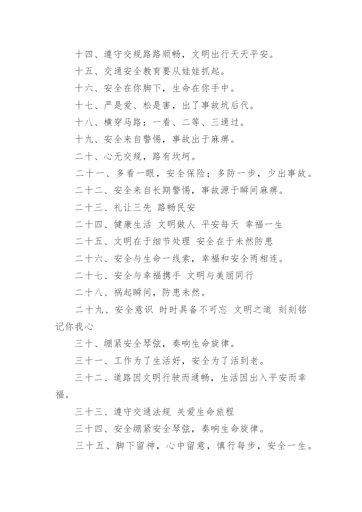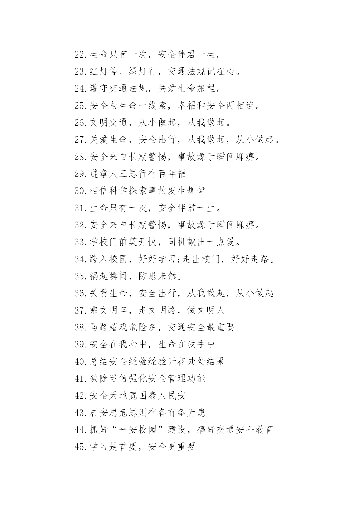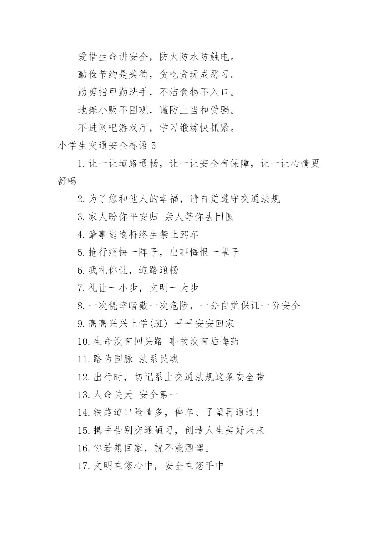 小学生交通安全标语小学生交通安全标语在平平淡淡的学习、工作、生活中,许多人都接触过一些比较经典的标语吧,标语不但折射着时代精神,也体现了执政的方向和智慧,其意义和作用是不容忽视的。那什么样的标语才是经典的呢?以下是小编精心整理的小学生交通安全标语,欢迎大家分享。小学生交通安全标语1一、走过春夏秋,冬安全永驻心中。二、守交通规则,树文明新风。三、安全与守法同在,事故与违法相随。四、生命只有一次,平安伴君一生。五、珍爱生命,安全出行六、生命只有一次,安全伴君一生。七、学校门前莫开快,司机献出一点爱八、千里之行慎于足下九、礼让是美德,安全是幸福。十、遵守交通法规,关爱生命旅程。十一、安全是人类共同的向往、安全是快乐生活的根本。十二、乱窜马路,游戏人生。十三、一秒钟车祸一辈子痛苦十四、遵守交规路路顺畅,文明出行天天平安。十五、交通安全教育要从娃娃抓起。十六、安全在你脚下,生命在你手中。十七、严是爱、松是害,出了事故坑后代。十八、横穿马路:一看、二等、三通过。十九、安全来自警惕,事故出于麻痹。二十、心无交规,路有坎坷。二十一、多看一眼,安全保险;多防一步,少出事故。二十二、安全来自长期警惕,事故源于瞬间麻痹。二十三、礼让三先路畅民安二十四、健康生活文明做人平安每天幸福一生二十五、文明在于细节处理安全在于未然防患二十六、安全与生命一线索,幸福和安全两相连。二十七、安全与幸福携手文明与美丽同行二十八、祸起瞬间,防患未然。二十九、安全意识时时具备不可忘文明之道刻刻铭记你我心三十、绷紧安全琴弦,奏响生命旋律。三十一、工作为了生活好,安全为了活到老。三十二、道路因文明行驶而通畅,生活因出入平安而幸福。三十三、遵守交通法规关爱生命旅程三十四、安全绷紧安全琴弦,奏响生命旋律。三十五、脚下留神,心中留意,慎行每步,安全一生。三十六、关注自己一言一行创建你我美好校园三十七、小手拉大手,共走平安路。三十八、小小黄帽每天戴,出行安全总常在。三十九、实线、虚线、斑马线,都是生命安全线。四十、增强交通安全意识,提高自我保护能力。四十一、心头常亮红绿灯安全行驶伴人生四十二、文明交通,从小做起,从我做起。四十三、跨入校园,好好学习;走出校门,好好走路。四十四、安全是父母的寄托,安全是儿女的心愿四十五、关爱生命,安全出行,从我做起,从小做起。四十六、上学放学过马路,交通法规要记住;先戴安全小黄帽,再把大拇指儿翘。四十七、交通安全时时不忘,幸福生活天天拥有四十八、宁绕百步远不抢一步险四十九、红灯停、绿灯行,交通法规记在心。五十、孩童路边走,成人要牵手。五十一、逞一时之勇,得一世之悔。五十二、一秒钟车祸,一辈子痛苦。五十三、让健康与我们相随让安全与我们相伴让文明与我们相拥五十四、树文明新风立安全意识做健康大使展真我风采五十五、安全乘车、安全骑车、安全走路。五十六、出了车祸速报警救死扶伤见真情五十七、一人安危系全家,全家幸福系一人五十八、一停二看三通过,麻痹大意是灾祸。五十九、交通安全时时不忘,幸福生活天天拥有。六十、学校门前莫开快,司机献出一点爱。六十一、人过马路口,斑马线内走。六十二、交通法规须记牢,珍爱生命最重要。六十三、红灯短暂,生命无限。六十四、道路通行见形象,红绿灯前看修养。六十五、一丝不苟保安全,半分疏忽生祸端。小学生交通安全标语21、增强交通法制观念,遵守交通行为规范。2、占道摆摊设点,妨碍交通安全。3、车铃车闸齐全,维系您的安全。4、开车打手机,事故盯上你。5、肇事逃逸将终生禁止驾车。6、手拉手打造文明交通,心连心创建和谐社会。7、酒过三巡,开车不行;酒醉上道,危险就到。8、维护良好乘车秩序,争做申城文明乘客。9、道路千万条,安全第一条。10、您永远都平安,是家人最大的心愿。11、请您关心少年儿童的.交通安全。12、遵章守规连你我,道路畅通有保障。13、心头常亮红绿灯,安全行驶伴人生。14、交通肇事祸及自身危及他人。15、进一步将受到谴责,退一步将得到尊重。16、酒后开车,先醉人后坠车。17、遵守交通信号,遵守交通标志,遵守交通标线。18、交通法规记心中,安全驾驶万事通。19、麻痹是事故的祸根!20、十次肇事九次快,摩托车族当自爱。21、迎世博,为河源争光。22、一次侥幸暗藏一次危险,一分自觉保证一份安全。23、快速诚可贵,生命价更高。24、交通规则若遵守,全国各地安心走。25、不开争气斗强车争做礼让文明人。26、珍惜生命,拒绝违章。27、开文明礼貌车,愿一生无事故。28、车可修复,人无来生。29、不开带病车上路。30、一身安危系全家,全家幸福系一人。31、马路就像老虎口,不留神就没活口。32、贪一时之快,危险跟着来。33、谨慎驾驶,保证安全。34、疲劳驾驶等于方向失灵。35、您出行的安全牵动着家人的心。36、骑车抢行一秒,危险增加十分。37、挣金山,