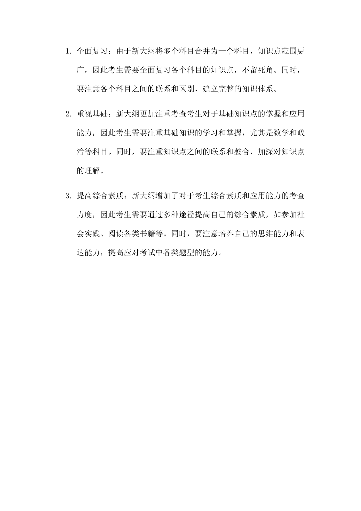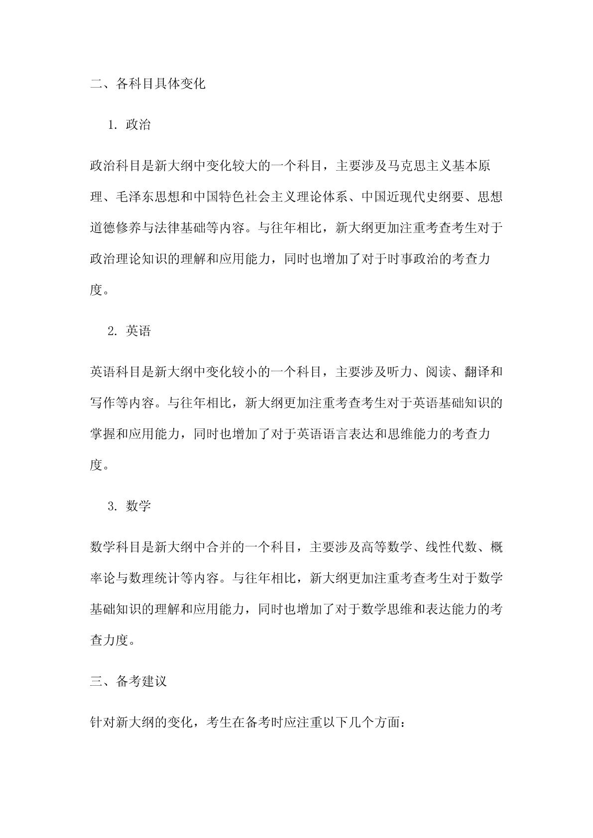 2024考研公共课新大纲2024年考研公共课大纲已经发布,与往年相比,今年的大纲在内容和形式上都有所调整。本文将从多个方面对2024年考研公共课新大纲进行详细解读,帮助考生更好地备考。一、总体变化与往年相比,2024年考研公共课大纲在结构、内容和题型上都有一定调整。总体来说,更加注重考查考生的综合素质和应用能力,同时增加了对于基础知识点的考查力度。具体来说,主要有以下几个方面:1.结构调整:新大纲对考试科目的结构进行了调整,将原来的政治、英语、数学三个科目合并为公共课一科,并将历史、地理、法律等多个科目纳入其中。同时,对于各个科目的分值也进行了相应的调整。2.内容更新:新大纲对于各个科目的知识点进行了更新和优化,删除了部分过时和重复的内容,增加了新的知识点和考点。同时,对于知识点的考查要求也进行了调整,更加注重考查考生对于知识点的理解和应用能力。3.题型变化:新大纲对于各个题型也进行了调整和优化,增加了对于基础知识点的考查力度,同时也增加了对于考生综合素质和应用能力的考查。具体来说,主要有选择题、填空题、简答题、论述题等多种题型,更加注重考查考生的思维能力和表达能力。二、各科目具体变化1.政治政治科目是新大纲中变化较大的一个科目,主要涉及马克思主义基本原理、毛泽东思想和中国特色社会主义理论体系、中国近现代史纲要、思想道德修养与法律基础等内容。与往年相比,新大纲更加注重考查考生对于政治理论知识的理解和应用能力,同时也增加了对于时事政治的考查力度。2.英语英语科目是新大纲中变化较小的一个科目,主要涉及听力、阅读、翻译和写作等内容。与往年相比,新大纲更加注重考查考生对于英语基础知识的掌握和应用能力,同时也增加了对于英语语言表达和思维能力的考查力度。3.数学数学科目是新大纲中合并的一个科目,主要涉及高等数学、线性代数、概率论与数理统计等内容。与往年相比,新大纲更加注重考查考生对于数学基础知识的理解和应用能力,同时也增加了对于数学思维和表达能力的考查力度。三、备考建议针对新大纲的变化,考生在备考时应注重以下几个方面:1.全面复习:由于新大纲将多个科目合并为一个科目,知识点范围更广,因此考生需要全面复习各个科目的知识点,不留死角。同时,要注意各个科目之间的联系和区别,建立完整的知识体系。2.重视基础:新大纲更加注重考查考生对于基础知识点的掌握和应用能力,因此考生需要注重基础知识的学习和掌握,尤其是数学和政治等科目。同时,要注重知识点之间的联系和整合,加深对知识点的理解。3.提高综合素质:新大纲增加了对于考生综合素质和应用能力的考查力度,因此考生需要通过多种途径提高自己的综合素质,如参加社会实践、阅读各类书籍等。同时,要注意培养自己的思维能力和表达能力,提高应对考试中各类题型的能力。