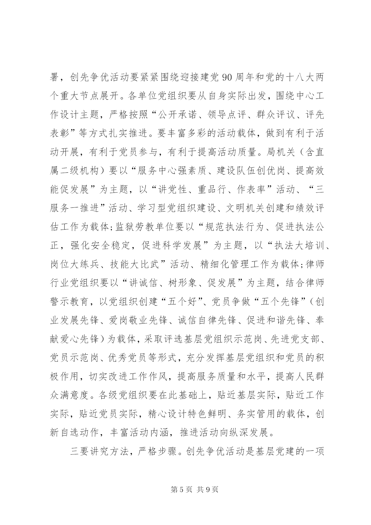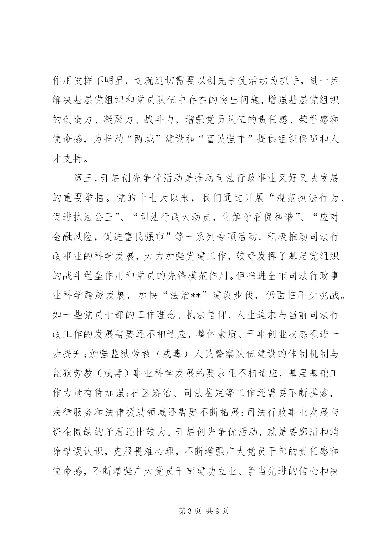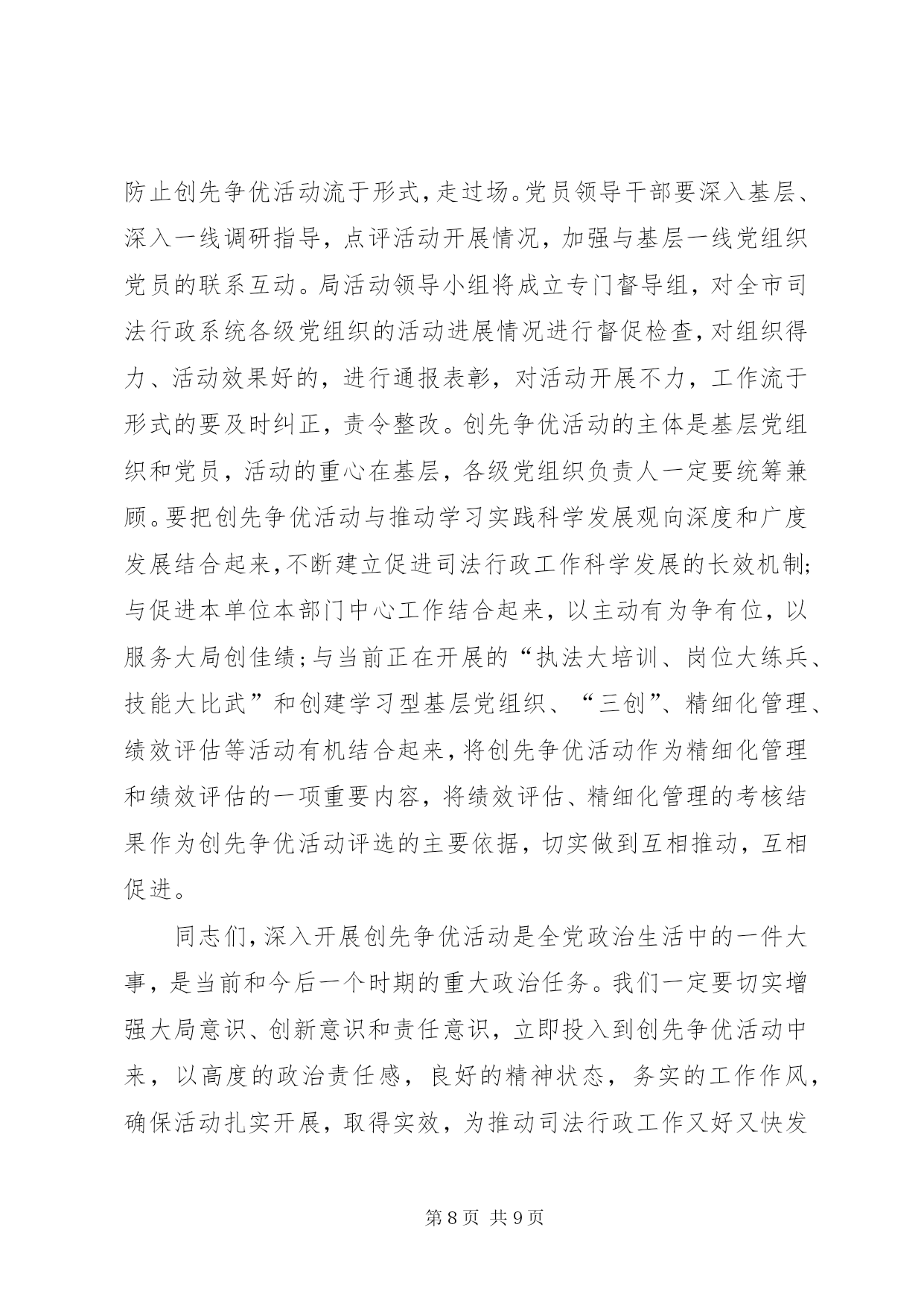 第PAGE\*Arabic\*MERGEFORMAT9页共NUMPAGES\*MERGEFORMAT9页司法系统创先争优工作总结同志们:在党的基层组织和党员中深入开展以“创建先进基层党组织、争当优秀共产党员”为主要内容的创先争优活动,是党中央作出的重要部署。市委对此高度重视,5月14日,全市召开了深入开展创先争优活动动员视频会议,谭平副书记作了重要讲话。为认真贯彻中央、省委和市委的决策部署,局党组进行了专题研究,制定了创先争优活动的实施方案,希望各单位各部门认真学习领会,抓好落实,务求实效。下面,我就开展好这项活动,讲三点意见。一、统一思想,深化认识,切实增强开展创先争优活动的责任感和使命感在党的基层组织和党员中深入开展创先争优活动,是深入贯彻落实党的十七大和十七届三中、四中全会精神,巩固和拓展深入学习实践科学发展观活动成果的重要举措,是统筹推进党的建设的一项重要经常性工作。全市司法行政系统各级党组织和广大党员一定要充分认识开展创先争优活动的重要意义,统一思想,提高认识,增强责任感。第一,开展创先争优活动是巩固扩大学习实践活动成果的重要工程。学习实践活动是集中性主题教育活动,创先争优活动是对学习实践活动的延展和深入。在学习实践活动中,全系统各级领导班子和广大党员干部,立足本职、开拓创新、攻坚克难,在解决影响制约司法行政事业科学发展的突出问题上,在解决群众反映强烈的突出问题上,在解决一些党员干部党性党风党纪方面存在的突出问题上,取得了明显成效,得到了市委的充分肯定,赢得了广大群众的普遍赞誉。但同时要清醒地认识到,成果来之不易,巩固和扩大成果则更需付出长期艰苦努力。开展创先争优活动,有利于进一步把学习实践活动的成果运用到基层;有利于进一步抓好整改落实后续工作;有利于进一步完善促进科学发展的长效机制,推动学习实践科学发展观向深度和广度发展。第二,开展创先争优活动是加强司法行政基层党组织建设的迫切需要。基层党组织是党的全部工作和战斗力的基础,承担着把科学发展观贯彻落实到基层的重要责任。这些年来,我们紧紧落实市委精神,高度重视基层,切实加强基层,努力服务基层,始终把抓基层打基础摆在突出位置。特别是学习实践活动以来,党的基层组织进一步建立健全,基层领导班子和干部队伍的活力进一步加强,党组织和党员发挥作用的途径进一步拓展,在“三调”联动化解矛盾,确保监管场所持续安全稳定、提供优质高效法律服务、推动依法治市促和谐等方面取得了可喜成绩,一大批先进集体和优秀个人受到上级部门表彰。但也要看到,少数基层党组织活力不够,凝聚力不强;党员队伍中仍存在与改革发展不相符的现象;个别党员学先进、赶先进、争当先进的动力不足,作用发挥不明显。这就迫切需要以创先争优活动为抓手,进一步解决基层党组织和党员队伍中存在的突出问题,增强基层党组织的创造力、凝聚力、战斗力,增强党员队伍的责任感、荣誉感和使命感,为推动“两城”建设和“富民强市”提供组织保障和人才支持。第三,开展创先争优活动是推动司法行政事业又好又快发展的重要举措。党的十七大以来,我们通过开展“规范执法行为、促进执法公正”、“司法行政大动员,化解矛盾促和谐”、“应对金融风险,促进富民强市”等一系列专项活动,积极推动司法行政事业的科学发展,大力加强党建工作,较好发挥了基层党组织的战斗堡垒作用和党员的先锋模范作用。但推进全市司法行政事业科学跨越发展,加快“法治**”建设步伐,仍面临不少挑战。如一些党员干部的工作理念、执法信仰、人生追求与当前司法行政工作的发展需要还不相适应,整体素质、干事创业状态须进一步提升;加强监狱劳教(戒毒)人民警察队伍建设的体制机制与监狱劳教(戒毒)事业科学发展的要求还不相适应,基层基础工作力量有待加强;社区矫治、司法鉴定等工作还需要不断摸索,法律服务和法律援助领域还需要不断拓展;司法行政事业发展与资金匮缺的矛盾还比较大。开展创先争优活动,就是要廓清和消除错误认识,克服畏难心理,不断增强广大党员干部的责任感和使命感,不断增强广大党员干部建功立业、争当先进的信心和决心,从而极大地促进司法行政事业科学发展。二、把握重点,精心组织,扎实推动创先争优活动深入开展各级党组织要严格按照市委和市局的统一部署,深刻领会活动总体要求,准确把握活动内容,创新活动载体,精心组织,周密部署,推动创先争优活动扎实有序开展。一要明确目标,细化要求。深入开展创先争优活动,关键要把握好“推动科学发展、促进社会和谐、服务人民群众、加强基层组织建设”四句话的目标任务,深刻领会“创建先进党组织,争当优秀共产党员”的主要内容。先进基层党组织的基本要求是:学习型党组织建设成效明显,出色完成党章规定的基本任务,努力做到“五个好”,即领导班子好、党员队伍好、工作机制好、工作业绩好、群众反映好。优秀共产党员的基本要求