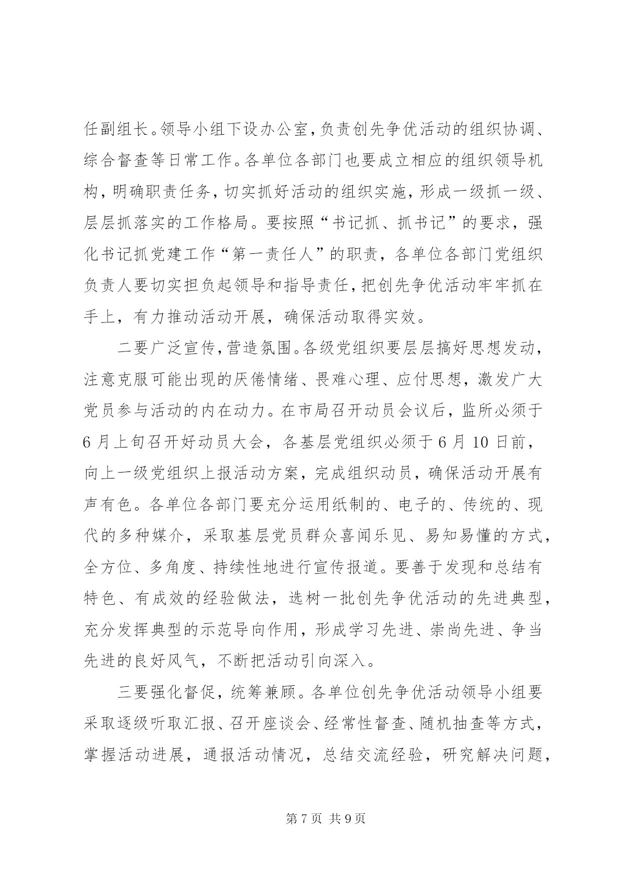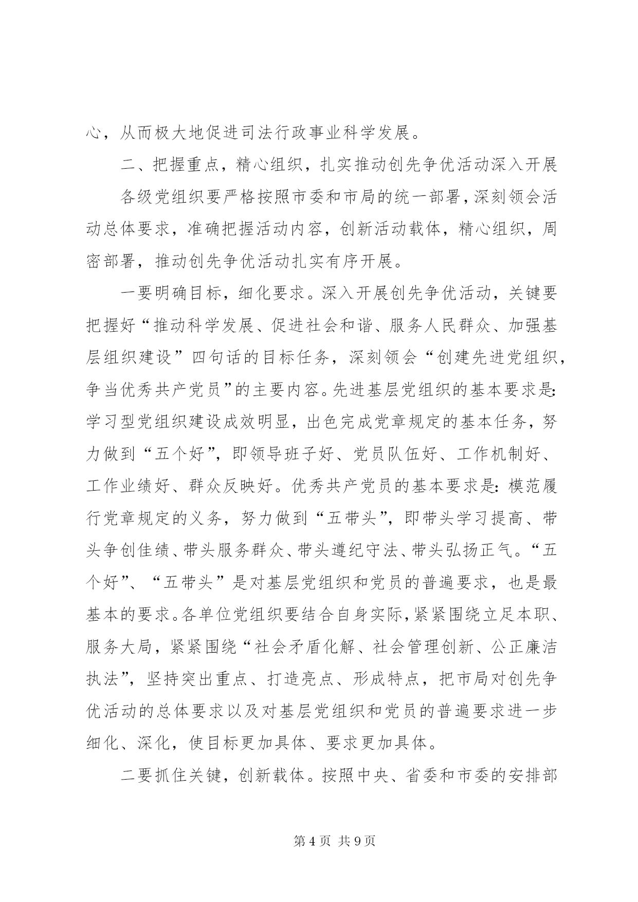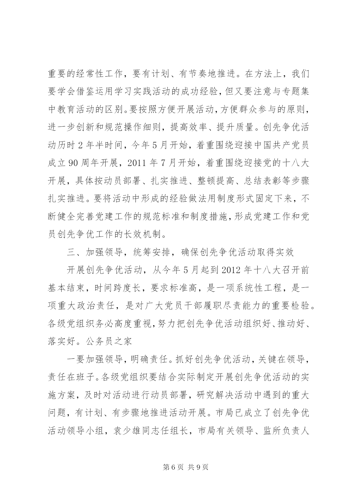 第PAGE\*Arabic\*MERGEFORMAT9页共NUMPAGES\*MERGEFORMAT9页司法系统创先争优工作总结同志们:在党的基层组织和党员中深入开展以“创建先进基层党组织、争当优秀共产党员”为主要内容的创先争优活动,是党中央作出的重要部署。市委对此高度重视,5月14日,全市召开了深入开展创先争优活动动员视频会议,谭平副书记作了重要讲话。为认真贯彻中央、省委和市委的决策部署,局党组进行了专题研究,制定了创先争优活动的实施方案,希望各单位各部门认真学习领会,抓好落实,务求实效。下面,我就开展好这项活动,讲三点意见。一、统一思想,深化认识,切实增强开展创先争优活动的责任感和使命感在党的基层组织和党员中深入开展创先争优活动,是深入贯彻落实党的十七大和十七届三中、四中全会精神,巩固和拓展深入学习实践科学发展观活动成果的重要举措,是统筹推进党的建设的一项重要经常性工作。全市司法行政系统各级党组织和广大党员一定要充分认识开展创先争优活动的重要意义,统一思想,提高认识,增强责任感。第一,开展创先争优活动是巩固扩大学习实践活动成果的重要工程。学习实践活动是集中性主题教育活动,创先争优活动是对学习实践活动的延展和深入。在学习实践活动中,全系统各级领导班子和广大党员干部,立足本职、开拓创新、攻坚克难,在解决影响制约司法行政事业科学发展的突出问题上,在解决群众反映强烈的突出问题上,在解决一些党员干部党性党风党纪方面存在的突出问题上,取得了明显成效,得到了市委的充分肯定,赢得了广大群众的普遍赞誉。但同时要清醒地认识到,成果来之不易,巩固和扩大成果则更需付出长期艰苦努力。开展创先争优活动,有利于进一步把学习实践活动的成果运用到基层;有利于进一步抓好整改落实后续工作;有利于进一步完善促进科学发展的长效机制,推动学习实践科学发展观向深度和广度发展。第二,开展创先争优活动是加强司法行政基层党组织建设的迫切需要。基层党组织是党的全部工作和战斗力的基础,承担着把科学发展观贯彻落实到基层的重要责任。这些年来,我们紧紧落实市委精神,高度重视基层,切实加强基层,努力服务基层,始终把抓基层打基础摆在突出位置。特别是学习实践活动以来,党的基层组织进一步建立健全,基层领导班子和干部队伍的活力进一步加强,党组织和党员发挥作用的途径进一步拓展,在“三调”联动化解矛盾,确保监管场所持续安全稳定、提供优质高效法律服务、推动依法治市促和谐等方面取得了可喜成绩,一大批先进集体和优秀个人受到上级部门表彰。但也要看到,少数基层党组织活力不够,凝聚力不强;党员队伍中仍存在与改革发展不相符的现象;个别党员学先进、赶先进、争当先进的动力不足,作用发挥不明显。这就迫切需要以创先争优活动为抓手,进一步解决基层党组织和党员队伍中存在的突出问题,增强基层党组织的创造力、凝聚力、战斗力,增强党员队伍的责任感、荣誉感和使命感,为推动“两城”建设和“富民强市”提供组织保障和人才支持。第三,开展创先争优活动是推动司法行政事业又好又快发展的重要举措。党的十七大以来,我们通过开展“规范执法行为、促进执法公正”、“司法行政大动员,化解矛盾促和谐”、“应对金融风险,促进富民强市”等一系列专项活动,积极推动司法行政事业的科学发展,大力加强党建工作,较好发挥了基层党组织的战斗堡垒作用和党员的先锋模范作用。但推进全市司法行政事业科学跨越发展,加快“法治**”建设步伐,仍面临不少挑战。如一些党员干部的工作理念、执法信仰、人生追求与当前司法行政工作的发展需要还不相适应,整体素质、干事创业状态须进一步提升;加强监狱劳教(戒毒)人民警察队伍建设的体制机制与监狱劳教(戒毒)事业科学发展的要求还不相适应,基层基础工作力量有待加强;社区矫治、司法鉴定等工作还需要不断摸索,法律服务和法律援助领域还需要不断拓展;司法行政事业发展与资金匮缺的矛盾还比较大。开展创先争优活动,就是要廓清和消除错误认识,克服畏难心理,不断增强广大党员干部的责任感和使命感,不断增强广大党员干部建功立业、争当先进的信心和决心,从而极大地促进司法行政事业科学发展。二、把握重点,精心组织,扎实推动创先争优活动深入开展各级党组织要严格按照市委和市局的统一部署,深刻领会活动总体要求,准确把握活动内容,创新活动载体,精心组织,周密部署,推动创先争优活动扎实有序开展。一要明确目标,细化要求。深入开展创先争优活动,关键要把握好“推动科学发展、促进社会和谐、服务人民群众、加强基层组织建设”四句话的目标任务,深刻领会“创建先进党组织,争当优秀共产党员”的主要内容。先进基层党组织的基本要求是:学习型党组织建设成效明显,出色完成党章规定的基本任务,努力做到“五个好”,即领导班子好、党员队伍好、工作机制好、工作业绩好、群众反映好。优秀共产党员的基本要求