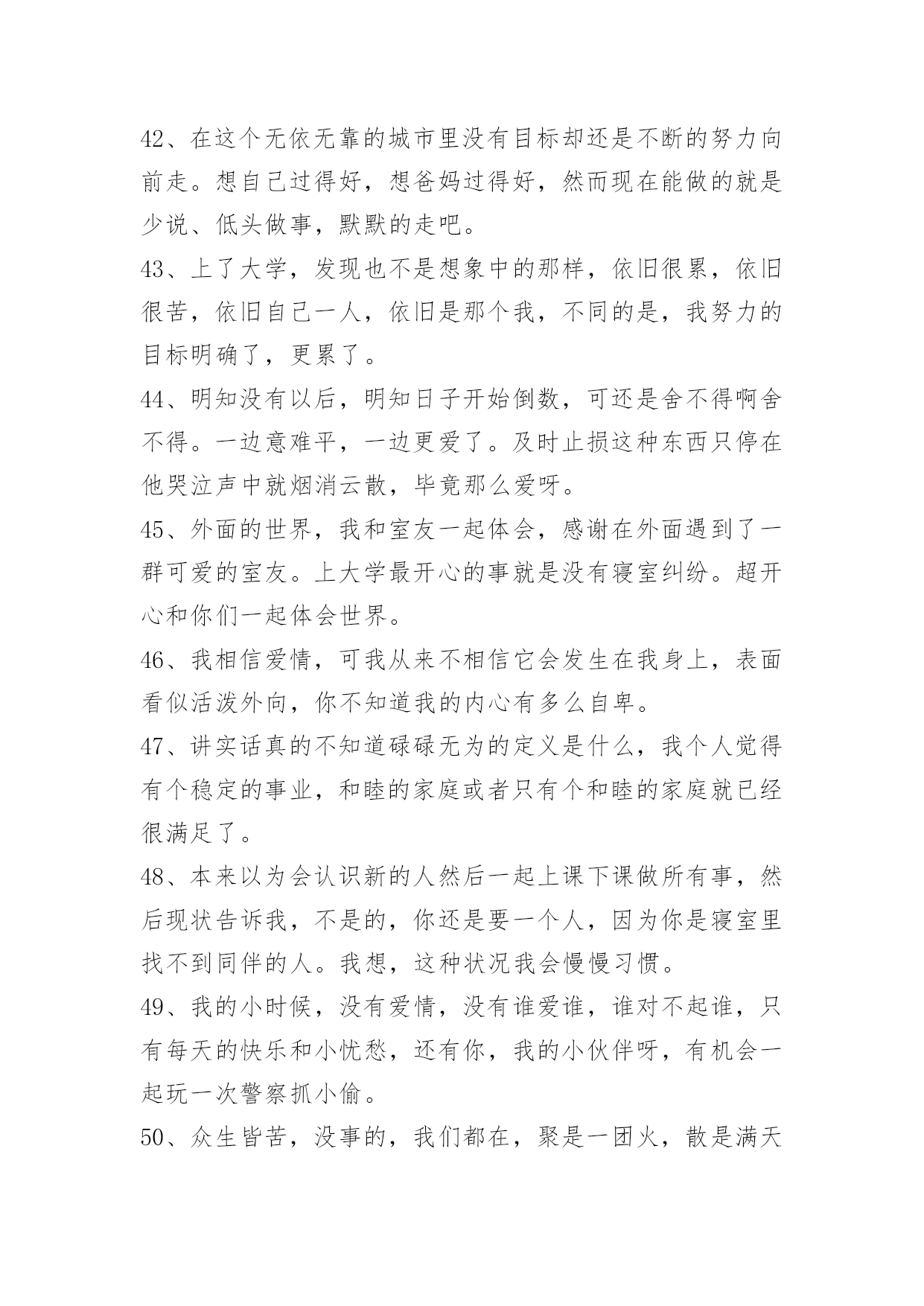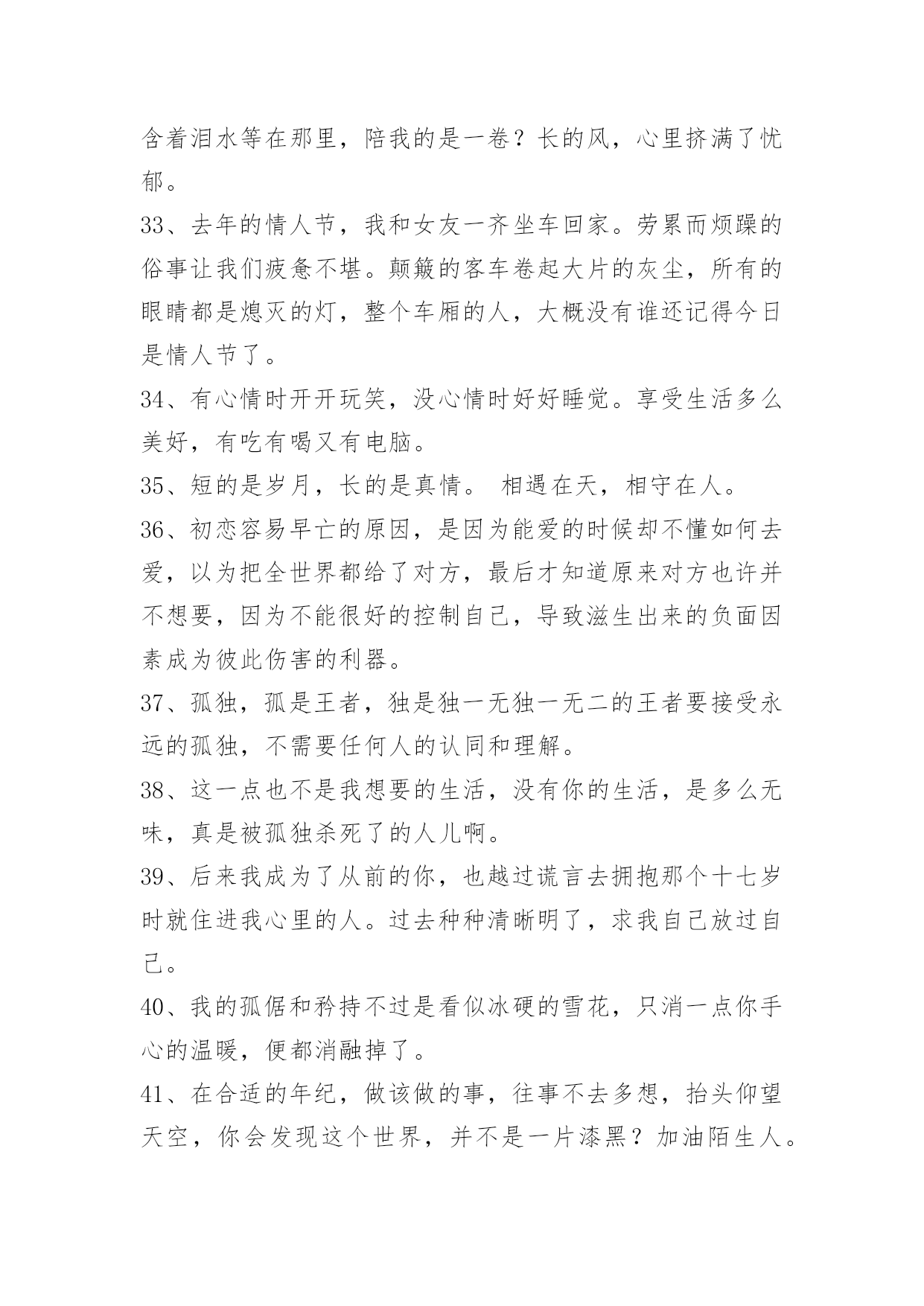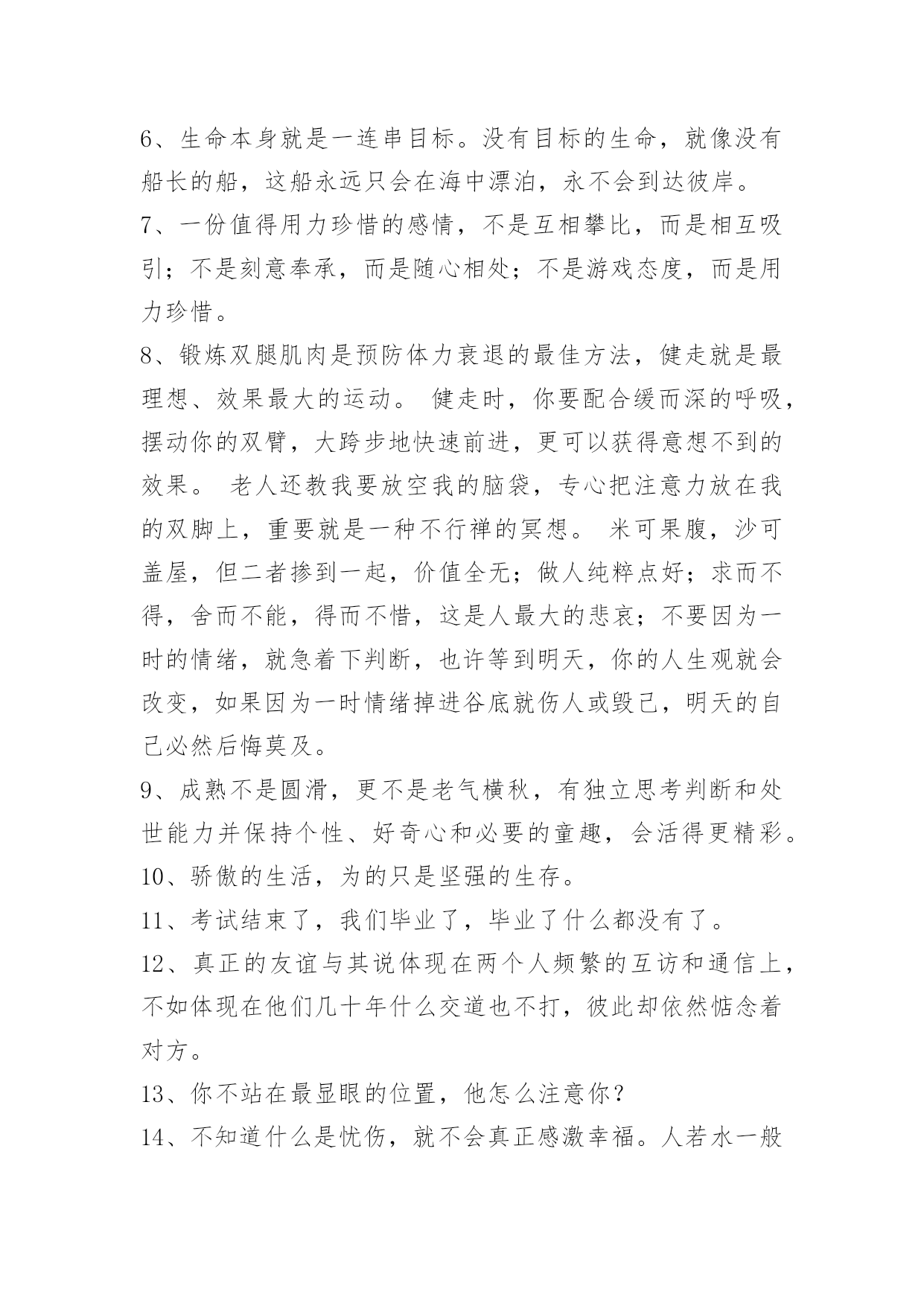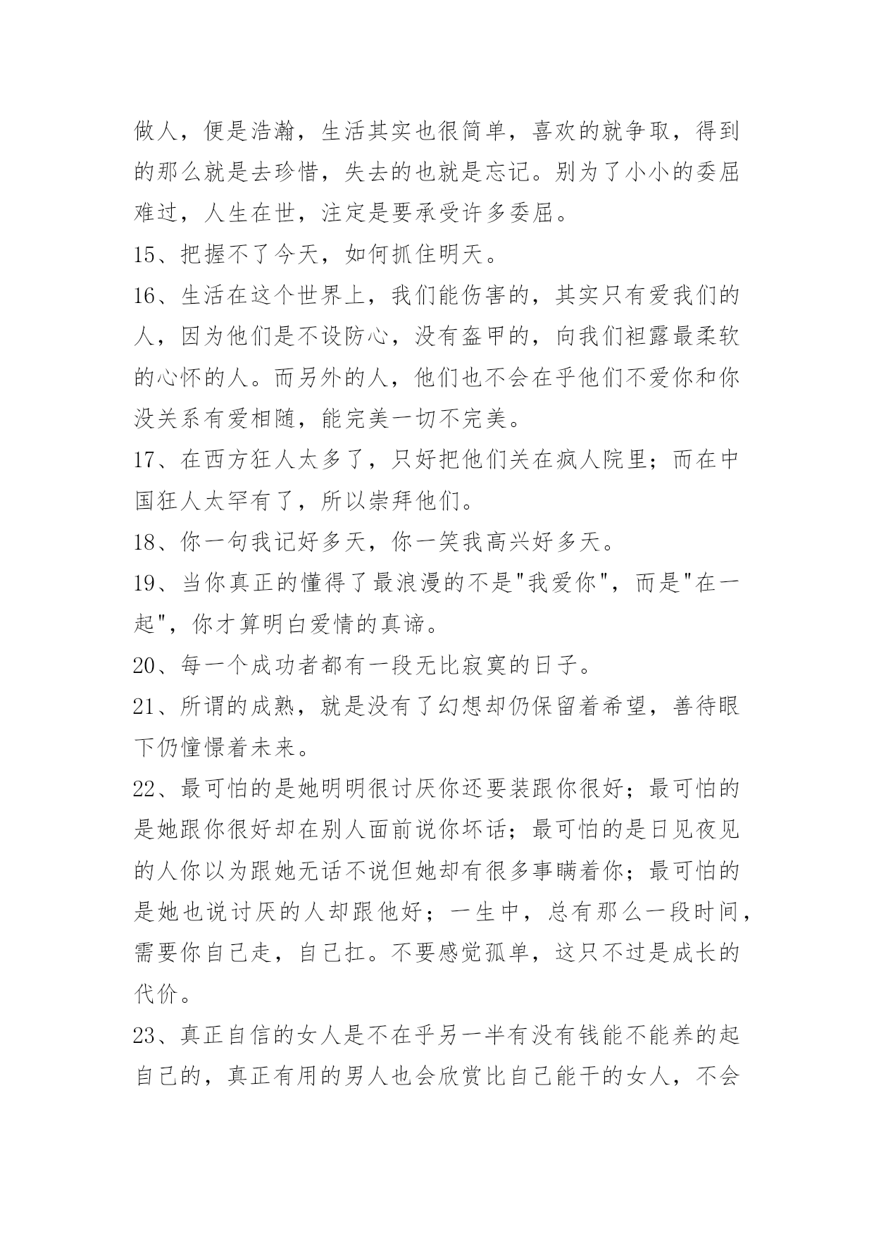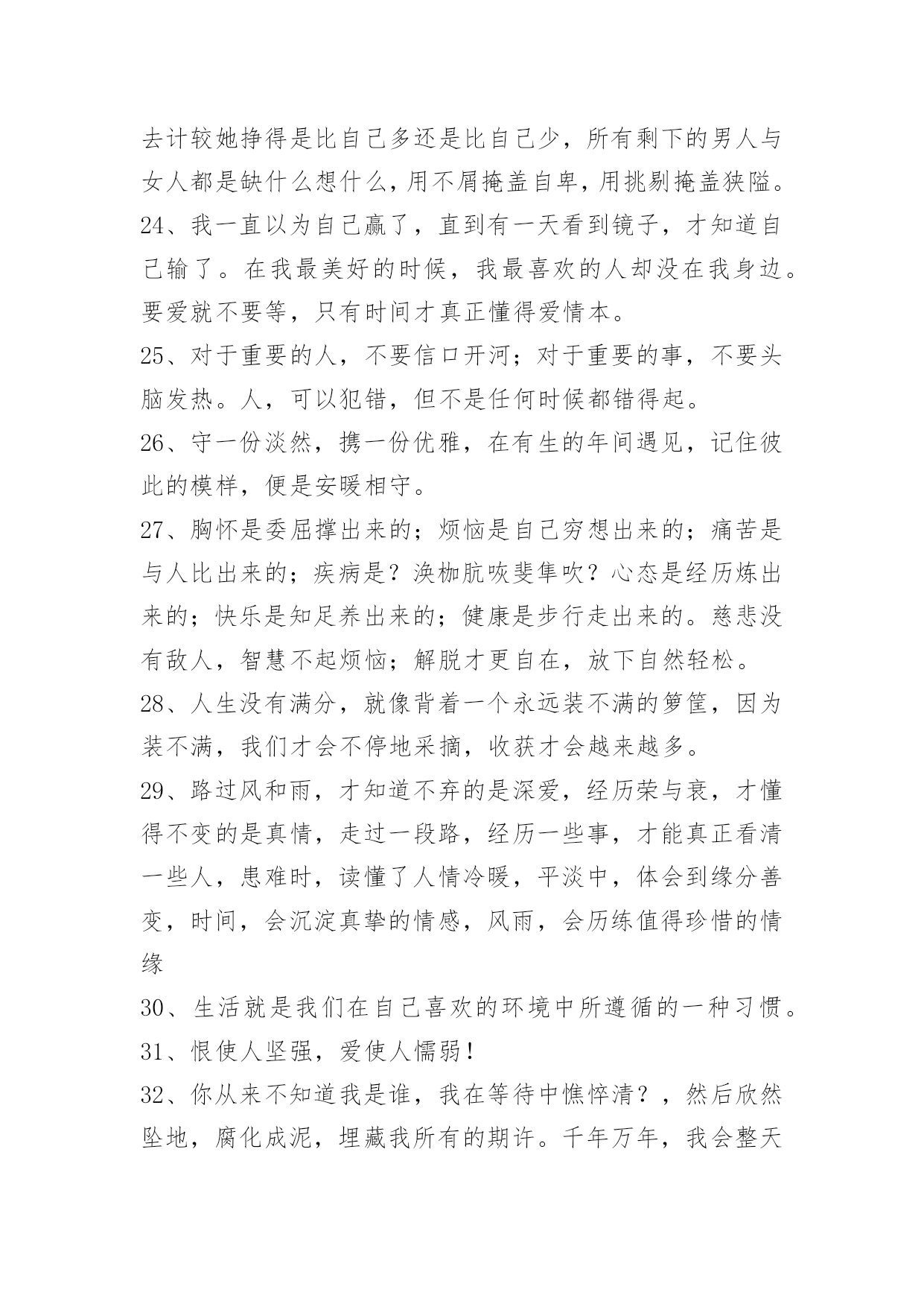 生活唯美签名生活唯美签名汇总(精选50句)陌生的城市和环境,拥挤的人群,你拉起我的手,去争取前进的空间。之后你对我的关心和保护还很多,但是这依然是我们之间让我最深刻的一个场景。可能那时候的我,真的很孤独。这篇文章是小编帮大家整理的生活唯美签名,欢迎阅读。1、我们可以去爱。或被爱。但相爱会使我们很无奈。2、等待,是最长久的无奈,是最深刻的难以释怀……3、这一年的急涨急跌,和经济是没有必然的联系,管理不完善,监管出现漏洞,被利用了。但改进往往是出现了问题才能被发现,从而改进,抱怨没有意义。问题总会有,只能用你的大脑来规避,不是什么人都会被砸死,对不?就算被波动所伤,时间拉长一点,也是可以荡平收益波动的,忧郁啥?方法,比选股更重要。4、不发朋友圈的人,不一定是安静的;TA很有可能在自己的小圈子里面是个话痨。5、远大志向,燃烧生命的激情。山立在地上,人立在志上。如果:殳有远大的志向.怎能去奢求人生的辉煌?充满张力的生命需要伟大志向随行.给自己一个目标,给未来一个希望。因为年轻,再大的志向都不会成为笑谈:因为年轻.你们的生命充满激情。志向和热爱是伟大行为的双翼。6、生命本身就是一连串目标。没有目标的生命,就像没有船长的船,这船永远只会在海中漂泊,永不会到达彼岸。7、一份值得用力珍惜的感情,不是互相攀比,而是相互吸引;不是刻意奉承,而是随心相处;不是游戏态度,而是用力珍惜。8、锻炼双腿肌肉是预防体力衰退的最佳方法,健走就是最理想、效果最大的运动。健走时,你要配合缓而深的呼吸,摆动你的双臂,大跨步地快速前进,更可以获得意想不到的效果。老人还教我要放空我的脑袋,专心把注意力放在我的双脚上,重要就是一种不行禅的冥想。米可果腹,沙可盖屋,但二者掺到一起,价值全无;做人纯粹点好;求而不得,舍而不能,得而不惜,这是人最大的悲哀;不要因为一时的情绪,就急着下判断,也许等到明天,你的人生观就会改变,如果因为一时情绪掉进谷底就伤人或毁己,明天的自己必然后悔莫及。9、成熟不是圆滑,更不是老气横秋,有独立思考判断和处世能力并保持个性、好奇心和必要的童趣,会活得更精彩。10、骄傲的生活,为的只是坚强的生存。11、考试结束了,我们毕业了,毕业了什么都没有了。12、真正的友谊与其说体现在两个人频繁的互访和通信上,不如体现在他们几十年什么交道也不打,彼此却依然惦念着对方。13、你不站在最显眼的位置,他怎么注意你?14、不知道什么是忧伤,就不会真正感激幸福。人若水一般做人,便是浩瀚,生活其实也很简单,喜欢的就争取,得到的那么就是去珍惜,失去的也就是忘记。别为了小小的委屈难过,人生在世,注定是要承受许多委屈。15、把握不了今天,如何抓住明天。16、生活在这个世界上,我们能伤害的,其实只有爱我们的人,因为他们是不设防心,没有盔甲的,向我们袒露最柔软的心怀的人。而另外的人,他们也不会在乎他们不爱你和你没关系有爱相随,能完美一切不完美。17、在西方狂人太多了,只好把他们关在疯人院里;而在中国狂人太罕有了,所以崇拜他们。18、你一句我记好多天,你一笑我高兴好多天。19、当你真正的懂得了最浪漫的不是"我爱你",而是"在一起",你才算明白爱情的真谛。20、每一个成功者都有一段无比寂寞的日子。21、所谓的成熟,就是没有了幻想却仍保留着希望,善待眼下仍憧憬着未来。22、最可怕的是她明明很讨厌你还要装跟你很好;最可怕的是她跟你很好却在别人面前说你坏话;最可怕的是日见夜见的人你以为跟她无话不说但她却有很多事瞒着你;最可怕的是她也说讨厌的人却跟他好;一生中,总有那么一段时间,需要你自己走,自己扛。不要感觉孤单,这只不过是成长的代价。23、真正自信的女人是不在乎另一半有没有钱能不能养的起自己的,真正有用的男人也会欣赏比自己能干的女人,不会去计较她挣得是比自己多还是比自己少,所有剩下的男人与女人都是缺什么想什么,用不屑掩盖自卑,用挑剔掩盖狭隘。24、我一直以为自己赢了,直到有一天看到镜子,才知道自己输了。在我最美好的时候,我最喜欢的人却没在我身边。要爱就不要等,只有时间才真正懂得爱情本。25、对于重要的人,不要信口开河;对于重要的事,不要头脑发热。人,可以犯错,但不是任何时候都错得起。26、守一份淡然,携一份优雅,在有生的年间遇见,记住彼此的模样,便是安暖相守。27、胸怀是委屈撑出来的;烦恼是自己穷想出来的;痛苦是与人比出来的;疾病是?涣枷肮咴斐隼吹?心态是经历炼出来的;快乐是知足养出来的;健康是步行走出来的。慈悲没有敌人,智慧不起烦恼;解脱才更自在,放下自然轻松。28、人生没有满分,就像背着一个永远装不满的箩筐,因为装不满,我们才会不停地采摘,收获才会越来越多。29、路过风和雨,才知道不弃的是深爱,经历荣与衰,才懂得不变的是真情,走过一段路,经历一些事,才能真正看清一些人,患难时,读懂了人情