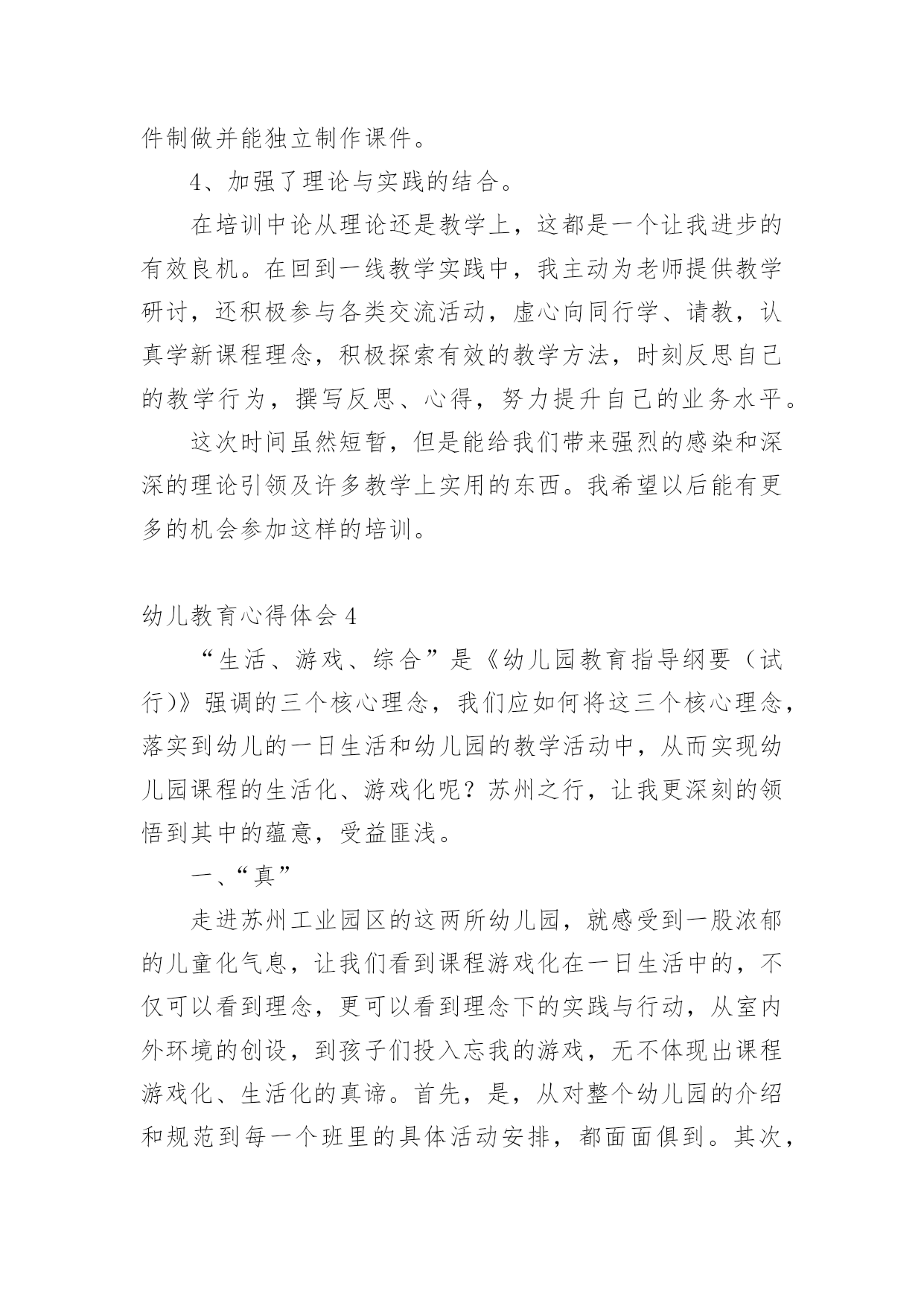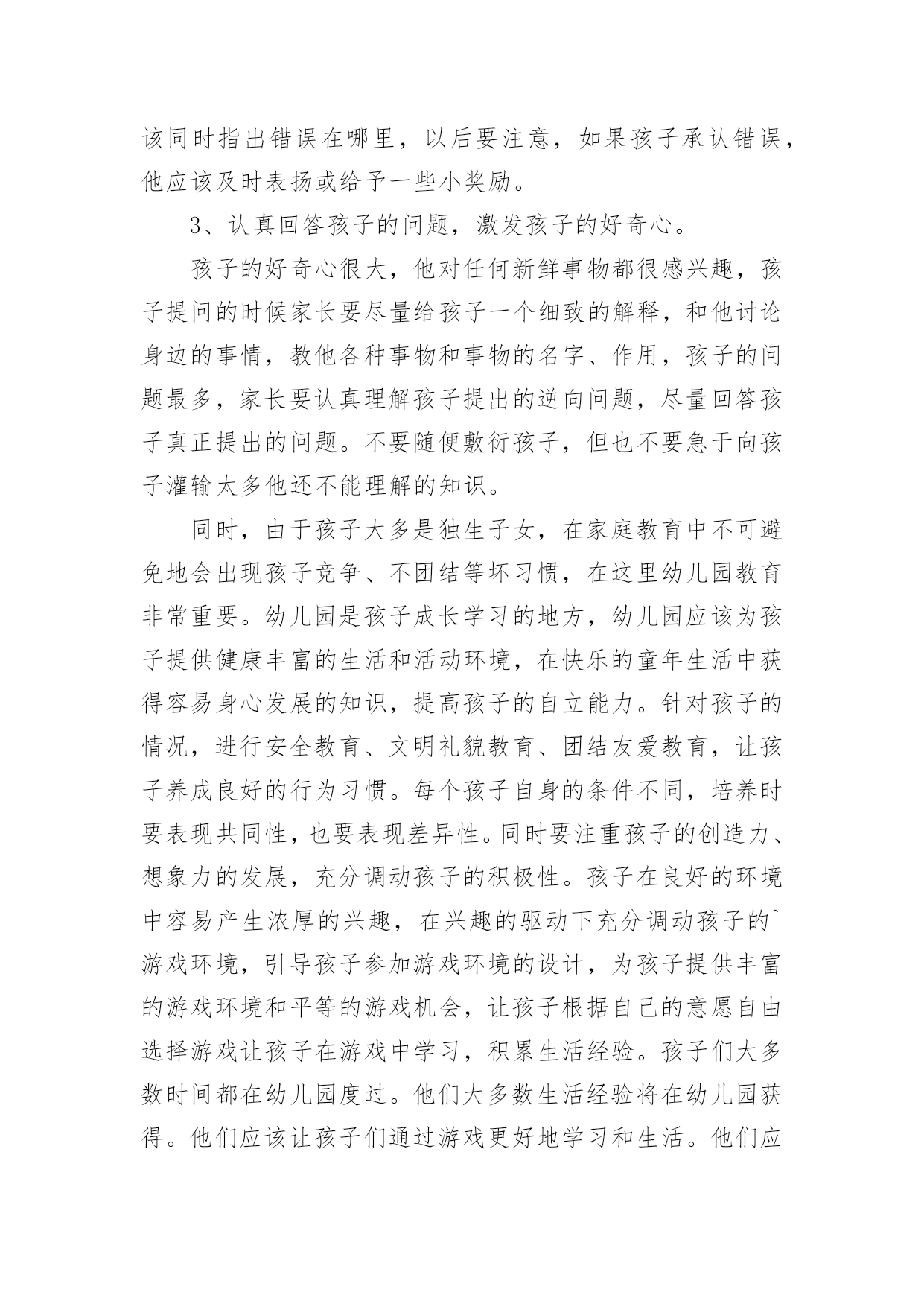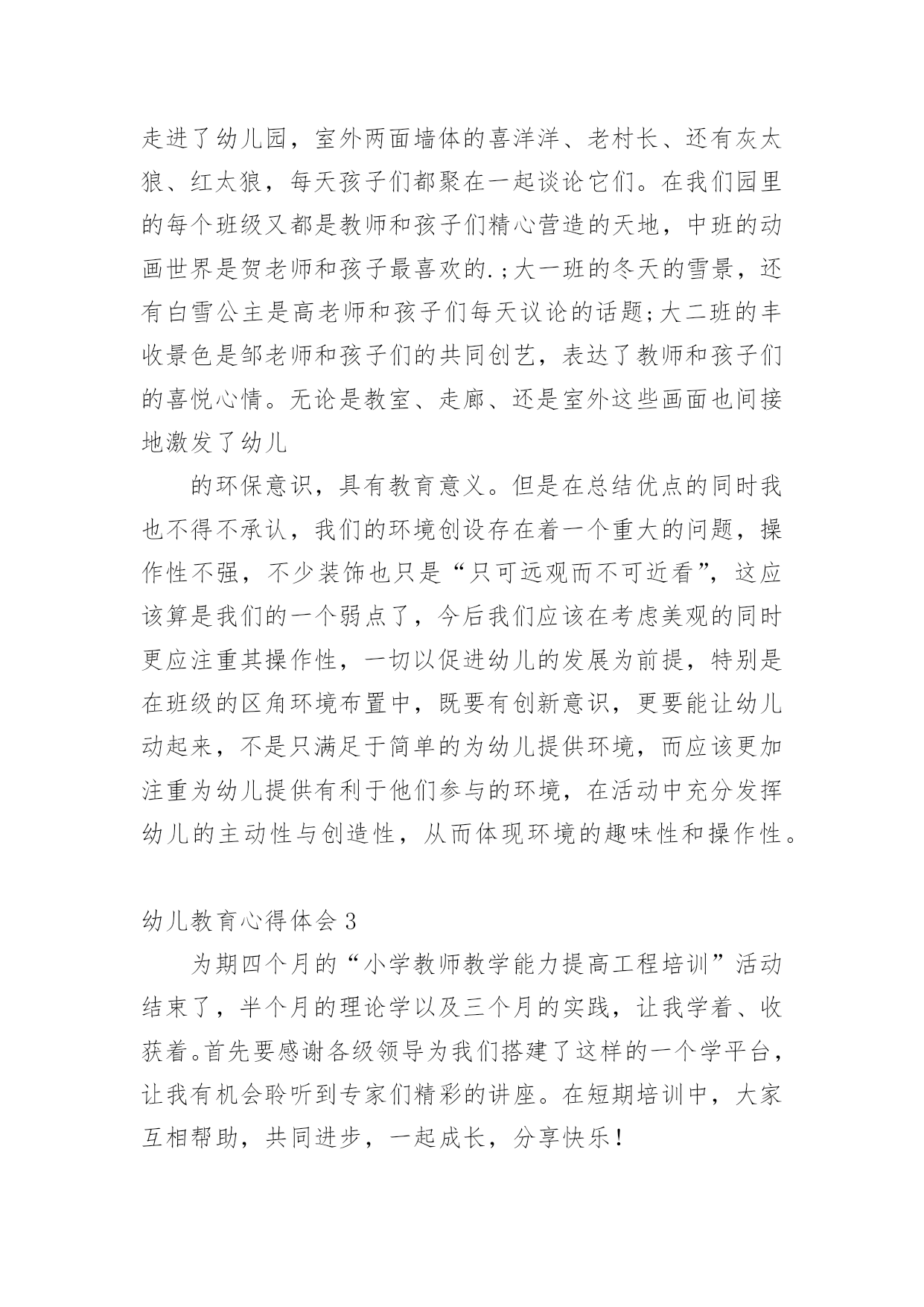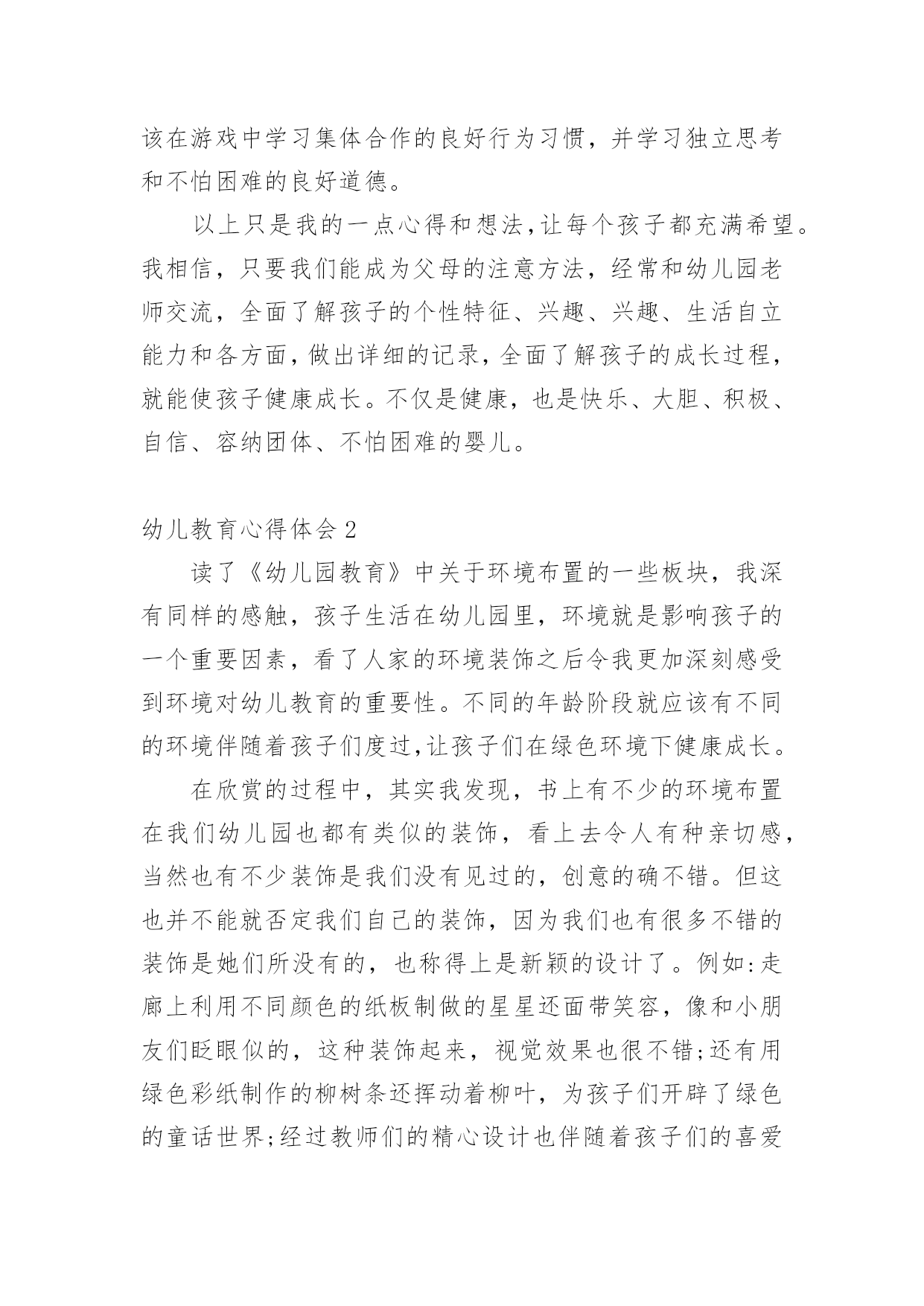 幼儿教育心得体会某些事情让我们心里有了一些心得后,可以记录在心得体会中,这样有利于培养我们思考的习惯。那么要如何写呢?以下是小编整理的幼儿教育心得体会,仅供参考,希望能够帮助到大家。幼儿教育心得体会1在当今社会,儿童教育成为所有父母关注的问题。孩子是家庭的希望,社会的未来,父母的希望自己的孩子能成功。但是,如何教育孩子,特别是如何进行幼儿教育成为摆在父母面前的难题,谈谈自己的想法。1.让孩子养成说话算数的好习惯。让孩子知道每个人都会说话,成为信用的人,答应的事情一定要做,让他知道说话的好处和重要性。最初,孩子约定的事情经常变化,很淘气。我对他要求严格或者有好处。当然,也可以互相讨价还价,养成说话算数的习惯。父母是孩子的榜样,父母一举一动,对孩子影响很大,答应孩子的事一定要做。2.培养孩子诚实善良的性格。父母应该经常和他们的孩子交流,从一些小事和他们的孩子讲道理,让他们逐渐理解什么是好事,什么是好事,什么是坏事。孩子有时会撒谎,但没有目的和恶意,只是有反抗的心理,或者想带着大人说话工作。在这种情况下,他应该同时指出错误在哪里,以后要注意,如果孩子承认错误,他应该及时表扬或给予一些小奖励。3、认真回答孩子的问题,激发孩子的好奇心。孩子的好奇心很大,他对任何新鲜事物都很感兴趣,孩子提问的时候家长要尽量给孩子一个细致的解释,和他讨论身边的事情,教他各种事物和事物的名字、作用,孩子的问题最多,家长要认真理解孩子提出的逆向问题,尽量回答孩子真正提出的问题。不要随便敷衍孩子,但也不要急于向孩子灌输太多他还不能理解的知识。同时,由于孩子大多是独生子女,在家庭教育中不可避免地会出现孩子竞争、不团结等坏习惯,在这里幼儿园教育非常重要。幼儿园是孩子成长学习的地方,幼儿园应该为孩子提供健康丰富的生活和活动环境,在快乐的童年生活中获得容易身心发展的知识,提高孩子的自立能力。针对孩子的情况,进行安全教育、文明礼貌教育、团结友爱教育,让孩子养成良好的行为习惯。每个孩子自身的条件不同,培养时要表现共同性,也要表现差异性。同时要注重孩子的创造力、想象力的发展,充分调动孩子的积极性。孩子在良好的环境中容易产生浓厚的兴趣,在兴趣的驱动下充分调动孩子的`游戏环境,引导孩子参加游戏环境的设计,为孩子提供丰富的游戏环境和平等的游戏机会,让孩子根据自己的意愿自由选择游戏让孩子在游戏中学习,积累生活经验。孩子们大多数时间都在幼儿园度过。他们大多数生活经验将在幼儿园获得。他们应该让孩子们通过游戏更好地学习和生活。他们应该在游戏中学习集体合作的良好行为习惯,并学习独立思考和不怕困难的良好道德。以上只是我的一点心得和想法,让每个孩子都充满希望。我相信,只要我们能成为父母的注意方法,经常和幼儿园老师交流,全面了解孩子的个性特征、兴趣、兴趣、生活自立能力和各方面,做出详细的记录,全面了解孩子的成长过程,就能使孩子健康成长。不仅是健康,也是快乐、大胆、积极、自信、容纳团体、不怕困难的婴儿。幼儿教育心得体会2读了《幼儿园教育》中关于环境布置的一些板块,我深有同样的感触,孩子生活在幼儿园里,环境就是影响孩子的一个重要因素,看了人家的环境装饰之后令我更加深刻感受到环境对幼儿教育的重要性。不同的年龄阶段就应该有不同的环境伴随着孩子们度过,让孩子们在绿色环境下健康成长。在欣赏的过程中,其实我发现,书上有不少的环境布置在我们幼儿园也都有类似的装饰,看上去令人有种亲切感,当然也有不少装饰是我们没有见过的,创意的确不错。但这也并不能就否定我们自己的装饰,因为我们也有很多不错的装饰是她们所没有的,也称得上是新颖的设计了。例如:走廊上利用不同颜色的纸板制做的星星还面带笑容,像和小朋友们眨眼似的,这种装饰起来,视觉效果也很不错;还有用绿色彩纸制作的柳树条还挥动着柳叶,为孩子们开辟了绿色的童话世界;经过教师们的精心设计也伴随着孩子们的喜爱走进了幼儿园,室外两面墙体的喜洋洋、老村长、还有灰太狼、红太狼,每天孩子们都聚在一起谈论它们。在我们园里的每个班级又都是教师和孩子们精心营造的天地,中班的动画世界是贺老师和孩子最喜欢的.;大一班的冬天的雪景,还有白雪公主是高老师和孩子们每天议论的话题;大二班的丰收景色是邹老师和孩子们的共同创艺,表达了教师和孩子们的喜悦心情。无论是教室、走廊、还是室外这些画面也间接地激发了幼儿的环保意识,具有教育意义。但是在总结优点的同时我也不得不承认,我们的环境创设存在着一个重大的问题,操作性不强,不少装饰也只是“只可远观而不可近看”,这应该算是我们的一个弱点了,今后我们应该在考虑美观的同时更应注重其操作性,一切以促进幼儿的发展为前提,特别是在班级的区角环境布置中,既要有创新意识,更要能让幼儿动起来,不是只满足于简单的为幼儿提供环境,而应该更加注重为幼儿提供有利于他们参与的环境,在活动中