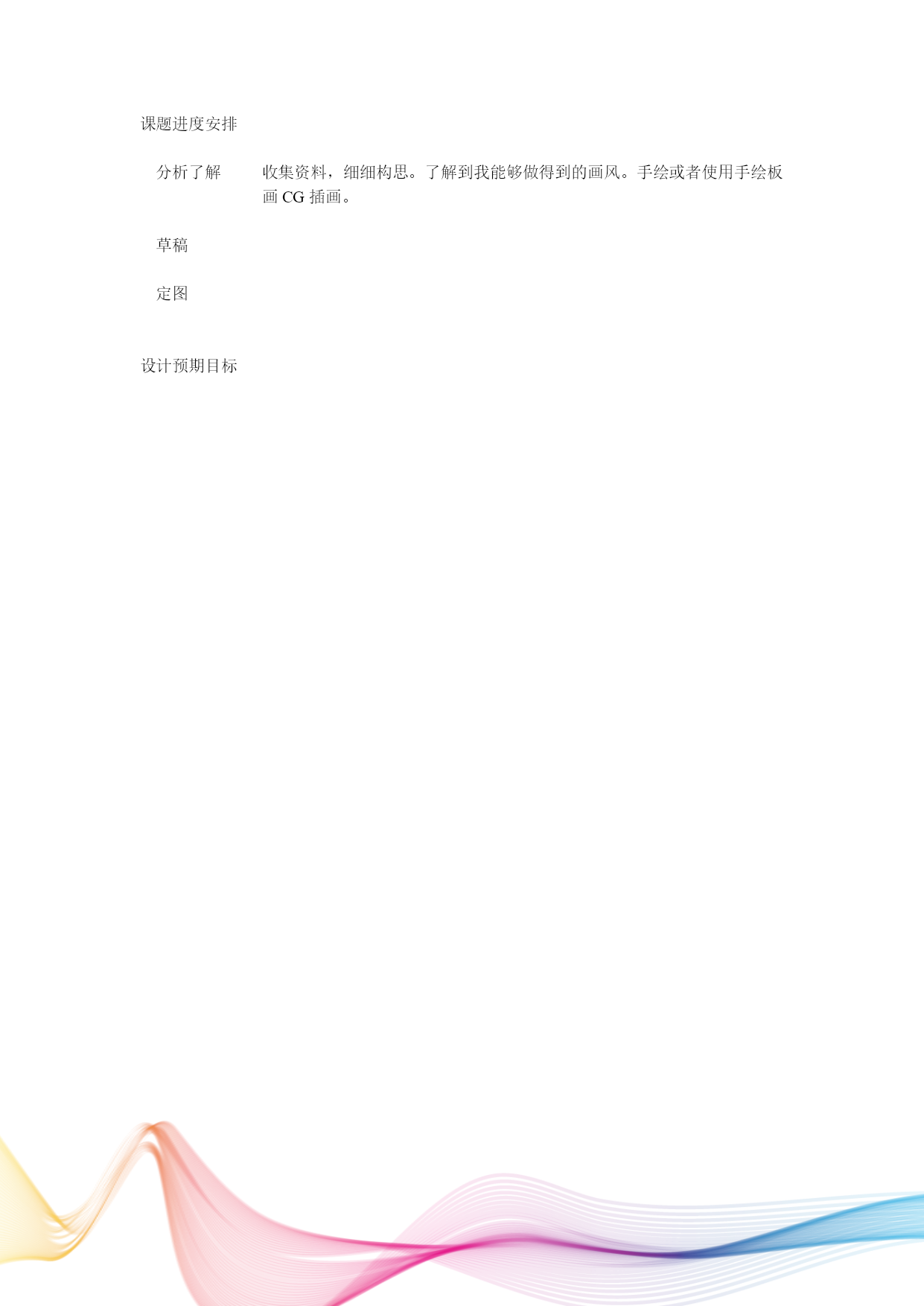 “奕”主题插画设计课题名称“奕”插画设计课题展开“奕”顾名思义,就对弈、博弈。像围棋上的黑白双方“攻”与“受”。也就英文的“VS”。就像是中国古代太极八卦中的阴阳鱼。白鱼为阳,黑鱼为阴。是互为对抗的两方面。而表现“奕”,人的一生的轨迹似乎能更好的诠释。“生老病死”是个划句点的圈。而人的一生无时无刻不存在这“奕”的场景。人具体分成九大时期:①胚胎期(这是与母体对弈的时期)②婴儿期(这是与奶瓶对弈的时期)③学习期(这是与课本对弈的时期)④工作期(这是与上司对弈的时期)⑤恋爱期(与老婆对弈的时期)⑥婚姻期(与丈母娘对弈的时期)⑦爸爸期(与宝宝争夺妻子关心的时期)⑧退休期(与老婆对弈时期)⑨死亡期(上了天堂,与上帝对弈时期)选题简介及选题背景本来是想作一个搞怪主题。诙谐,轻松一下。免得毕业时光太过拘谨和严肃。跟朋友聊天的玩笑话“鸡抽烟”,想到世间之不平等地位之生灵之间对弈关系,如果弱小的一方某一天某些时刻凌驾于强大的一方之上,也许是另一番诙谐,眼眉吐气的景象。由此而想到:人常常打着伞,伞如果撑着,把人勾在雨伞架上会是什么景象?又或者被人豢养着的小动物,反其道、把人豢养在笼子里,让来踩着水车,又是什么样子?开始想拟定主题为“反噬”。这样的主题,不够展开,进而想到用人类本身来体现,翔实些。亦是,“对弈”人也如围棋中的棋子一样微渺,千千万万颗小棋子,亦如人一样千千万。每天的行动亦不过在自己的范围之内,方寸之地。而且每时每刻都经历着博弈生活。设计定位风格轻松、诙谐。以阴阳鱼中的白鱼、黑鱼来做原型,设计出主要的人物形象。主色采用围棋中的黑白两色,体现出对弈的主题,灰色做辅色,带点单色彩。背景采用棋盘。亦可以棋子的形象来设计主角,也显示出“奕”的感觉。课题进度安排分析了解收集资料,细细构思。了解到我能够做得到的画风。手绘或者使用手绘板画CG插画。草稿定图设计预期目标