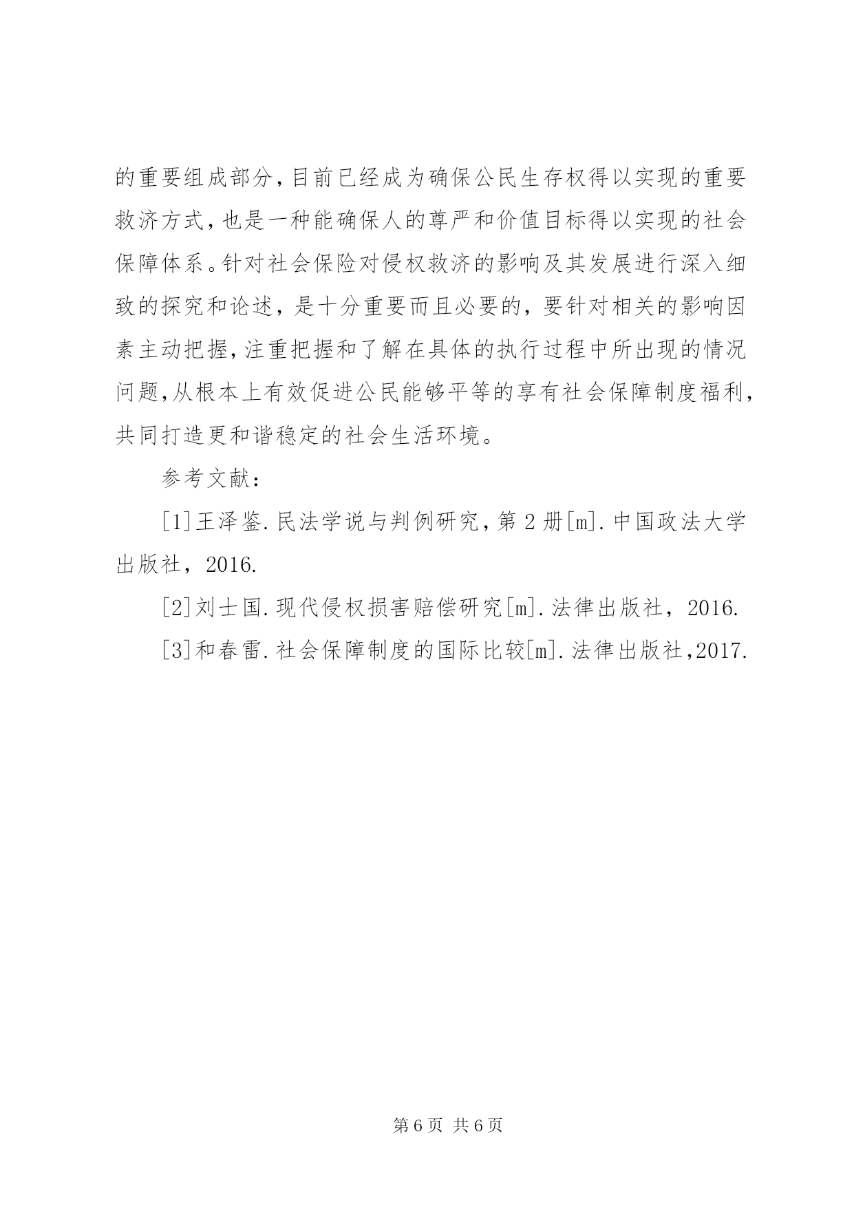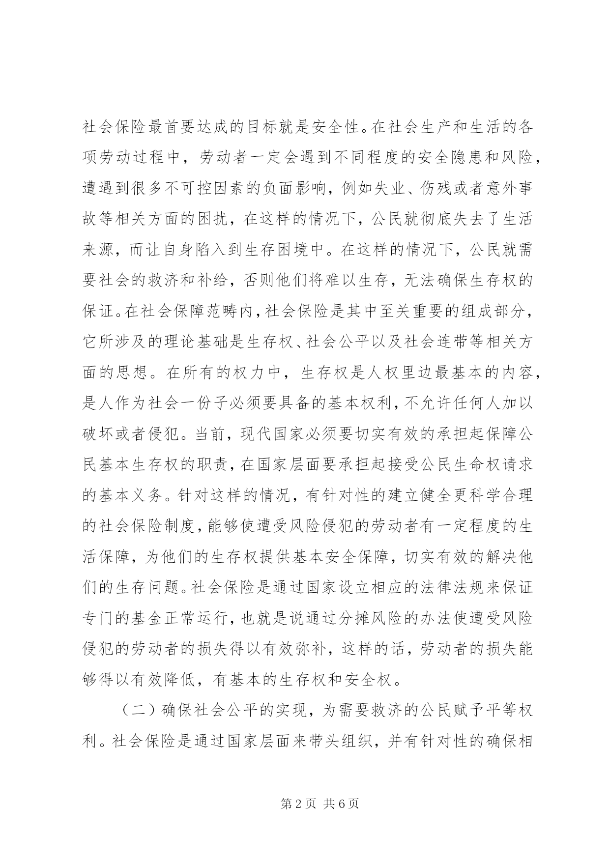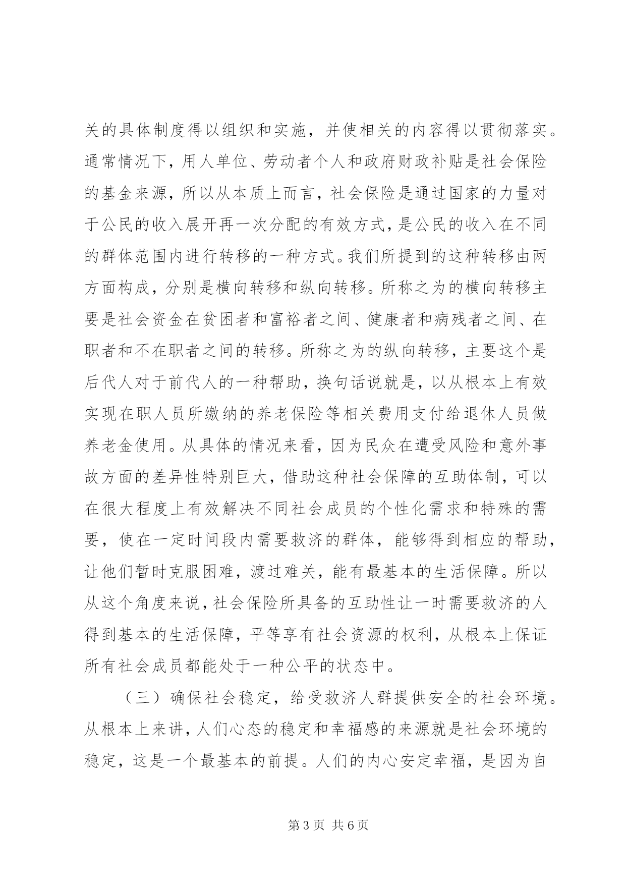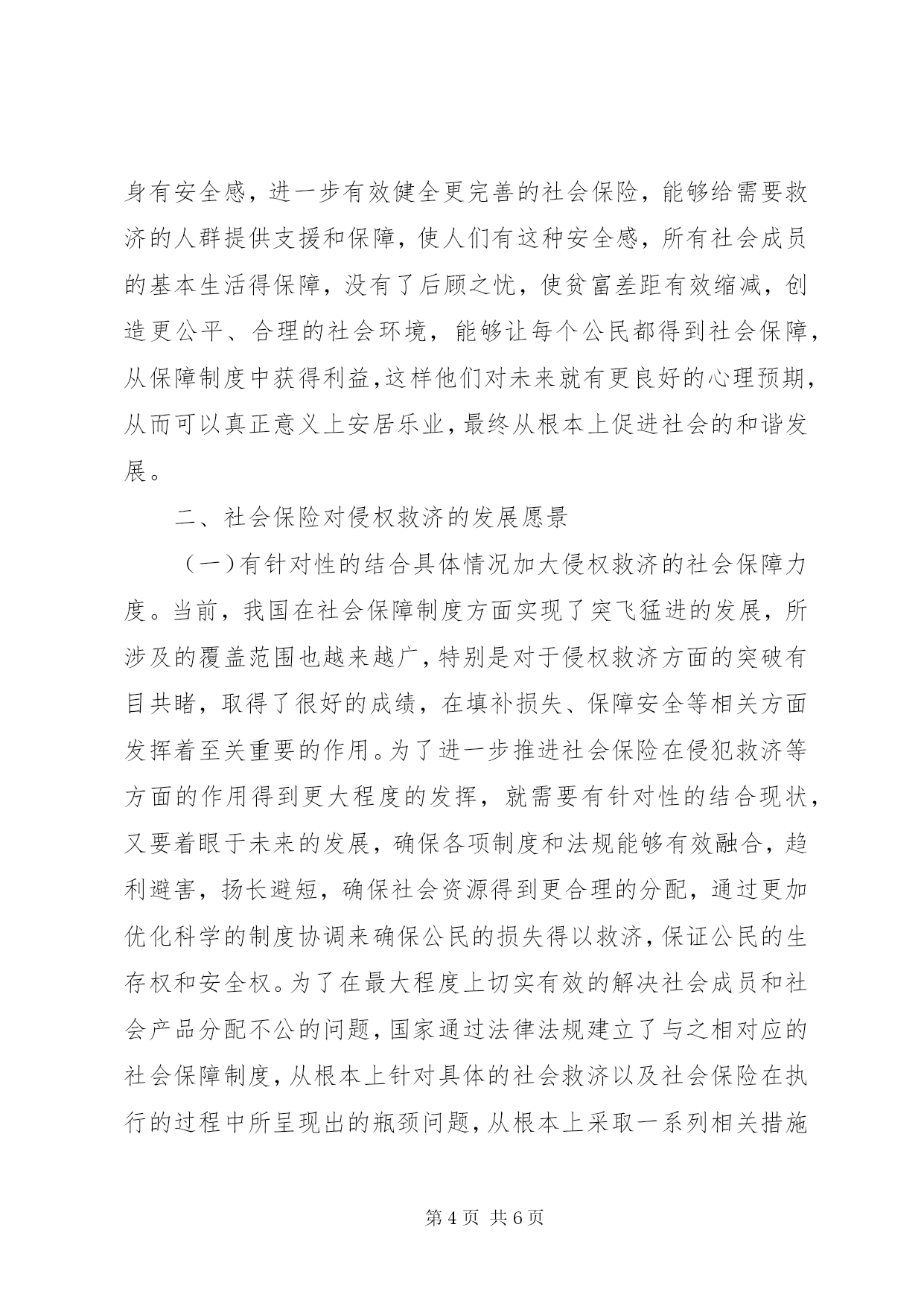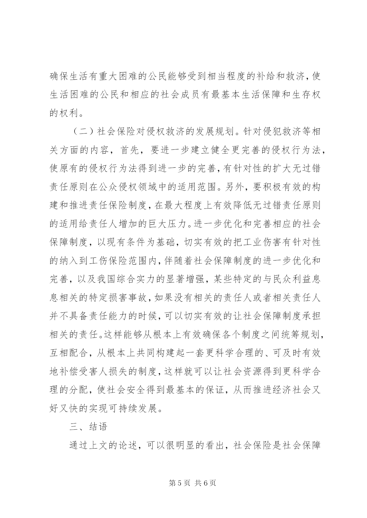 第PAGE\*Arabic\*MERGEFORMAT6页共NUMPAGES\*MERGEFORMAT6页社会保险对侵权救济影响及发展摘要。在社会保障范畴内,社会保险是其中至关重要的组成部分,它所涉及的理论基础是生存权、社会公平以及社会连带等相关方面的思想。在所有的权力中,生存权是人权里边最基本的内容,是人作为社会一份子必须要具备的基本权利,不允许任何人加以破坏或者侵犯。当前,现代国家必须要切实有效的承担起保障公民基本生存权的职责,在国家层面要承担起接受公民生命权请求的基本义务。针对此情况,文章着重分析和探究社会保险对侵权救济的影响及其发展,希望为相关从业者提供有益的借鉴和参考。关键词:社会保险;侵权救济;影响;发展为了在最大程度上切实有效的解决社会成员和社会产品分配不公的问题,国家通过法律法规建立了与之相对应的社会保障制度,确保生活有重大困难的公民能够受到相当程度的补给和救济,使生活困难的公民和相应的社会成员有最基本生活保障和生存权的权利。社会保险是社会保障的重要组成部分,目前已经成为确保公民生存权得以实现的重要救济方式,也是一种能确保人的尊严和价值目标得以实现的社会保障体系。一、社会保险的主要功能及对侵权救济的影响(一)具备安全保障功能,确保公民有基本安全保障。社会保险最根本的宗旨就是为了在最大程度上有效确保公民的安全,社会保险最首要达成的目标就是安全性。在社会生产和生活的各项劳动过程中,劳动者一定会遇到不同程度的安全隐患和风险,遭遇到很多不可控因素的负面影响,例如失业、伤残或者意外事故等相关方面的困扰,在这样的情况下,公民就彻底失去了生活来源,而让自身陷入到生存困境中。在这样的情况下,公民就需要社会的救济和补给,否则他们将难以生存,无法确保生存权的保证。在社会保障范畴内,社会保险是其中至关重要的组成部分,它所涉及的理论基础是生存权、社会公平以及社会连带等相关方面的思想。在所有的权力中,生存权是人权里边最基本的内容,是人作为社会一份子必须要具备的基本权利,不允许任何人加以破坏或者侵犯。当前,现代国家必须要切实有效的承担起保障公民基本生存权的职责,在国家层面要承担起接受公民生命权请求的基本义务。针对这样的情况,有针对性的建立健全更科学合理的社会保险制度,能够使遭受风险侵犯的劳动者有一定程度的生活保障,为他们的生存权提供基本安全保障,切实有效的解决他们的生存问题。社会保险是通过国家设立相应的法律法规来保证专门的基金正常运行,也就是说通过分摊风险的办法使遭受风险侵犯的劳动者的损失得以有效弥补,这样的话,劳动者的损失能够得以有效降低,有基本的生存权和安全权。(二)确保社会公平的实现,为需要救济的公民赋予平等权利。社会保险是通过国家层面来带头组织,并有针对性的确保相关的具体制度得以组织和实施,并使相关的内容得以贯彻落实。通常情况下,用人单位、劳动者个人和政府财政补贴是社会保险的基金来源,所以从本质上而言,社会保险是通过国家的力量对于公民的收入展开再一次分配的有效方式,是公民的收入在不同的群体范围内进行转移的一种方式。我们所提到的这种转移由两方面构成,分别是横向转移和纵向转移。所称之为的横向转移主要是社会资金在贫困者和富裕者之间、健康者和病残者之间、在职者和不在职者之间的转移。所称之为的纵向转移,主要这个是后代人对于前代人的一种帮助,换句话说就是,以从根本上有效实现在职人员所缴纳的养老保险等相关费用支付给退休人员做养老金使用。从具体的情况来看,因为民众在遭受风险和意外事故方面的差异性特别巨大,借助这种社会保障的互助体制,可以在很大程度上有效解决不同社会成员的个性化需求和特殊的需要,使在一定时间段内需要救济的群体,能够得到相应的帮助,让他们暂时克服困难,渡过难关,能有最基本的生活保障。所以从这个角度来说,社会保险所具备的互助性让一时需要救济的人得到基本的生活保障,平等享有社会资源的权利,从根本上保证所有社会成员都能处于一种公平的状态中。(三)确保社会稳定,给受救济人群提供安全的社会环境。从根本上来讲,人们心态的稳定和幸福感的来源就是社会环境的稳定,这是一个最基本的前提。人们的内心安定幸福,是因为自身有安全感,进一步有效健全更完善的社会保险,能够给需要救济的人群提供支援和保障,使人们有这种安全感,所有社会成员的基本生活得保障,没有了后顾之忧,使贫富差距有效缩减,创造更公平、合理的社会环境,能够让每个公民都得到社会保障,从保障制度中获得利益,这样他们对未来就有更良好的心理预期,从而可以真正意义上安居乐业,最终从根本上促进社会的和谐发展。二、社会保险对侵权救济的发展愿景(一)有针对性的结合具体情况加大侵权救济的社会保障力度。当前,我国在社会保障制度方面实现了突飞猛进的发展,所涉及的覆盖范围也越来越广,特别是对于侵权救济