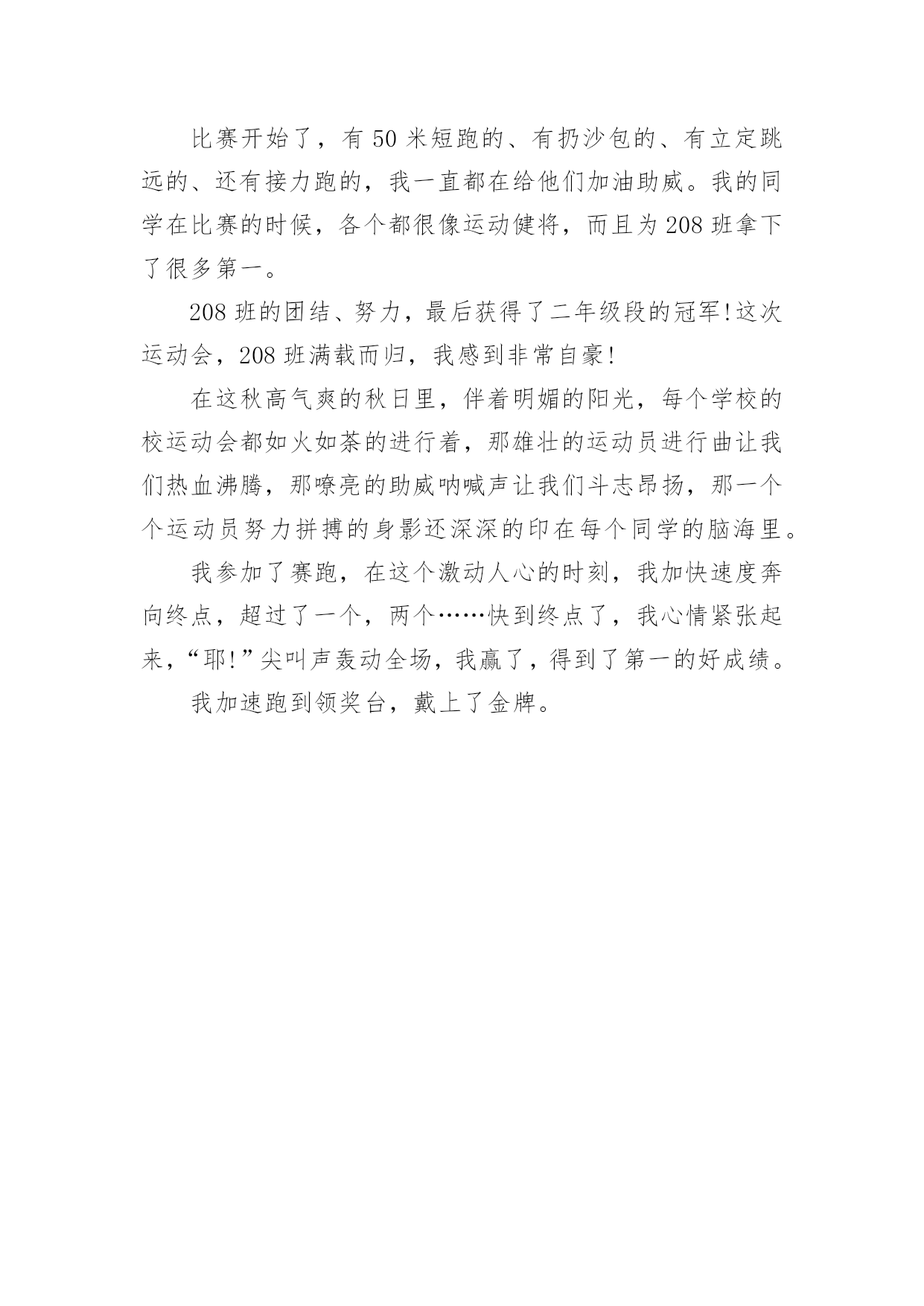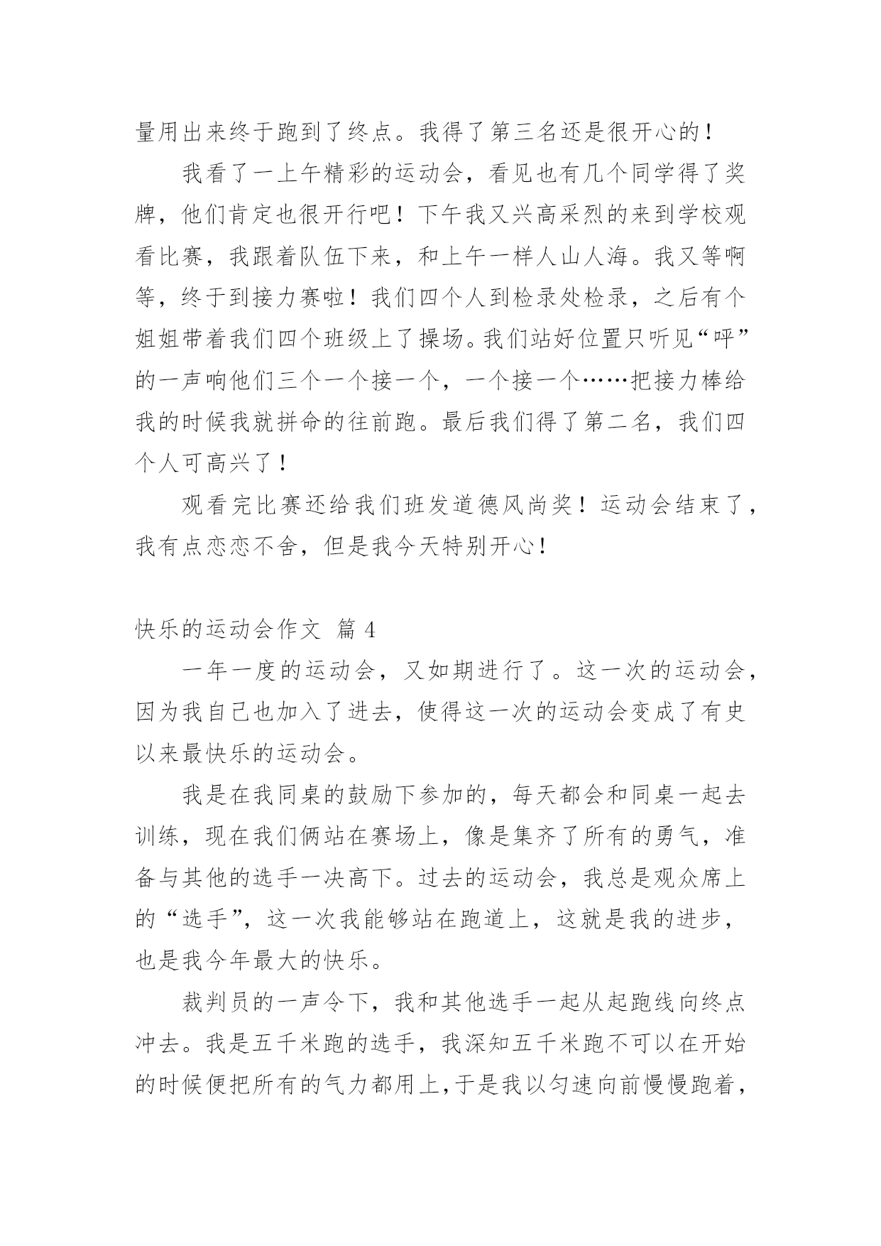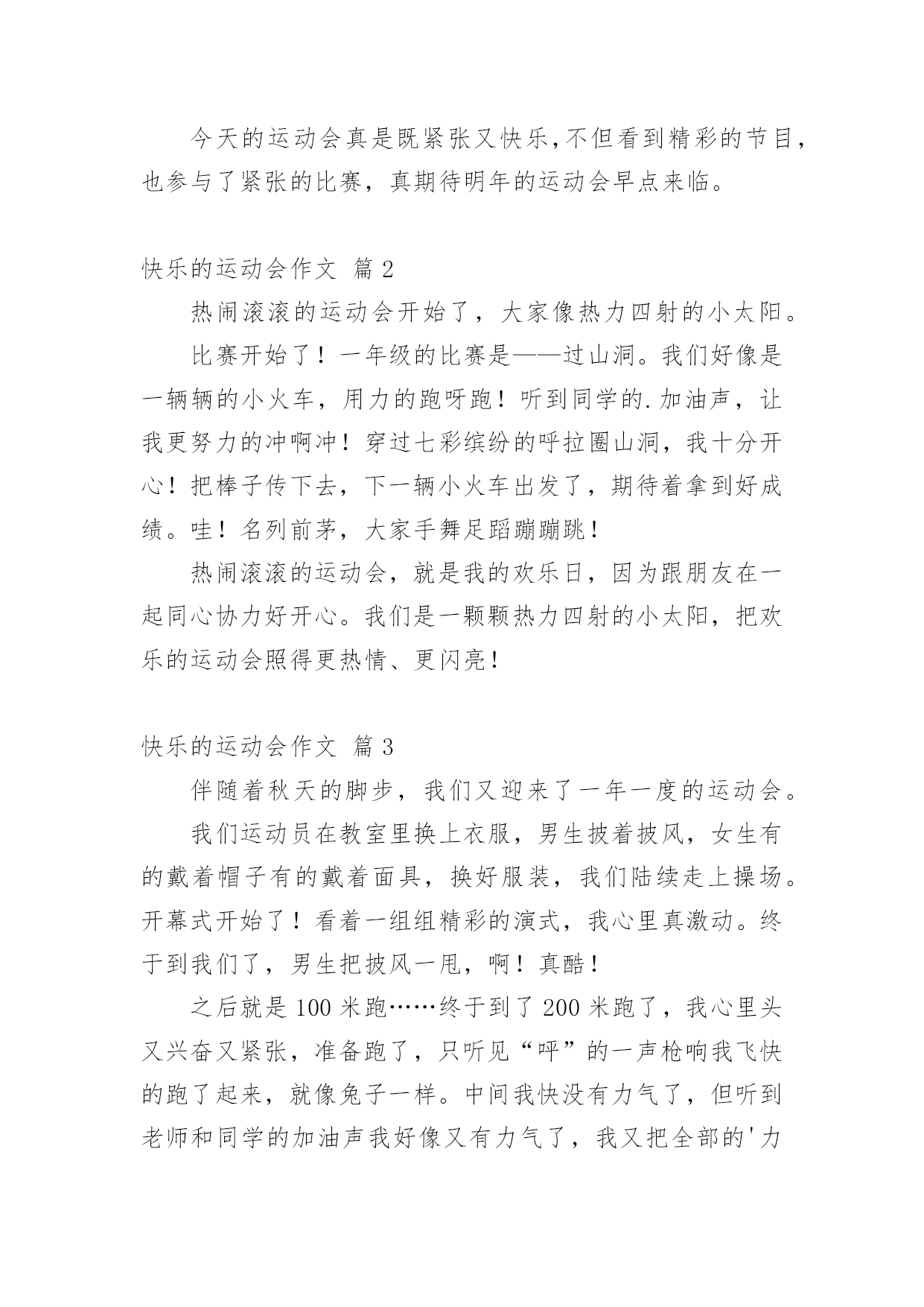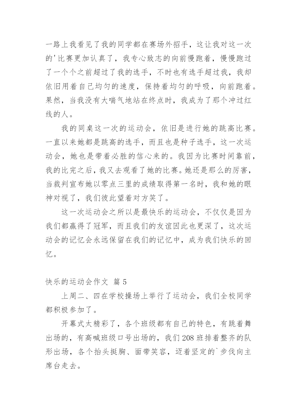 快乐的运动会作文精选快乐的运动会作文汇总5篇在日复一日的学习、工作或生活中,大家都写过作文,肯定对各类作文都很熟悉吧,根据写作命题的特点,作文可以分为命题作文和非命题作文。那么你知道一篇好的作文该怎么写吗?以下是小编收集整理的快乐的运动会作文5篇,欢迎大家借鉴与参考,希望对大家有所帮助。快乐的运动会作文篇1十一月二十五日星期六,是我们学校的运动会。一大早艳阳高照,校门外车子川流不息,人潮涌挤,并且摊贩林立,卖着各种好吃的东西,有糖壶芦、棉花糖、热狗、饮料…等了。校门口,有一道大大的充气拱门,上面写苗苗小学第二十五年校庆。哇!原来学校二十五岁了,比我还大上好多岁。一踏入校园,就看到接待区有许多人忙着签名。操场里布置得五彩缤纷,热闹非凡,锣鼓声响彻云霄,每个人都带着欢喜的心情,期待一天的开始。我喜欢看跆拳道、舞狮以及六年级的团体操表演。我们是三年级,班上参加的项目有六十米赛跑和踢足球。踢足球的成绩是全三年级竞赛中的第三名,全班都欣喜若狂。但是,我参加的'六十米赛跑成绩不理想,不过我并不气馁,只要努力不懈,秉持着运动家的精神,相信凡事都会成功。今天的运动会真是既紧张又快乐,不但看到精彩的节目,也参与了紧张的比赛,真期待明年的运动会早点来临。快乐的运动会作文篇2热闹滚滚的运动会开始了,大家像热力四射的小太阳。比赛开始了!一年级的比赛是——过山洞。我们好像是一辆辆的小火车,用力的跑呀跑!听到同学的.加油声,让我更努力的冲啊冲!穿过七彩缤纷的呼拉圈山洞,我十分开心!把棒子传下去,下一辆小火车出发了,期待着拿到好成绩。哇!名列前茅,大家手舞足蹈蹦蹦跳!热闹滚滚的运动会,就是我的欢乐日,因为跟朋友在一起同心协力好开心。我们是一颗颗热力四射的小太阳,把欢乐的运动会照得更热情、更闪亮!快乐的运动会作文篇3伴随着秋天的脚步,我们又迎来了一年一度的运动会。我们运动员在教室里换上衣服,男生披着披风,女生有的戴着帽子有的戴着面具,换好服装,我们陆续走上操场。开幕式开始了!看着一组组精彩的演式,我心里真激动。终于到我们了,男生把披风一甩,啊!真酷!之后就是100米跑……终于到了200米跑了,我心里头又兴奋又紧张,准备跑了,只听见“呯”的一声枪响我飞快的跑了起来,就像兔子一样。中间我快没有力气了,但听到老师和同学的加油声我好像又有力气了,我又把全部的'力量用出来终于跑到了终点。我得了第三名还是很开心的!我看了一上午精彩的运动会,看见也有几个同学得了奖牌,他们肯定也很开行吧!下午我又兴高采烈的来到学校观看比赛,我跟着队伍下来,和上午一样人山人海。我又等啊等,终于到接力赛啦!我们四个人到检录处检录,之后有个姐姐带着我们四个班级上了操场。我们站好位置只听见“呯”的一声响他们三个一个接一个,一个接一个……把接力棒给我的时候我就拼命的往前跑。最后我们得了第二名,我们四个人可高兴了!观看完比赛还给我们班发道德风尚奖!运动会结束了,我有点恋恋不舍,但是我今天特别开心!快乐的运动会作文篇4一年一度的运动会,又如期进行了。这一次的运动会,因为我自己也加入了进去,使得这一次的运动会变成了有史以来最快乐的运动会。我是在我同桌的鼓励下参加的,每天都会和同桌一起去训练,现在我们俩站在赛场上,像是集齐了所有的勇气,准备与其他的选手一决高下。过去的运动会,我总是观众席上的“选手”,这一次我能够站在跑道上,这就是我的进步,也是我今年最大的快乐。裁判员的一声令下,我和其他选手一起从起跑线向终点冲去。我是五千米跑的选手,我深知五千米跑不可以在开始的时候便把所有的气力都用上,于是我以匀速向前慢慢跑着,一路上我看见了我的同学都在赛场外招手,这让我对这一次的'比赛更加认真了,我专心致志的向前慢跑着,慢慢跑过了一个个之前超过了我的选手,不时也有选手超过我,我却依旧用着自己均匀的速度,保持着均匀的呼吸,向前跑着。果然,当我没有大喘气地站在终点时,我成为了那个冲过红线的人。我的同桌这一次的运动会,依旧是进行她的跳高比赛。一直以来她都是跳高的选手,而且也是种子选手,这一次运动会,她也是带着必胜的信心来的。我因为比赛时间靠前,我的比完之后,我又去观看了她的比赛。她还是那么的厉害,当裁判宣布她以零点三里的成绩取得第一名时,我和她的眼神对视了,我们彼此望着对方笑了。这一次运动会之所以是最快乐的运动会,不仅仅是因为我们都赢得了冠军,而且我们的友谊因此也更深了,这次运动会的记忆会永远保留在我们的记忆中,成为我们快乐的回忆。快乐的运动会作文篇5上周二、四在学校操场上举行了运动会,我们全校同学都积极参加了。开幕式太精彩了,各个班级都有自己的特色,有跳着舞出场的,有高喊班级口号出场的,我们208班排着整齐的队形出场,各个抬头挺胸、面带笑容,迈着坚定的`步伐向主席台走去。比赛开始了,有50米短跑的、有扔沙包的、有立定跳远