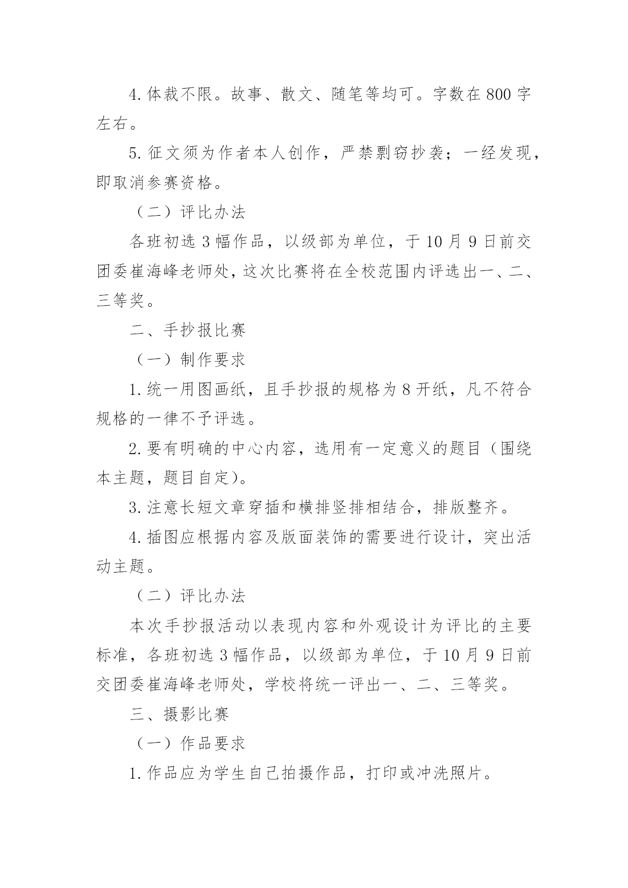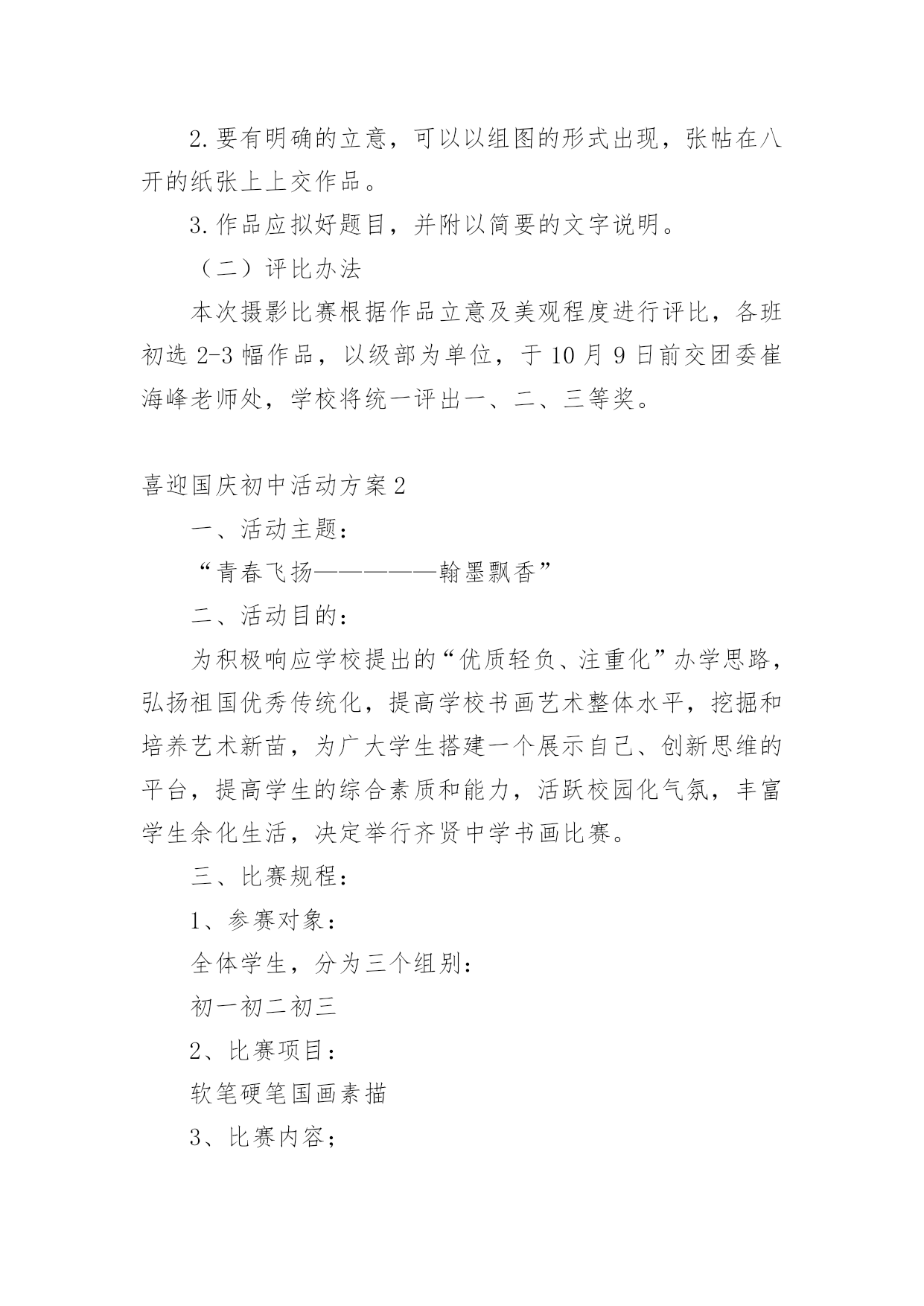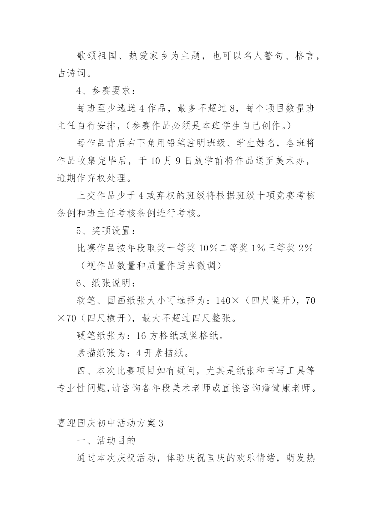 喜迎国庆初中活动方案2022喜迎国庆初中活动方案(精选9篇)为了确保活动有序地进行,就不得不需要事先制定活动方案,活动方案是对具体将要进行的活动的每个步骤详细分析,研究后所制定的书面计划。那么你有了解过活动方案吗?以下是小编精心整理的2022喜迎国庆初中活动方案(精选9篇),欢迎大家分享。喜迎国庆初中活动方案1为了庆祝国庆XX周年,歌颂伟大祖国繁荣富强,体验家乡变化,感受人民生活水平变化和学校发展变化,激励广大同学爱国,爱校,爱家乡的情感,繁荣校园文化生活,提高综合素质。特举办此次“爱祖国、爱家乡、爱学校”为主题的国庆实践活动。一、征文活动(一)活动要求1.参与对象:全体学生。2.内容要求:征文以真人真事为内容,可以歌颂祖国的繁荣昌盛、人民的幸福生活;可以描绘祖国山川的美丽;可以展现人们在构建社会主义和谐社会的历史时期所表现出来的积极向上的精神风貌;可以表达对祖国的深切热爱。3.题目自拟。围绕主题,结合实际,说真话,写真情,述真事。4.体裁不限。故事、散文、随笔等均可。字数在800字左右。5.征文须为作者本人创作,严禁剽窃抄袭;一经发现,即取消参赛资格。(二)评比办法各班初选3幅作品,以级部为单位,于10月9日前交团委崔海峰老师处,这次比赛将在全校范围内评选出一、二、三等奖。二、手抄报比赛(一)制作要求1.统一用图画纸,且手抄报的规格为8开纸,凡不符合规格的一律不予评选。2.要有明确的中心内容,选用有一定意义的题目(围绕本主题,题目自定)。3.注意长短文章穿插和横排竖排相结合,排版整齐。4.插图应根据内容及版面装饰的需要进行设计,突出活动主题。(二)评比办法本次手抄报活动以表现内容和外观设计为评比的主要标准,各班初选3幅作品,以级部为单位,于10月9日前交团委崔海峰老师处,学校将统一评出一、二、三等奖。三、摄影比赛(一)作品要求1.作品应为学生自己拍摄作品,打印或冲洗照片。2.要有明确的立意,可以以组图的形式出现,张帖在八开的纸张上上交作品。3.作品应拟好题目,并附以简要的文字说明。(二)评比办法本次摄影比赛根据作品立意及美观程度进行评比,各班初选2-3幅作品,以级部为单位,于10月9日前交团委崔海峰老师处,学校将统一评出一、二、三等奖。喜迎国庆初中活动方案2一、活动主题:“青春飞扬—————翰墨飘香”二、活动目的:为积极响应学校提出的“优质轻负、注重化”办学思路,弘扬祖国优秀传统化,提高学校书画艺术整体水平,挖掘和培养艺术新苗,为广大学生搭建一个展示自己、创新思维的平台,提高学生的综合素质和能力,活跃校园化气氛,丰富学生余化生活,决定举行齐贤中学书画比赛。三、比赛规程:1、参赛对象:全体学生,分为三个组别:初一初二初三2、比赛项目:软笔硬笔国画素描3、比赛内容;歌颂祖国、热爱家乡为主题,也可以名人警句、格言,古诗词。4、参赛要求:每班至少选送4作品,最多不超过8,每个项目数量班主任自行安排,(参赛作品必须是本班学生自己创作。)每作品背后右下角用铅笔注明班级、学生姓名,各班将作品收集完毕后,于10月9日放学前将作品送至美术办,逾期作弃权处理。上交作品少于4或弃权的班级将根据班级十项竞赛考核条例和班主任考核条例进行考核。5、奖项设置:比赛作品按年段取奖一等奖10%二等奖1%三等奖2%(视作品数量和质量作适当微调)6、纸张说明:软笔、国画纸张大小可选择为:140×(四尺竖开),70×70(四尺横开),最大不超过四尺整张。硬笔纸张为:16方格纸或竖格纸。素描纸张为:4开素描纸。四、本次比赛项目如有疑问,尤其是纸张和书写工具等专业性问题,请咨询各年段美术老师或直接咨询詹健康老师。喜迎国庆初中活动方案3一、活动目的通过本次庆祝活动,体验庆祝国庆的欢乐情绪,萌发热爱祖国的情感。培养少先队员民族自豪感,调动每个孩子积极参与的热情,真切感受经典诵读的快乐,营造良好的校园艺术文化氛围。活动主题:“祖国在我心中”活动对象:全体师生活动时间:20xx年x月x日——20xx年x月x日二、活动准备各班布置教室黑板板画主题悬挂标语气球、彩带若干三、活动内容1、出一期“祖国在我心中”为主题的黑板报。请各班于x月x日前完成。2、全校开展“歌颂祖国、爱我中华”的经典诵读比赛。时间为x月x日下午两点。3、评比标准:(1)仪态大方、着装得体、动作适当。(2)所选诗歌内容必须是以歌颂祖国为主题。思想健康向上,符合学生年龄特点。(3)普通话标准、声音洪亮。(4)读出诗歌的韵味,语气、语调适当;重音、节奏恰当。(5)表达诗歌的情感准确自然。(6)现场演出效果好。四、活动具体要求1、以中队为单位参加比赛,各年级段分别评奖,各中队原则上要求全体队员参加。本次活动将评出一等奖2个,二等奖2个,三等奖4个,优秀奖若干。一二等奖将设立奖金,以资鼓励。2、诵读内容积极向上,颂扬