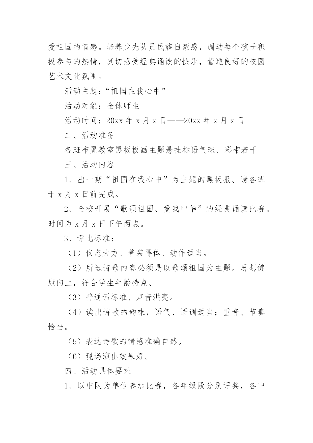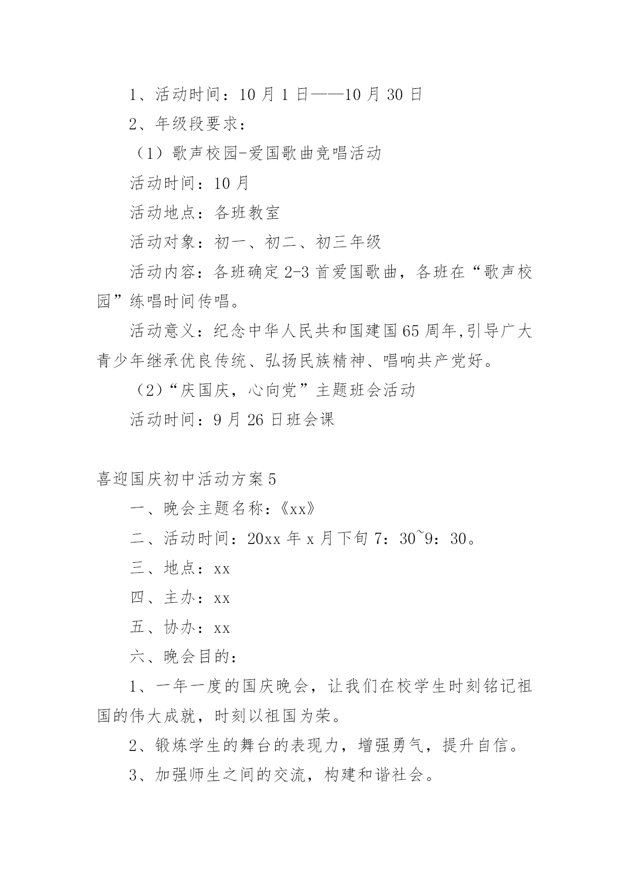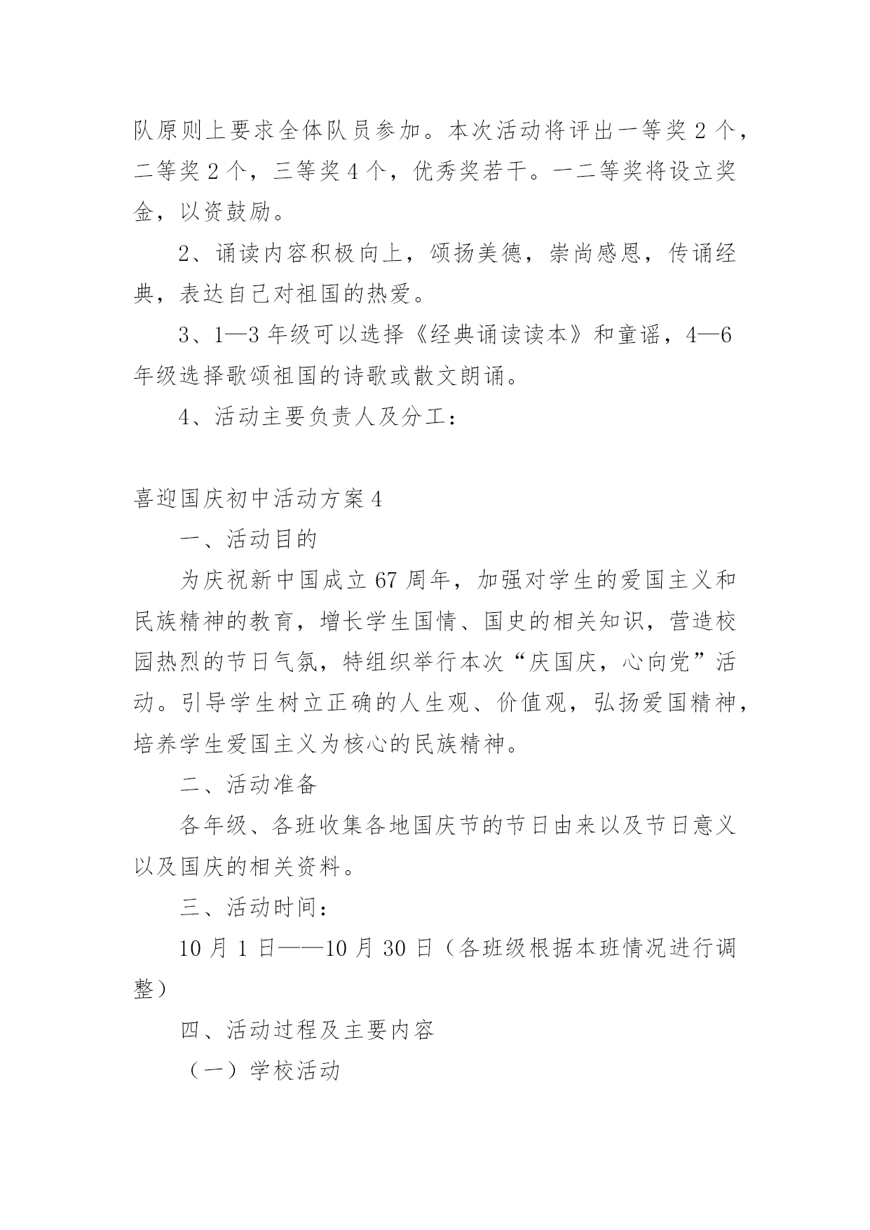 喜迎国庆初中活动方案2022喜迎国庆初中活动方案(精选9篇)为了确保活动有序地进行,就不得不需要事先制定活动方案,活动方案是对具体将要进行的活动的每个步骤详细分析,研究后所制定的书面计划。那么你有了解过活动方案吗?以下是小编精心整理的2022喜迎国庆初中活动方案(精选9篇),欢迎大家分享。喜迎国庆初中活动方案1为了庆祝国庆XX周年,歌颂伟大祖国繁荣富强,体验家乡变化,感受人民生活水平变化和学校发展变化,激励广大同学爱国,爱校,爱家乡的情感,繁荣校园文化生活,提高综合素质。特举办此次“爱祖国、爱家乡、爱学校”为主题的国庆实践活动。一、征文活动(一)活动要求1.参与对象:全体学生。2.内容要求:征文以真人真事为内容,可以歌颂祖国的繁荣昌盛、人民的幸福生活;可以描绘祖国山川的美丽;可以展现人们在构建社会主义和谐社会的历史时期所表现出来的积极向上的精神风貌;可以表达对祖国的深切热爱。3.题目自拟。围绕主题,结合实际,说真话,写真情,述真事。4.体裁不限。故事、散文、随笔等均可。字数在800字左右。5.征文须为作者本人创作,严禁剽窃抄袭;一经发现,即取消参赛资格。(二)评比办法各班初选3幅作品,以级部为单位,于10月9日前交团委崔海峰老师处,这次比赛将在全校范围内评选出一、二、三等奖。二、手抄报比赛(一)制作要求1.统一用图画纸,且手抄报的规格为8开纸,凡不符合规格的一律不予评选。2.要有明确的中心内容,选用有一定意义的题目(围绕本主题,题目自定)。3.注意长短文章穿插和横排竖排相结合,排版整齐。4.插图应根据内容及版面装饰的需要进行设计,突出活动主题。(二)评比办法本次手抄报活动以表现内容和外观设计为评比的主要标准,各班初选3幅作品,以级部为单位,于10月9日前交团委崔海峰老师处,学校将统一评出一、二、三等奖。三、摄影比赛(一)作品要求1.作品应为学生自己拍摄作品,打印或冲洗照片。2.要有明确的立意,可以以组图的形式出现,张帖在八开的纸张上上交作品。3.作品应拟好题目,并附以简要的文字说明。(二)评比办法本次摄影比赛根据作品立意及美观程度进行评比,各班初选2-3幅作品,以级部为单位,于10月9日前交团委崔海峰老师处,学校将统一评出一、二、三等奖。喜迎国庆初中活动方案2一、活动主题:“青春飞扬—————翰墨飘香”二、活动目的:为积极响应学校提出的“优质轻负、注重化”办学思路,弘扬祖国优秀传统化,提高学校书画艺术整体水平,挖掘和培养艺术新苗,为广大学生搭建一个展示自己、创新思维的平台,提高学生的综合素质和能力,活跃校园化气氛,丰富学生余化生活,决定举行齐贤中学书画比赛。三、比赛规程:1、参赛对象:全体学生,分为三个组别:初一初二初三2、比赛项目:软笔硬笔国画素描3、比赛内容;歌颂祖国、热爱家乡为主题,也可以名人警句、格言,古诗词。4、参赛要求:每班至少选送4作品,最多不超过8,每个项目数量班主任自行安排,(参赛作品必须是本班学生自己创作。)每作品背后右下角用铅笔注明班级、学生姓名,各班将作品收集完毕后,于10月9日放学前将作品送至美术办,逾期作弃权处理。上交作品少于4或弃权的班级将根据班级十项竞赛考核条例和班主任考核条例进行考核。5、奖项设置:比赛作品按年段取奖一等奖10%二等奖1%三等奖2%(视作品数量和质量作适当微调)6、纸张说明:软笔、国画纸张大小可选择为:140×(四尺竖开),70×70(四尺横开),最大不超过四尺整张。硬笔纸张为:16方格纸或竖格纸。素描纸张为:4开素描纸。四、本次比赛项目如有疑问,尤其是纸张和书写工具等专业性问题,请咨询各年段美术老师或直接咨询詹健康老师。喜迎国庆初中活动方案3一、活动目的通过本次庆祝活动,体验庆祝国庆的欢乐情绪,萌发热爱祖国的情感。培养少先队员民族自豪感,调动每个孩子积极参与的热情,真切感受经典诵读的快乐,营造良好的校园艺术文化氛围。活动主题:“祖国在我心中”活动对象:全体师生活动时间:20xx年x月x日——20xx年x月x日二、活动准备各班布置教室黑板板画主题悬挂标语气球、彩带若干三、活动内容1、出一期“祖国在我心中”为主题的黑板报。请各班于x月x日前完成。2、全校开展“歌颂祖国、爱我中华”的经典诵读比赛。时间为x月x日下午两点。3、评比标准:(1)仪态大方、着装得体、动作适当。(2)所选诗歌内容必须是以歌颂祖国为主题。思想健康向上,符合学生年龄特点。(3)普通话标准、声音洪亮。(4)读出诗歌的韵味,语气、语调适当;重音、节奏恰当。(5)表达诗歌的情感准确自然。(6)现场演出效果好。四、活动具体要求1、以中队为单位参加比赛,各年级段分别评奖,各中队原则上要求全体队员参加。本次活动将评出一等奖2个,二等奖2个,三等奖4个,优秀奖若干。一二等奖将设立奖金,以资鼓励。2、诵读内容积极向上,颂扬