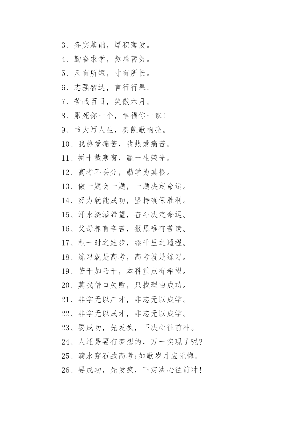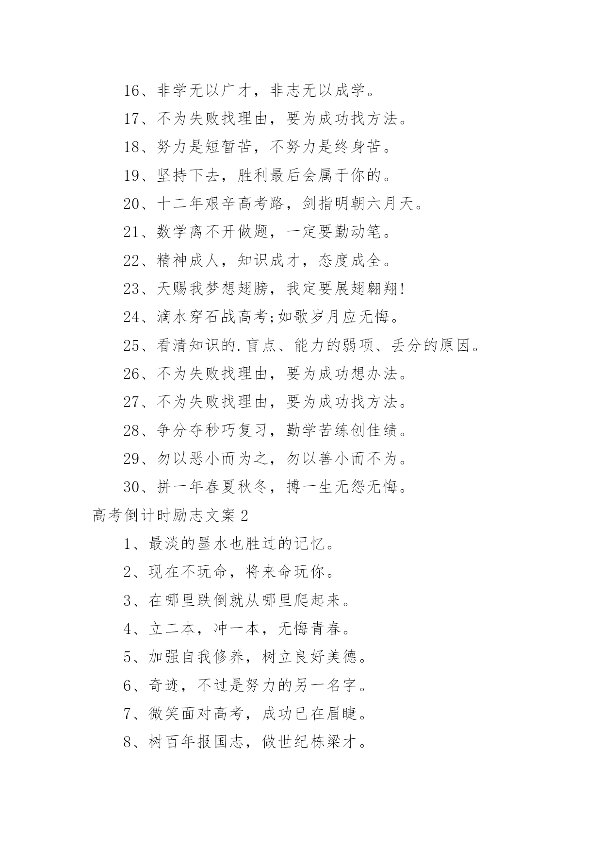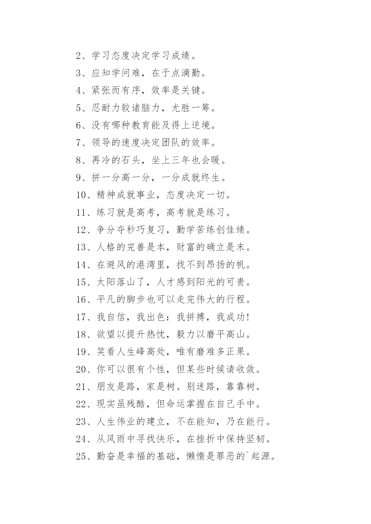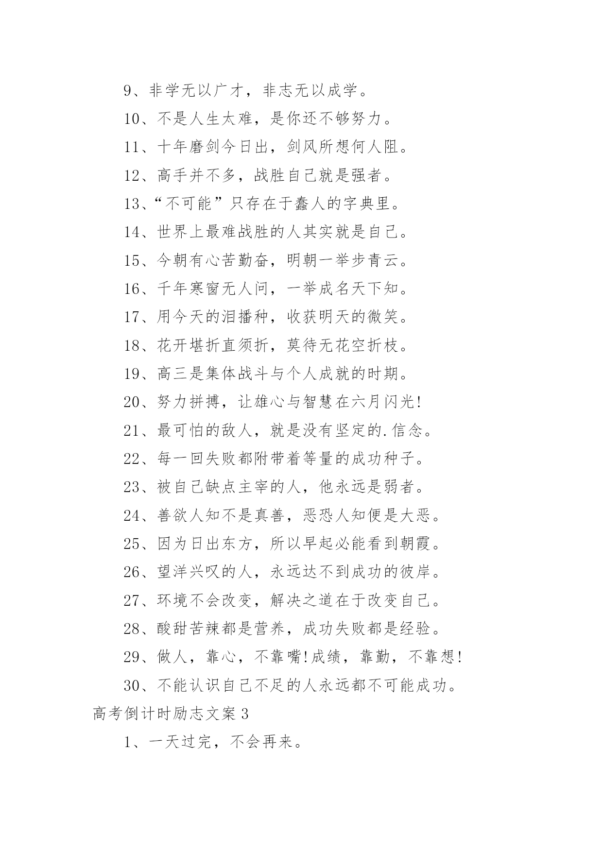 高考倒计时励志文案高考倒计时励志文案10篇在现实生活或工作学习中,大家都有令自己印象深刻的文案吧,文案用以记录学习、生活中有意义,特别是有纪念意义的事情。那什么样的文案才是新颖独特的呢?以下是小编精心整理的高考倒计时励志文案,希望对大家有所帮助。高考倒计时励志文案11、博学而笃志,切问而近。2、临阵磨枪,不如扬长避短。3、书大写人生,奏凯歌响亮。4、墨犁耕心田,笔斧拓神境。5、我热爱痛苦,我热爱痛苦。6、读书破万卷,下笔如有神。7、未遭拒绝的成功决不会长久。8、此刻的你比你的梦想更闪耀。9、无才无以立足,不苦不能成才!10、Successwithoutrejectionwillneverlast.11、名列前茅是银,日新月异是金。12、悲观些看成功,乐观些看失败。13、练习就是高考,高考就是练习。14、莫找借口失败,只找理由成功。15、闭上眼睛就睡,睁开眼睛就学。16、非学无以广才,非志无以成学。17、不为失败找理由,要为成功找方法。18、努力是短暂苦,不努力是终身苦。19、坚持下去,胜利最后会属于你的。20、十二年艰辛高考路,剑指明朝六月天。21、数学离不开做题,一定要勤动笔。22、精神成人,知识成才,态度成全。23、天赐我梦想翅膀,我定要展翅翱翔!24、滴水穿石战高考;如歌岁月应无悔。25、看清知识的.盲点、能力的弱项、丢分的原因。26、不为失败找理由,要为成功想办法。27、不为失败找理由,要为成功找方法。28、争分夺秒巧复习,勤学苦练创佳绩。29、勿以恶小而为之,勿以善小而不为。30、拼一年春夏秋冬,搏一生无怨无悔。高考倒计时励志文案21、最淡的墨水也胜过的记忆。2、现在不玩命,将来命玩你。3、在哪里跌倒就从哪里爬起来。4、立二本,冲一本,无悔青春。5、加强自我修养,树立良好美德。6、奇迹,不过是努力的另一名字。7、微笑面对高考,成功已在眉睫。8、树百年报国志,做世纪栋梁才。9、非学无以广才,非志无以成学。10、不是人生太难,是你还不够努力。11、十年磨剑今日出,剑风所想何人阻。12、高手并不多,战胜自己就是强者。13、“不可能”只存在于蠢人的字典里。14、世界上最难战胜的人其实就是自己。15、今朝有心苦勤奋,明朝一举步青云。16、千年寒窗无人问,一举成名天下知。17、用今天的泪播种,收获明天的微笑。18、花开堪折直须折,莫待无花空折枝。19、高三是集体战斗与个人成就的时期。20、努力拼搏,让雄心与智慧在六月闪光!21、最可怕的敌人,就是没有坚定的.信念。22、每一回失败都附带着等量的成功种子。23、被自己缺点主宰的人,他永远是弱者。24、善欲人知不是真善,恶恐人知便是大恶。25、因为日出东方,所以早起必能看到朝霞。26、望洋兴叹的人,永远达不到成功的彼岸。27、环境不会改变,解决之道在于改变自己。28、酸甜苦辣都是营养,成功失败都是经验。29、做人,靠心,不靠嘴!成绩,靠勤,不靠想!30、不能认识自己不足的人永远都不可能成功。高考倒计时励志文案31、一天过完,不会再来。2、学习态度决定学习成绩。3、应知学问难,在于点滴勤。4、紧张而有序,效率是关键。5、忍耐力较诸脑力,尤胜一筹。6、没有哪种教育能及得上逆境。7、领导的速度决定团队的效率。8、再冷的石头,坐上三年也会暖。9、拼一分高一分,一分成就终生。10、精神成就事业,态度决定一切。11、练习就是高考,高考就是练习。12、争分夺秒巧复习,勤学苦练创佳绩。13、人格的完善是本,财富的确立是末。14、在避风的港湾里,找不到昂扬的帆。15、太阳落山了,人才感到阳光的可贵。16、平凡的脚步也可以走完伟大的行程。17、我自信,我出色:我拼搏,我成功!18、欲望以提升热忱,毅力以磨平高山。19、笑看人生峰高处,唯有磨难多正果。20、你可以很有个性,但某些时候请收敛。21、朋友是路,家是树。别迷路,靠靠树。22、现实虽残酷,但命运掌握在自己手中。23、人生伟业的建立,不在能知,乃在能行。24、从风雨中寻找快乐,在挫折中保持坚韧。25、勤奋是幸福的基础,懒惰是罪恶的`起源。26、拥有知识改变命运,拥有理想改变态度。27、望洋兴叹的人,永远达不到成功的彼岸。28、没有天生的信心,只有不断培养的信心。29、灰心生失望,失望生动摇,动摇生失败。30、站在新起点,迎接新挑战,创造新成绩。31、自己打败自己的远远多于比别人打败的。32、在考场上没有弱者的眼泪只有强者的天下。33、快乐不是因为得到的多而是因为计较的少!34、旁观者的姓名永远爬不到比赛的计分板上。35、胜利不会向我们走来,我们必须走向胜利。36、世上没有绝望的处境,只有对处境绝望的人。37、人的大脑和肢体一样,多用则灵,不用则废。38、决战高考,改变命运。屡挫屡战,笑傲群雄。39、学习之道,难在坚持,贵在坚持,成在坚持。40、