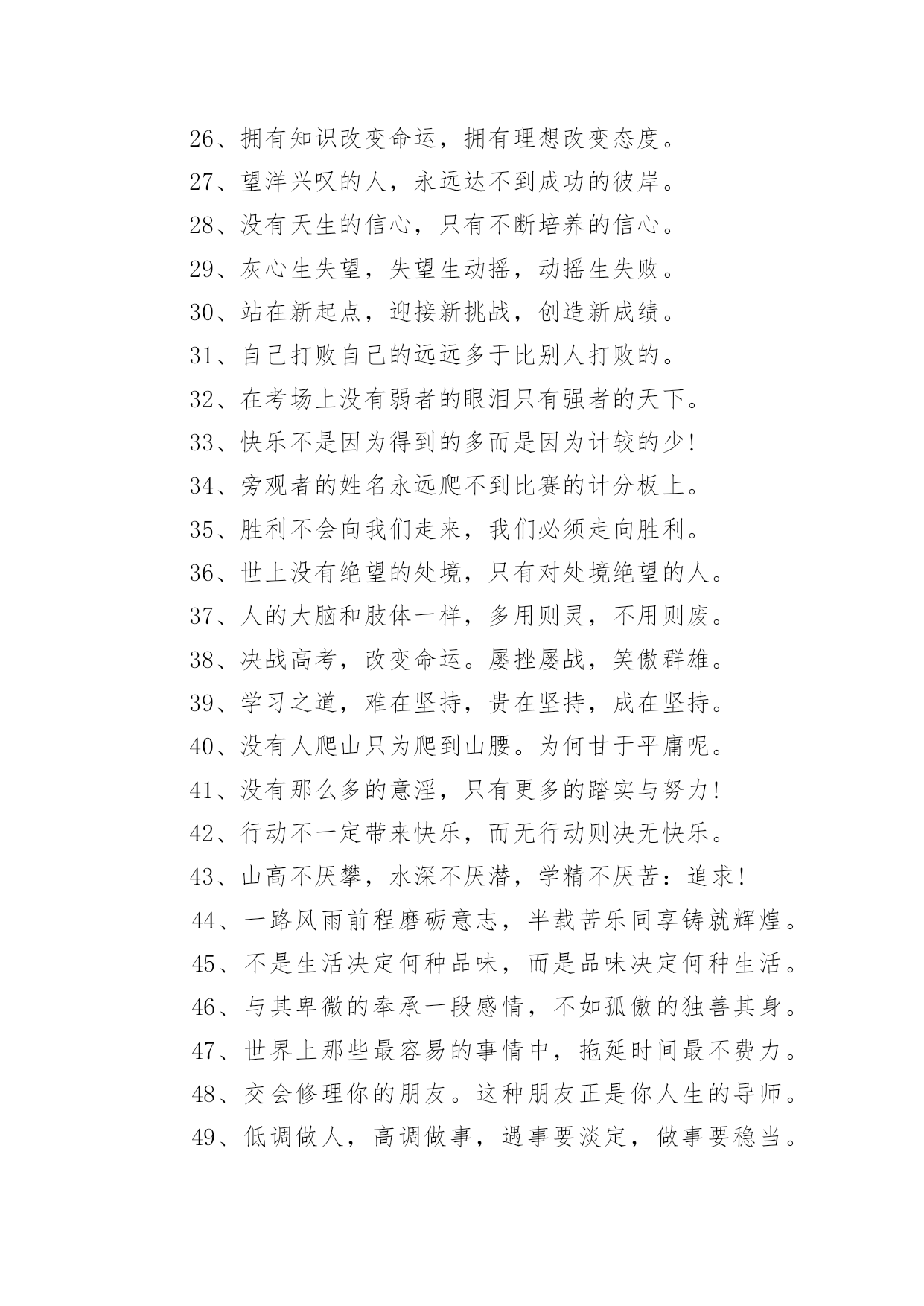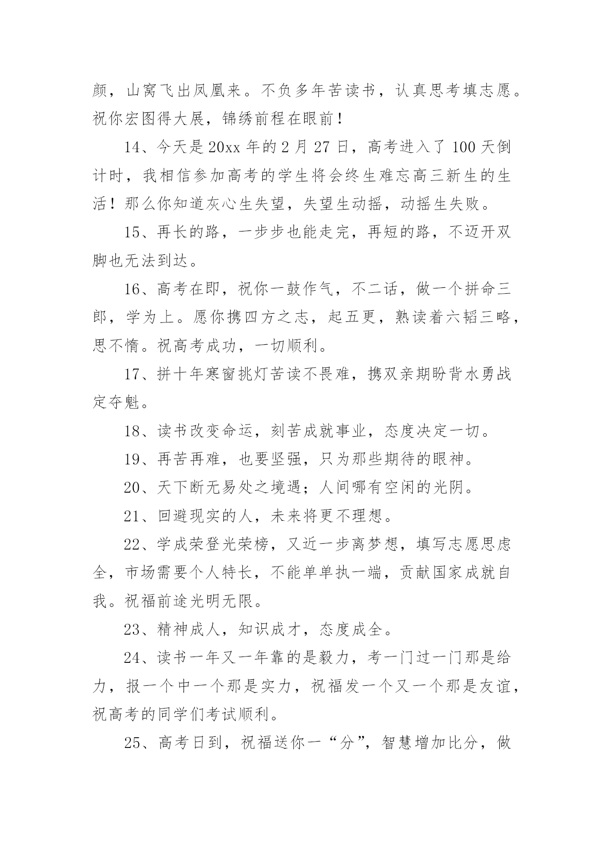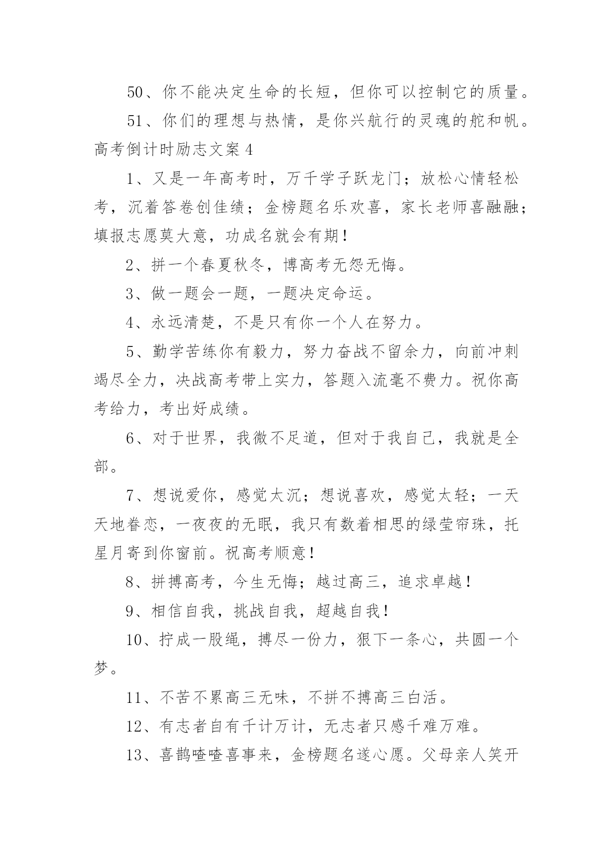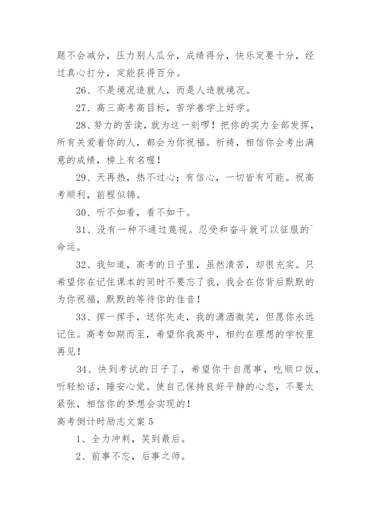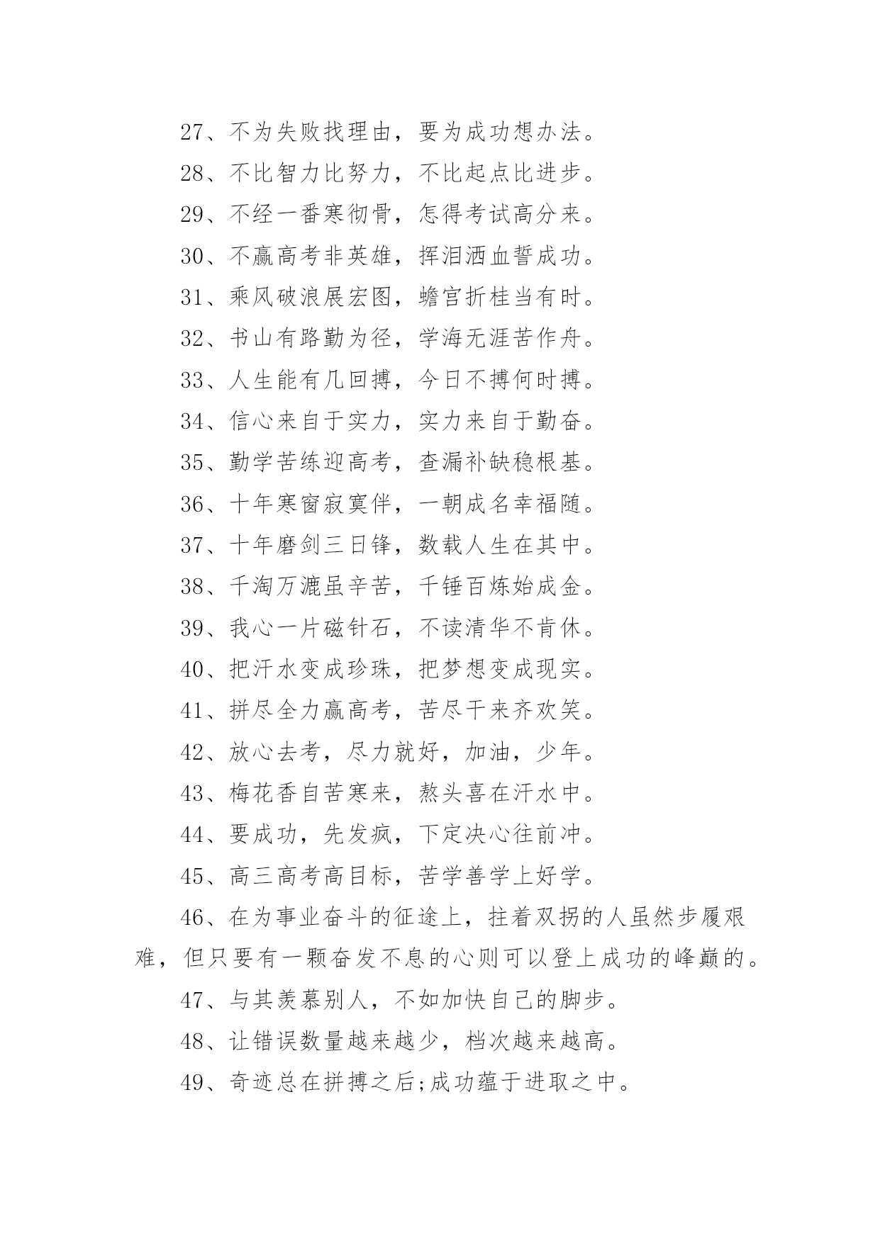 高考倒计时励志文案高考倒计时励志文案10篇在现实生活或工作学习中,大家都有令自己印象深刻的文案吧,文案用以记录学习、生活中有意义,特别是有纪念意义的事情。那什么样的文案才是新颖独特的呢?以下是小编精心整理的高考倒计时励志文案,希望对大家有所帮助。高考倒计时励志文案11、博学而笃志,切问而近。2、临阵磨枪,不如扬长避短。3、书大写人生,奏凯歌响亮。4、墨犁耕心田,笔斧拓神境。5、我热爱痛苦,我热爱痛苦。6、读书破万卷,下笔如有神。7、未遭拒绝的成功决不会长久。8、此刻的你比你的梦想更闪耀。9、无才无以立足,不苦不能成才!10、Successwithoutrejectionwillneverlast.11、名列前茅是银,日新月异是金。12、悲观些看成功,乐观些看失败。13、练习就是高考,高考就是练习。14、莫找借口失败,只找理由成功。15、闭上眼睛就睡,睁开眼睛就学。16、非学无以广才,非志无以成学。17、不为失败找理由,要为成功找方法。18、努力是短暂苦,不努力是终身苦。19、坚持下去,胜利最后会属于你的。20、十二年艰辛高考路,剑指明朝六月天。21、数学离不开做题,一定要勤动笔。22、精神成人,知识成才,态度成全。23、天赐我梦想翅膀,我定要展翅翱翔!24、滴水穿石战高考;如歌岁月应无悔。25、看清知识的.盲点、能力的弱项、丢分的原因。26、不为失败找理由,要为成功想办法。27、不为失败找理由,要为成功找方法。28、争分夺秒巧复习,勤学苦练创佳绩。29、勿以恶小而为之,勿以善小而不为。30、拼一年春夏秋冬,搏一生无怨无悔。高考倒计时励志文案21、最淡的墨水也胜过的记忆。2、现在不玩命,将来命玩你。3、在哪里跌倒就从哪里爬起来。4、立二本,冲一本,无悔青春。5、加强自我修养,树立良好美德。6、奇迹,不过是努力的另一名字。7、微笑面对高考,成功已在眉睫。8、树百年报国志,做世纪栋梁才。9、非学无以广才,非志无以成学。10、不是人生太难,是你还不够努力。11、十年磨剑今日出,剑风所想何人阻。12、高手并不多,战胜自己就是强者。13、“不可能”只存在于蠢人的字典里。14、世界上最难战胜的人其实就是自己。15、今朝有心苦勤奋,明朝一举步青云。16、千年寒窗无人问,一举成名天下知。17、用今天的泪播种,收获明天的微笑。18、花开堪折直须折,莫待无花空折枝。19、高三是集体战斗与个人成就的时期。20、努力拼搏,让雄心与智慧在六月闪光!21、最可怕的敌人,就是没有坚定的.信念。22、每一回失败都附带着等量的成功种子。23、被自己缺点主宰的人,他永远是弱者。24、善欲人知不是真善,恶恐人知便是大恶。25、因为日出东方,所以早起必能看到朝霞。26、望洋兴叹的人,永远达不到成功的彼岸。27、环境不会改变,解决之道在于改变自己。28、酸甜苦辣都是营养,成功失败都是经验。29、做人,靠心,不靠嘴!成绩,靠勤,不靠想!30、不能认识自己不足的人永远都不可能成功。高考倒计时励志文案31、一天过完,不会再来。2、学习态度决定学习成绩。3、应知学问难,在于点滴勤。4、紧张而有序,效率是关键。5、忍耐力较诸脑力,尤胜一筹。6、没有哪种教育能及得上逆境。7、领导的速度决定团队的效率。8、再冷的石头,坐上三年也会暖。9、拼一分高一分,一分成就终生。10、精神成就事业,态度决定一切。11、练习就是高考,高考就是练习。12、争分夺秒巧复习,勤学苦练创佳绩。13、人格的完善是本,财富的确立是末。14、在避风的港湾里,找不到昂扬的帆。15、太阳落山了,人才感到阳光的可贵。16、平凡的脚步也可以走完伟大的行程。17、我自信,我出色:我拼搏,我成功!18、欲望以提升热忱,毅力以磨平高山。19、笑看人生峰高处,唯有磨难多正果。20、你可以很有个性,但某些时候请收敛。21、朋友是路,家是树。别迷路,靠靠树。22、现实虽残酷,但命运掌握在自己手中。23、人生伟业的建立,不在能知,乃在能行。24、从风雨中寻找快乐,在挫折中保持坚韧。25、勤奋是幸福的基础,懒惰是罪恶的`起源。26、拥有知识改变命运,拥有理想改变态度。27、望洋兴叹的人,永远达不到成功的彼岸。28、没有天生的信心,只有不断培养的信心。29、灰心生失望,失望生动摇,动摇生失败。30、站在新起点,迎接新挑战,创造新成绩。31、自己打败自己的远远多于比别人打败的。32、在考场上没有弱者的眼泪只有强者的天下。33、快乐不是因为得到的多而是因为计较的少!34、旁观者的姓名永远爬不到比赛的计分板上。35、胜利不会向我们走来,我们必须走向胜利。36、世上没有绝望的处境,只有对处境绝望的人。37、人的大脑和肢体一样,多用则灵,不用则废。38、决战高考,改变命运。屡挫屡战,笑傲群雄。39、学习之道,难在坚持,贵在坚持,成在坚持。40、