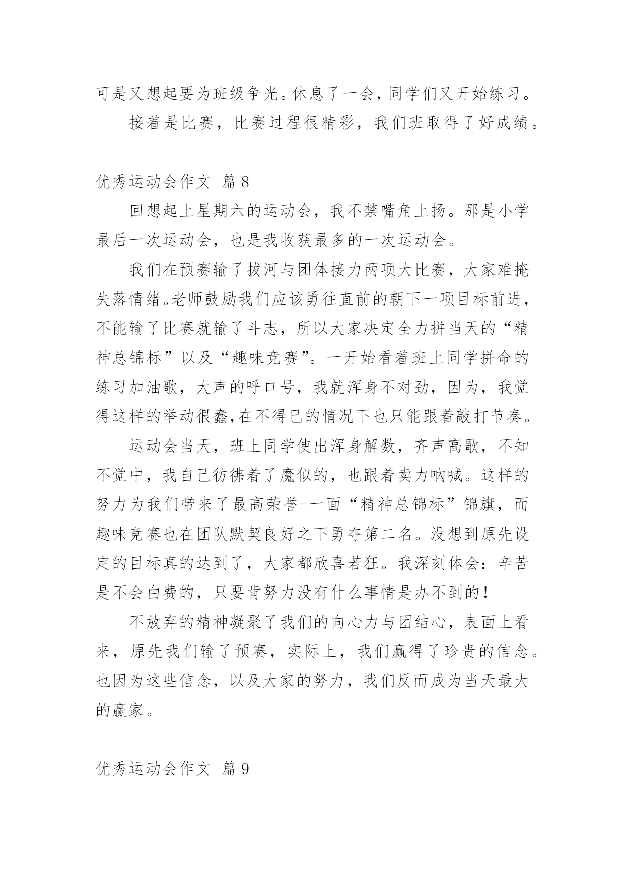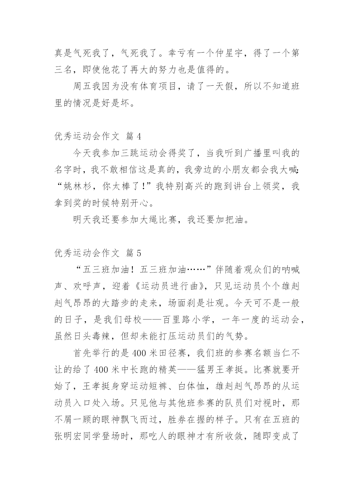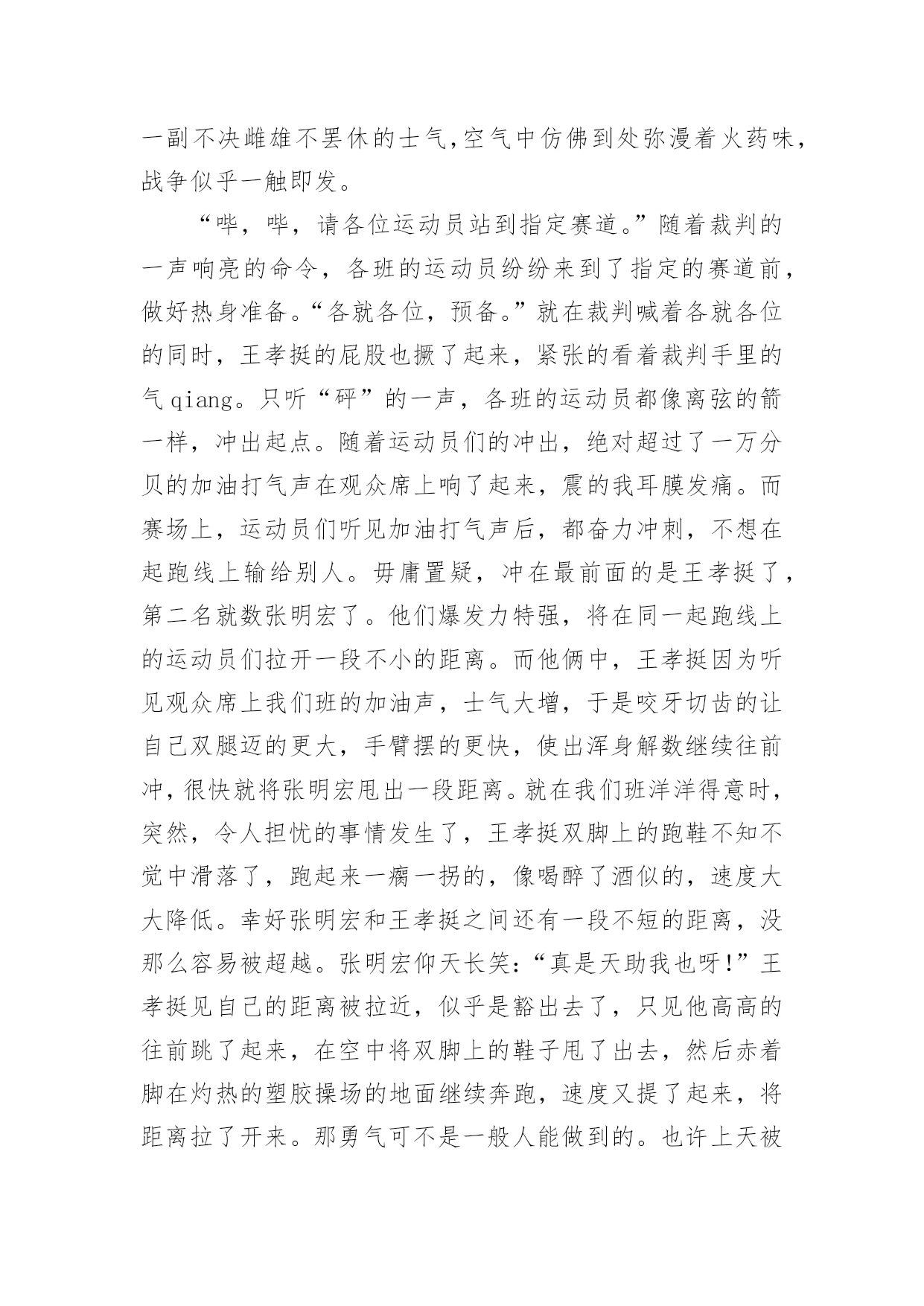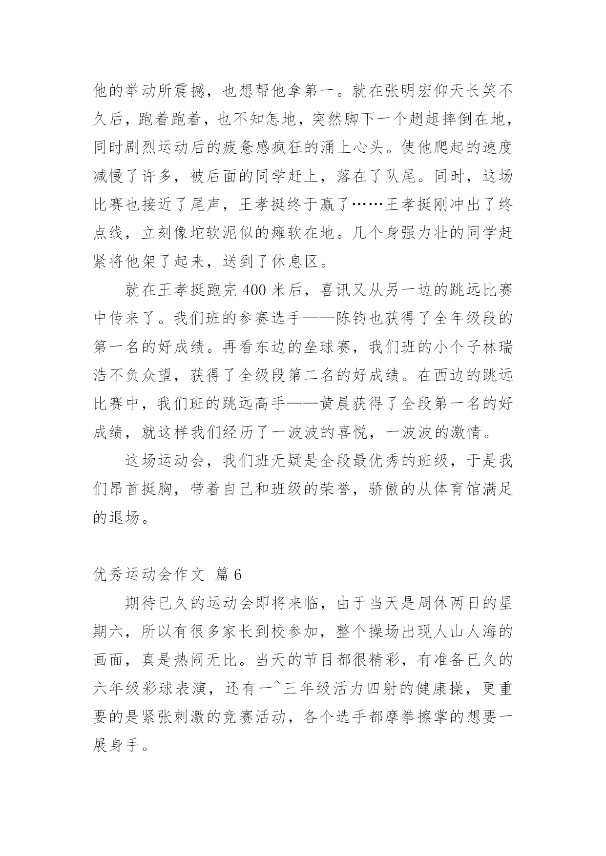 优秀运动会作文【必备】优秀运动会作文合集九篇在平凡的学习、工作、生活中,大家对作文都不陌生吧,借助作文人们可以实现文化交流的目的。一篇什么样的作文才能称之为优秀作文呢?下面是小编整理的优秀运动会作文9篇,仅供参考,欢迎大家阅读。优秀运动会作文篇1明天我们要参加三跳运动会比赛了,我好期待这一天呀!我们三跳运动会比赛有个人项目也有跳绳,有跳大绳、前挽花、技术跳和一带一。我是摇大绳的,我要让那些跳大绳的同学跳好,我们一年级四班一定会得第一的!所以我一定要摇好大绳。优秀运动会作文篇2快要运动会了!我的心七上八下,兴奋得跳呀跳,因为我最喜欢运动会了!运动会当天人山人海,节目紧锣密鼓的进行。终于等到我期待的赛跑了,选手们个个雄纠纠、气昂昂,在起跑线上准备一马当先;“啊”一声,选手们飞快的冲出去,场外喊加油的人都快喊破天了。太好了,我得到第二名,我开开心心的准备欣赏五年级的拔河。五年级的拔河终于开始了!选手们摩拳擦掌,“啊ˋ”一声,“一!二!杀!“一!二!杀!……”选手们都使出全身的吃奶力气,双方都不是省油的灯,不管对方怎么拉,大家都稳若泰山,一动也不动;但“路遥知马力”,终于有一方精疲力尽,被对方一拉,摔得人仰马翻、兵败如山倒。输的队伍个个垂头丧气的走了,赢的队伍还在原地,个个欣喜若狂,欢欣鼓舞的跳了起来!下午节目的重头戏是老师与家长的接力比赛。“啊”一声,老师和家长快速的冲了出去,时间一分一秒的过去,老师队胜利,家长们只好以沉重的脚步下了场。经过这一次运动会,想想在运动会上,我跑得气喘如牛、上气不接下气,好累!好累!不过,这次的运动会真好玩!优秀运动会作文篇3周五到周三之间,我们来运动会了。周三我们进行了运动会开幕式,运动会主要的是跑步,有一百米、二百米、四百米和八百米,还有六十米的迎面接力。还有其他的项目,比如:立定跳远、投垒球、等等。我们周三的开幕式非常精彩,我们发射了火箭,有表演了航模。之后我们就开始了比赛。六十米迎面接力是第一个比赛项目,下来是二百亩,每一个跑完的人都出汗了。周四,我们先进行了四百米,每一个跑完的人都汗流浃背。之后我们进行了最精彩的八百米长跑。霍溪跑得还不错,是中等水平。但是程睿申真实丢脸的,跑了一个倒数第一,真是气死我了,气死我了。幸亏有一个仲星宇,得了一个第三名,即使他花了再大的努力也是值得的。周五我因为没有体育项目,请了一天假,所以不知道班里的情况是好是坏。优秀运动会作文篇4今天我参加三跳运动会得奖了,当我听到广播里叫我的名字时,我不敢相信这是真的,我旁边的小朋友都会我大喊:“姚林杉,你太棒了!”我特别高兴的跑到讲台上领奖,我拿到奖的时候特别开心。明天我还要参加大绳比赛,我还要加把油。优秀运动会作文篇5“五三班加油!五三班加油……”伴随着观众们的呐喊声、欢呼声,迎着《运动员进行曲》,只见运动员个个雄赳赳气昂昂的大踏步的走来,场面刹是壮观。今天可不是一般的日子,是我们母校——百里路小学,一年一度的运动会,虽然日头毒辣,但却未能打压运动员们的气势。首先举行的是400米田径赛,我们班的参赛名额当仁不让的给了400米中长跑的精英——猛男王孝挺。比赛就要开始了,王孝挺身穿运动短裤、白体恤,雄赳赳气昂昂的从运动员入口处入场。只见他与其他班参赛的队员们对视时,那不屑一顾的眼神飘飞而过,胜券在握的样子。只有在五班的张明宏同学登场时,那吃人的眼神才有所收敛,随即变成了一副不决雌雄不罢休的士气,空气中仿佛到处弥漫着火药味,战争似乎一触即发。“哔,哔,请各位运动员站到指定赛道。”随着裁判的一声响亮的命令,各班的运动员纷纷来到了指定的赛道前,做好热身准备。“各就各位,预备。”就在裁判喊着各就各位的同时,王孝挺的屁股也撅了起来,紧张的看着裁判手里的气qiang。只听“砰”的一声,各班的运动员都像离弦的箭一样,冲出起点。随着运动员们的冲出,绝对超过了一万分贝的加油打气声在观众席上响了起来,震的我耳膜发痛。而赛场上,运动员们听见加油打气声后,都奋力冲刺,不想在起跑线上输给别人。毋庸置疑,冲在最前面的是王孝挺了,第二名就数张明宏了。他们爆发力特强,将在同一起跑线上的运动员们拉开一段不小的距离。而他俩中,王孝挺因为听见观众席上我们班的加油声,士气大增,于是咬牙切齿的让自己双腿迈的更大,手臂摆的更快,使出浑身解数继续往前冲,很快就将张明宏甩出一段距离。就在我们班洋洋得意时,突然,令人担忧的事情发生了,王孝挺双脚上的跑鞋不知不觉中滑落了,跑起来一瘸一拐的,像喝醉了酒似的,速度大大降低。幸好张明宏和王孝挺之间还有一段不短的距离,没那么容易被超越。张明宏仰天长笑:“真是天助我也呀!”王孝挺见自己的距离被拉近,似乎是豁出去了,只见他高高的往前跳了起来,在空中将双脚上的鞋子甩了出去,然后赤着脚在灼热的塑胶操场的地面继续奔跑,速度又提了起来,将距离拉