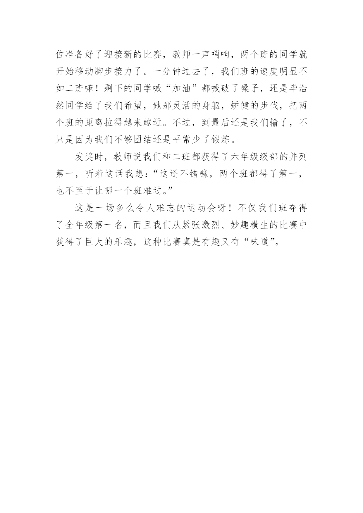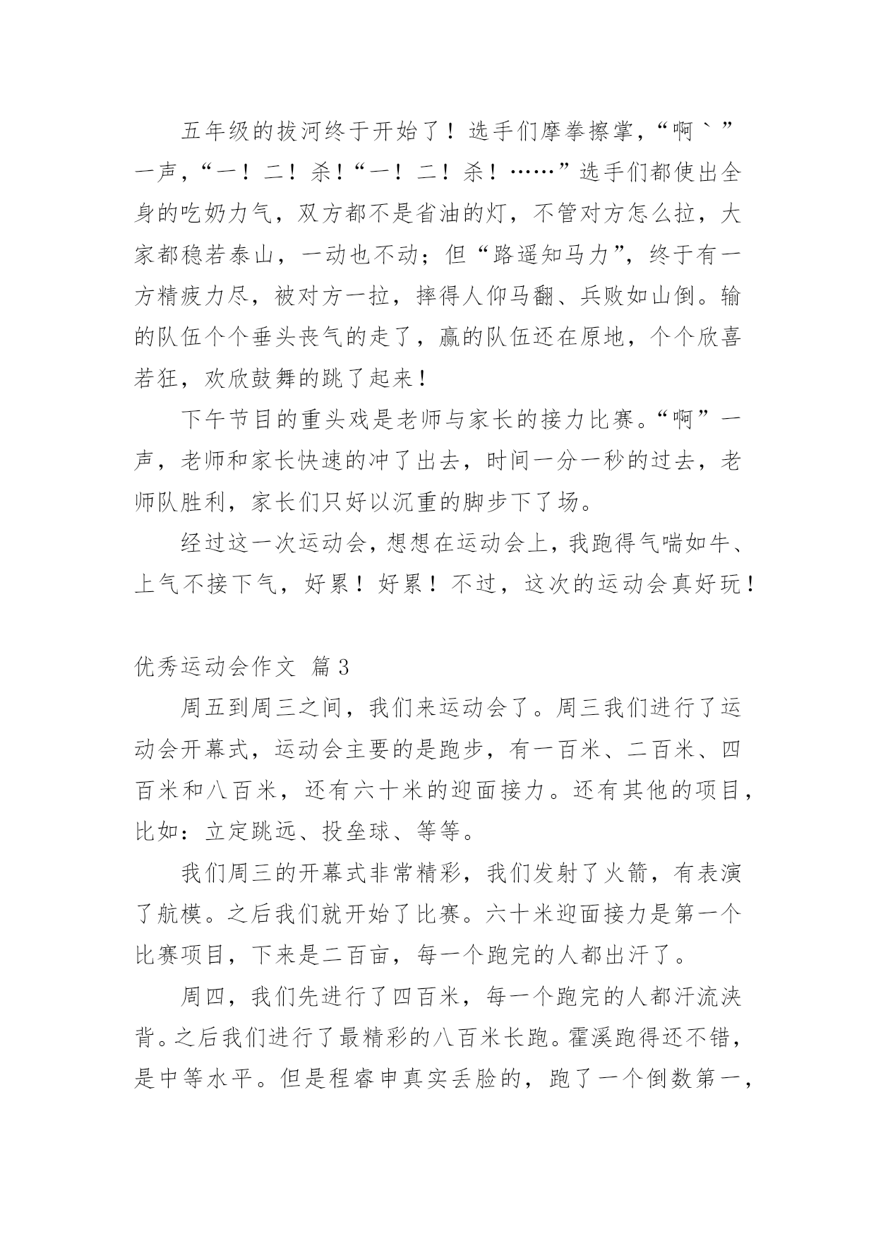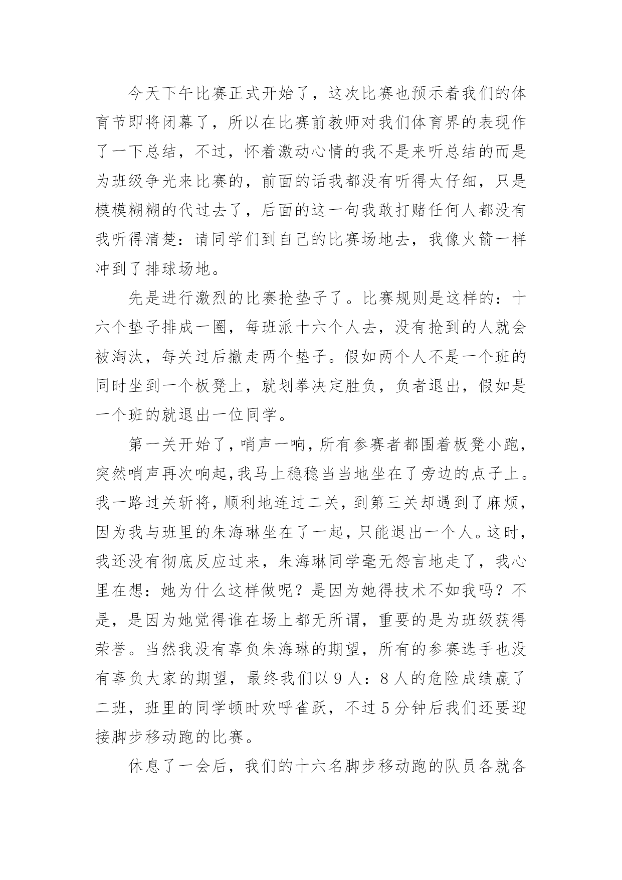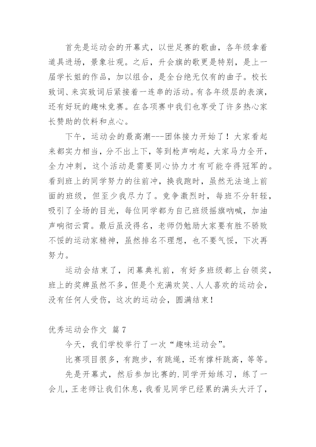 优秀运动会作文【必备】优秀运动会作文合集九篇在平凡的学习、工作、生活中,大家对作文都不陌生吧,借助作文人们可以实现文化交流的目的。一篇什么样的作文才能称之为优秀作文呢?下面是小编整理的优秀运动会作文9篇,仅供参考,欢迎大家阅读。优秀运动会作文篇1明天我们要参加三跳运动会比赛了,我好期待这一天呀!我们三跳运动会比赛有个人项目也有跳绳,有跳大绳、前挽花、技术跳和一带一。我是摇大绳的,我要让那些跳大绳的同学跳好,我们一年级四班一定会得第一的!所以我一定要摇好大绳。优秀运动会作文篇2快要运动会了!我的心七上八下,兴奋得跳呀跳,因为我最喜欢运动会了!运动会当天人山人海,节目紧锣密鼓的进行。终于等到我期待的赛跑了,选手们个个雄纠纠、气昂昂,在起跑线上准备一马当先;“啊”一声,选手们飞快的冲出去,场外喊加油的人都快喊破天了。太好了,我得到第二名,我开开心心的准备欣赏五年级的拔河。五年级的拔河终于开始了!选手们摩拳擦掌,“啊ˋ”一声,“一!二!杀!“一!二!杀!……”选手们都使出全身的吃奶力气,双方都不是省油的灯,不管对方怎么拉,大家都稳若泰山,一动也不动;但“路遥知马力”,终于有一方精疲力尽,被对方一拉,摔得人仰马翻、兵败如山倒。输的队伍个个垂头丧气的走了,赢的队伍还在原地,个个欣喜若狂,欢欣鼓舞的跳了起来!下午节目的重头戏是老师与家长的接力比赛。“啊”一声,老师和家长快速的冲了出去,时间一分一秒的过去,老师队胜利,家长们只好以沉重的脚步下了场。经过这一次运动会,想想在运动会上,我跑得气喘如牛、上气不接下气,好累!好累!不过,这次的运动会真好玩!优秀运动会作文篇3周五到周三之间,我们来运动会了。周三我们进行了运动会开幕式,运动会主要的是跑步,有一百米、二百米、四百米和八百米,还有六十米的迎面接力。还有其他的项目,比如:立定跳远、投垒球、等等。我们周三的开幕式非常精彩,我们发射了火箭,有表演了航模。之后我们就开始了比赛。六十米迎面接力是第一个比赛项目,下来是二百亩,每一个跑完的人都出汗了。周四,我们先进行了四百米,每一个跑完的人都汗流浃背。之后我们进行了最精彩的八百米长跑。霍溪跑得还不错,是中等水平。但是程睿申真实丢脸的,跑了一个倒数第一,真是气死我了,气死我了。幸亏有一个仲星宇,得了一个第三名,即使他花了再大的努力也是值得的。周五我因为没有体育项目,请了一天假,所以不知道班里的情况是好是坏。优秀运动会作文篇4今天我参加三跳运动会得奖了,当我听到广播里叫我的名字时,我不敢相信这是真的,我旁边的小朋友都会我大喊:“姚林杉,你太棒了!”我特别高兴的跑到讲台上领奖,我拿到奖的时候特别开心。明天我还要参加大绳比赛,我还要加把油。优秀运动会作文篇5“五三班加油!五三班加油……”伴随着观众们的呐喊声、欢呼声,迎着《运动员进行曲》,只见运动员个个雄赳赳气昂昂的大踏步的走来,场面刹是壮观。今天可不是一般的日子,是我们母校——百里路小学,一年一度的运动会,虽然日头毒辣,但却未能打压运动员们的气势。首先举行的是400米田径赛,我们班的参赛名额当仁不让的给了400米中长跑的精英——猛男王孝挺。比赛就要开始了,王孝挺身穿运动短裤、白体恤,雄赳赳气昂昂的从运动员入口处入场。只见他与其他班参赛的队员们对视时,那不屑一顾的眼神飘飞而过,胜券在握的样子。只有在五班的张明宏同学登场时,那吃人的眼神才有所收敛,随即变成了一副不决雌雄不罢休的士气,空气中仿佛到处弥漫着火药味,战争似乎一触即发。“哔,哔,请各位运动员站到指定赛道。”随着裁判的一声响亮的命令,各班的运动员纷纷来到了指定的赛道前,做好热身准备。“各就各位,预备。”就在裁判喊着各就各位的同时,王孝挺的屁股也撅了起来,紧张的看着裁判手里的气qiang。只听“砰”的一声,各班的运动员都像离弦的箭一样,冲出起点。随着运动员们的冲出,绝对超过了一万分贝的加油打气声在观众席上响了起来,震的我耳膜发痛。而赛场上,运动员们听见加油打气声后,都奋力冲刺,不想在起跑线上输给别人。毋庸置疑,冲在最前面的是王孝挺了,第二名就数张明宏了。他们爆发力特强,将在同一起跑线上的运动员们拉开一段不小的距离。而他俩中,王孝挺因为听见观众席上我们班的加油声,士气大增,于是咬牙切齿的让自己双腿迈的更大,手臂摆的更快,使出浑身解数继续往前冲,很快就将张明宏甩出一段距离。就在我们班洋洋得意时,突然,令人担忧的事情发生了,王孝挺双脚上的跑鞋不知不觉中滑落了,跑起来一瘸一拐的,像喝醉了酒似的,速度大大降低。幸好张明宏和王孝挺之间还有一段不短的距离,没那么容易被超越。张明宏仰天长笑:“真是天助我也呀!”王孝挺见自己的距离被拉近,似乎是豁出去了,只见他高高的往前跳了起来,在空中将双脚上的鞋子甩了出去,然后赤着脚在灼热的塑胶操场的地面继续奔跑,速度又提了起来,将距离拉