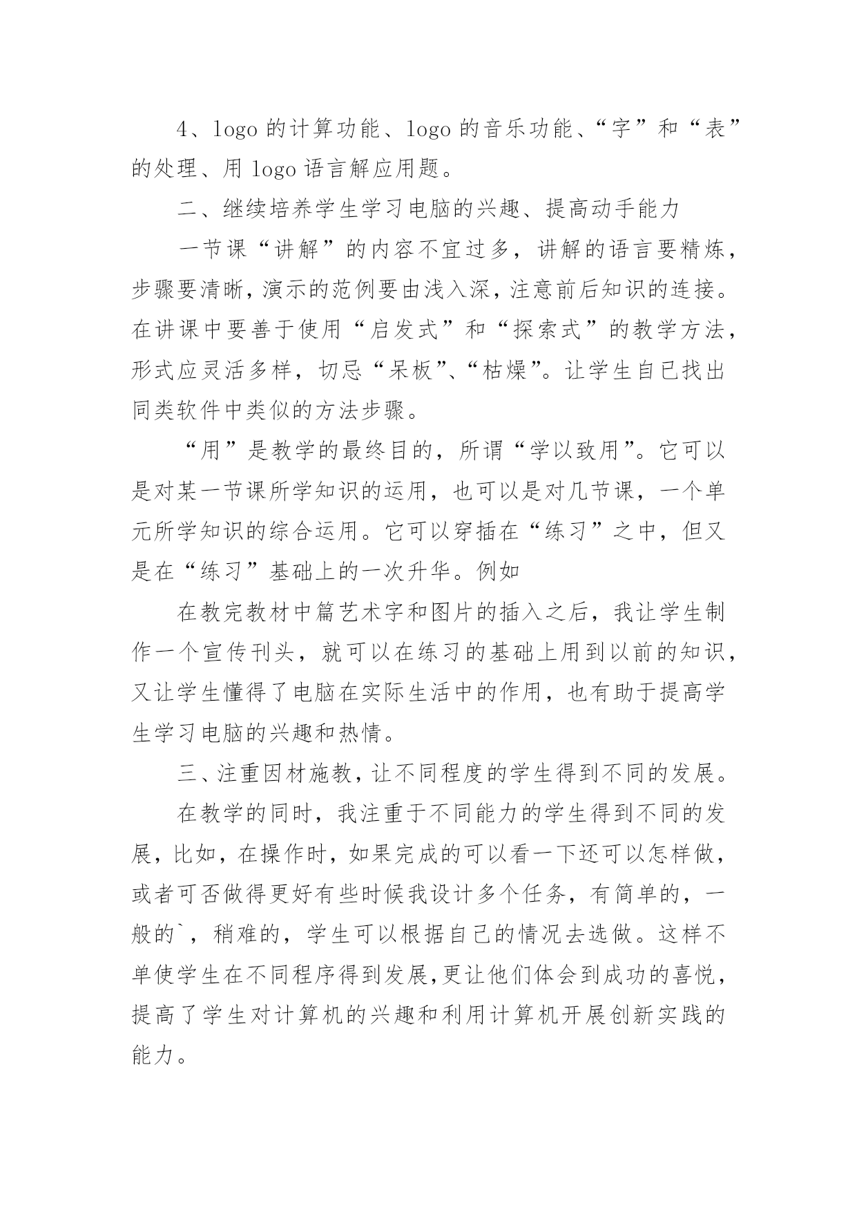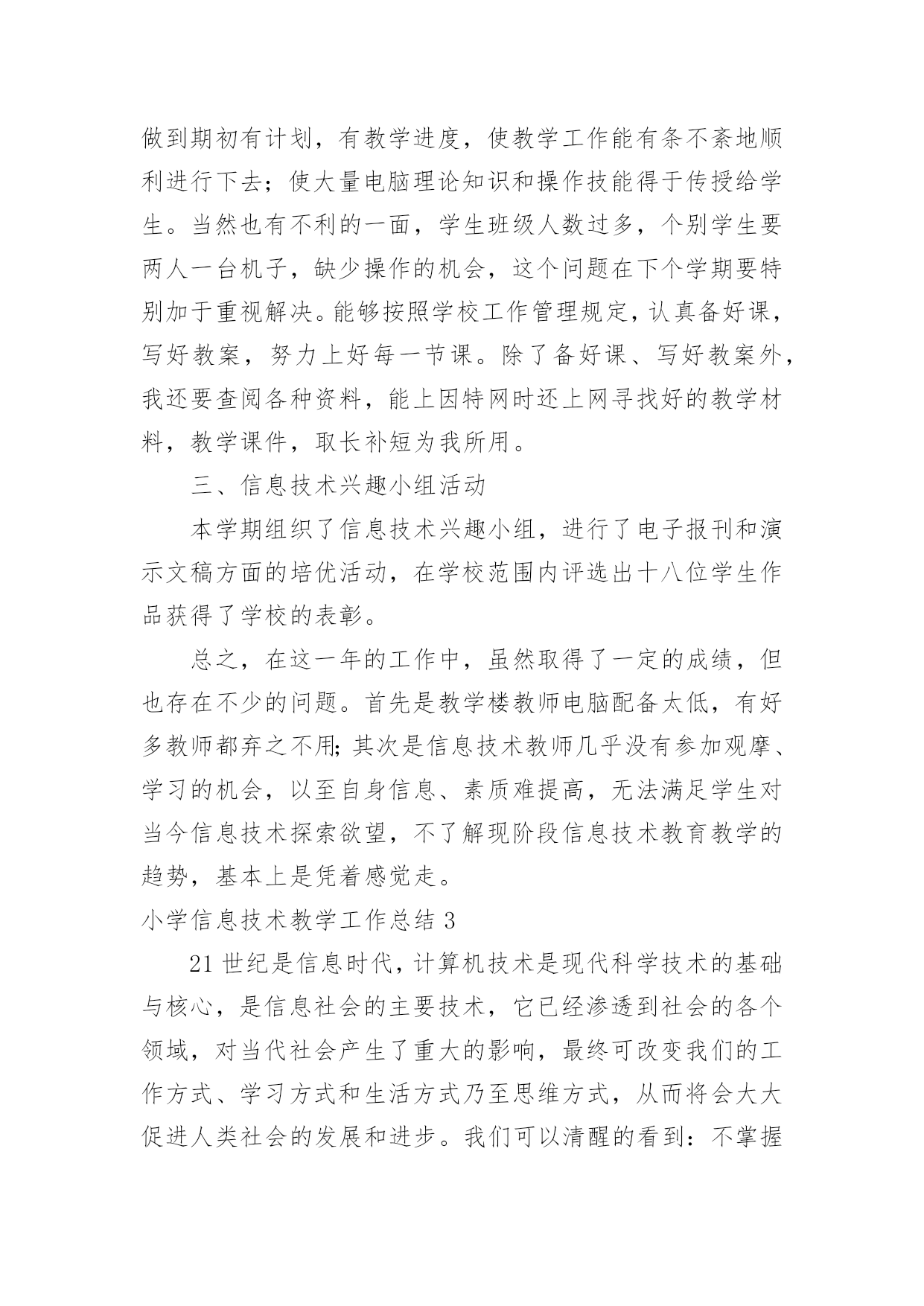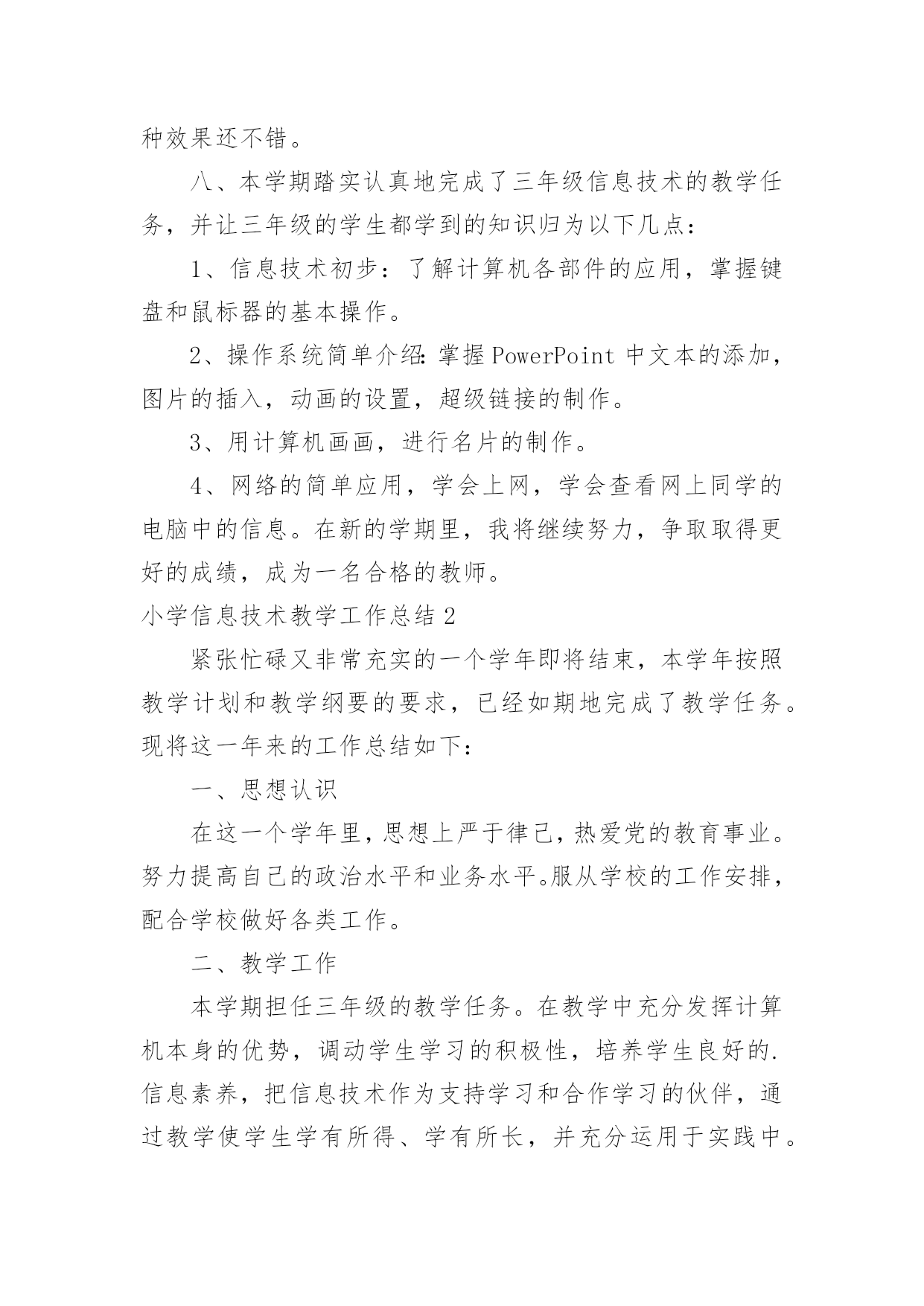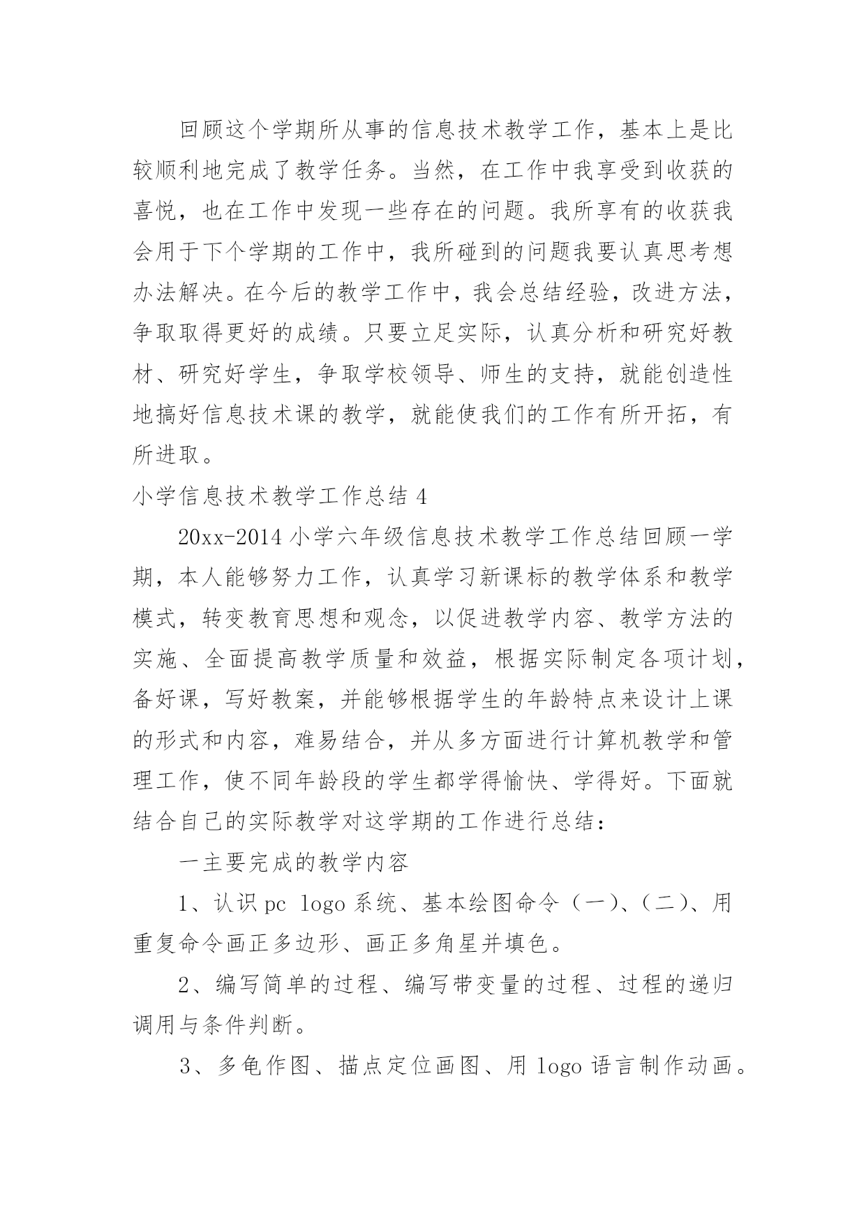 小学信息技术教学工作总结小学信息技术教学工作总结总结是指社会团体、企业单位和个人对某一阶段的学习、工作或其完成情况加以回顾和分析,得出教训和一些规律性认识的一种书面材料,它可以有效锻炼我们的语言组织能力,为此要我们写一份总结。那么你知道总结如何写吗?以下是小编整理的小学信息技术教学工作总结,仅供参考,大家一起来看看吧。小学信息技术教学工作总结1时间过的飞快,转眼间一个学期过去了,回顾这个学期所从事的信息技术教学工作,基本上是比较顺利地完成任务。我从各方面严格要求自己,积极向老教师请教,结合本校的实际条件和学生的实际情况,勤勤恳恳,兢兢业业,使教学工作有计划,有组织,有步骤地开展。立足现在,放眼未来,为使今后的工作取得更大的进步,现对本学期教学工作作出总结,希望能发扬优点,克服不足,总结检验教训,继往开来,以促进教训工作更上一层楼。一、认真备课,不但备学生而且备教材备教法,根据教材内容及学生的实际,设计课的类型,拟定采用的教学方法,并对教学过程的程序及时间安排都作了详细的记录,认真写好教案。每一课都做到“有备而来”,每堂课都在课前做好充分的准备,我还要查阅各种资料,能上因特网时还上网寻找好的教学材料,教学课件,把它们和我所从事的工作结合起来,为我所用。二、增强上课技能,提高教学质量,使讲解清晰化,条理化,准确化,条理化,准确化,情感化,生动化,做到线索清晰,层次分明,言简意赅,深入浅出。在课堂上特别注意调动学生的积极性,加强师生交流,充分体现学生的主作用,让学生学得容易,学得轻松,学得愉快;注意精讲精练,在课堂上老师讲得尽量少,学生动口动手动脑尽量多;同时在每一堂课上都充分考虑每一个层次的学生学习需求和学习能力,让各个层次的'学生都得到提高。三、虚心请教其他老师。在教学上,有疑必问。在各个章节的学习上都积极征求其他老师的意见,学习他们的方法,同时,多听老师的课,做到边听边讲,学习别人的优点,克服自己的不足,并常常邀请其他老师来听课,征求他们的意见,改进工作。四、当堂点评学生作业:根据我们学部的打造博文课堂新模式的要求,对于每节课,要坚决实行堂堂清,对于电脑课这样注重实际操作的课程就具有更重要的意义,所以我一直坚决执行着,而且当堂对每个完成作业的同学随堂点评,使学生能更好的学好知识,使学习效率也大大提高了。五、做好课后辅导工作,注意分层教学。在课后,为不同层次的学生进行相应的辅导,以满足不同层次的学生的需求,避免了一刀切的弊端,同时加大了后进生的辅导力度。对后进生的辅导,并不限于学习知识性的辅导,更重要的是学习思想的辅导,要提高后进生的成绩,首先要解决他们心结,让他们意识到学习的重要性和必要性,使之对学习萌发兴趣。要通过各种途径激发他们的求知欲和上进心,让他们意识到学习并不是一项任务,也不是一件痛苦的事情。而是充满乐趣的。从而自觉的把身心投放到学习中去。这样,后进生的转化,就由原来的简单粗暴、强制学习转化到自觉的求知上来。使学习成为他们自我意识力度一部分。在此基础上,再教给他们学习的方法,提高他们的技能。并认真细致地做好查漏补缺工作。后进生通常存在很多知识断层,这些都是后进生转化过程中的拌脚石,在做好后进生的转化工作时,要特别注意给他们补课,把他们以前学习的知识断层补充完整,这样,他们就会学得轻松,进步也快,兴趣和求知欲也会随之增加。六、积极推进素质教育。目前的信息技术课程还不需要参加中考,学生学习压力不大,很多学生也就没有用心学习,根据这钟情况,我就在班上积极推进素质教育,让学生多做些作品,多参加一些比赛。七、灵活变通。我们学校所有的电脑课都在学校电脑机房上课,学生原离班主任的视线,纪律相对比较松散,开始的一段时间,我以为我所教的实验班的学生都很听话,但是实际上并不是如此,就算成绩好的,到了上电脑课的时候,心里依旧就想着玩玩电脑,上上网,并不是很在意老师的讲课内容。后来我改变了教学模式,每节课给他们布置具体的作业必须完成。经过老师检查验收后便可以上网,后来发现这种效果还不错。八、本学期踏实认真地完成了三年级信息技术的教学任务,并让三年级的学生都学到的知识归为以下几点:1、信息技术初步:了解计算机各部件的应用,掌握键盘和鼠标器的基本操作。2、操作系统简单介绍:掌握PowerPoint中文本的添加,图片的插入,动画的设置,超级链接的制作。3、用计算机画画,进行名片的制作。4、网络的简单应用,学会上网,学会查看网上同学的电脑中的信息。在新的学期里,我将继续努力,争取取得更好的成绩,成为一名合格的教师。小学信息技术教学工作总结2紧张忙碌又非常充实的一个学年即将结束,本学年按照教学计划和教学纲要的要求,已经如期地完成了教学任务。现将这一年来的工作总结如下:一、思想认识在这一个学年里,思想上严于律己,热爱党的教育事业。努力提高自己的政治