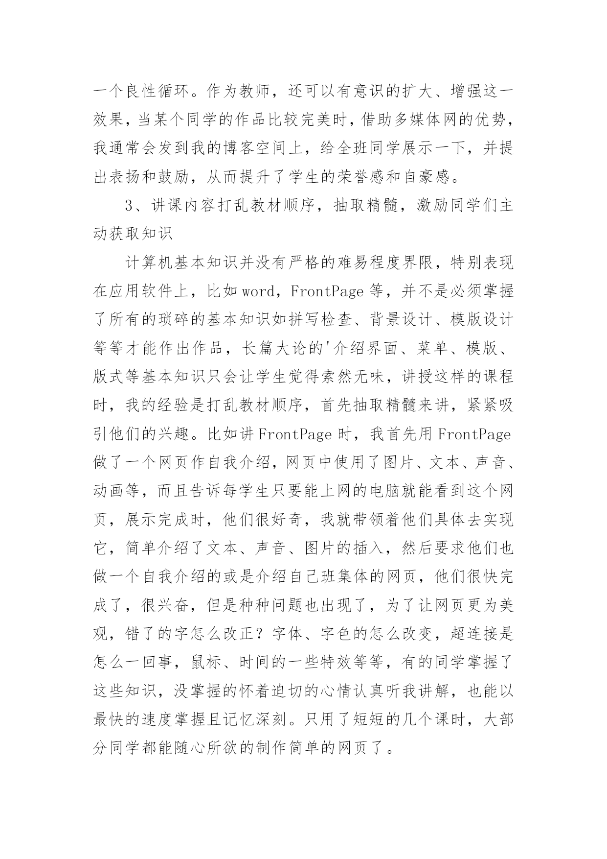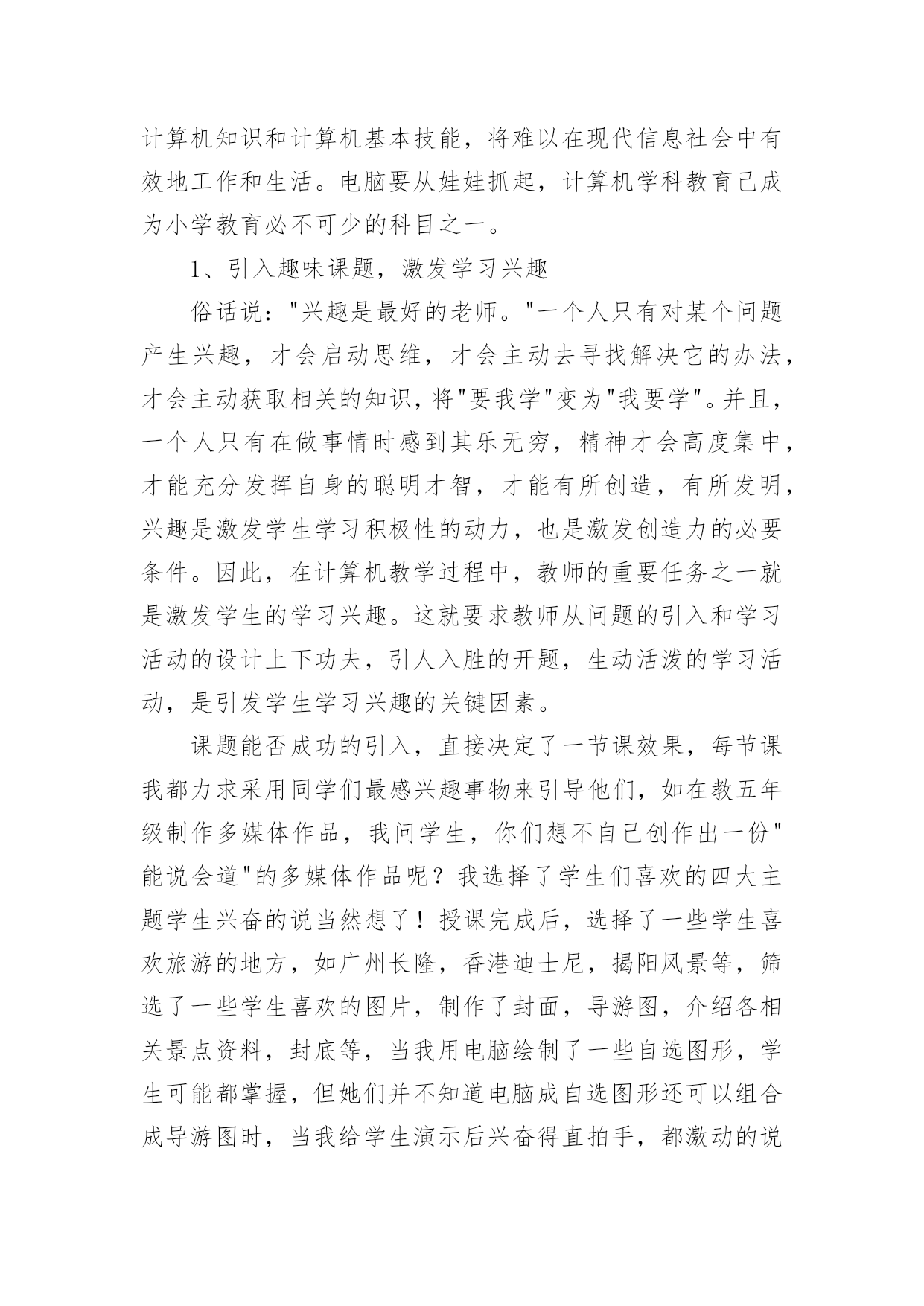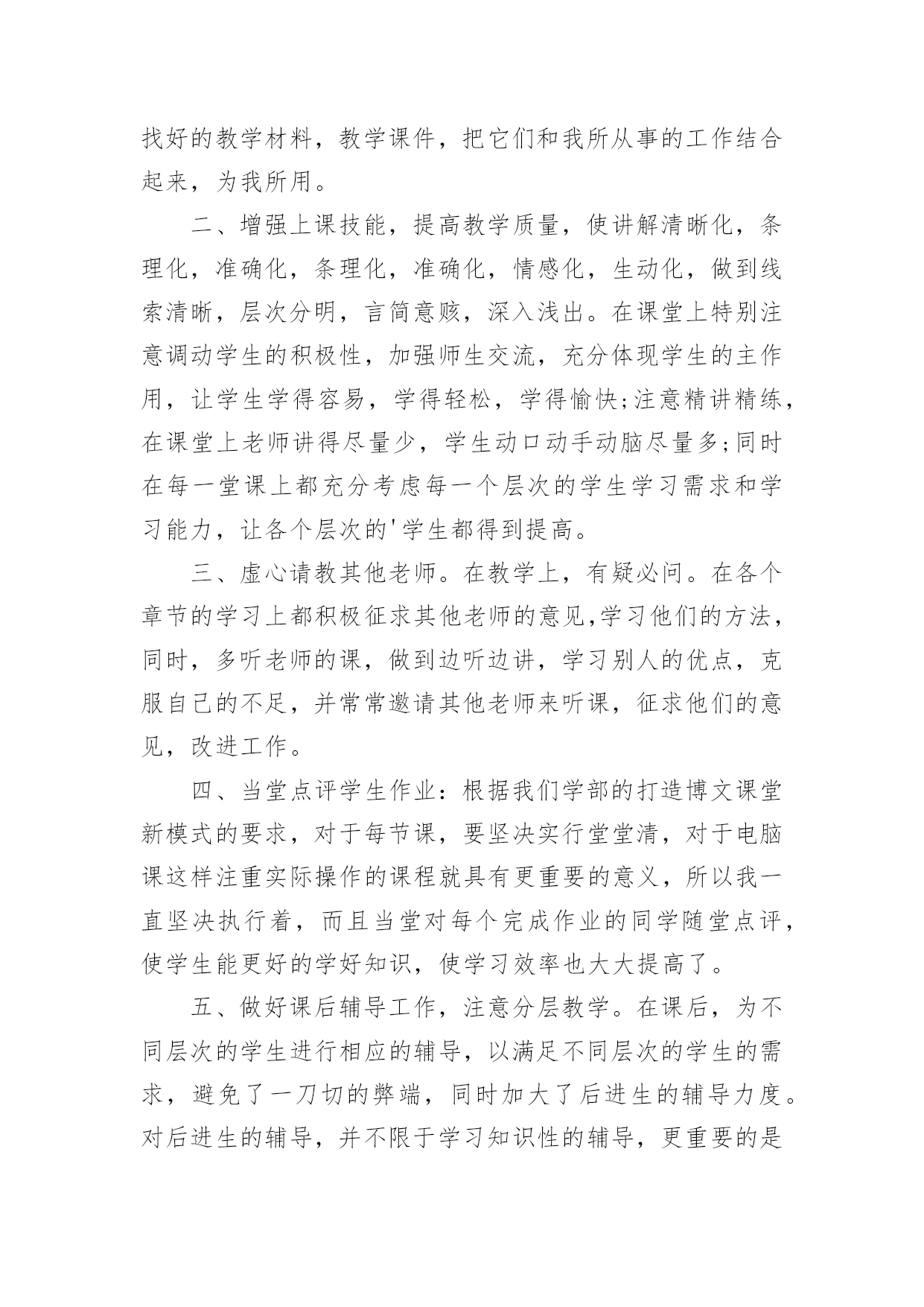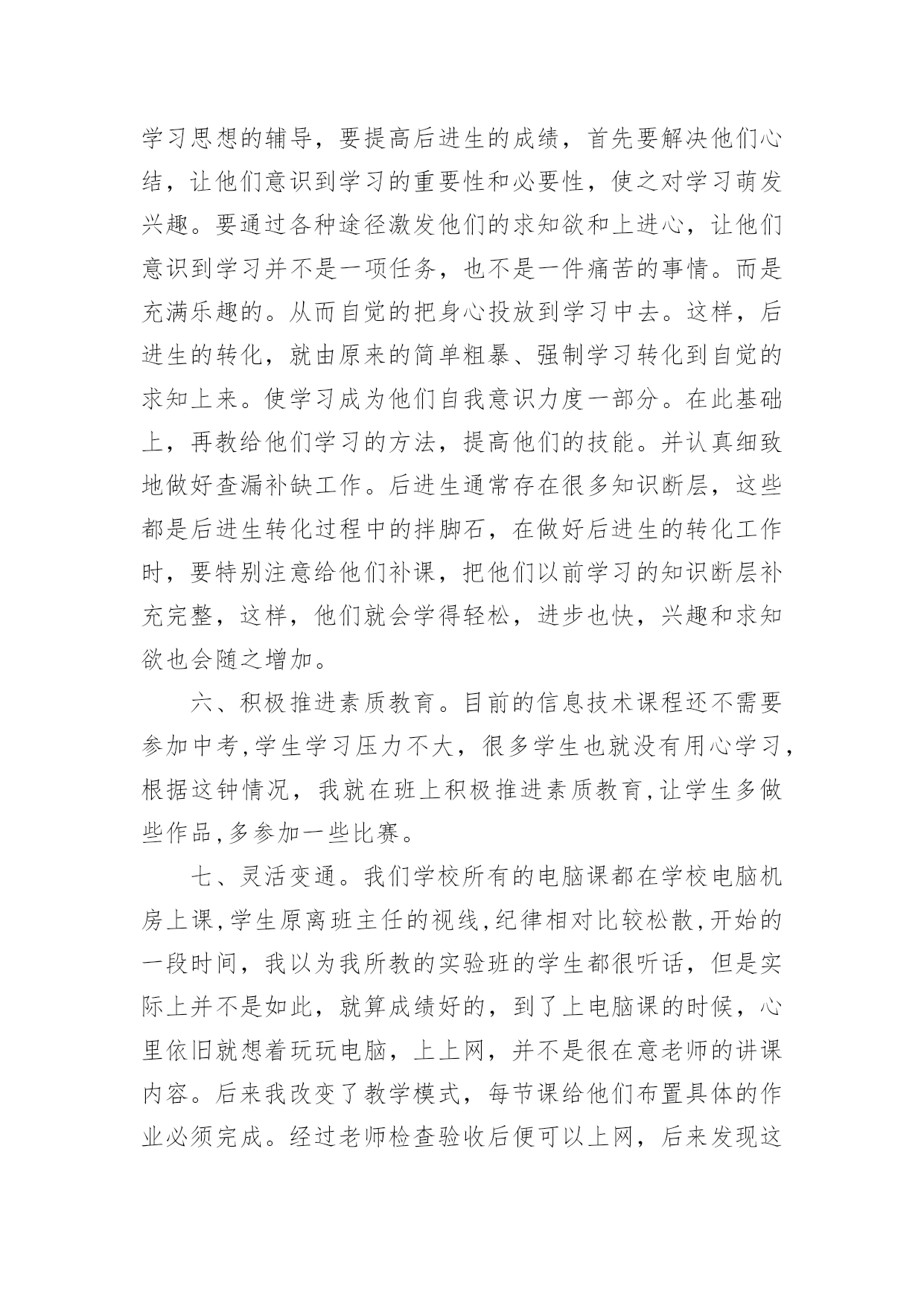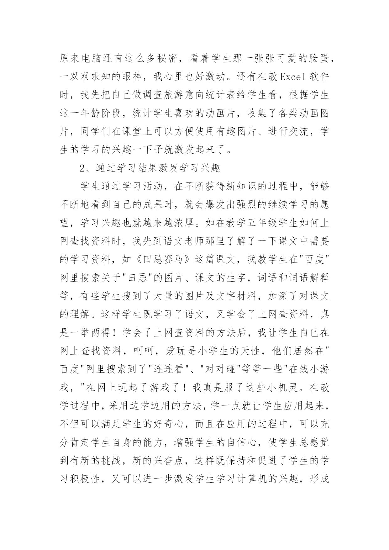 小学信息技术教学工作总结小学信息技术教学工作总结总结是指社会团体、企业单位和个人对某一阶段的学习、工作或其完成情况加以回顾和分析,得出教训和一些规律性认识的一种书面材料,它可以有效锻炼我们的语言组织能力,为此要我们写一份总结。那么你知道总结如何写吗?以下是小编整理的小学信息技术教学工作总结,仅供参考,大家一起来看看吧。小学信息技术教学工作总结1时间过的飞快,转眼间一个学期过去了,回顾这个学期所从事的信息技术教学工作,基本上是比较顺利地完成任务。我从各方面严格要求自己,积极向老教师请教,结合本校的实际条件和学生的实际情况,勤勤恳恳,兢兢业业,使教学工作有计划,有组织,有步骤地开展。立足现在,放眼未来,为使今后的工作取得更大的进步,现对本学期教学工作作出总结,希望能发扬优点,克服不足,总结检验教训,继往开来,以促进教训工作更上一层楼。一、认真备课,不但备学生而且备教材备教法,根据教材内容及学生的实际,设计课的类型,拟定采用的教学方法,并对教学过程的程序及时间安排都作了详细的记录,认真写好教案。每一课都做到“有备而来”,每堂课都在课前做好充分的准备,我还要查阅各种资料,能上因特网时还上网寻找好的教学材料,教学课件,把它们和我所从事的工作结合起来,为我所用。二、增强上课技能,提高教学质量,使讲解清晰化,条理化,准确化,条理化,准确化,情感化,生动化,做到线索清晰,层次分明,言简意赅,深入浅出。在课堂上特别注意调动学生的积极性,加强师生交流,充分体现学生的主作用,让学生学得容易,学得轻松,学得愉快;注意精讲精练,在课堂上老师讲得尽量少,学生动口动手动脑尽量多;同时在每一堂课上都充分考虑每一个层次的学生学习需求和学习能力,让各个层次的'学生都得到提高。三、虚心请教其他老师。在教学上,有疑必问。在各个章节的学习上都积极征求其他老师的意见,学习他们的方法,同时,多听老师的课,做到边听边讲,学习别人的优点,克服自己的不足,并常常邀请其他老师来听课,征求他们的意见,改进工作。四、当堂点评学生作业:根据我们学部的打造博文课堂新模式的要求,对于每节课,要坚决实行堂堂清,对于电脑课这样注重实际操作的课程就具有更重要的意义,所以我一直坚决执行着,而且当堂对每个完成作业的同学随堂点评,使学生能更好的学好知识,使学习效率也大大提高了。五、做好课后辅导工作,注意分层教学。在课后,为不同层次的学生进行相应的辅导,以满足不同层次的学生的需求,避免了一刀切的弊端,同时加大了后进生的辅导力度。对后进生的辅导,并不限于学习知识性的辅导,更重要的是学习思想的辅导,要提高后进生的成绩,首先要解决他们心结,让他们意识到学习的重要性和必要性,使之对学习萌发兴趣。要通过各种途径激发他们的求知欲和上进心,让他们意识到学习并不是一项任务,也不是一件痛苦的事情。而是充满乐趣的。从而自觉的把身心投放到学习中去。这样,后进生的转化,就由原来的简单粗暴、强制学习转化到自觉的求知上来。使学习成为他们自我意识力度一部分。在此基础上,再教给他们学习的方法,提高他们的技能。并认真细致地做好查漏补缺工作。后进生通常存在很多知识断层,这些都是后进生转化过程中的拌脚石,在做好后进生的转化工作时,要特别注意给他们补课,把他们以前学习的知识断层补充完整,这样,他们就会学得轻松,进步也快,兴趣和求知欲也会随之增加。六、积极推进素质教育。目前的信息技术课程还不需要参加中考,学生学习压力不大,很多学生也就没有用心学习,根据这钟情况,我就在班上积极推进素质教育,让学生多做些作品,多参加一些比赛。七、灵活变通。我们学校所有的电脑课都在学校电脑机房上课,学生原离班主任的视线,纪律相对比较松散,开始的一段时间,我以为我所教的实验班的学生都很听话,但是实际上并不是如此,就算成绩好的,到了上电脑课的时候,心里依旧就想着玩玩电脑,上上网,并不是很在意老师的讲课内容。后来我改变了教学模式,每节课给他们布置具体的作业必须完成。经过老师检查验收后便可以上网,后来发现这种效果还不错。八、本学期踏实认真地完成了三年级信息技术的教学任务,并让三年级的学生都学到的知识归为以下几点:1、信息技术初步:了解计算机各部件的应用,掌握键盘和鼠标器的基本操作。2、操作系统简单介绍:掌握PowerPoint中文本的添加,图片的插入,动画的设置,超级链接的制作。3、用计算机画画,进行名片的制作。4、网络的简单应用,学会上网,学会查看网上同学的电脑中的信息。在新的学期里,我将继续努力,争取取得更好的成绩,成为一名合格的教师。小学信息技术教学工作总结2紧张忙碌又非常充实的一个学年即将结束,本学年按照教学计划和教学纲要的要求,已经如期地完成了教学任务。现将这一年来的工作总结如下:一、思想认识在这一个学年里,思想上严于律己,热爱党的教育事业。努力提高自己的政治