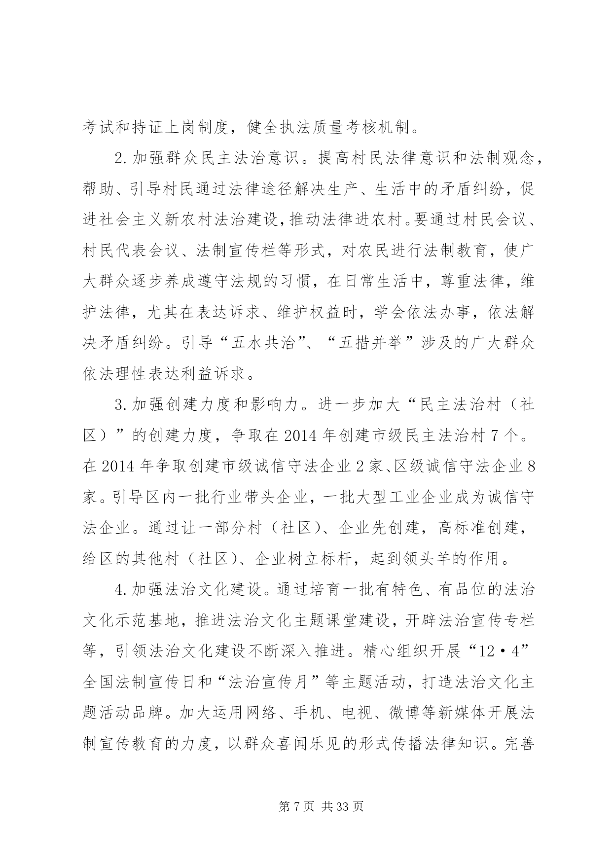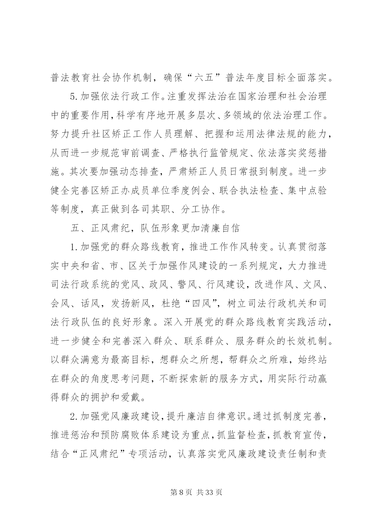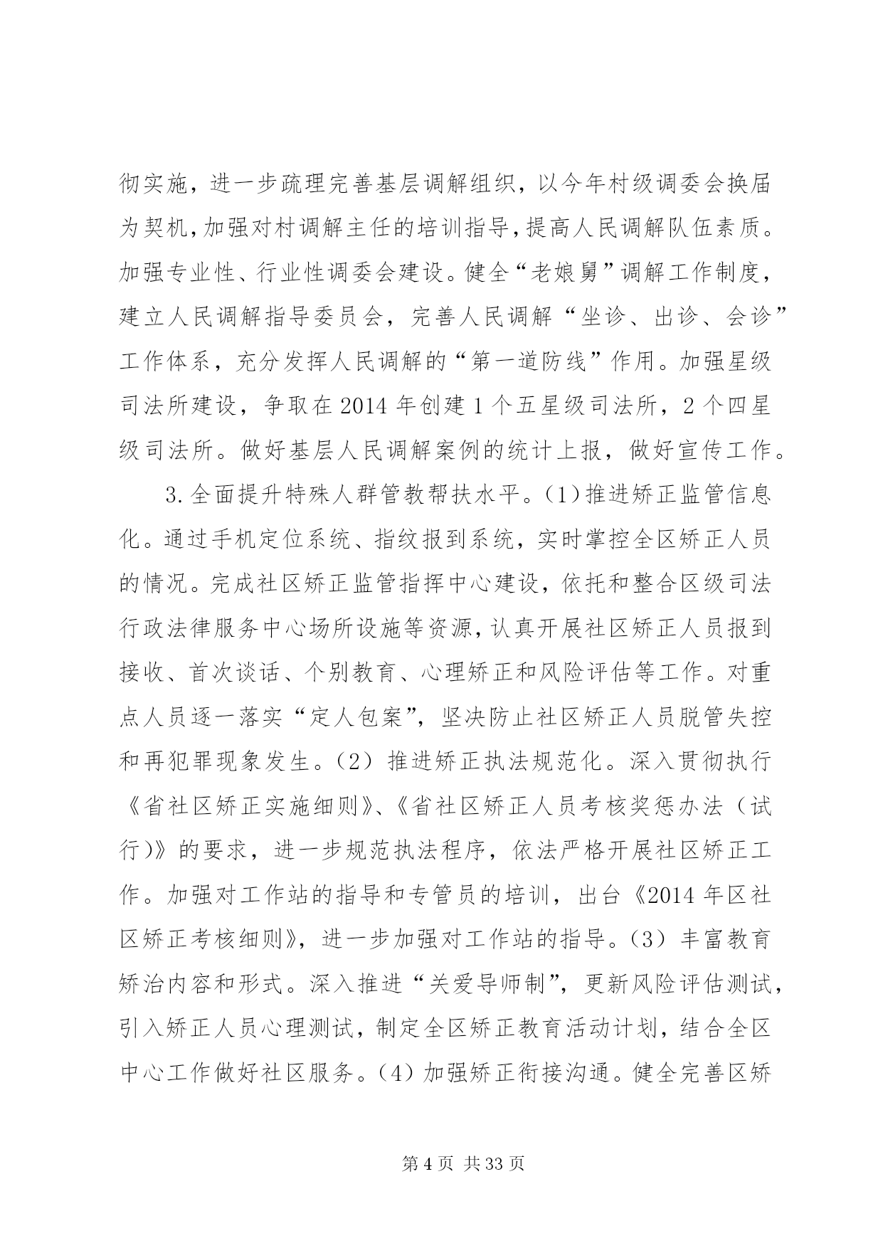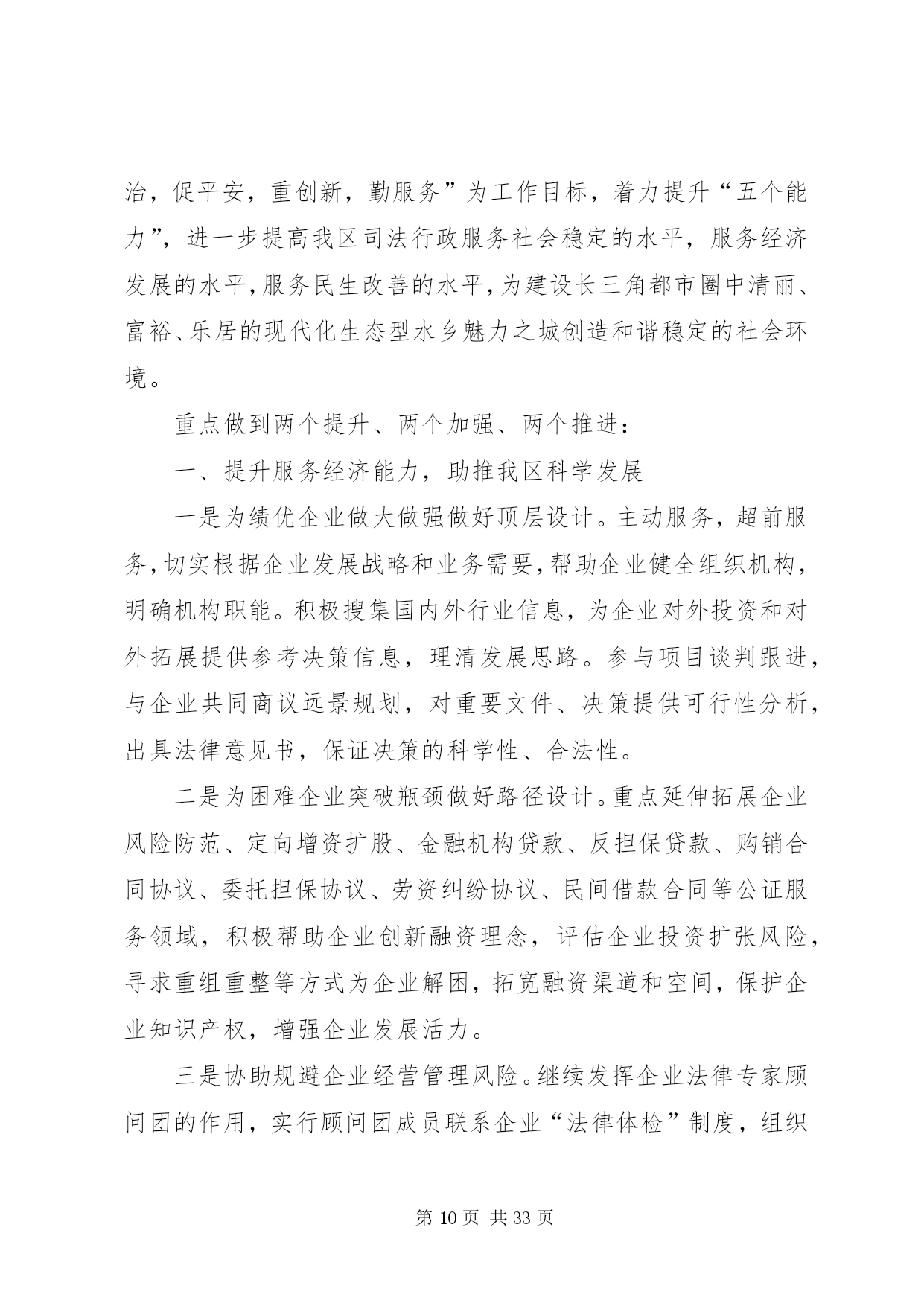第PAGE\*Arabic\*MERGEFORMAT33页共NUMPAGES\*MERGEFORMAT33页XX年司法行政服务工作要点5篇第一篇2014年,区司法行政工作总体要求是:深入贯彻落实党的十八届三中全会、习近平总书记系列重要讲话精神和区委、区政府的总体部署,紧紧围绕“奋战五年、再造”和“重振辉煌”的总目标,突出服务经济社会发展和服务保障民生两大重点,不断创新司法行政工作,坚定理想信念,建设过硬司法行政队伍,提升司法行政工作现代化水平,为我区全面深化改革提供优质高效的法律服务和法律保障,为建设长三角都市圈中清丽、富裕、乐居的现代化生态型水乡魅力之城创造和谐稳定的社会环境。根据工作要求,2014年重点做好以下五个方面工作:一、围绕中心,服务大局更加有为有位1.为“五水共治”提供法律保障和法律服务。部署开展专项法制宣传活动,大力宣传涉及到“五水共治”、“五措并举”的法律法规;排查、调处涉及“五水共治”、“五措并举”的矛盾纠纷;引导“五水共治”、“五措并举”涉及的广大群众依法理性表达利益诉求。为“五水共治”提供法律保障来助推生态文明建设,为我区创建全国生态区提供助力。2.促进企业转型升级。组织开展企业“法律体检”活动,防范法律风险。针对当前少数企业生产经营发生困难和经济发展中出现的新情况、新问题,准确把握当前国际国内和我区经济形势,牢固树立大局意识,切实增强责任感和使命感。推进小微企业服务体系的建立,积极参与企业重整重组,努力为企业化解危机提供法律服务,充分发挥法律知识和法律实务经验的专业优势,协助政府和企业有效实施企业资产重组和债务处理,提高化解矛盾和防范风险的能力,维护经济安全和社会稳定,推动我区经济的健康发展。3.深入推进普法活动。根据地区、部门行业和单位的特点,制定完善“法律六进”每一进的目标、内容和方式方法,分类建立示范点,完善推进制度,落实责任单位,明确工作职责,量化工作指标,完善工作标准和评价体系,加强监督、检查和考核,形成长效机制,确保“法律六进”取得实际效果。巩固和深化“法律进景区”前一阶段取得的成果,进一步创新普法载体,做好法治理念和法治文化传播者。4.深化法律顾问体系建设。切实做好政府法律顾问工作,推荐优秀律师担任各部门法律顾问,为政府科学决策、依法治理当好法律参谋。推进法治政府建设,以法治方式推进我区的深化改革和科学发展。巩固提升政府购买法律服务模式,深化村(社区)法律顾问工作,提高服务质量,提高基层社会治理法治化水平。深化企业法律顾问工作,指导企业完善公司法人治理结构,推动“个转企”,护航小微企业,增强企业抵御风险能力,促进企业健康发展,做好经济发展和社会稳定捍卫者。5.强化法律服务,助推新型城镇化建设。宣传《宪法》、《土地管理法》、《民法通则》、《劳动法》、《物权法》等法律法规和相关政策。建立“重点项目建设法律服务团”、“拆迁法律服务团”等专门法律服务团队。在重大项目工程、拆迁建设等方面,提供优质高效的法律服务。着力加强矛盾纠纷排查预防与及时调处,组织引导律师、基层法律服务工作者和调解组织主动化解矛盾纠纷。把推进城镇化工程提供劳务的农民工列为法律援助的重点对象,对涉及他们的劳动报酬和工伤赔偿,提供及时优质的法律援助。充分发展司法行政职能优势,助推我区城南一体化发展实验区建设。二、维护稳定,化解矛盾更加主动靠前1.努力完善“大调解”格局。在巩固提升传统人民调解组织的基础上,积极探索和创新矛盾纠纷排查调处工作模式,建立多元化的防范和化解社会矛盾的工作体系。在区矛盾纠纷调解中心的基础上,研究新形势下社会矛盾纠纷发生、发展的特点和规律,根据维护社会稳定工作的需要,切实加强矛盾纠纷排查和调处力度,确保矛盾纠纷受理率100%,调处成功率96%以上,为社会安定团结提供有效保障。完善好“大调解”工作格局,推进社会创新治理,把矛盾纠纷化解在基层。利用现有的调解组织排查、调处涉及“五水共治”、“五措并举”的矛盾纠纷。2.完善基层调委会组织建设。继续抓好《人民调解法》的贯彻实施,进一步疏理完善基层调解组织,以今年村级调委会换届为契机,加强对村调解主任的培训指导,提高人民调解队伍素质。加强专业性、行业性调委会建设。健全“老娘舅”调解工作制度,建立人民调解指导委员会,完善人民调解“坐诊、出诊、会诊”工作体系,充分发挥人民调解的“第一道防线”作用。加强星级司法所建设,争取在2014年创建1个五星级司法所,2个四星级司法所。做好基层人民调解案例的统计上报,做好宣传工作。3.全面提升特殊人群管教帮扶水平。(1)推进矫正监管信息化。通过手机定位系统、指纹报到系统,实时掌控全区矫正人员的情况。完成社区矫正监管指挥中心建设,依托和整合区级司法行政法律服务中心场所设施等资源,认真开展社区矫正人员报到接收、首次谈