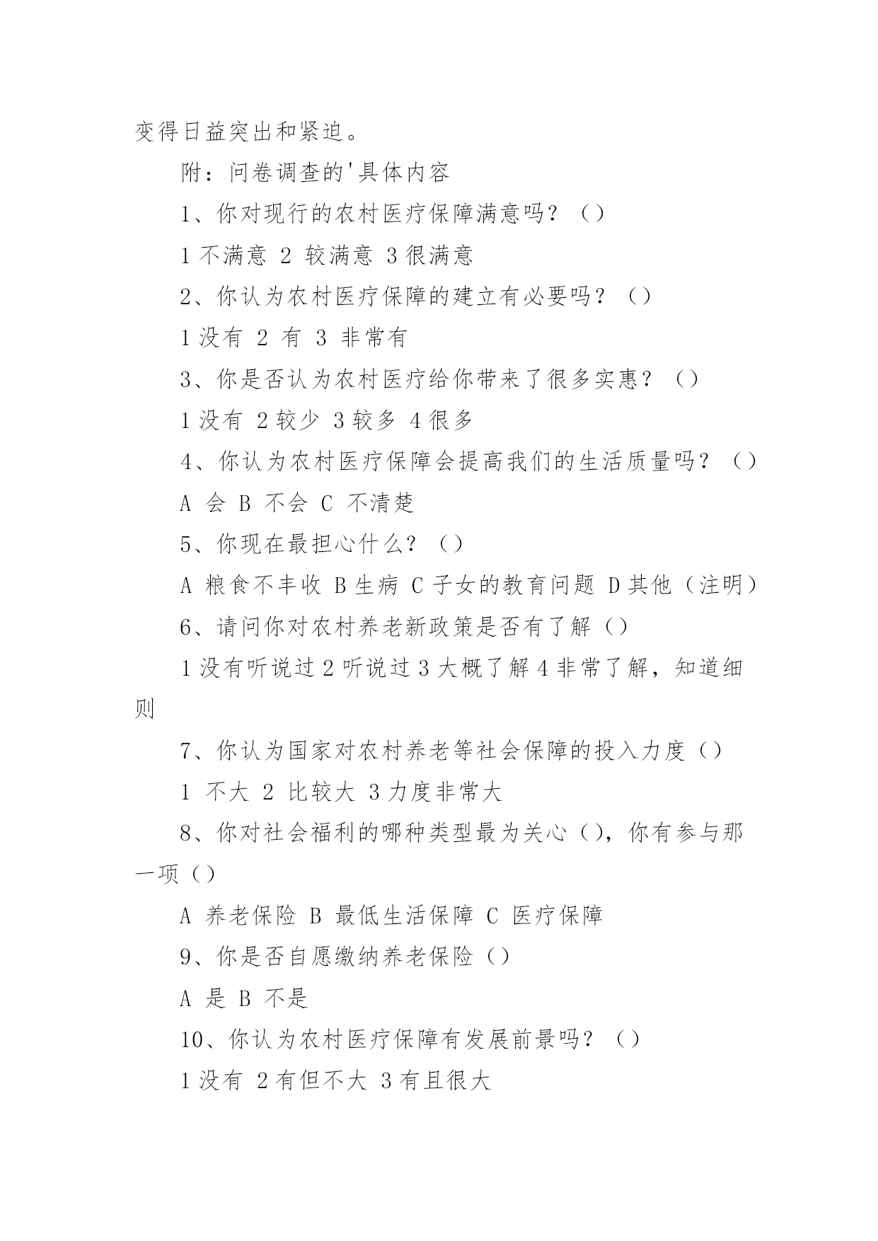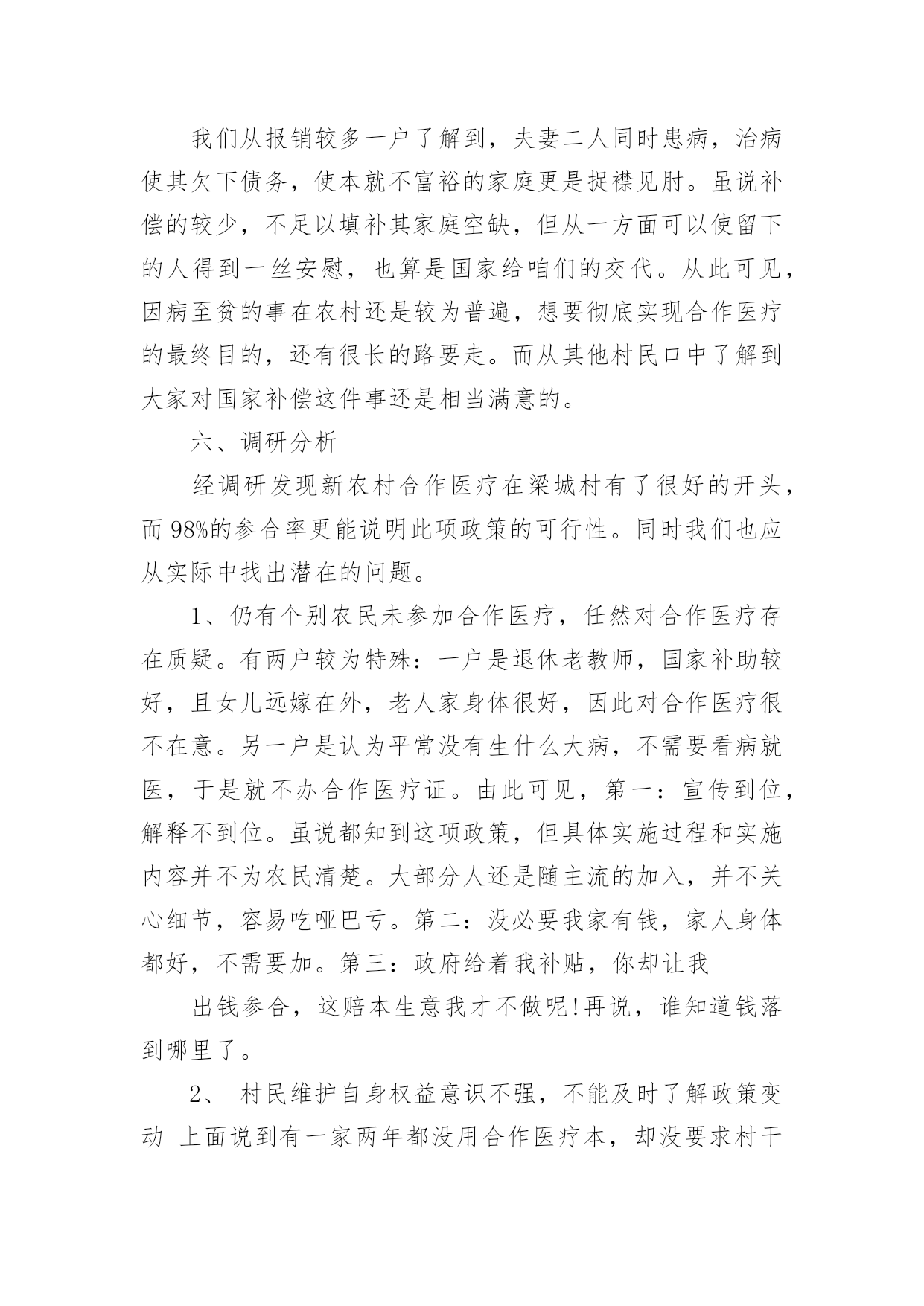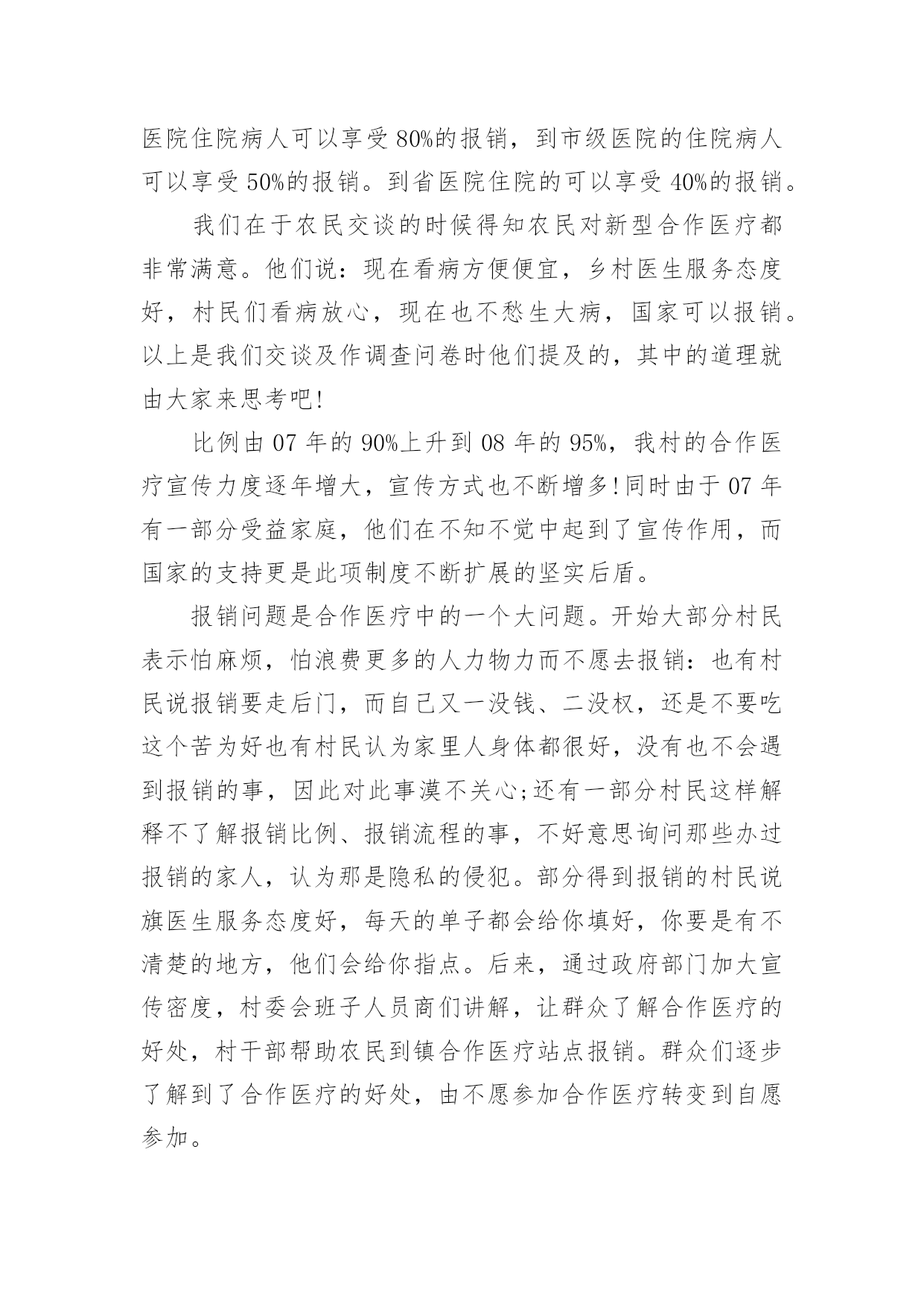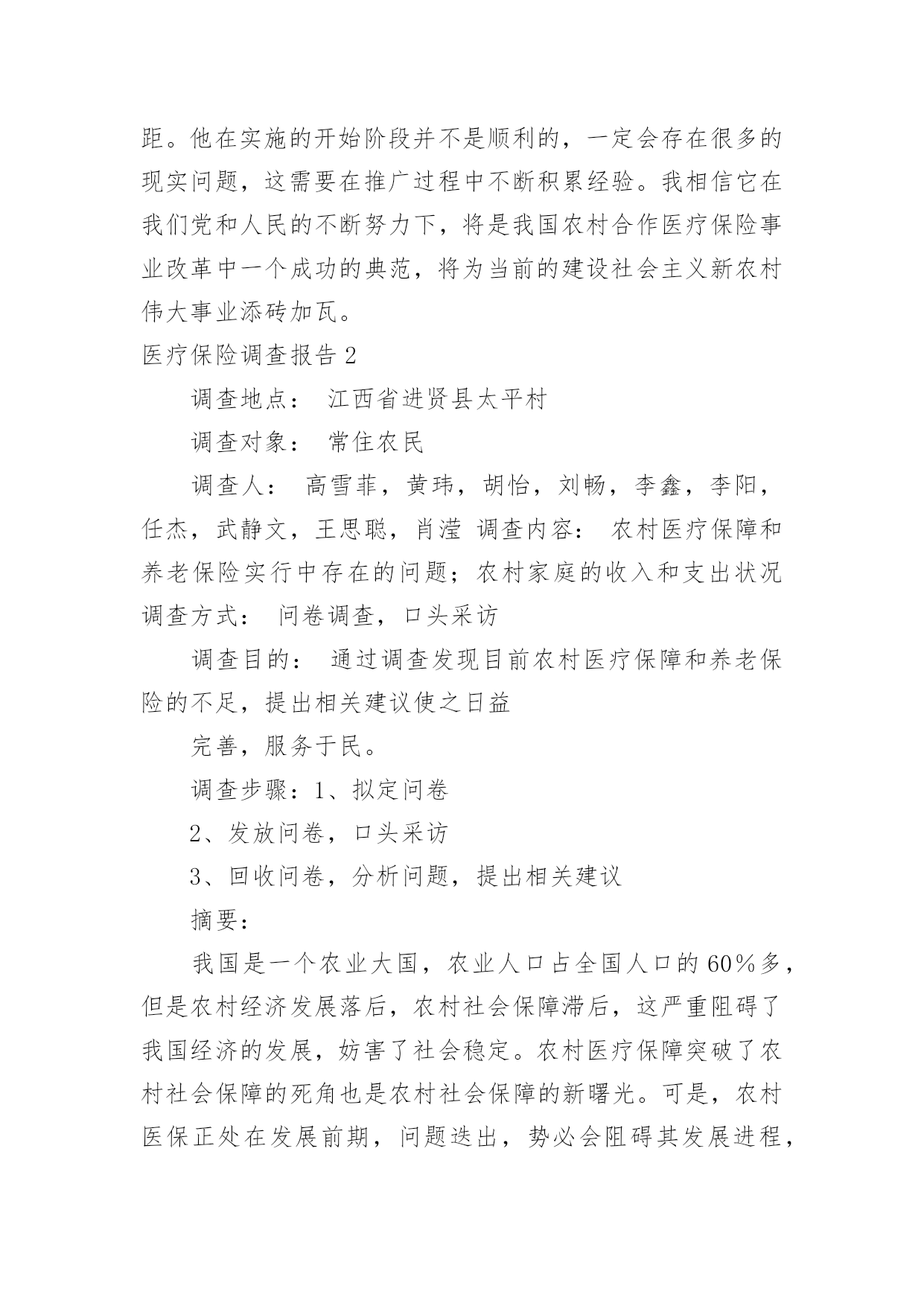 医疗保险调查报告医疗保险调查报告在现实生活中,报告不再是罕见的东西,不同种类的报告具有不同的用途。在写之前,可以先参考范文,下面是小编精心整理的医疗保险调查报告,欢迎阅读与收藏。医疗保险调查报告1一、调查时间:二、调查人:三、梁城村基本信息:2、人口状况:本村人口20xx多人,农业人口1500多人。3、经济状况:本村经济发达程度位于所在办事处中上等水平,全部是农业区。4、村中共4位干部,全年个人工资为8000到10000元,村中有诊所一个,图书屋一处,村中有固定办公场所。四、调研背景及调研内容我也是从农村贫穷家庭出来的,所以我对于农民患者看病难问题曾有过很深的了解,因此,当我成为一名大学生后,我更加关心这一问题,并把他纳入我的调研课题。目前我国把看病贵列为新的民生三大问题之一。多数农民由于无力支付高额的医疗费用,往往有病不看,小病拖大,大病等死,与此同时,他们由于缺乏保健知识和自我保健意识,更容易受到疾病的困扰,因病致贫、因病返贫,陷入恶性循环。医疗保障的缺乏成为农村经济社会发展的严重阻碍,再此背景下,新型农村合作医疗制度在20xx年10月诞生了。新型农村合作医疗制度是由政府组织、引导、支持,农民自愿参加,个人、集体和政府多方筹资,以大病统筹为主的农民医疗互助共济制度。自20xx年开展至今,在全国已经有了多个试点,合作医疗制度正在逐步的发展和完善。我这次调研的内容便围绕合作医疗展开,通过了解农作医疗的实施情况以及村民对合作医疗的满意程度,以求进一步发现问题,提出一些建议。而作为国家提出的一项惠民措施,新型农村合作医疗制度的实施确实给农民带来一定的好处,但中间也出现了不少问题,因此我利用业余时间对本村有关合作医疗方面事宜进行调研,通过此次调研活动,对本村合作医疗情况有一定的了解,对实施中出现的优缺点进行初步总结,以便对总体情况作大概的统计!五、具体工作在调研期间我以走访的形式了解有关合作医疗方面事宜,然后以入户访谈的形式进行具体了解,并总结出了我村有关合作医疗的详细信息。我村有一家合作医疗定点诊所,在村中心地段,村民大部分看病在村中诊所进行。村医疗诊所的医生都有行医证,农民在村卫生所看病都有保障。我们与医生交谈时得知:农民所交的保险金额全部归农民所得,所交保险费用完以后另外每人还可以享受200的报销。在镇医院住院病人可以享受80%的报销,到市级医院的住院病人可以享受50%的报销。到省医院住院的可以享受40%的报销。我们在于农民交谈的时候得知农民对新型合作医疗都非常满意。他们说:现在看病方便便宜,乡村医生服务态度好,村民们看病放心,现在也不愁生大病,国家可以报销。以上是我们交谈及作调查问卷时他们提及的,其中的道理就由大家来思考吧!比例由07年的90%上升到08年的95%,我村的合作医疗宣传力度逐年增大,宣传方式也不断增多!同时由于07年有一部分受益家庭,他们在不知不觉中起到了宣传作用,而国家的支持更是此项制度不断扩展的坚实后盾。报销问题是合作医疗中的一个大问题。开始大部分村民表示怕麻烦,怕浪费更多的人力物力而不愿去报销:也有村民说报销要走后门,而自己又一没钱、二没权,还是不要吃这个苦为好也有村民认为家里人身体都很好,没有也不会遇到报销的事,因此对此事漠不关心;还有一部分村民这样解释不了解报销比例、报销流程的事,不好意思询问那些办过报销的家人,认为那是隐私的侵犯。部分得到报销的村民说旗医生服务态度好,每天的单子都会给你填好,你要是有不清楚的地方,他们会给你指点。后来,通过政府部门加大宣传密度,村委会班子人员商们讲解,让群众了解合作医疗的好处,村干部帮助农民到镇合作医疗站点报销。群众们逐步了解到了合作医疗的好处,由不愿参加合作医疗转变到自愿参加。我们从报销较多一户了解到,夫妻二人同时患病,治病使其欠下债务,使本就不富裕的家庭更是捉襟见肘。虽说补偿的较少,不足以填补其家庭空缺,但从一方面可以使留下的人得到一丝安慰,也算是国家给咱们的交代。从此可见,因病至贫的事在农村还是较为普遍,想要彻底实现合作医疗的最终目的,还有很长的路要走。而从其他村民口中了解到大家对国家补偿这件事还是相当满意的。六、调研分析经调研发现新农村合作医疗在梁城村有了很好的开头,而98%的参合率更能说明此项政策的可行性。同时我们也应从实际中找出潜在的问题。1、仍有个别农民未参加合作医疗,任然对合作医疗存在质疑。有两户较为特殊:一户是退休老教师,国家补助较好,且女儿远嫁在外,老人家身体很好,因此对合作医疗很不在意。另一户是认为平常没有生什么大病,不需要看病就医,于是就不办合作医疗证。由此可见,第一:宣传到位,解释不到位。虽说都知到这项政策,但具体实施过程和实施内容并不为农民清楚。大部分人还是随主流的加入,并不关心细节,容易吃哑巴亏。第二:没必要我家有钱,家人身体都好,不