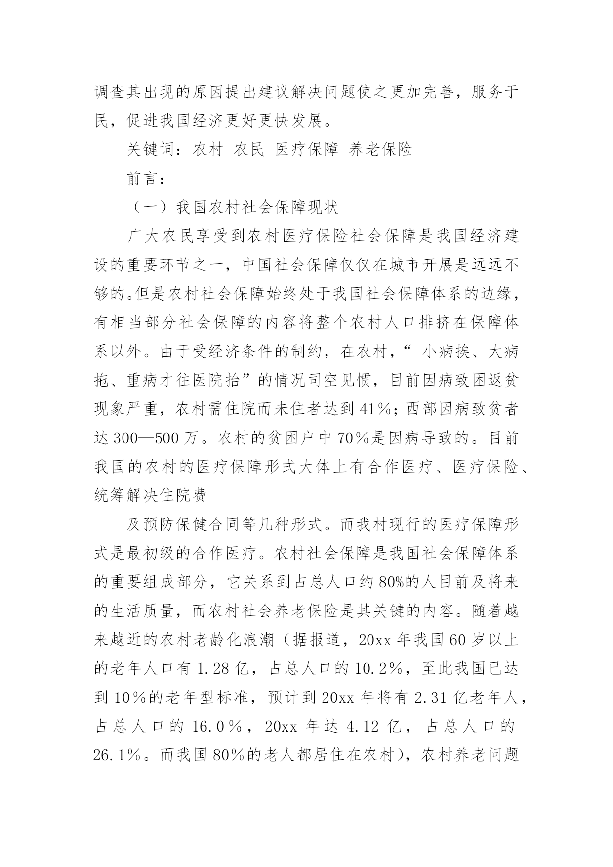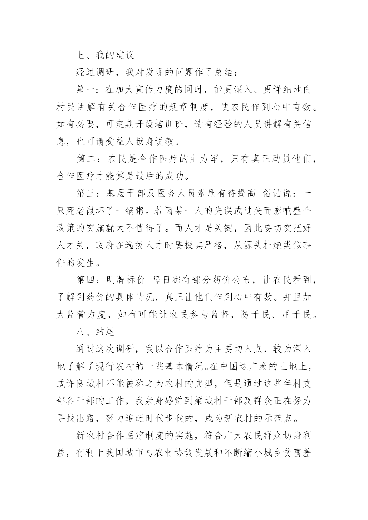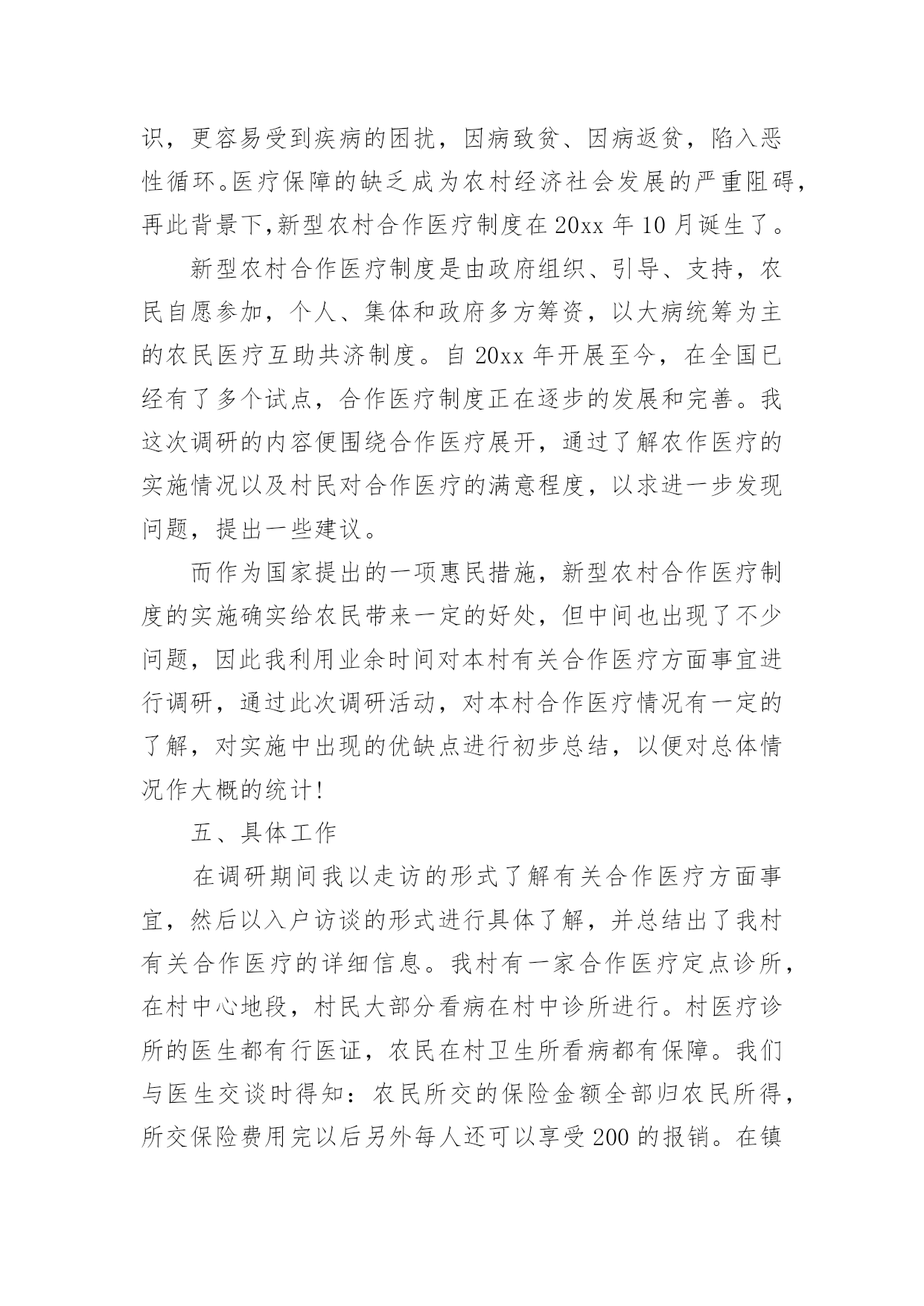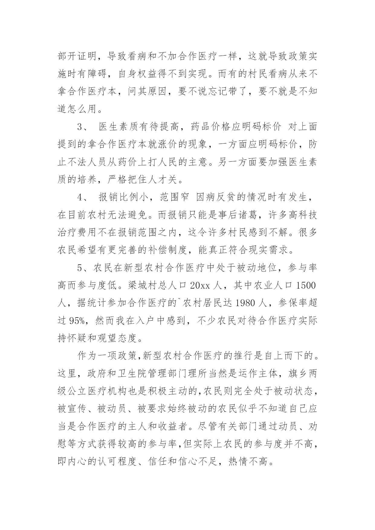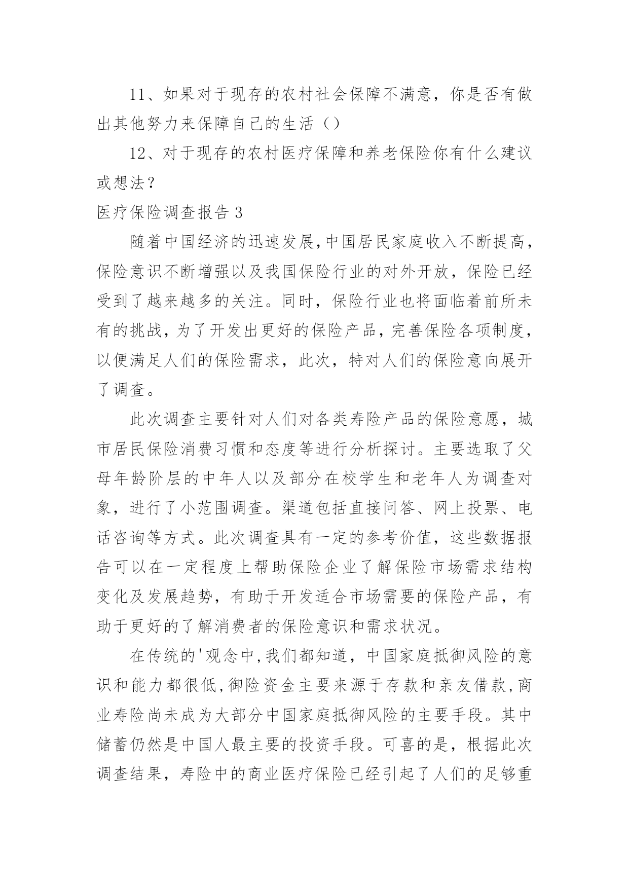 医疗保险调查报告医疗保险调查报告在现实生活中,报告不再是罕见的东西,不同种类的报告具有不同的用途。在写之前,可以先参考范文,下面是小编精心整理的医疗保险调查报告,欢迎阅读与收藏。医疗保险调查报告1一、调查时间:二、调查人:三、梁城村基本信息:2、人口状况:本村人口20xx多人,农业人口1500多人。3、经济状况:本村经济发达程度位于所在办事处中上等水平,全部是农业区。4、村中共4位干部,全年个人工资为8000到10000元,村中有诊所一个,图书屋一处,村中有固定办公场所。四、调研背景及调研内容我也是从农村贫穷家庭出来的,所以我对于农民患者看病难问题曾有过很深的了解,因此,当我成为一名大学生后,我更加关心这一问题,并把他纳入我的调研课题。目前我国把看病贵列为新的民生三大问题之一。多数农民由于无力支付高额的医疗费用,往往有病不看,小病拖大,大病等死,与此同时,他们由于缺乏保健知识和自我保健意识,更容易受到疾病的困扰,因病致贫、因病返贫,陷入恶性循环。医疗保障的缺乏成为农村经济社会发展的严重阻碍,再此背景下,新型农村合作医疗制度在20xx年10月诞生了。新型农村合作医疗制度是由政府组织、引导、支持,农民自愿参加,个人、集体和政府多方筹资,以大病统筹为主的农民医疗互助共济制度。自20xx年开展至今,在全国已经有了多个试点,合作医疗制度正在逐步的发展和完善。我这次调研的内容便围绕合作医疗展开,通过了解农作医疗的实施情况以及村民对合作医疗的满意程度,以求进一步发现问题,提出一些建议。而作为国家提出的一项惠民措施,新型农村合作医疗制度的实施确实给农民带来一定的好处,但中间也出现了不少问题,因此我利用业余时间对本村有关合作医疗方面事宜进行调研,通过此次调研活动,对本村合作医疗情况有一定的了解,对实施中出现的优缺点进行初步总结,以便对总体情况作大概的统计!五、具体工作在调研期间我以走访的形式了解有关合作医疗方面事宜,然后以入户访谈的形式进行具体了解,并总结出了我村有关合作医疗的详细信息。我村有一家合作医疗定点诊所,在村中心地段,村民大部分看病在村中诊所进行。村医疗诊所的医生都有行医证,农民在村卫生所看病都有保障。我们与医生交谈时得知:农民所交的保险金额全部归农民所得,所交保险费用完以后另外每人还可以享受200的报销。在镇医院住院病人可以享受80%的报销,到市级医院的住院病人可以享受50%的报销。到省医院住院的可以享受40%的报销。我们在于农民交谈的时候得知农民对新型合作医疗都非常满意。他们说:现在看病方便便宜,乡村医生服务态度好,村民们看病放心,现在也不愁生大病,国家可以报销。以上是我们交谈及作调查问卷时他们提及的,其中的道理就由大家来思考吧!比例由07年的90%上升到08年的95%,我村的合作医疗宣传力度逐年增大,宣传方式也不断增多!同时由于07年有一部分受益家庭,他们在不知不觉中起到了宣传作用,而国家的支持更是此项制度不断扩展的坚实后盾。报销问题是合作医疗中的一个大问题。开始大部分村民表示怕麻烦,怕浪费更多的人力物力而不愿去报销:也有村民说报销要走后门,而自己又一没钱、二没权,还是不要吃这个苦为好也有村民认为家里人身体都很好,没有也不会遇到报销的事,因此对此事漠不关心;还有一部分村民这样解释不了解报销比例、报销流程的事,不好意思询问那些办过报销的家人,认为那是隐私的侵犯。部分得到报销的村民说旗医生服务态度好,每天的单子都会给你填好,你要是有不清楚的地方,他们会给你指点。后来,通过政府部门加大宣传密度,村委会班子人员商们讲解,让群众了解合作医疗的好处,村干部帮助农民到镇合作医疗站点报销。群众们逐步了解到了合作医疗的好处,由不愿参加合作医疗转变到自愿参加。我们从报销较多一户了解到,夫妻二人同时患病,治病使其欠下债务,使本就不富裕的家庭更是捉襟见肘。虽说补偿的较少,不足以填补其家庭空缺,但从一方面可以使留下的人得到一丝安慰,也算是国家给咱们的交代。从此可见,因病至贫的事在农村还是较为普遍,想要彻底实现合作医疗的最终目的,还有很长的路要走。而从其他村民口中了解到大家对国家补偿这件事还是相当满意的。六、调研分析经调研发现新农村合作医疗在梁城村有了很好的开头,而98%的参合率更能说明此项政策的可行性。同时我们也应从实际中找出潜在的问题。1、仍有个别农民未参加合作医疗,任然对合作医疗存在质疑。有两户较为特殊:一户是退休老教师,国家补助较好,且女儿远嫁在外,老人家身体很好,因此对合作医疗很不在意。另一户是认为平常没有生什么大病,不需要看病就医,于是就不办合作医疗证。由此可见,第一:宣传到位,解释不到位。虽说都知到这项政策,但具体实施过程和实施内容并不为农民清楚。大部分人还是随主流的加入,并不关心细节,容易吃哑巴亏。第二:没必要我家有钱,家人身体都好,不
