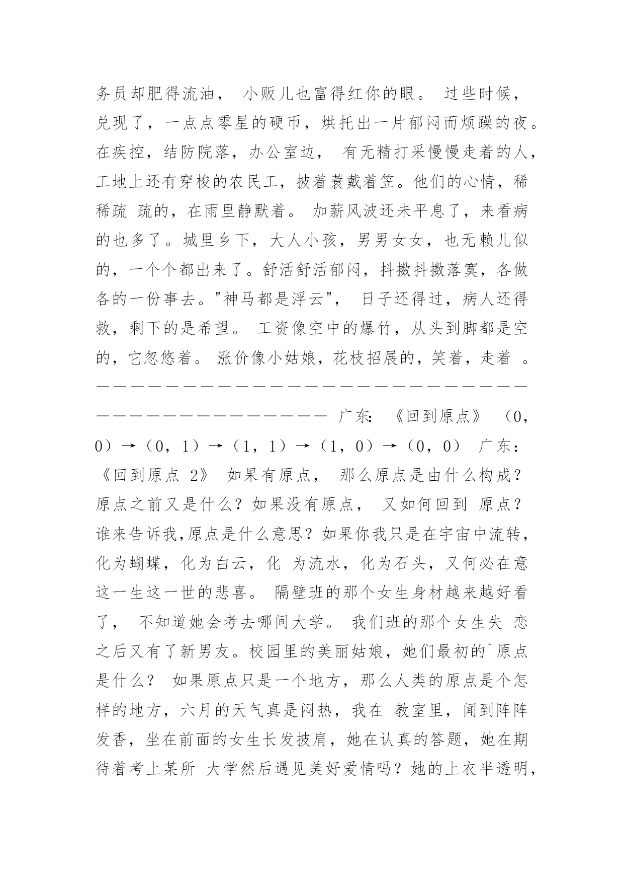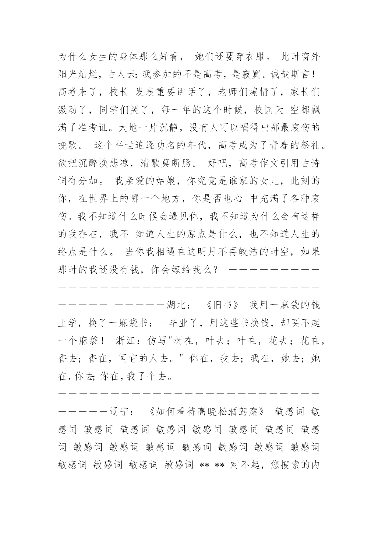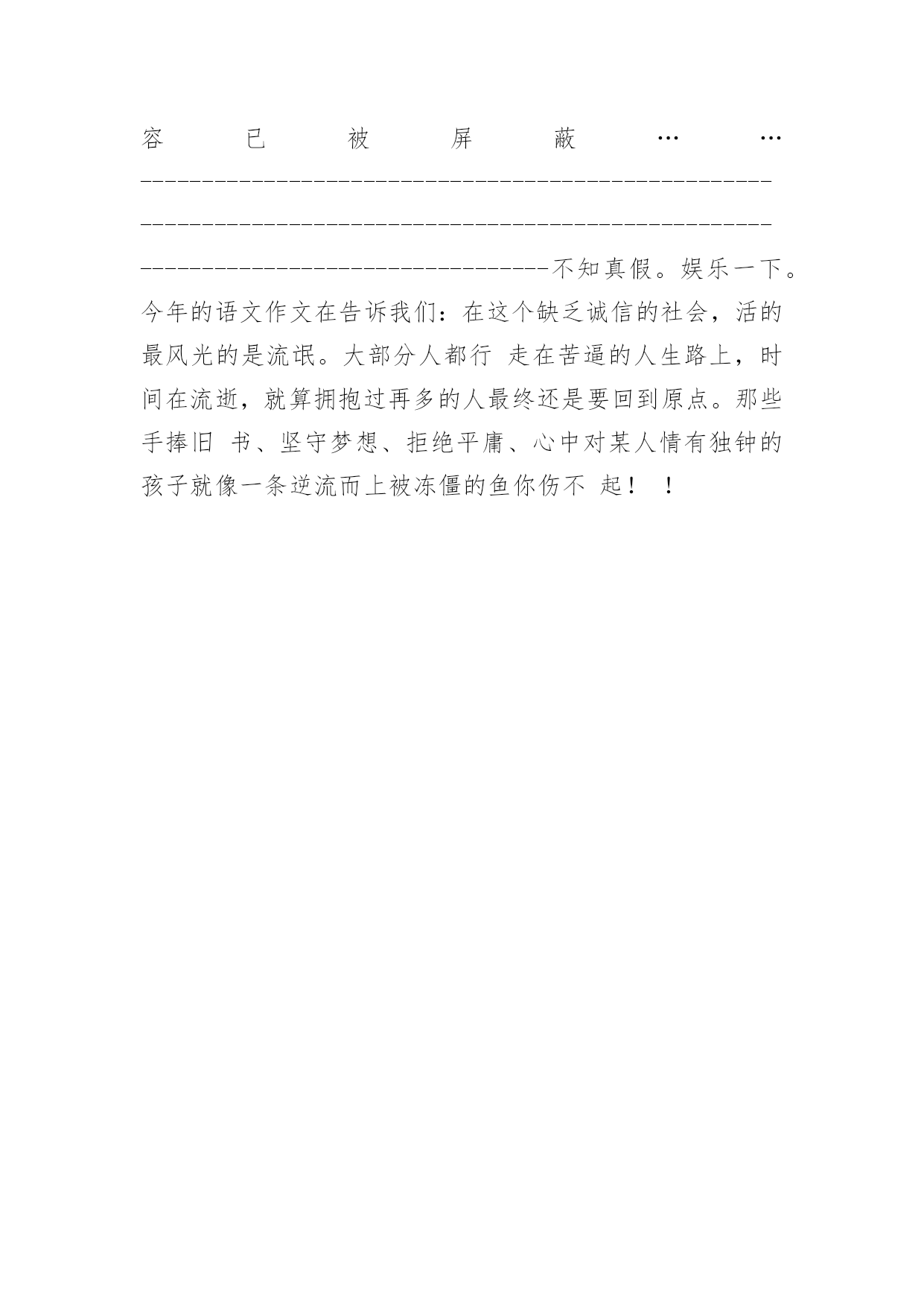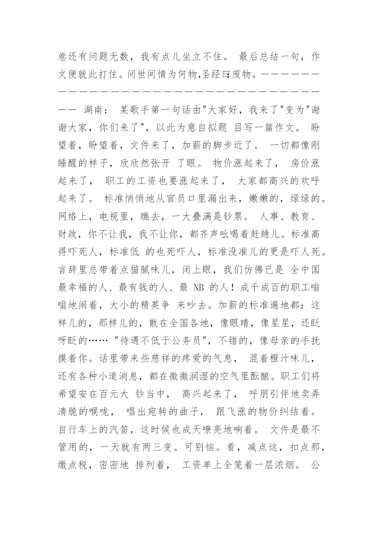 高考0分作文况且咱都是沧海一粟,凭啥我就不能在爱情的海岸登陆?只能一口一口地吃着干醋?人生本来就短促,我又怎能就这样默默地虚度?为了尽快给自己找一个归宿,我决心不择手段的全力以赴。错误,错误。这种想法最终成了我难逃的劫数。没想到我一时的慌不择路,竟上演了那样惨绝人寰的一幕。那是我走投无路,勾引了有夫之妇。谁知道罪行败露,被人家当场抓住。只后悔不会武术,没能够杀出血路。无奈的任人摆布,惨遭了打击报复。他们恼羞成怒,打得义无反顾。片刀循环往复,板砖频频招呼。我浑身血流如注,两腿还不住抽搐。走错那罪恶一步,差点儿就死不瞑目。恐怖,恐怖。真庆幸我还能把命保住。那场我自导自演的前车之覆,带给了我贼深贼深的感触。往事历历在目,我此刻一一追溯。经历了苦痛挣扎后的觉悟,终于上升到了前所未有的高度。问世间情为何物,我算是大彻大悟。感情上的事儿看来还真不能过于盲目。是你的挡不住,不是你的留也留不住。别人的女友就是再好也不能轻易接触。有道是皮之不存毛将焉附,我要是over了还上哪去找我的贤内助?更何况人生短促,还有很多东西值得我们珍惜和呵护。爱情的光环固然炫目,也毕竟不是生命的全部。写到这里,似乎字数不够。那就容我,再些编构。说来说去,心声止不住流露。七夕哥们儿都有节目,我这个单身人物,即将刺痛苦楚。哎呀不好!考试就快结束,试卷还有问题无数,我有点儿坐立不住。最后总结一句,作文便就此打住。问世间情为何物,圣经曰:废物。---------------------------------湖南:某歌手第一句话由"大家好,我来了"变为"谢谢大家,你们来了",以此为意自拟题目写一篇作文。盼望着,盼望着,文件来了,加薪的脚步近了。一切都像刚睡醒的样子,欣欣然张开了眼。物价涨起来了,房价涨起来了,职工的工资也要涨起来了,大家都高兴的欢呼起来了。标准悄悄地从官员口里漏出来,嫩嫩的,绿绿的。网络上,电视里,瞧去,一大叠满是钞票。人事、教育、财政,你不让我,我不让你,都齐声吆喝着赶趟儿。标准高得吓死人,标准低的也死吓人,标准没准儿的更是吓人死。言辞里总带着点猫腻味儿,闭上眼,我们仿佛已是全中国最幸福的人、最有钱的人、最NB的人!成千成百的职工嗡嗡地闹着,大小的精英争来吵去。加薪的标准遍地都:这样儿的,那样儿的,散在全国各地,像眼睛,像星星,还眨呀眨的……"待遇不低于公务员",不错的,像母亲的手抚摸着你。话里带来些慈祥的疼爱的气息,混着橙汁味儿,还有各种小道消息,都在微微润湿的空气里酝酿。职工们将希望安在百元大钞当中,高兴起来了,呼朋引伴地卖弄清脆的喉咙,唱出宛转的曲子,跟飞涨的物价纠结着。自行车上的汽笛,这时候也成天嘹亮地响着。文件是最不管用的,一天就有两三变。可别恼。看,减点这,扣点那,缴点税,密密地排列着,工资单上全笼着一层浓烟。公务员却肥得流油,小贩儿也富得红你的眼。过些时候,兑现了,一点点零星的硬币,烘托出一片郁闷而烦躁的夜。在疾控,结防院落,办公室边,有无精打采慢慢走着的人,工地上还有穿梭的农民工,披着蓑戴着笠。他们的心情,稀稀疏疏的,在雨里静默着。加薪风波还未平息了,来看病的也多了。城里乡下,大人小孩,男男女女,也无赖儿似的,一个个都出来了。舒活舒活郁闷,抖擞抖擞落寞,各做各的一份事去。"神马都是浮云",日子还得过,病人还得救,剩下的是希望。工资像空中的爆竹,从头到脚都是空的,它忽悠着。涨价像小姑娘,花枝招展的,笑着,走着。---------------------------------------广东:《回到原点》(0,0)→(0,1)→(1,1)→(1,0)→(0,0)广东:《回到原点2》如果有原点,那么原点是由什么构成?原点之前又是什么?如果没有原点,又如何回到原点?谁来告诉我,原点是什么意思?如果你我只是在宇宙中流转,化为蝴蝶,化为白云,化为流水,化为石头,又何必在意这一生这一世的悲喜。隔壁班的那个女生身材越来越好看了,不知道她会考去哪间大学。我们班的那个女生失恋之后又有了新男友。校园里的美丽姑娘,她们最初的`原点是什么?如果原点只是一个地方,那么人类的原点是个怎样的地方,六月的天气真是闷热,我在教室里,闻到阵阵发香,坐在前面的女生长发披肩,她在认真的答题,她在期待着考上某所大学然后遇见美好爱情吗?她的上衣半透明,为什么女生的身体那么好看,她们还要穿衣服。此时窗外阳光灿烂,古人云:我参加的不是高考,是寂寞。诚哉斯言!高考来了,校长发表重要讲话了,老师们煽情了,家长们激动了,同学们哭了,每一年的这个时候,校园天空都飘满了准考证。大地一片沉静,没有人可以唱得出那最哀伤的挽歌。这个半世追逐功名的年代,高考成为了青春的祭礼。欲把沉醉换悲凉,清歌莫断肠。好吧,高考作文引用古诗词有分加。我亲爱的姑娘,你究竟是谁家的女儿,此刻的你,在世界上的哪一个地方,你