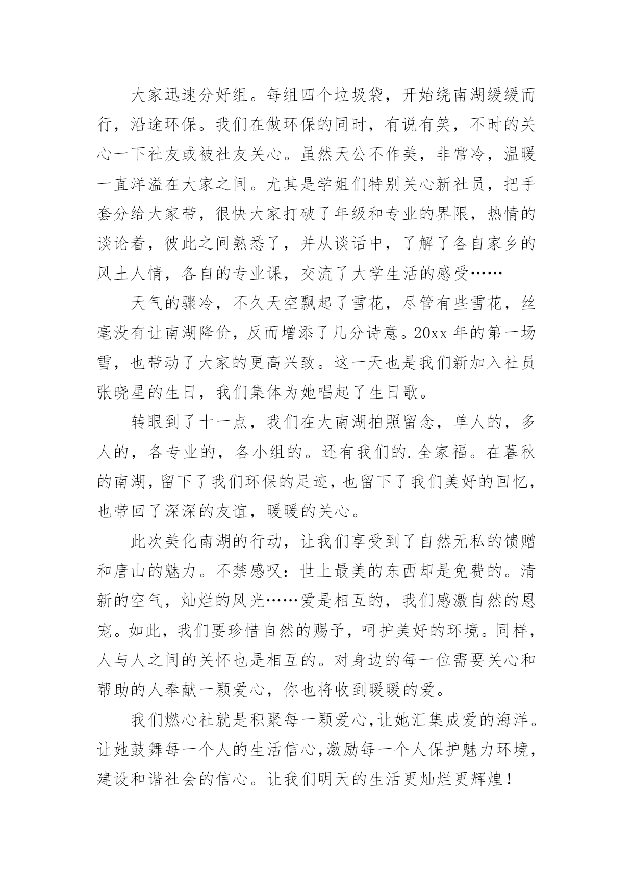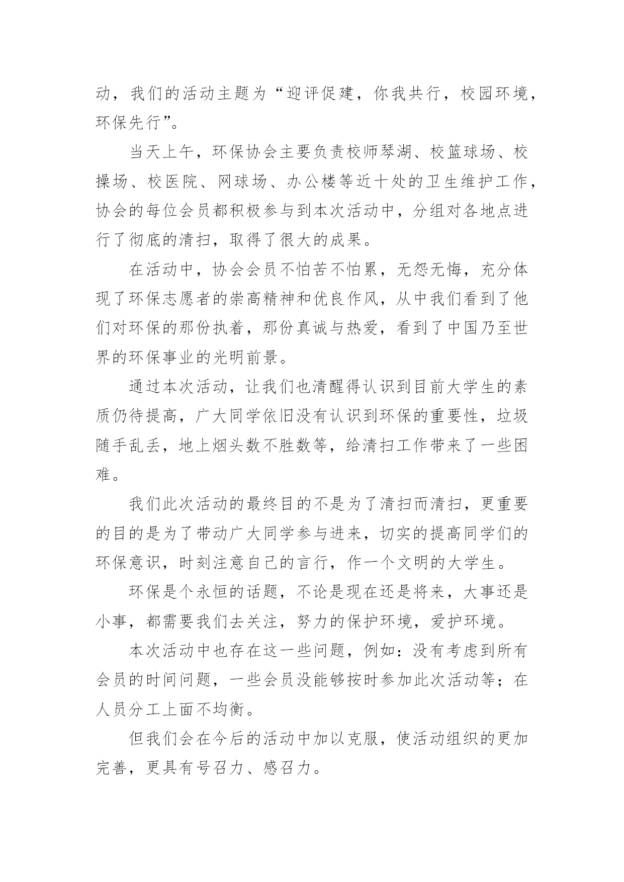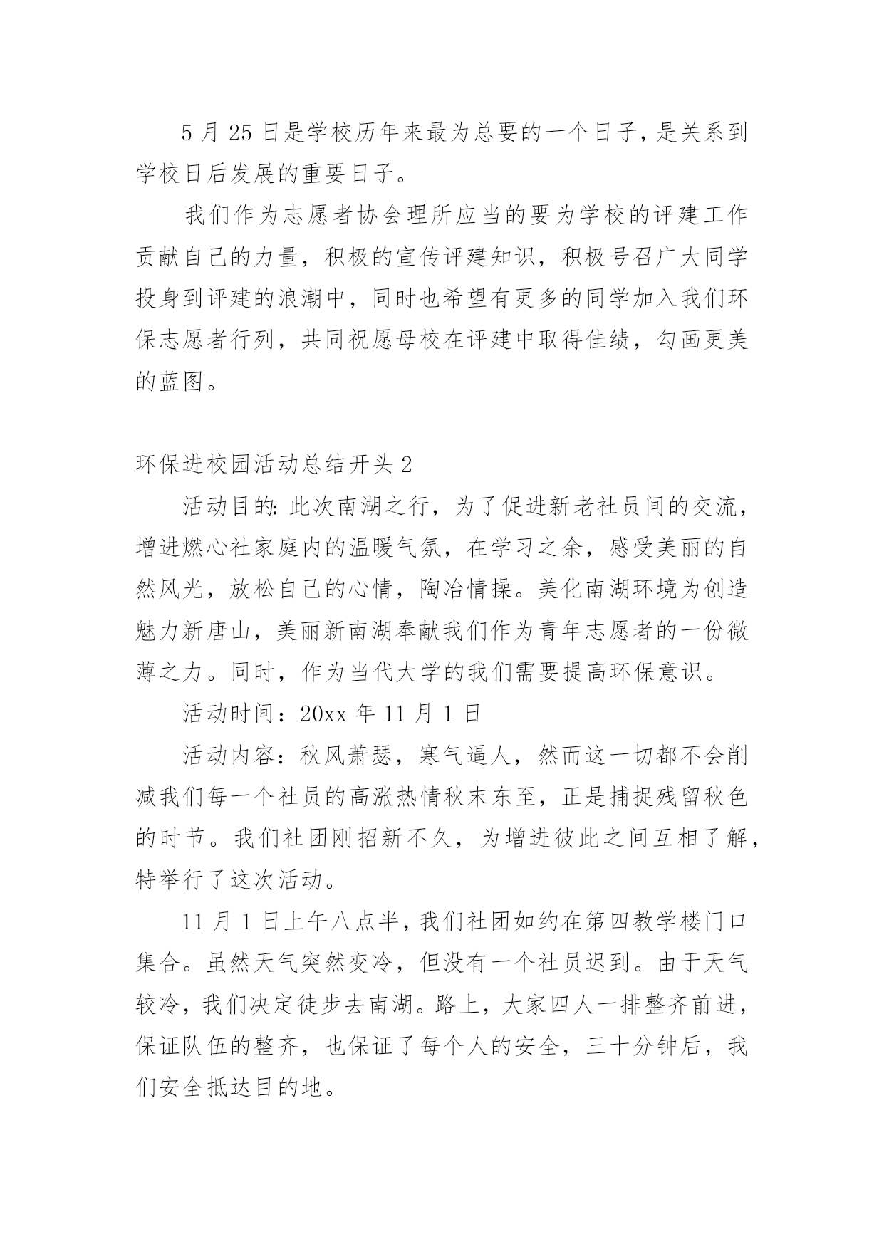 环保进校园活动总结开头在经历了某次活动以后,我们一定积累了不少感想吧,需要好好地写一份活动总结总结一下了。一起来参考活动总结是怎么写的吧,以下是小编帮大家整理的环保进校园活动总结开头,欢迎大家分享。环保进校园活动总结开头1学校作为公共场所,是我们生活和学习的地方,作为当代大学生,我们更应该打起“绿色·和谐校园”的旗号,保护我们的校园环境,美化我们的校园,为同学们提供更加舒适的学习环境。积极开展各种形式以环保为主题的活动,扩大环境保护的影响力,不断加强环保意识,逐步确立科学文明的环保观念,倡导清洁、节约、协调、和谐的环保卫生习惯和生活方式,让环保观念深入同学们的心中。同时,学校评建在即,为争取佳绩,大家共同努力着。20xx年3月8日上午8:30,在西区食堂门口,全校召开了各学院青年志愿者、环保志愿者、社团等在内的青年志愿者动员大会,“迎评促建、你我共行”一系列的志愿者活动在校领导的讲话中,在每个在场成员的热烈掌声中拉开了帷幕。8日上午,环保协会以其一贯的宗旨和口号,本着为环境保护作贡献,为广大同学服务的原则,积极参与了本次活动,我们的活动主题为“迎评促建,你我共行,校园环境,环保先行”。当天上午,环保协会主要负责校师琴湖、校篮球场、校操场、校医院、网球场、办公楼等近十处的卫生维护工作,协会的每位会员都积极参与到本次活动中,分组对各地点进行了彻底的清扫,取得了很大的成果。在活动中,协会会员不怕苦不怕累,无怨无悔,充分体现了环保志愿者的崇高精神和优良作风,从中我们看到了他们对环保的那份执着,那份真诚与热爱,看到了中国乃至世界的环保事业的光明前景。通过本次活动,让我们也清醒得认识到目前大学生的素质仍待提高,广大同学依旧没有认识到环保的重要性,垃圾随手乱丢,地上烟头数不胜数等,给清扫工作带来了一些困难。我们此次活动的最终目的不是为了清扫而清扫,更重要的目的是为了带动广大同学参与进来,切实的提高同学们的环保意识,时刻注意自己的言行,作一个文明的大学生。环保是个永恒的话题,不论是现在还是将来,大事还是小事,都需要我们去关注,努力的保护环境,爱护环境。本次活动中也存在这一些问题,例如:没有考虑到所有会员的时间问题,一些会员没能够按时参加此次活动等;在人员分工上面不均衡。但我们会在今后的活动中加以克服,使活动组织的更加完善,更具有号召力、感召力。5月25日是学校历年来最为总要的一个日子,是关系到学校日后发展的重要日子。我们作为志愿者协会理所应当的要为学校的评建工作贡献自己的力量,积极的宣传评建知识,积极号召广大同学投身到评建的浪潮中,同时也希望有更多的同学加入我们环保志愿者行列,共同祝愿母校在评建中取得佳绩,勾画更美的蓝图。环保进校园活动总结开头2活动目的:此次南湖之行,为了促进新老社员间的交流,增进燃心社家庭内的温暖气氛,在学习之余,感受美丽的自然风光,放松自己的心情,陶冶情操。美化南湖环境为创造魅力新唐山,美丽新南湖奉献我们作为青年志愿者的一份微薄之力。同时,作为当代大学的我们需要提高环保意识。活动时间:20xx年11月1日活动内容:秋风萧瑟,寒气逼人,然而这一切都不会削减我们每一个社员的高涨热情秋末东至,正是捕捉残留秋色的时节。我们社团刚招新不久,为增进彼此之间互相了解,特举行了这次活动。11月1日上午八点半,我们社团如约在第四教学楼门口集合。虽然天气突然变冷,但没有一个社员迟到。由于天气较冷,我们决定徒步去南湖。路上,大家四人一排整齐前进,保证队伍的整齐,也保证了每个人的安全,三十分钟后,我们安全抵达目的地。大家迅速分好组。每组四个垃圾袋,开始绕南湖缓缓而行,沿途环保。我们在做环保的同时,有说有笑,不时的关心一下社友或被社友关心。虽然天公不作美,非常冷,温暖一直洋溢在大家之间。尤其是学姐们特别关心新社员,把手套分给大家带,很快大家打破了年级和专业的界限,热情的谈论着,彼此之间熟悉了,并从谈话中,了解了各自家乡的风土人情,各自的专业课,交流了大学生活的感受……天气的骤冷,不久天空飘起了雪花,尽管有些雪花,丝毫没有让南湖降价,反而增添了几分诗意。20xx年的第一场雪,也带动了大家的更高兴致。这一天也是我们新加入社员张晓星的生日,我们集体为她唱起了生日歌。转眼到了十一点,我们在大南湖拍照留念,单人的,多人的,各专业的,各小组的。还有我们的.全家福。在暮秋的南湖,留下了我们环保的足迹,也留下了我们美好的回忆,也带回了深深的友谊,暖暖的关心。此次美化南湖的行动,让我们享受到了自然无私的馈赠和唐山的魅力。不禁感叹:世上最美的东西却是免费的。清新的空气,灿烂的风光……爱是相互的,我们感激自然的恩宠。如此,我们要珍惜自然的赐予,呵护美好的环境。同样,人与人之间的关怀也是相互的。对身边的每一位需要关心和帮助的人奉献一颗爱心,你也将收到暖暖的爱。我们燃