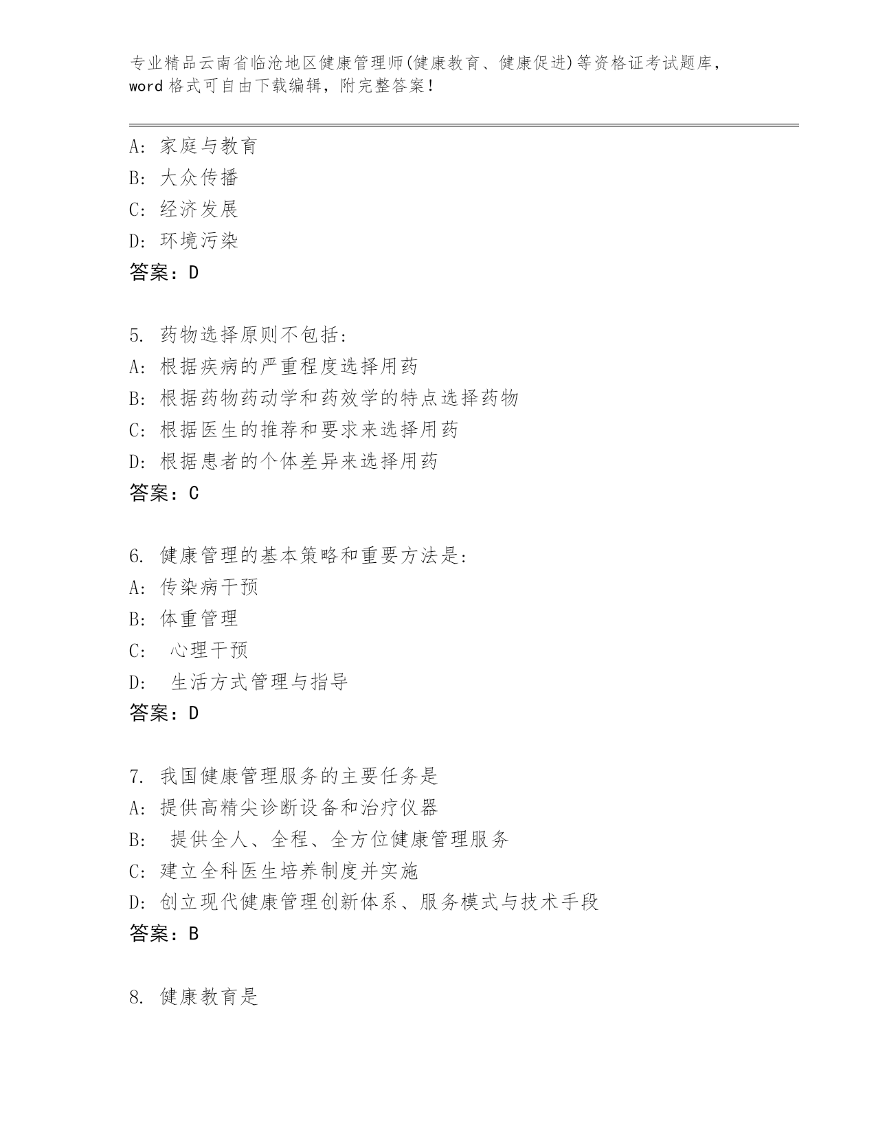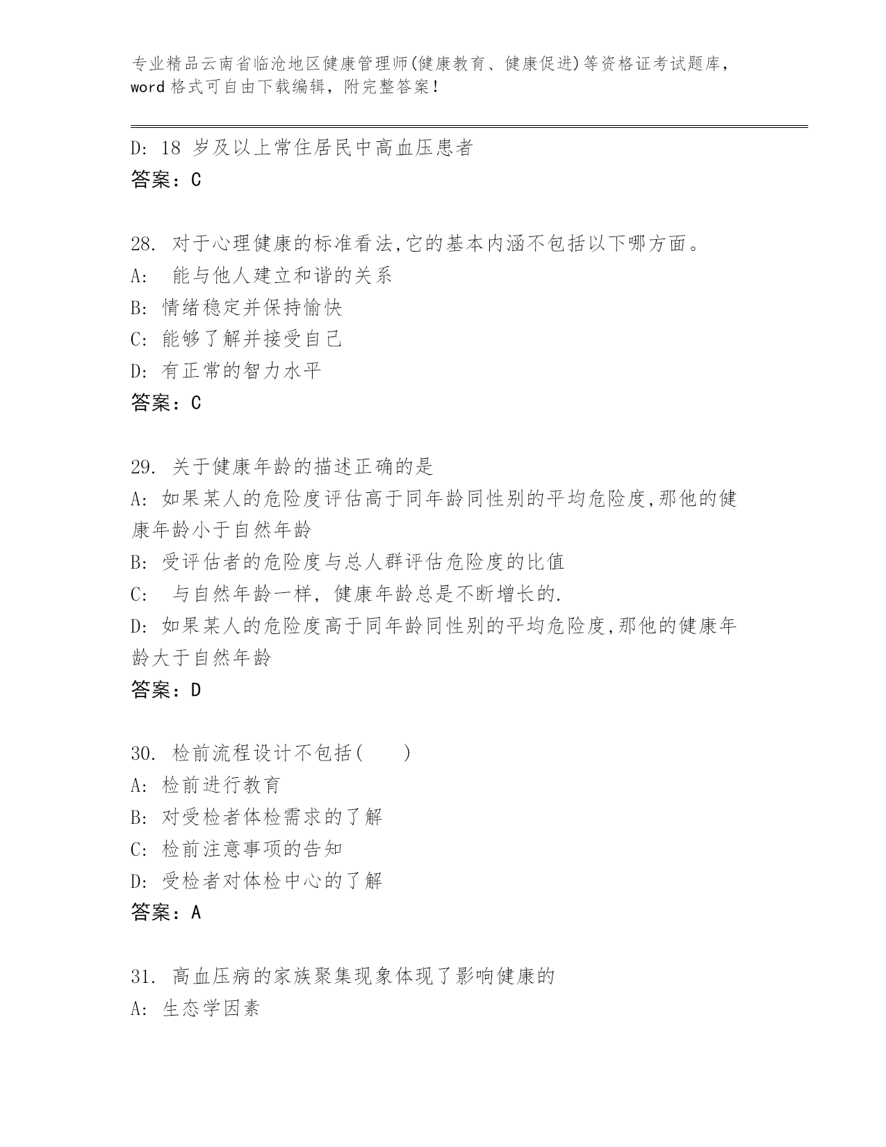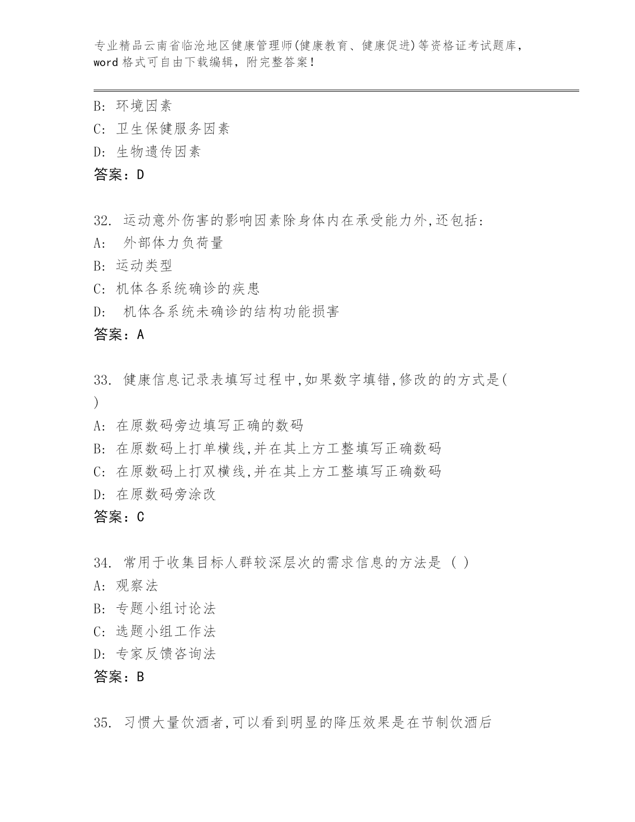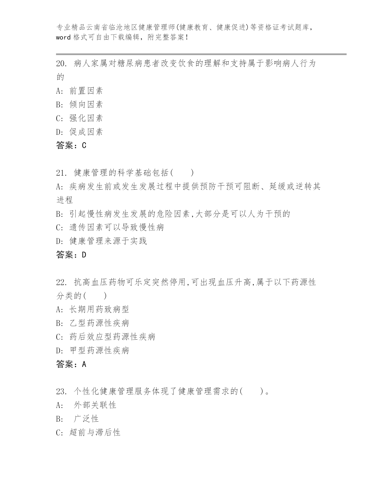 精品云南省临沧地区健康管理师(健康教育、健康促进)等资格证考试优选题库(培优).docx