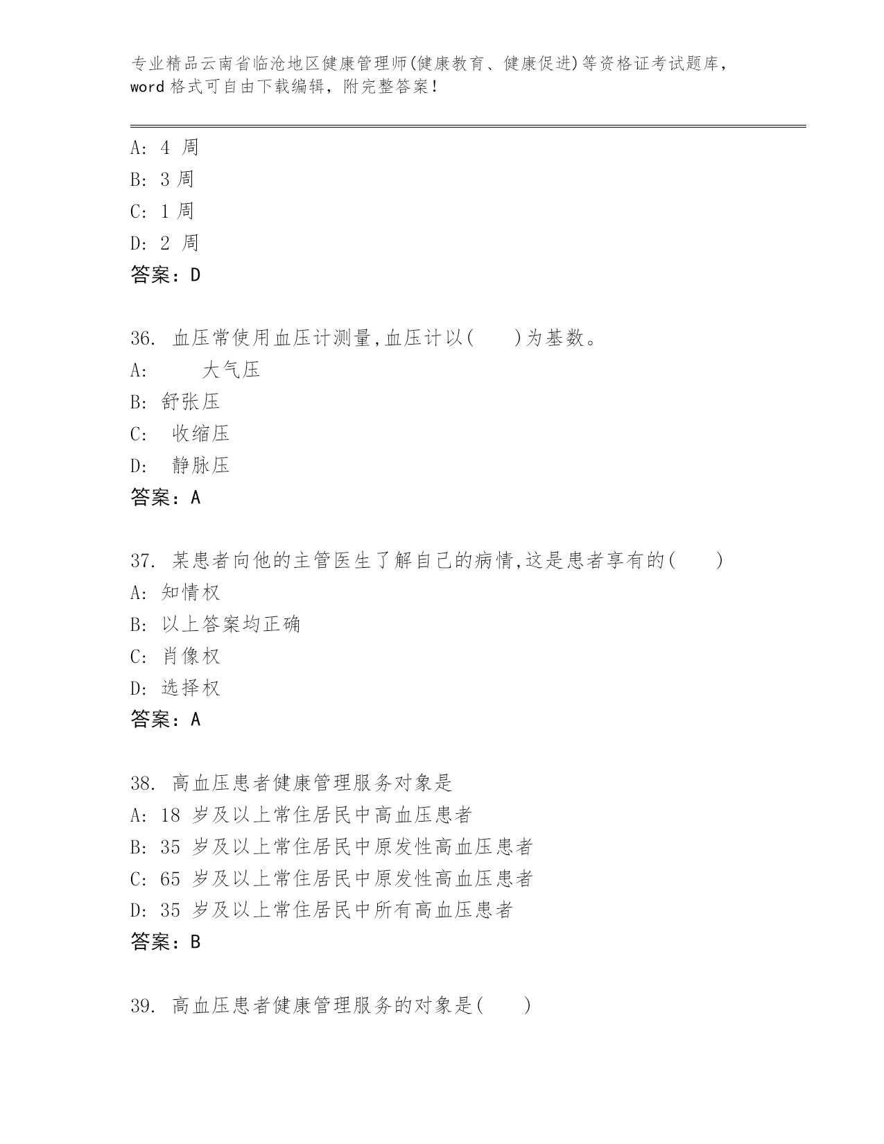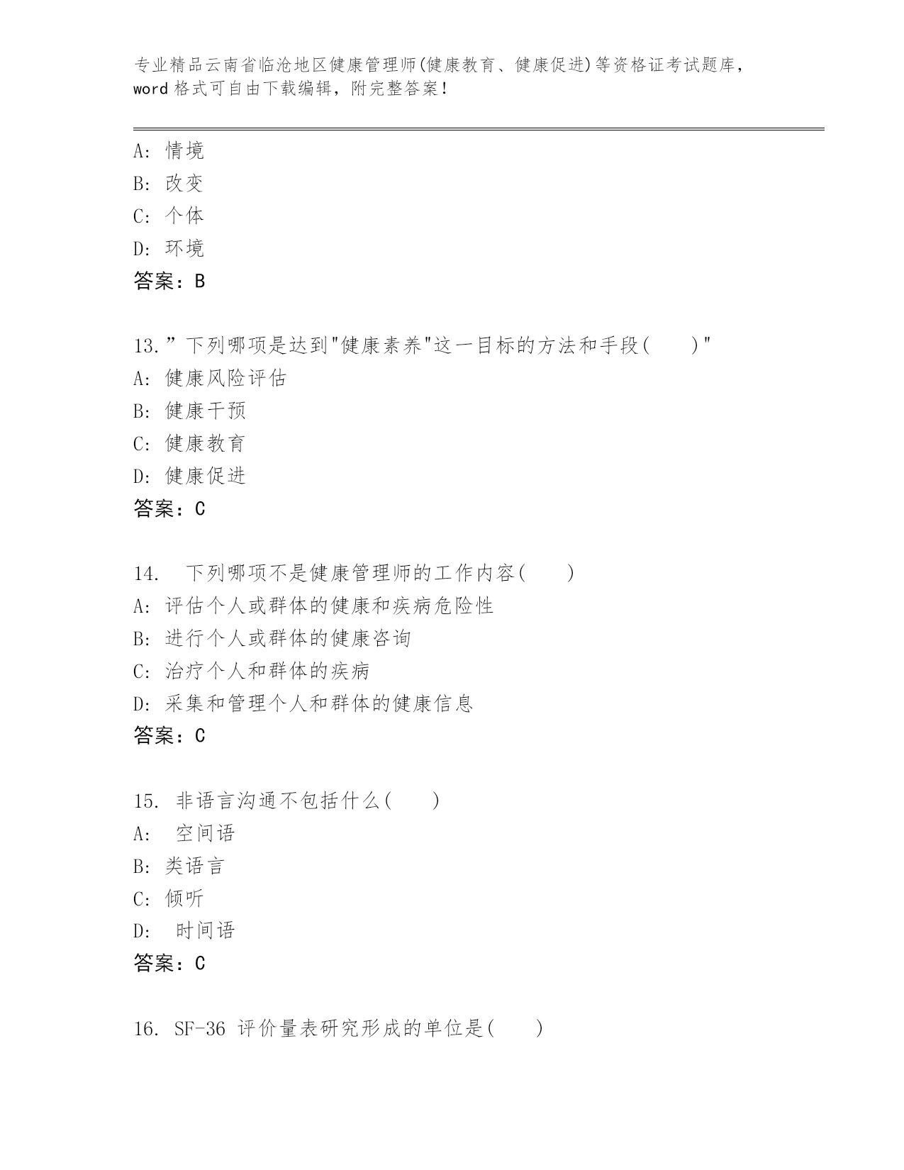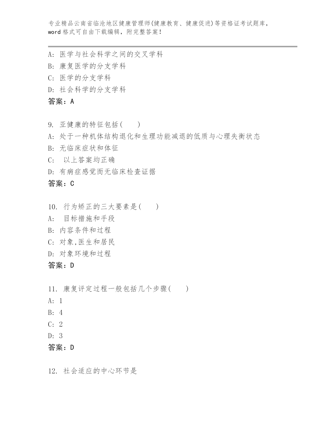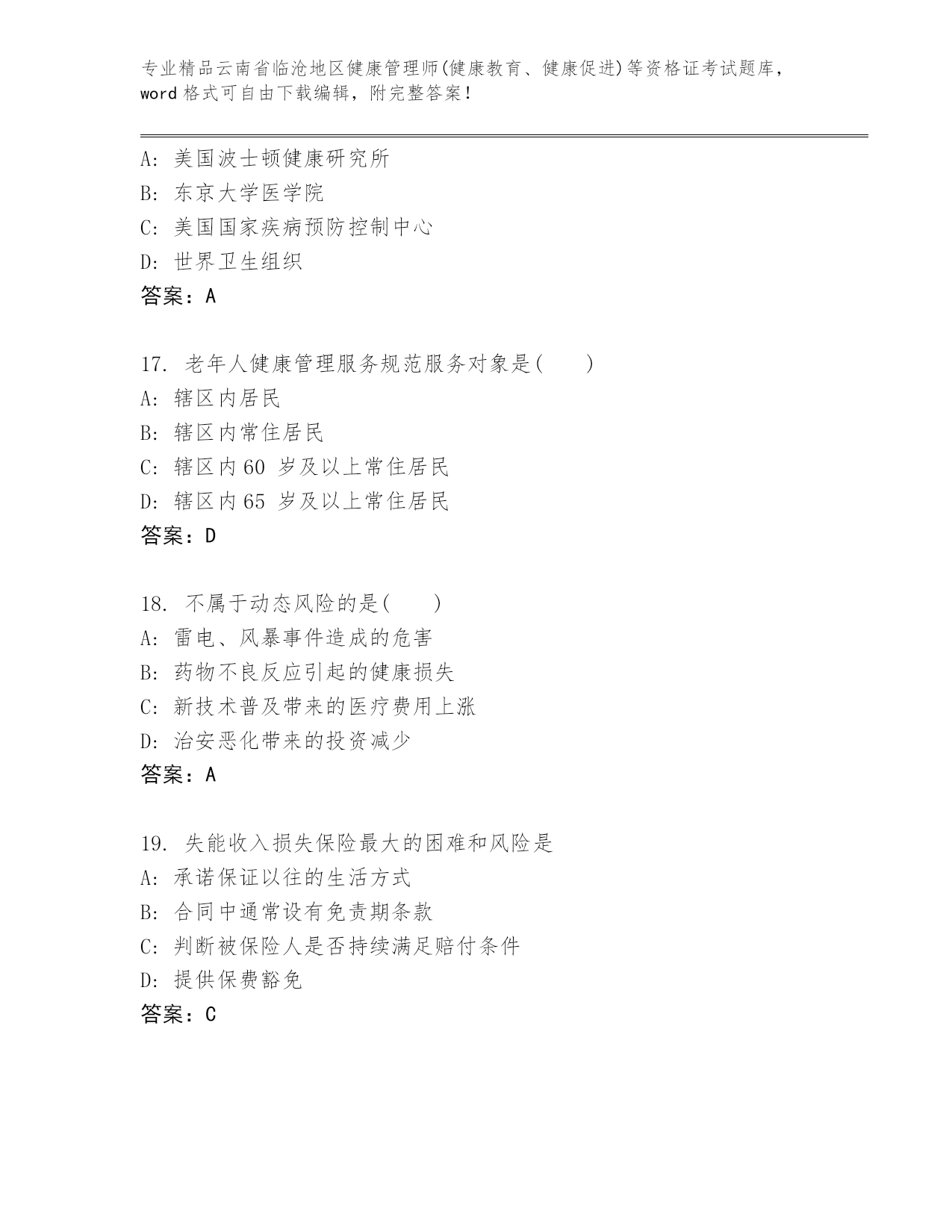 精品云南省临沧地区健康管理师(健康教育、健康促进)等资格证考试优选题库(培优).docx