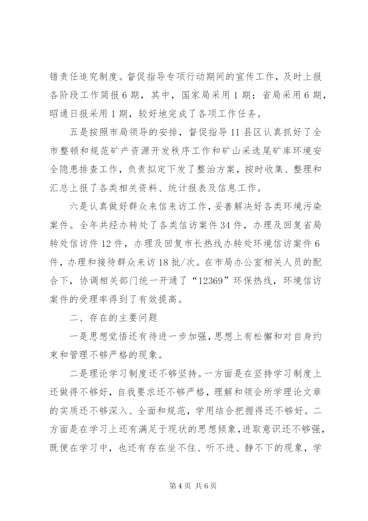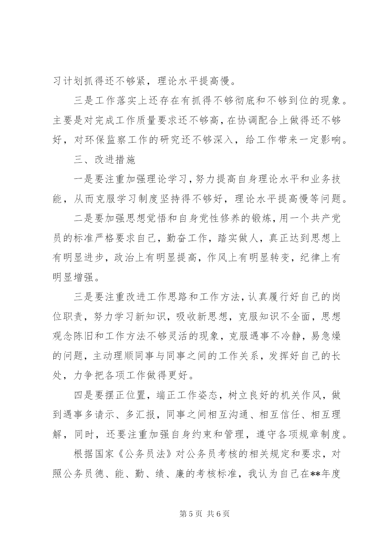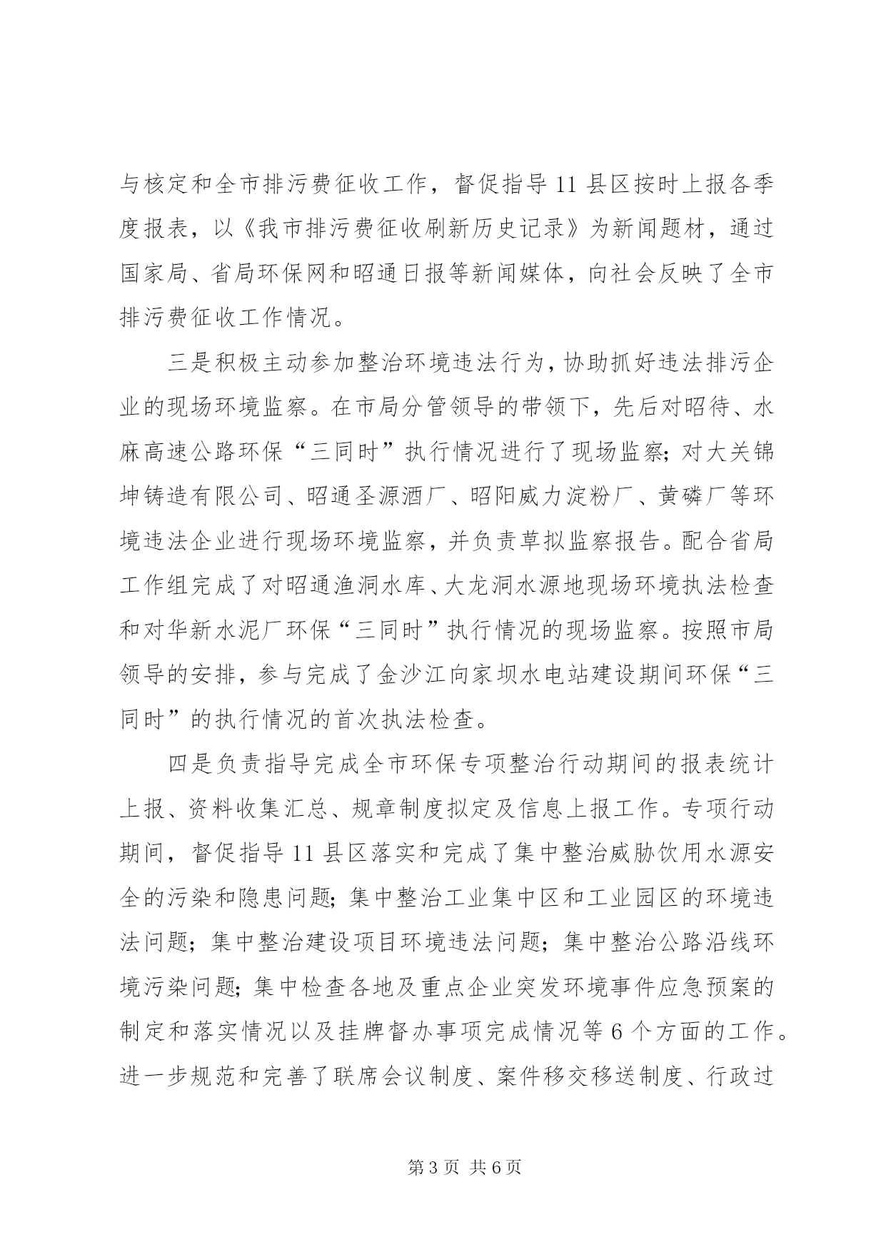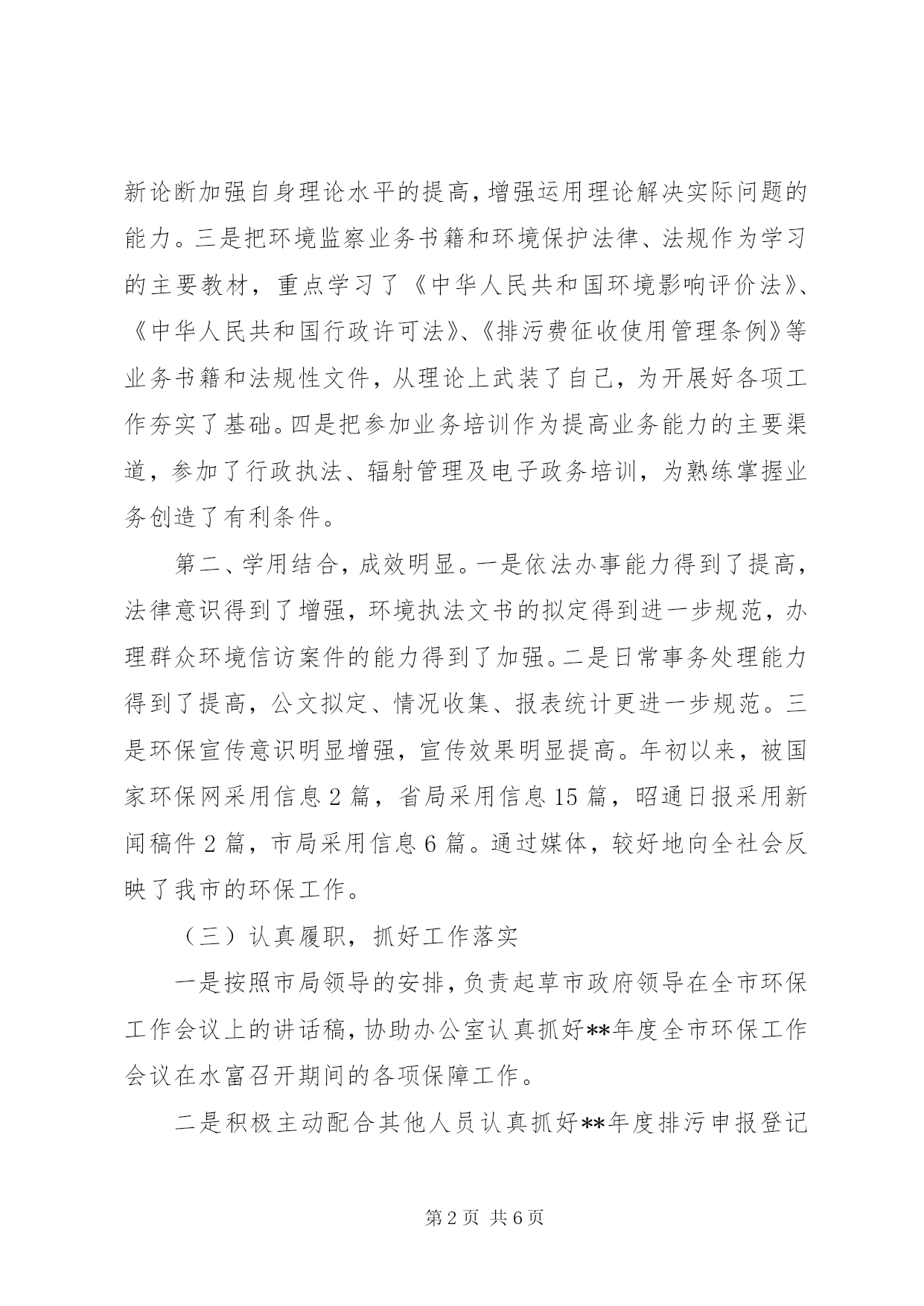 第PAGE\*Arabic\*MERGEFORMAT6页共NUMPAGES\*MERGEFORMAT6页环保公务员年度工作报告一年来,在局党组的统一领导下和全局职工的关心、支持和帮助下,按照市环境监察支队内设机构职能分工的要求,结合自身实际,围绕年度环保中心工作和环境监察支队的各项任务,认真履职,抓好落实,较好地完成了各项工作任务。一、**年度的思想、学习和工作情况(一)不断加强思想作风建设,思想政治觉悟得到提高一是在政治上头脑清醒,始终坚持与党的组织保持高度一致,理想信念坚定,政治纪律严明。二是在思想上不断加强世界观和人生观的改造,思想觉悟和党性修养得到了锻炼,思想稳定,作风扎实。三是在纪律上不断加强自身约束,始终把作风建设放在首位,坚持做到有损于环保形象的事不做,有损于环保形象的话不说,自觉维护环保部门在人民群众中的整体形象。(二)不断加强业务学习,业务能力得到提高第一、结合自身实际,按计划抓好理论学习。一是把邓小平理论作为学习的重点,始终坚持把学习邓小平理论与当前环境保护工作的目标和任务结合起来,在学习和领会解放思想、实事求是,开拓创新、力求实效上下功夫,在运用科学理论指导实际工作,解决实际问题上找差距。二是把党的十六届五中全会精神和“三个代表”重要思想作为学习的核心,按照全面落实科学发展观、构建社会主义和谐社会的要求,正确运用新思想、新观点、新论断加强自身理论水平的提高,增强运用理论解决实际问题的能力。三是把环境监察业务书籍和环境保护法律、法规作为学习的主要教材,重点学习了《中华人民共和国环境影响评价法》、《中华人民共和国行政许可法》、《排污费征收使用管理条例》等业务书籍和法规性文件,从理论上武装了自己,为开展好各项工作夯实了基础。四是把参加业务培训作为提高业务能力的主要渠道,参加了行政执法、辐射管理及电子政务培训,为熟练掌握业务创造了有利条件。第二、学用结合,成效明显。一是依法办事能力得到了提高,法律意识得到了增强,环境执法文书的拟定得到进一步规范,办理群众环境信访案件的能力得到了加强。二是日常事务处理能力得到了提高,公文拟定、情况收集、报表统计更进一步规范。三是环保宣传意识明显增强,宣传效果明显提高。年初以来,被国家环保网采用信息2篇,省局采用信息15篇,昭通日报采用新闻稿件2篇,市局采用信息6篇。通过媒体,较好地向全社会反映了我市的环保工作。(三)认真履职,抓好工作落实一是按照市局领导的安排,负责起草市政府领导在全市环保工作会议上的讲话稿,协助办公室认真抓好**年度全市环保工作会议在水富召开期间的各项保障工作。二是积极主动配合其他人员认真抓好**年度排污申报登记与核定和全市排污费征收工作,督促指导11县区按时上报各季度报表,以《我市排污费征收刷新历史记录》为新闻题材,通过国家局、省局环保网和昭通日报等新闻媒体,向社会反映了全市排污费征收工作情况。三是积极主动参加整治环境违法行为,协助抓好违法排污企业的现场环境监察。在市局分管领导的带领下,先后对昭待、水麻高速公路环保“三同时”执行情况进行了现场监察;对大关锦坤铸造有限公司、昭通圣源酒厂、昭阳威力淀粉厂、黄磷厂等环境违法企业进行现场环境监察,并负责草拟监察报告。配合省局工作组完成了对昭通渔洞水库、大龙洞水源地现场环境执法检查和对华新水泥厂环保“三同时”执行情况的现场监察。按照市局领导的安排,参与完成了金沙江向家坝水电站建设期间环保“三同时”的执行情况的首次执法检查。四是负责指导完成全市环保专项整治行动期间的报表统计上报、资料收集汇总、规章制度拟定及信息上报工作。专项行动期间,督促指导11县区落实和完成了集中整治威胁饮用水源安全的污染和隐患问题;集中整治工业集中区和工业园区的环境违法问题;集中整治建设项目环境违法问题;集中整治公路沿线环境污染问题;集中检查各地及重点企业突发环境事件应急预案的制定和落实情况以及挂牌督办事项完成情况等6个方面的工作。进一步规范和完善了联席会议制度、案件移交移送制度、行政过错责任追究制度。督促指导专项行动期间的宣传工作,及时上报各阶段工作简报6期,其中,国家局采用1期;省局采用6期,昭通日报采用1期,较好地完成了各项工作任务。五是按照市局领导的安排,督促指导11县区认真抓好了全市整顿和规范矿产资源开发秩序工作和矿山采选尾矿库环境安全隐患排查工作,负责拟定下发了整治方案,按时收集、整理和汇总上报了各类相关资料、统计报表及信息工作。六是认真做好群众来信来访工作,妥善解决好各类环境污染案件。全年共经办转处了各类信访案件34件,办理及回复省局转处信访件12件,办理及回复市长热线办转处环境信访案件6件,办理和接待群众来访18批/次。在市局办公室相关人员的配合下,协调相关部门统一开通了“12369”环保热线,环境信访案件的受理