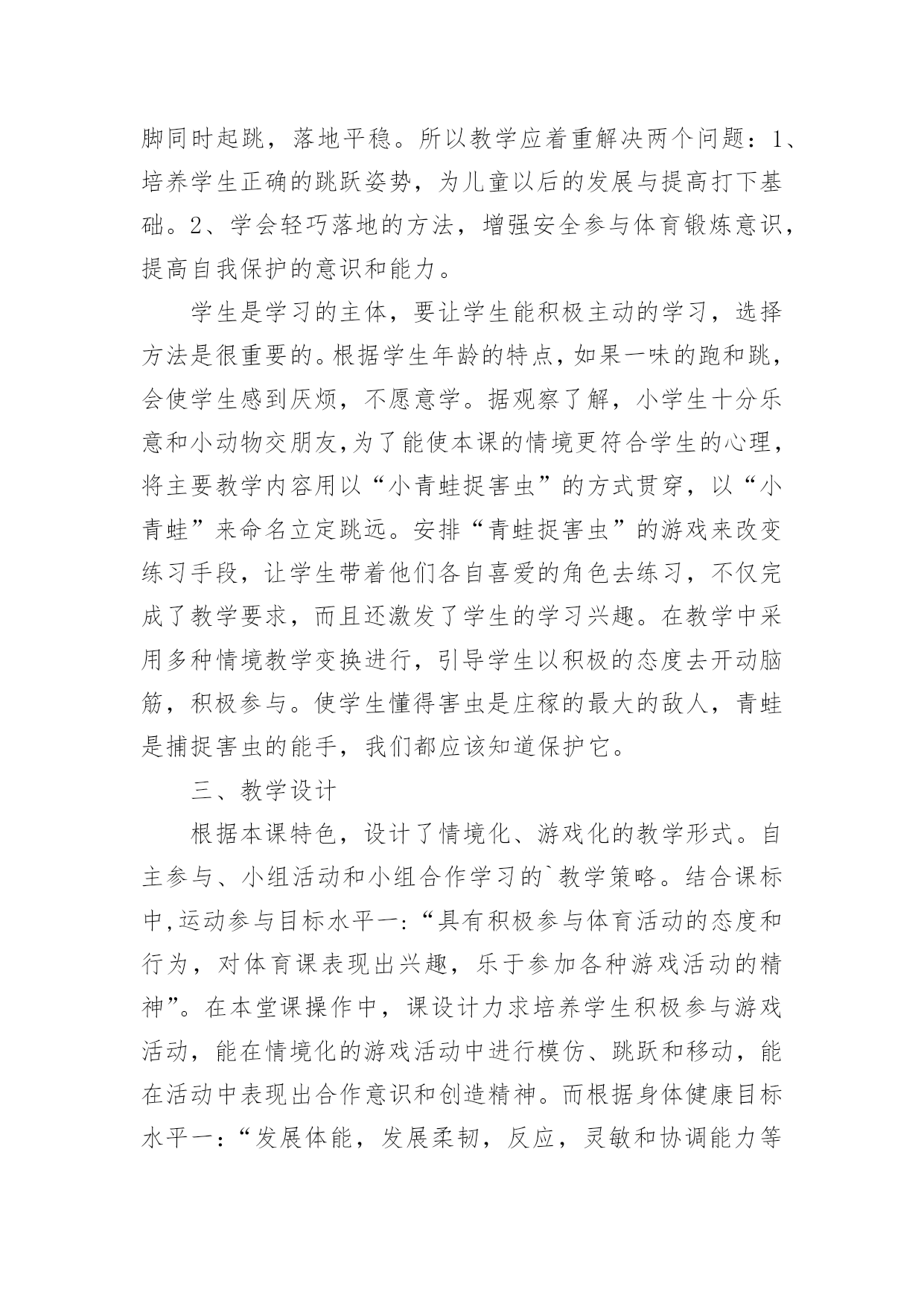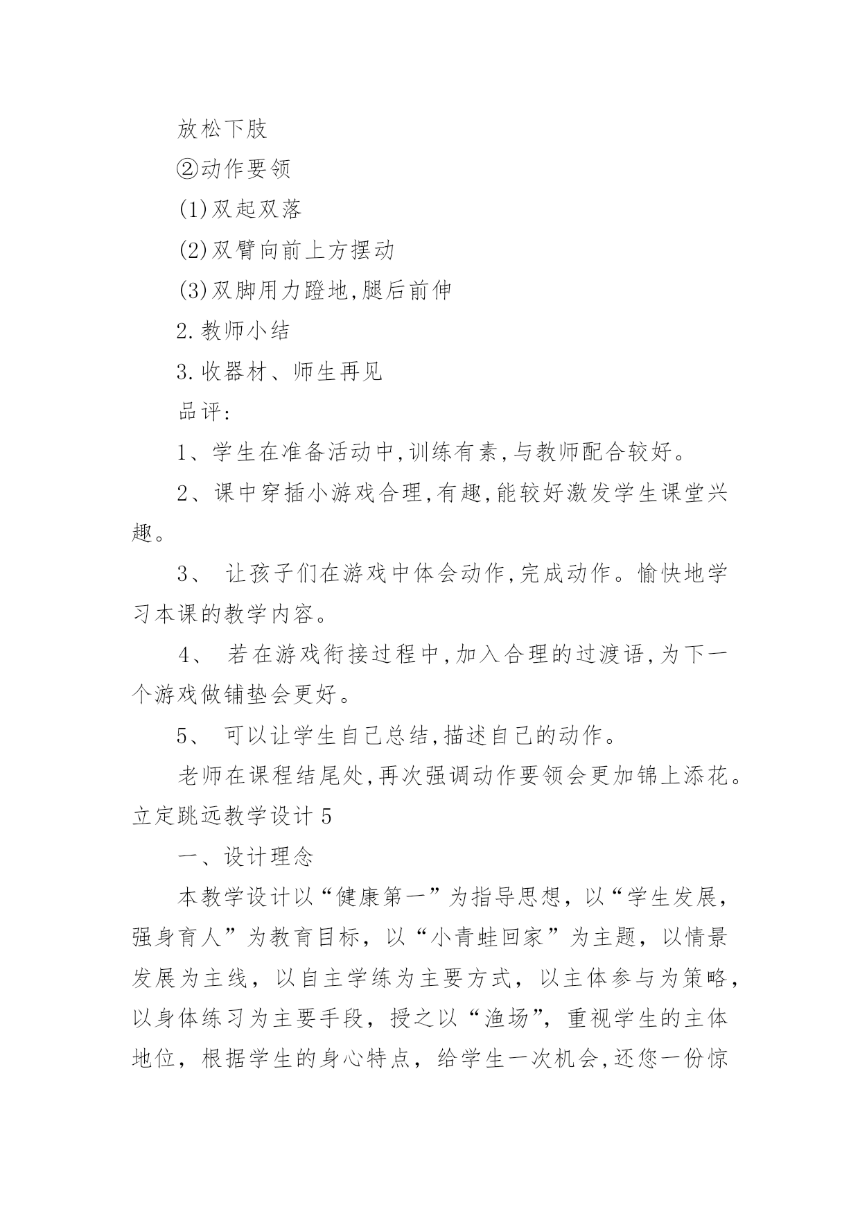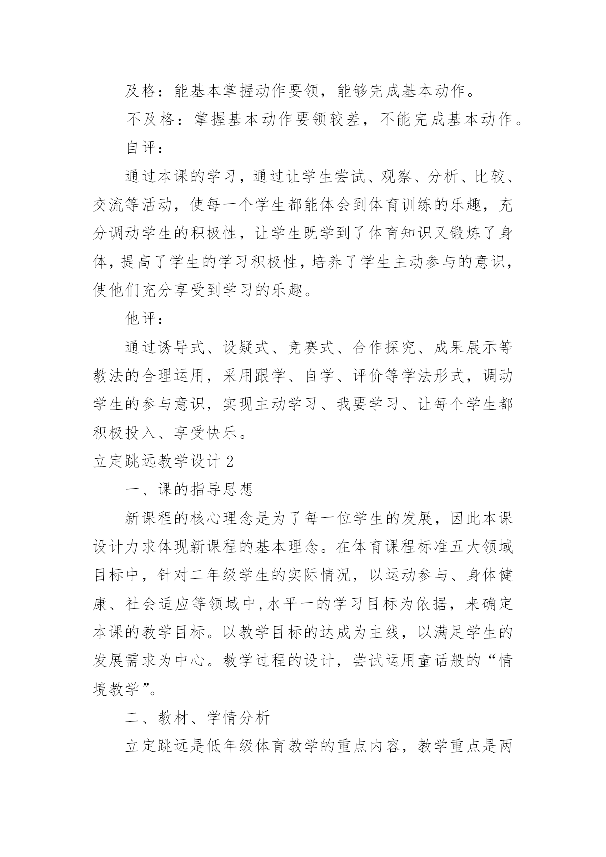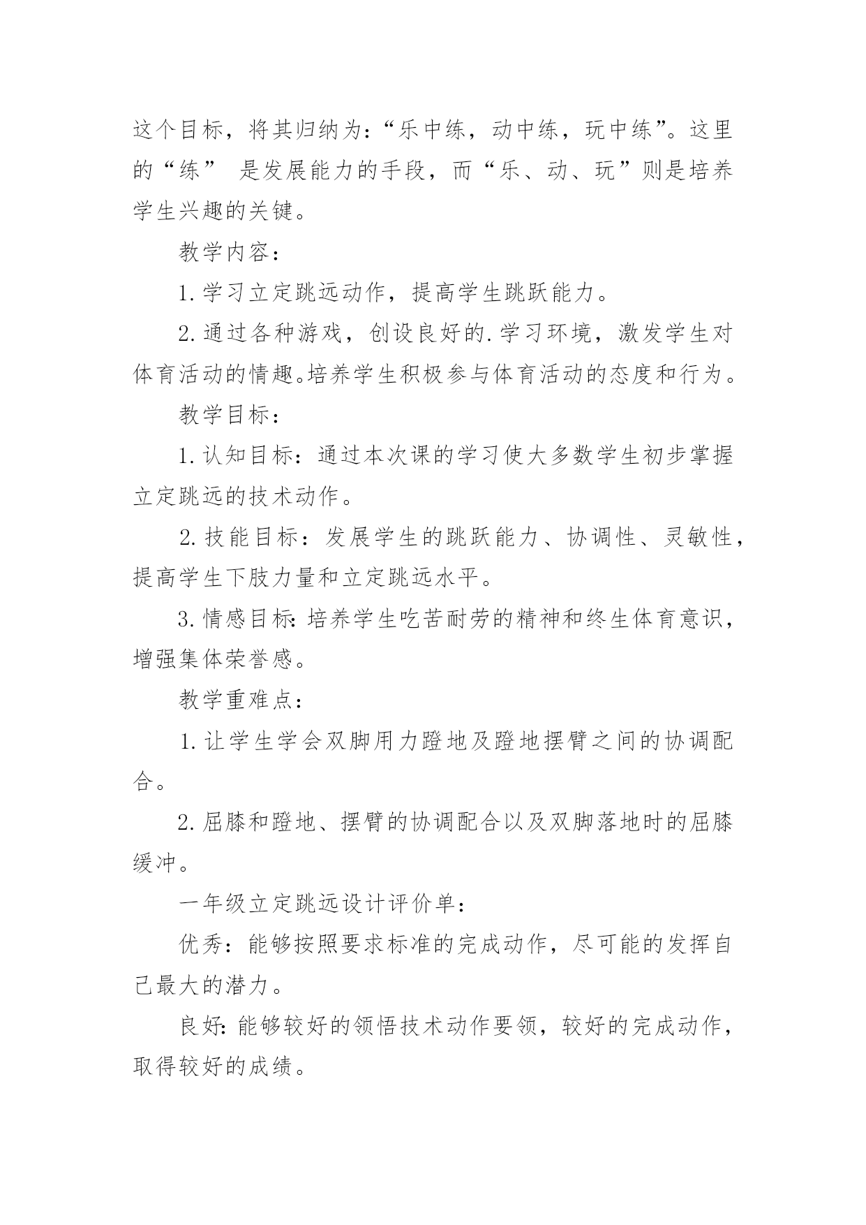 立定跳远教学设计立定跳远教学设计作为一名专为他人授业解惑的人民教师,有必要进行细致的教学设计准备工作,教学设计是根据课程标准的要求和教学对象的特点,将教学诸要素有序安排,确定合适的教学方案的设想和计划。那么什么样的教学设计才是好的呢?以下是小编为大家整理的立定跳远教学设计,希望能够帮助到大家。立定跳远教学设计1教材分析:本课教学对象是低年级学生,自控能力与认知能力均较差,但是低年级小朋友具有好动、好玩、好思考等特点。应抓住这一特点,在立定跳远教学时,综合运用练习、思考、探索、讨论等教学方法,在教师引导下,逐渐完成探疑过程。这样不但学会了立定跳远的动作,而且培养了学生分析问题、解决问题的能力。另外,要使游戏活动贯穿教学的全过程,使体育教学的进行与游戏有机地结合起来,让学生始终沉浸在良性的学习氛围中自觉、自主、能动地学习。设计理念:充分发挥学生的主体作用,是优化教学过程,提高教学效率的关键。培养学生对体育活动的兴趣,提高学生参与体育活动的积极性是小学阶段体育课的重要目标之一,为达到这个目标,将其归纳为:“乐中练,动中练,玩中练”。这里的“练”是发展能力的手段,而“乐、动、玩”则是培养学生兴趣的关键。教学内容:1.学习立定跳远动作,提高学生跳跃能力。2.通过各种游戏,创设良好的.学习环境,激发学生对体育活动的情趣。培养学生积极参与体育活动的态度和行为。教学目标:1.认知目标:通过本次课的学习使大多数学生初步掌握立定跳远的技术动作。2.技能目标:发展学生的跳跃能力、协调性、灵敏性,提高学生下肢力量和立定跳远水平。3.情感目标:培养学生吃苦耐劳的精神和终生体育意识,增强集体荣誉感。教学重难点:1.让学生学会双脚用力蹬地及蹬地摆臂之间的协调配合。2.屈膝和蹬地、摆臂的协调配合以及双脚落地时的屈膝缓冲。一年级立定跳远设计评价单:优秀:能够按照要求标准的完成动作,尽可能的发挥自己最大的潜力。良好:能够较好的领悟技术动作要领,较好的完成动作,取得较好的成绩。及格:能基本掌握动作要领,能够完成基本动作。不及格:掌握基本动作要领较差,不能完成基本动作。自评:通过本课的学习,通过让学生尝试、观察、分析、比较、交流等活动,使每一个学生都能体会到体育训练的乐趣,充分调动学生的积极性,让学生既学到了体育知识又锻炼了身体,提高了学生的学习积极性,培养了学生主动参与的意识,使他们充分享受到学习的乐趣。他评:通过诱导式、设疑式、竞赛式、合作探究、成果展示等教法的合理运用,采用跟学、自学、评价等学法形式,调动学生的参与意识,实现主动学习、我要学习、让每个学生都积极投入、享受快乐。立定跳远教学设计2一、课的指导思想新课程的核心理念是为了每一位学生的发展,因此本课设计力求体现新课程的基本理念。在体育课程标准五大领域目标中,针对二年级学生的实际情况,以运动参与、身体健康、社会适应等领域中,水平一的学习目标为依据,来确定本课的教学目标。以教学目标的达成为主线,以满足学生的发展需求为中心。教学过程的设计,尝试运用童话般的“情境教学”。二、教材、学情分析立定跳远是低年级体育教学的重点内容,教学重点是两脚同时起跳,落地平稳。所以教学应着重解决两个问题:1、培养学生正确的跳跃姿势,为儿童以后的发展与提高打下基础。2、学会轻巧落地的方法,增强安全参与体育锻炼意识,提高自我保护的意识和能力。学生是学习的主体,要让学生能积极主动的学习,选择方法是很重要的。根据学生年龄的特点,如果一味的跑和跳,会使学生感到厌烦,不愿意学。据观察了解,小学生十分乐意和小动物交朋友,为了能使本课的情境更符合学生的心理,将主要教学内容用以“小青蛙捉害虫”的方式贯穿,以“小青蛙”来命名立定跳远。安排“青蛙捉害虫”的游戏来改变练习手段,让学生带着他们各自喜爱的角色去练习,不仅完成了教学要求,而且还激发了学生的学习兴趣。在教学中采用多种情境教学变换进行,引导学生以积极的态度去开动脑筋,积极参与。使学生懂得害虫是庄稼的最大的敌人,青蛙是捕捉害虫的能手,我们都应该知道保护它。三、教学设计根据本课特色,设计了情境化、游戏化的教学形式。自主参与、小组活动和小组合作学习的`教学策略。结合课标中,运动参与目标水平一:“具有积极参与体育活动的态度和行为,对体育课表现出兴趣,乐于参加各种游戏活动的精神”。在本堂课操作中,课设计力求培养学生积极参与游戏活动,能在情境化的游戏活动中进行模仿、跳跃和移动,能在活动中表现出合作意识和创造精神。而根据身体健康目标水平一:“发展体能,发展柔韧,反应,灵敏和协调能力等要求”。在本课堂练习中学生在进入害虫角色的游戏活动中不断地积极地进行移动和模仿练习,达到了发展柔韧、协调和灵敏等课标的精神。而本课设计体现出能在活动中表现出合作意识和创新精神也符合了社会适应目标:“具有良好的合作精神和体育道德,