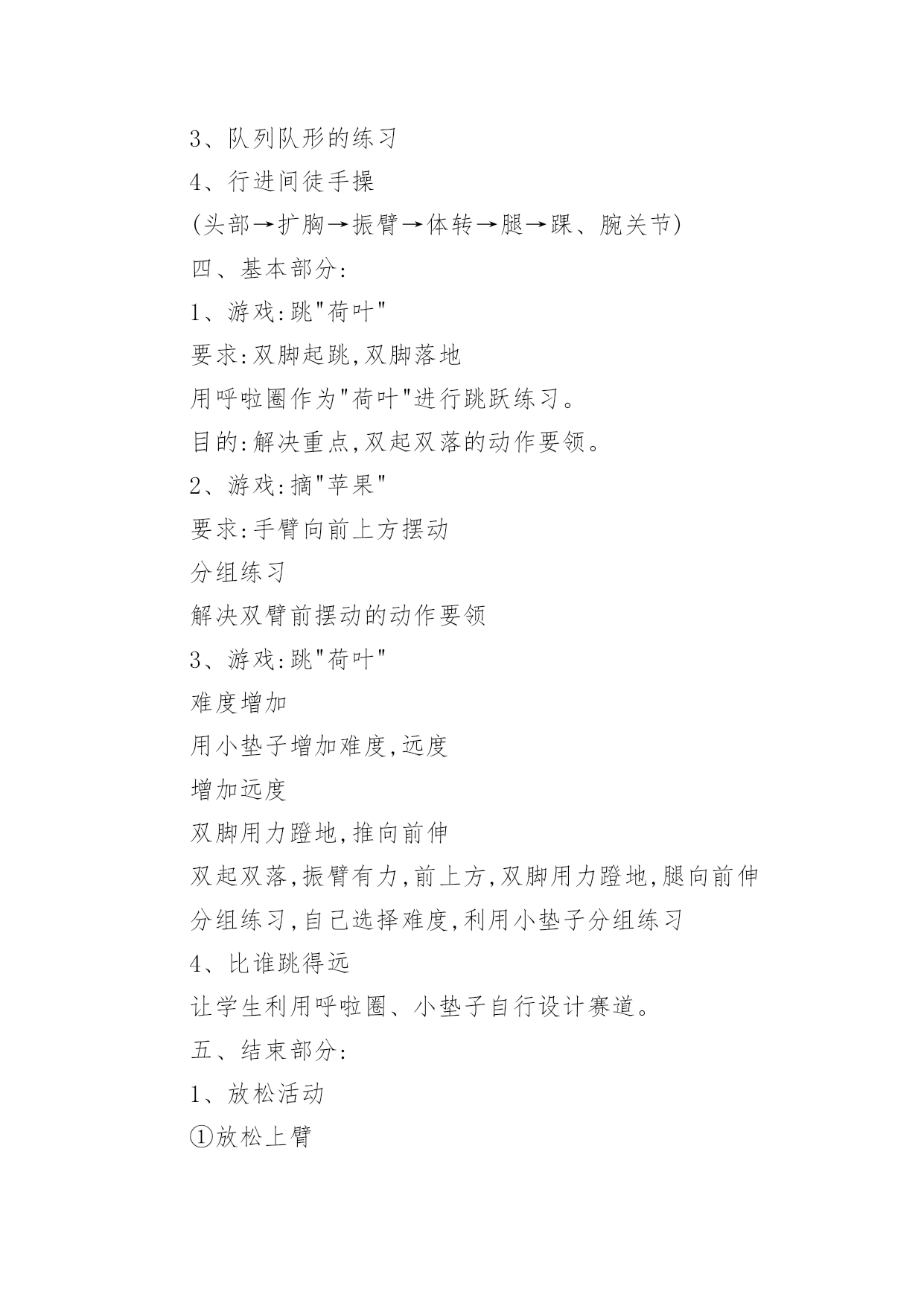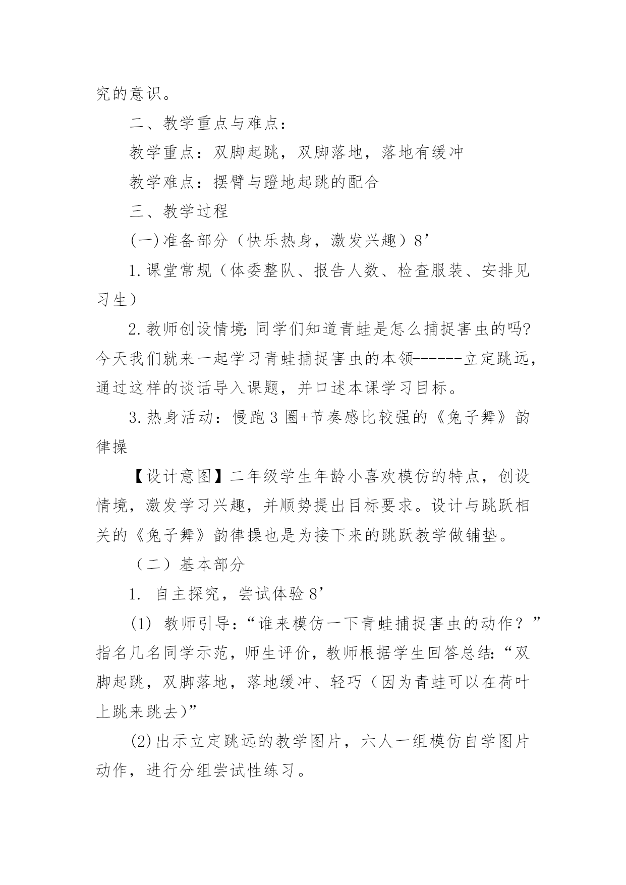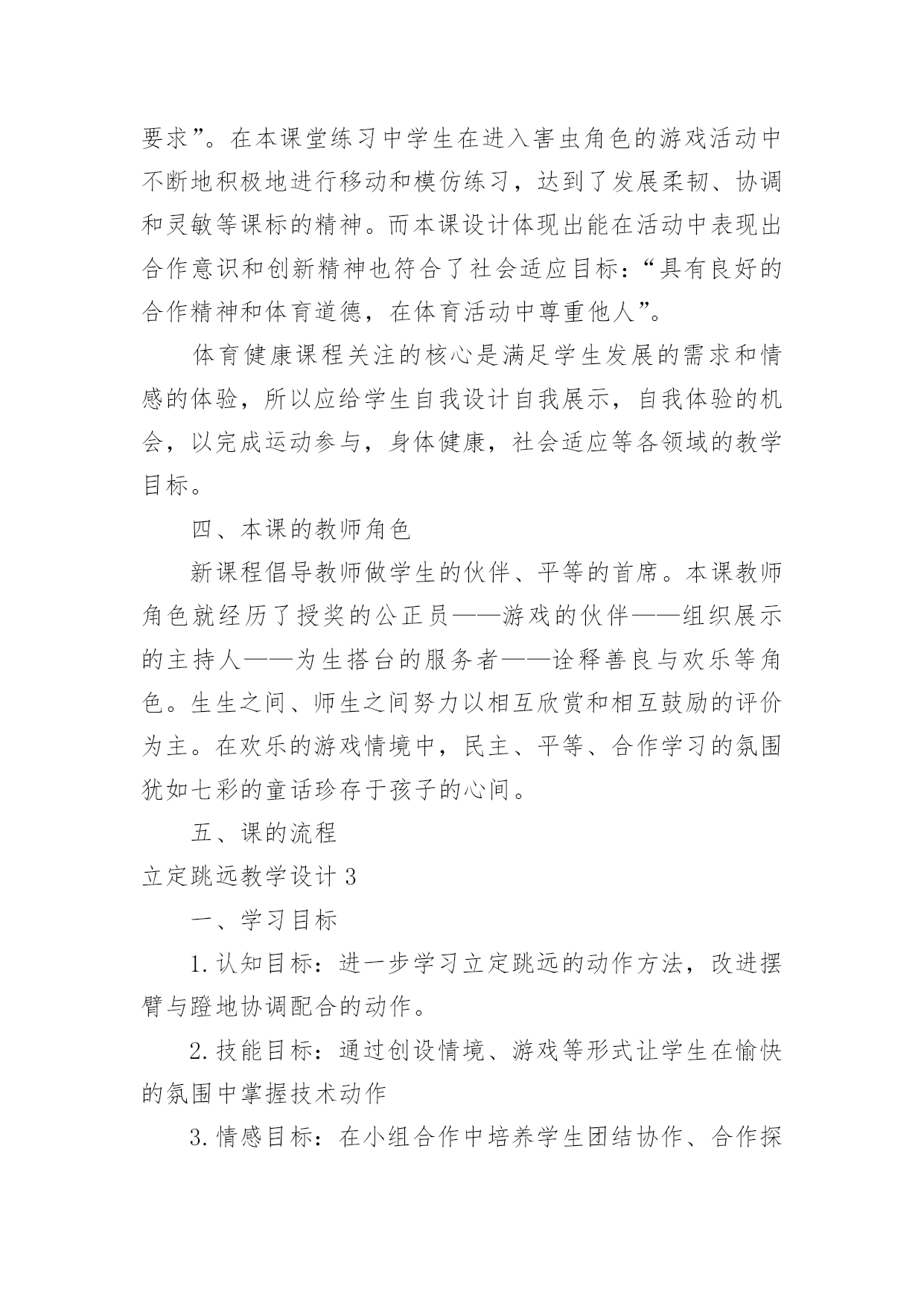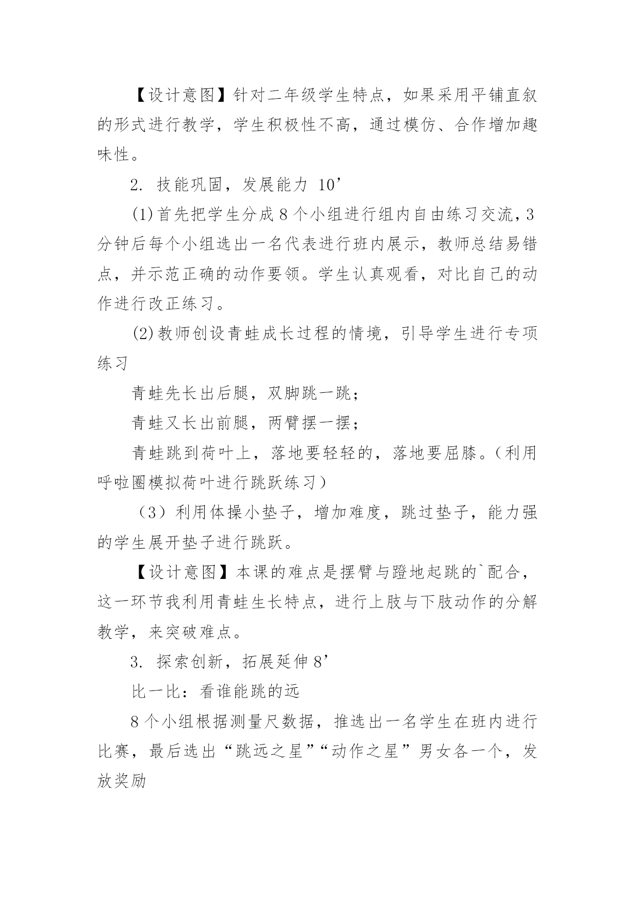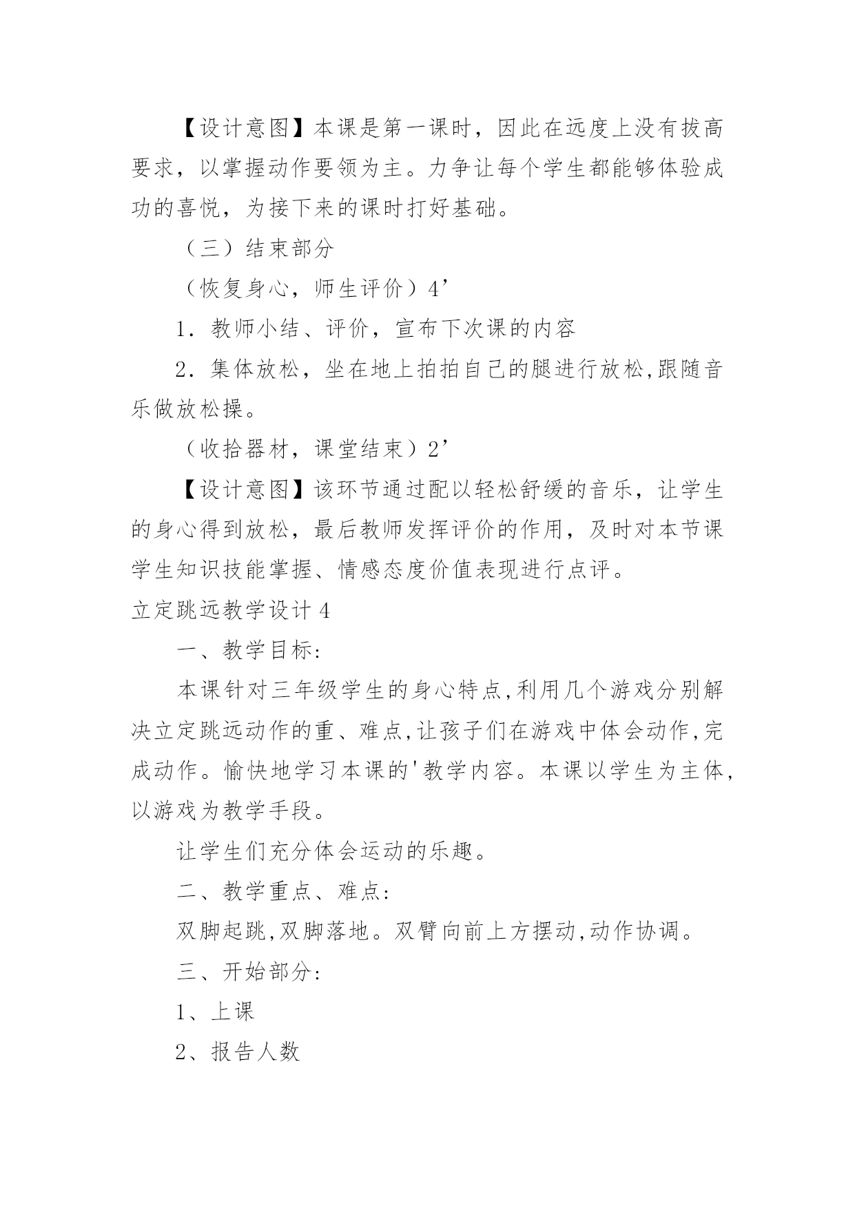 立定跳远教学设计立定跳远教学设计作为一名专为他人授业解惑的人民教师,有必要进行细致的教学设计准备工作,教学设计是根据课程标准的要求和教学对象的特点,将教学诸要素有序安排,确定合适的教学方案的设想和计划。那么什么样的教学设计才是好的呢?以下是小编为大家整理的立定跳远教学设计,希望能够帮助到大家。立定跳远教学设计1教材分析:本课教学对象是低年级学生,自控能力与认知能力均较差,但是低年级小朋友具有好动、好玩、好思考等特点。应抓住这一特点,在立定跳远教学时,综合运用练习、思考、探索、讨论等教学方法,在教师引导下,逐渐完成探疑过程。这样不但学会了立定跳远的动作,而且培养了学生分析问题、解决问题的能力。另外,要使游戏活动贯穿教学的全过程,使体育教学的进行与游戏有机地结合起来,让学生始终沉浸在良性的学习氛围中自觉、自主、能动地学习。设计理念:充分发挥学生的主体作用,是优化教学过程,提高教学效率的关键。培养学生对体育活动的兴趣,提高学生参与体育活动的积极性是小学阶段体育课的重要目标之一,为达到这个目标,将其归纳为:“乐中练,动中练,玩中练”。这里的“练”是发展能力的手段,而“乐、动、玩”则是培养学生兴趣的关键。教学内容:1.学习立定跳远动作,提高学生跳跃能力。2.通过各种游戏,创设良好的.学习环境,激发学生对体育活动的情趣。培养学生积极参与体育活动的态度和行为。教学目标:1.认知目标:通过本次课的学习使大多数学生初步掌握立定跳远的技术动作。2.技能目标:发展学生的跳跃能力、协调性、灵敏性,提高学生下肢力量和立定跳远水平。3.情感目标:培养学生吃苦耐劳的精神和终生体育意识,增强集体荣誉感。教学重难点:1.让学生学会双脚用力蹬地及蹬地摆臂之间的协调配合。2.屈膝和蹬地、摆臂的协调配合以及双脚落地时的屈膝缓冲。一年级立定跳远设计评价单:优秀:能够按照要求标准的完成动作,尽可能的发挥自己最大的潜力。良好:能够较好的领悟技术动作要领,较好的完成动作,取得较好的成绩。及格:能基本掌握动作要领,能够完成基本动作。不及格:掌握基本动作要领较差,不能完成基本动作。自评:通过本课的学习,通过让学生尝试、观察、分析、比较、交流等活动,使每一个学生都能体会到体育训练的乐趣,充分调动学生的积极性,让学生既学到了体育知识又锻炼了身体,提高了学生的学习积极性,培养了学生主动参与的意识,使他们充分享受到学习的乐趣。他评:通过诱导式、设疑式、竞赛式、合作探究、成果展示等教法的合理运用,采用跟学、自学、评价等学法形式,调动学生的参与意识,实现主动学习、我要学习、让每个学生都积极投入、享受快乐。立定跳远教学设计2一、课的指导思想新课程的核心理念是为了每一位学生的发展,因此本课设计力求体现新课程的基本理念。在体育课程标准五大领域目标中,针对二年级学生的实际情况,以运动参与、身体健康、社会适应等领域中,水平一的学习目标为依据,来确定本课的教学目标。以教学目标的达成为主线,以满足学生的发展需求为中心。教学过程的设计,尝试运用童话般的“情境教学”。二、教材、学情分析立定跳远是低年级体育教学的重点内容,教学重点是两脚同时起跳,落地平稳。所以教学应着重解决两个问题:1、培养学生正确的跳跃姿势,为儿童以后的发展与提高打下基础。2、学会轻巧落地的方法,增强安全参与体育锻炼意识,提高自我保护的意识和能力。学生是学习的主体,要让学生能积极主动的学习,选择方法是很重要的。根据学生年龄的特点,如果一味的跑和跳,会使学生感到厌烦,不愿意学。据观察了解,小学生十分乐意和小动物交朋友,为了能使本课的情境更符合学生的心理,将主要教学内容用以“小青蛙捉害虫”的方式贯穿,以“小青蛙”来命名立定跳远。安排“青蛙捉害虫”的游戏来改变练习手段,让学生带着他们各自喜爱的角色去练习,不仅完成了教学要求,而且还激发了学生的学习兴趣。在教学中采用多种情境教学变换进行,引导学生以积极的态度去开动脑筋,积极参与。使学生懂得害虫是庄稼的最大的敌人,青蛙是捕捉害虫的能手,我们都应该知道保护它。三、教学设计根据本课特色,设计了情境化、游戏化的教学形式。自主参与、小组活动和小组合作学习的`教学策略。结合课标中,运动参与目标水平一:“具有积极参与体育活动的态度和行为,对体育课表现出兴趣,乐于参加各种游戏活动的精神”。在本堂课操作中,课设计力求培养学生积极参与游戏活动,能在情境化的游戏活动中进行模仿、跳跃和移动,能在活动中表现出合作意识和创造精神。而根据身体健康目标水平一:“发展体能,发展柔韧,反应,灵敏和协调能力等要求”。在本课堂练习中学生在进入害虫角色的游戏活动中不断地积极地进行移动和模仿练习,达到了发展柔韧、协调和灵敏等课标的精神。而本课设计体现出能在活动中表现出合作意识和创新精神也符合了社会适应目标:“具有良好的合作精神和体育道德,