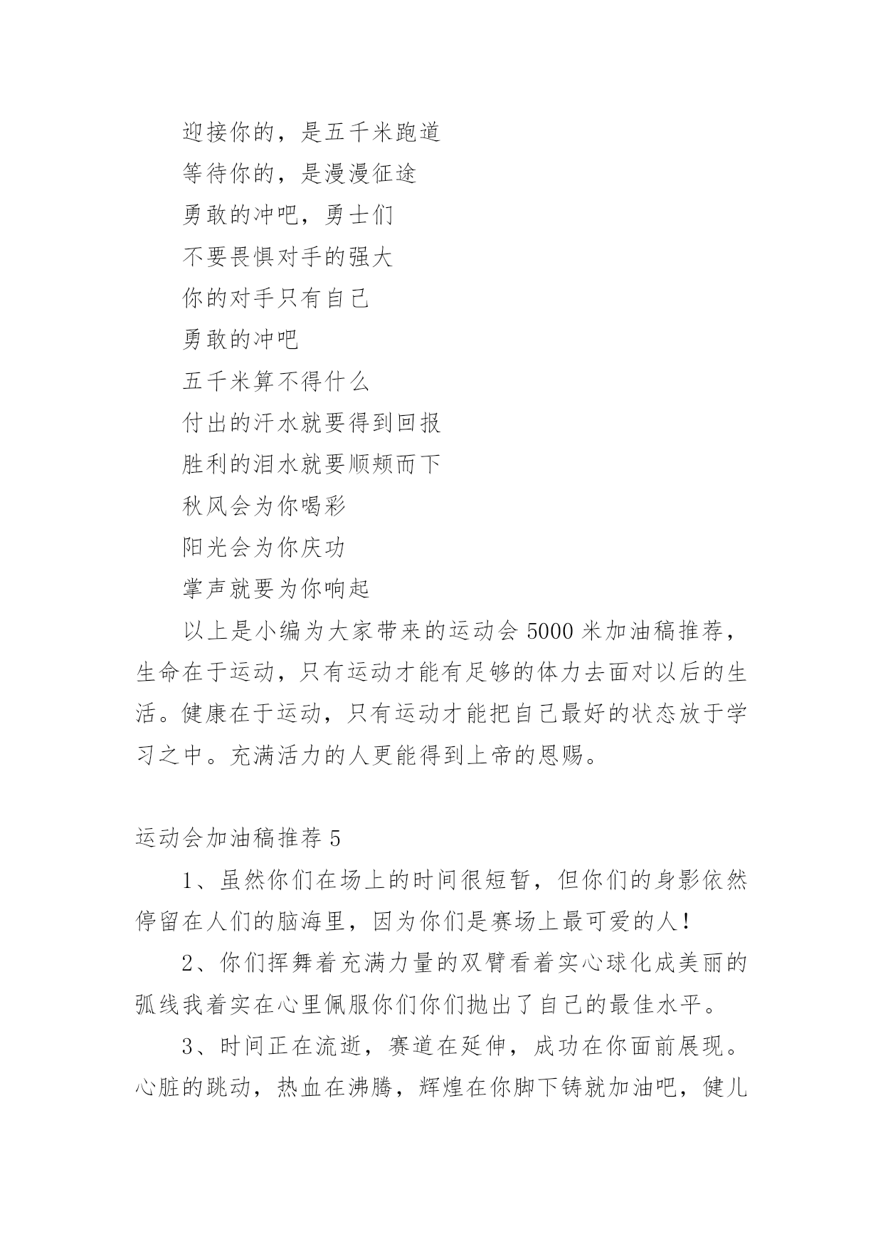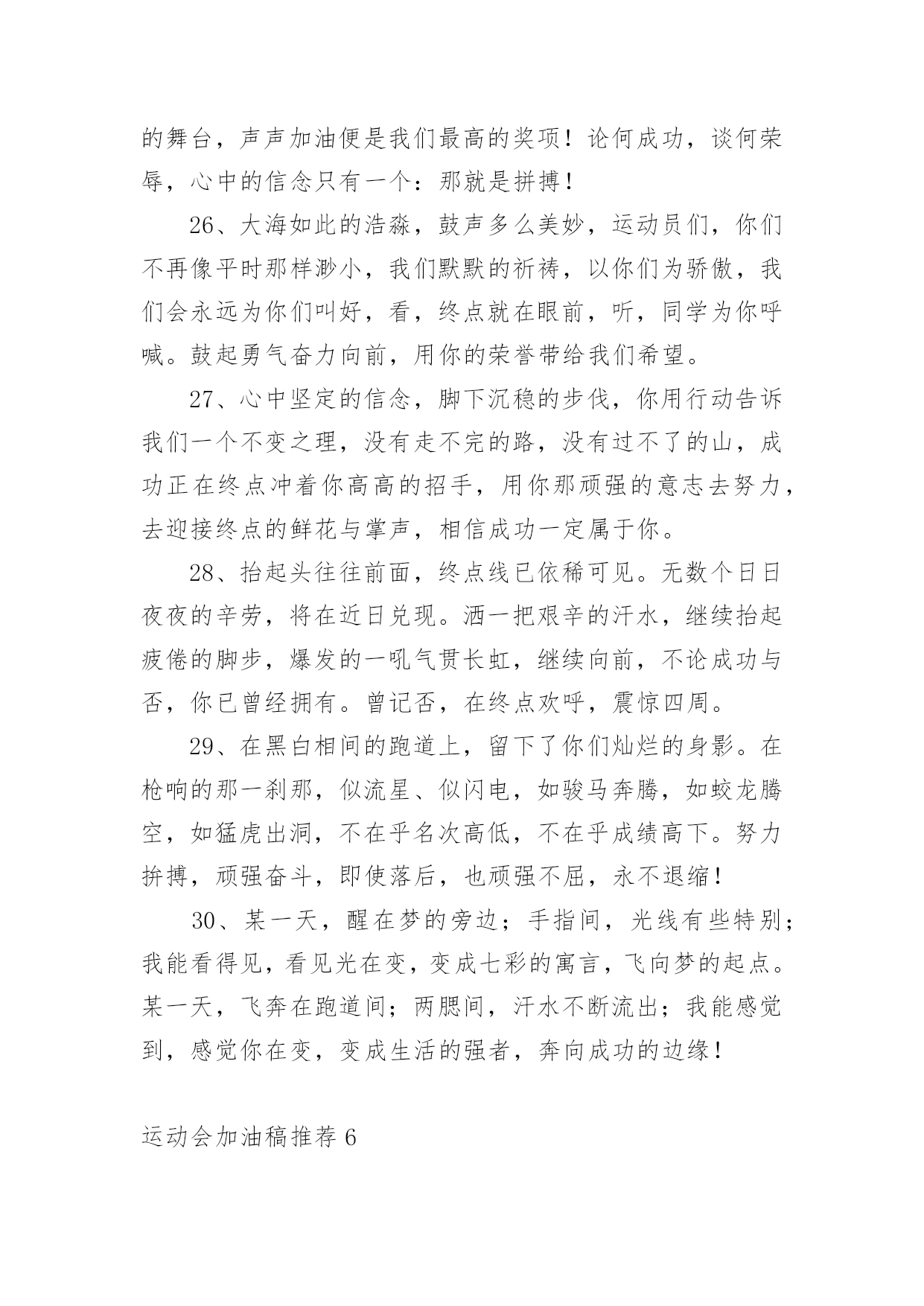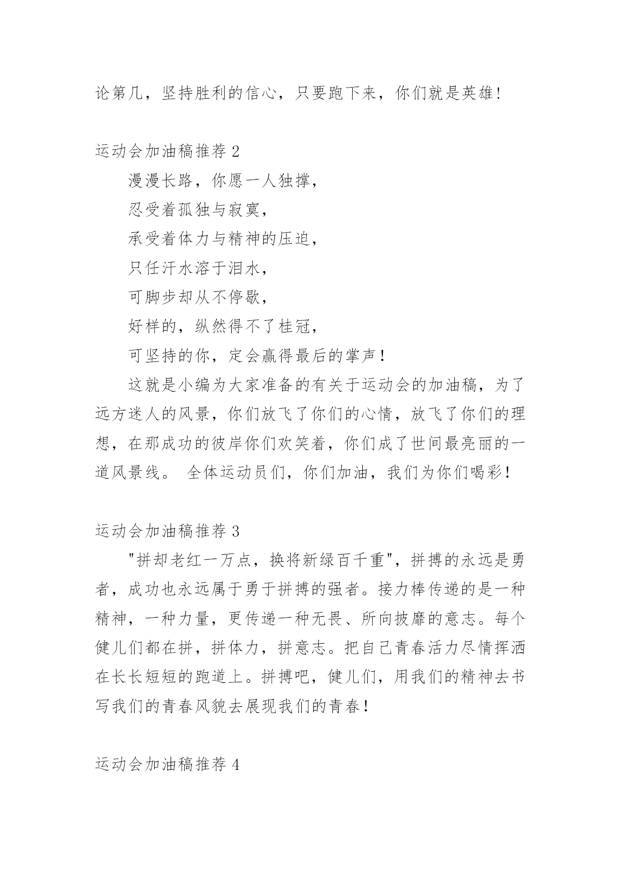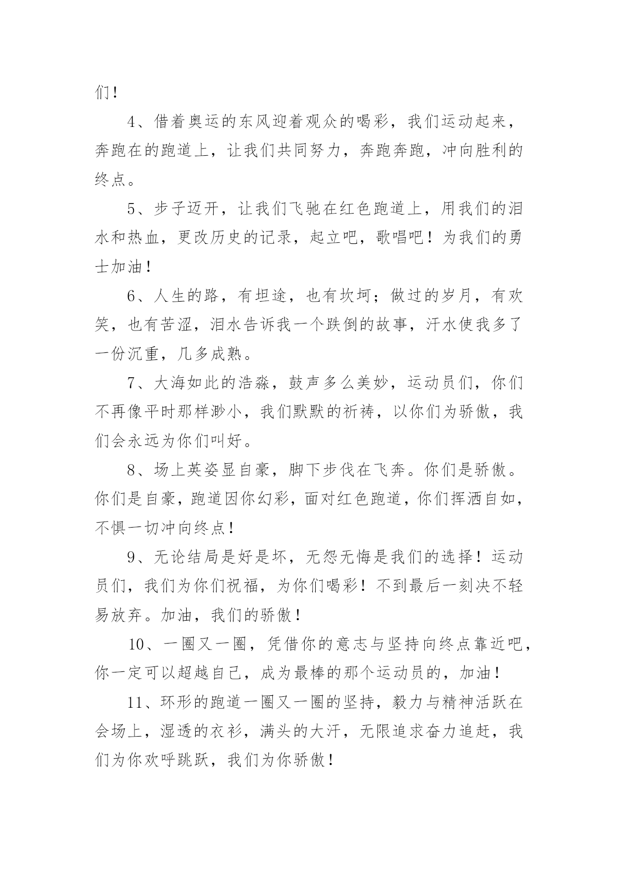 运动会加油稿运动会加油稿推荐随着社会一步步向前发展,越来越多地方需要用到加油稿,加油稿可以激励对方更好地参加活动。写起加油稿来就毫无头绪?下面是小编为大家整理的运动会加油稿推荐,欢迎大家借鉴与参考,希望对大家有所帮助。运动会加油稿推荐11)不为鲜花的围绕,不为刹那的荣耀,只有执着的信念,化作不停的奔跑,心中燃烧着梦想,脚下不停的步伐!2)汗水,泪水;笑声,歌声;我们尽情挥洒。开幕式上,运动场上,我们尽情展现,多少艰辛,多少困苦,我们勇敢承担。因为年轻,因为张扬,因为我们知道:用今天的汗水换来明天的微笑。3)青春的脚步,青春的速度,青春的活力,青春的激情,将会在你们的身上尽情体现。迎接自我,挑战自我,战胜自我!我们相信你们一定能行,加油吧,运动员!终点就在眼前!4)心中坚定的信念,脚下沉稳的步伐,你用行动告诉我们一个不变之理,没有走不完的路,没有过不了的山,成功正在终点冲着你高高的招手,用你那顽强的意志去努力,去迎接终点的鲜花与掌声,相信成功一定是属于你。5)不为掌声的注释,不为刻意的征服,不为失败的痛苦,只有辛勤的汗水,化作成功的脚步!6)不为掌声的诠释,不为刻意的征服,只有辛勤的汗水化作追求的脚步,心中坚定的信念,脚下沉稳的步伐,你用行动诉说着一个不变的真理,没有比脚更长的路,没有比人更高的山,希望在终点向你招手,努力吧!用你坚韧不拔的毅志,去迎接终点的鲜花与掌声,相信成功属于你。7)困难和胜利都在向你招手,去呀,快去呀,不要犹豫。8)你用行动述说着过程的重要,没有无尽的终点,没有无法攀登的险峰,希望载着终点在向你微笑,拼搏吧!经历是一种精彩,迸发你全部的能量,成功是你汗水的写照。9)运动健将们,用你的实力,用你的精神,去开拓出,一片属于你的长跑天地!10)温暖的阳光洒在赛场上,男子乙组标枪的比赛即将开始。赛场上,一道道优美的弧线将轻盈地划过天空。健儿们用手中的标枪向距离的权限发起一轮又一轮的挑战。标枪在空中轻盈的姿态,是健儿们强健的力量和熟练的技巧的结合。谁能在这场激烈的竞争中获胜?让我们拭目以待,让我们为他们呐喊、助威吧!只有将力量与技巧合二为一的人,才能获得胜利的桂冠!11)泥泞的路走过无数,累了,告诉自己:快了,再坚持一会儿。身上的伤流出血来,疼了,告诉自己:别哭,会好的。摔到了,告诉自己:快爬起来,世上很少有坦途。12)不长不短的距离,需要的是全身心全程投入;自始至终,你们都在拼全力;此时此刻,你们处在最风光的一刻;无论第几,坚持胜利的信心,只要跑下来,你们就是英雄!运动会加油稿推荐2漫漫长路,你愿一人独撑,忍受着孤独与寂寞,承受着体力与精神的压迫,只任汗水溶于泪水,可脚步却从不停歇,好样的,纵然得不了桂冠,可坚持的你,定会赢得最后的掌声!这就是小编为大家准备的有关于运动会的加油稿,为了远方迷人的风景,你们放飞了你们的心情,放飞了你们的理想,在那成功的彼岸你们欢笑着,你们成了世间最亮丽的一道风景线。全体运动员们,你们加油,我们为你们喝彩!运动会加油稿推荐3"拼却老红一万点,换将新绿百千重",拼搏的永远是勇者,成功也永远属于勇于拼搏的强者。接力棒传递的是一种精神,一种力量,更传递一种无畏、所向披靡的意志。每个健儿们都在拼,拼体力,拼意志。把自己青春活力尽情挥洒在长长短短的跑道上。拼搏吧,健儿们,用我们的精神去书写我们的青春风貌去展现我们的青春!运动会加油稿推荐4迎接你的,是五千米跑道等待你的,是漫漫征途勇敢的冲吧,勇士们不要畏惧对手的强大你的对手只有自己勇敢的冲吧五千米算不得什么付出的汗水就要得到回报胜利的泪水就要顺颊而下秋风会为你喝彩阳光会为你庆功掌声就要为你响起以上是小编为大家带来的运动会5000米加油稿推荐,生命在于运动,只有运动才能有足够的体力去面对以后的生活。健康在于运动,只有运动才能把自己最好的状态放于学习之中。充满活力的人更能得到上帝的恩赐。运动会加油稿推荐51、虽然你们在场上的时间很短暂,但你们的身影依然停留在人们的脑海里,因为你们是赛场上最可爱的人!2、你们挥舞着充满力量的双臂看着实心球化成美丽的弧线我着实在心里佩服你们你们抛出了自己的最佳水平。3、时间正在流逝,赛道在延伸,成功在你面前展现。心脏的跳动,热血在沸腾,辉煌在你脚下铸就加油吧,健儿们!4、借着奥运的东风迎着观众的喝彩,我们运动起来,奔跑在的跑道上,让我们共同努力,奔跑奔跑,冲向胜利的终点。5、步子迈开,让我们飞驰在红色跑道上,用我们的泪水和热血,更改历史的记录,起立吧,歌唱吧!为我们的勇士加油!6、人生的路,有坦途,也有坎坷;做过的岁月,有欢笑,也有苦涩,泪水告诉我一个跌倒的故事,汗水使我多了一份沉重,几多成熟。7、大海如此的浩淼,鼓声多么美妙,运动员们,你们不再像平时那样渺小,我们默默的祈祷,以你们为骄傲,我们会永远为你们叫好。8