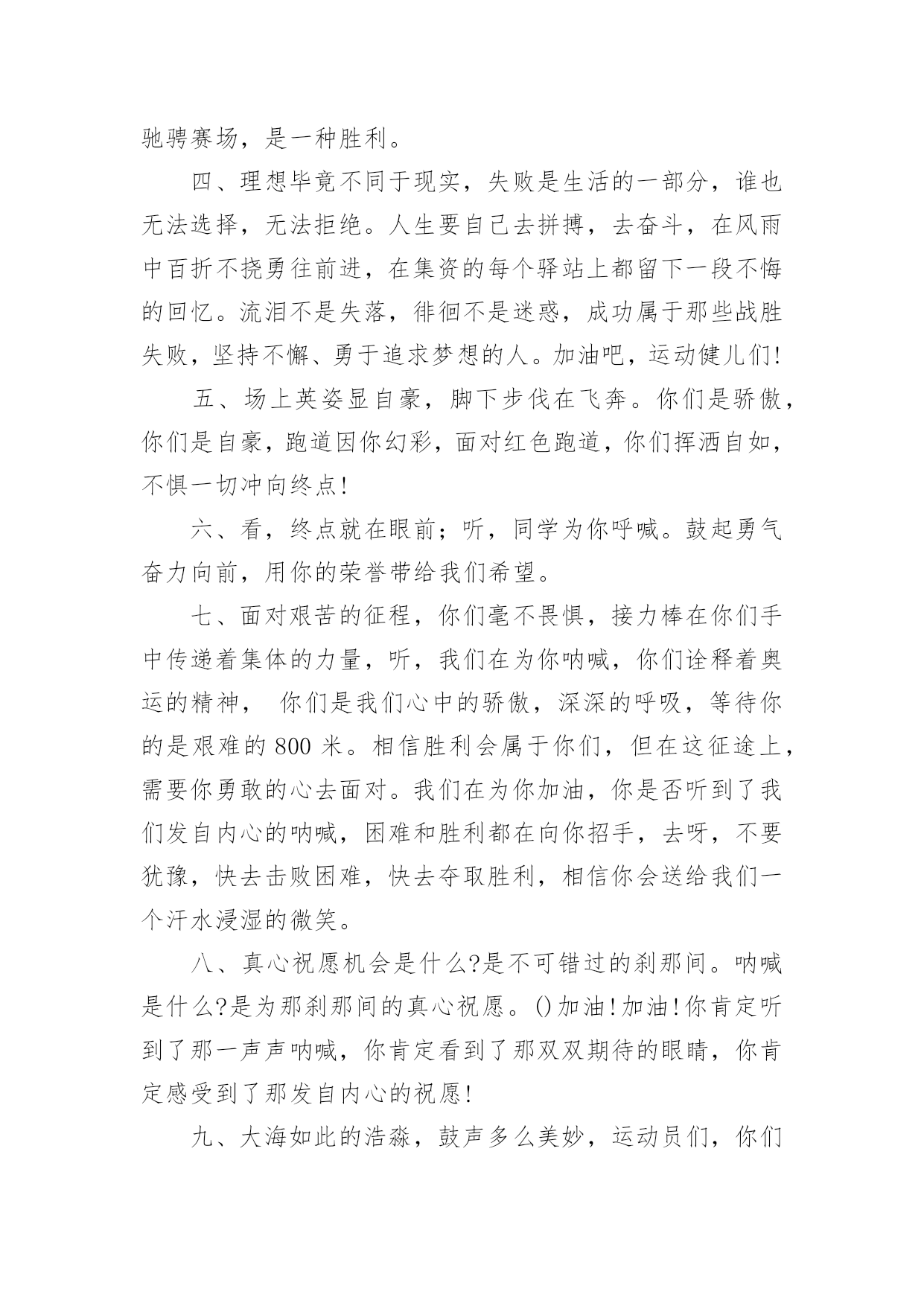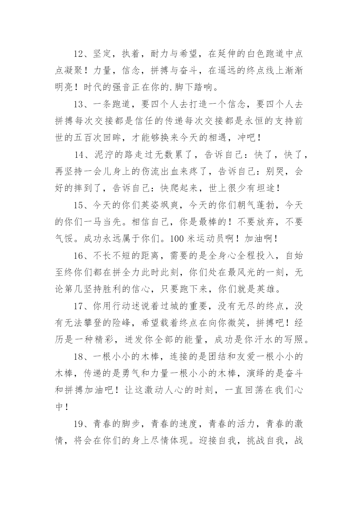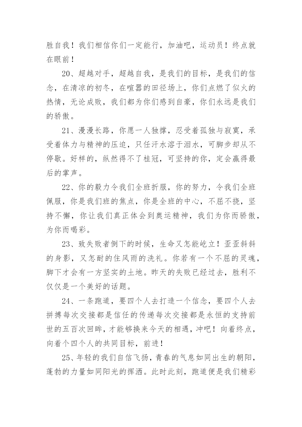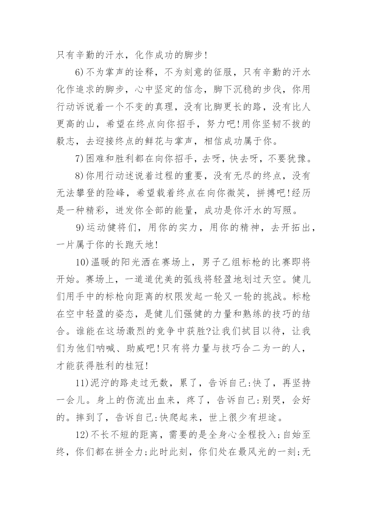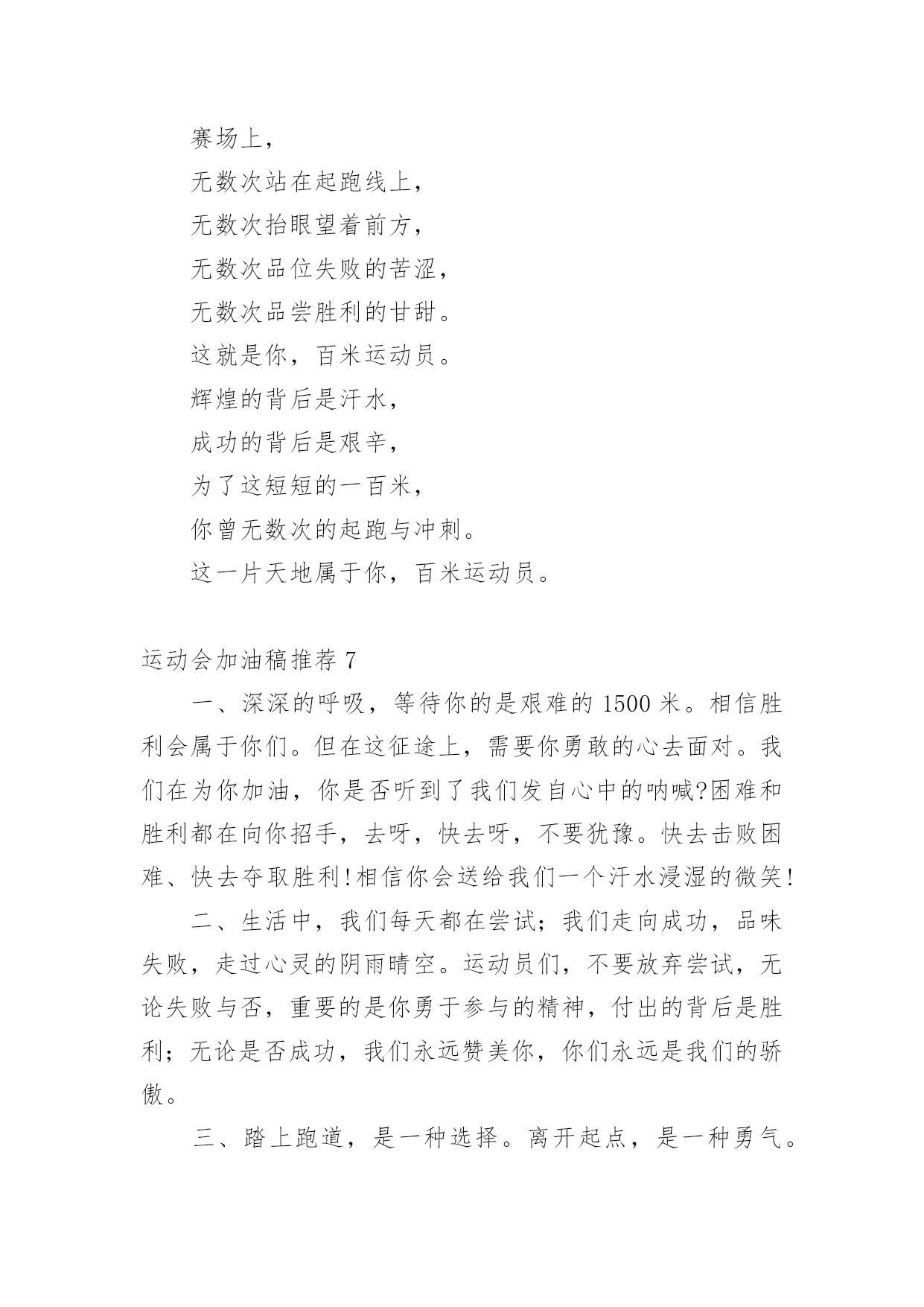 运动会加油稿运动会加油稿推荐随着社会一步步向前发展,越来越多地方需要用到加油稿,加油稿可以激励对方更好地参加活动。写起加油稿来就毫无头绪?下面是小编为大家整理的运动会加油稿推荐,欢迎大家借鉴与参考,希望对大家有所帮助。运动会加油稿推荐11)不为鲜花的围绕,不为刹那的荣耀,只有执着的信念,化作不停的奔跑,心中燃烧着梦想,脚下不停的步伐!2)汗水,泪水;笑声,歌声;我们尽情挥洒。开幕式上,运动场上,我们尽情展现,多少艰辛,多少困苦,我们勇敢承担。因为年轻,因为张扬,因为我们知道:用今天的汗水换来明天的微笑。3)青春的脚步,青春的速度,青春的活力,青春的激情,将会在你们的身上尽情体现。迎接自我,挑战自我,战胜自我!我们相信你们一定能行,加油吧,运动员!终点就在眼前!4)心中坚定的信念,脚下沉稳的步伐,你用行动告诉我们一个不变之理,没有走不完的路,没有过不了的山,成功正在终点冲着你高高的招手,用你那顽强的意志去努力,去迎接终点的鲜花与掌声,相信成功一定是属于你。5)不为掌声的注释,不为刻意的征服,不为失败的痛苦,只有辛勤的汗水,化作成功的脚步!6)不为掌声的诠释,不为刻意的征服,只有辛勤的汗水化作追求的脚步,心中坚定的信念,脚下沉稳的步伐,你用行动诉说着一个不变的真理,没有比脚更长的路,没有比人更高的山,希望在终点向你招手,努力吧!用你坚韧不拔的毅志,去迎接终点的鲜花与掌声,相信成功属于你。7)困难和胜利都在向你招手,去呀,快去呀,不要犹豫。8)你用行动述说着过程的重要,没有无尽的终点,没有无法攀登的险峰,希望载着终点在向你微笑,拼搏吧!经历是一种精彩,迸发你全部的能量,成功是你汗水的写照。9)运动健将们,用你的实力,用你的精神,去开拓出,一片属于你的长跑天地!10)温暖的阳光洒在赛场上,男子乙组标枪的比赛即将开始。赛场上,一道道优美的弧线将轻盈地划过天空。健儿们用手中的标枪向距离的权限发起一轮又一轮的挑战。标枪在空中轻盈的姿态,是健儿们强健的力量和熟练的技巧的结合。谁能在这场激烈的竞争中获胜?让我们拭目以待,让我们为他们呐喊、助威吧!只有将力量与技巧合二为一的人,才能获得胜利的桂冠!11)泥泞的路走过无数,累了,告诉自己:快了,再坚持一会儿。身上的伤流出血来,疼了,告诉自己:别哭,会好的。摔到了,告诉自己:快爬起来,世上很少有坦途。12)不长不短的距离,需要的是全身心全程投入;自始至终,你们都在拼全力;此时此刻,你们处在最风光的一刻;无论第几,坚持胜利的信心,只要跑下来,你们就是英雄!运动会加油稿推荐2漫漫长路,你愿一人独撑,忍受着孤独与寂寞,承受着体力与精神的压迫,只任汗水溶于泪水,可脚步却从不停歇,好样的,纵然得不了桂冠,可坚持的你,定会赢得最后的掌声!这就是小编为大家准备的有关于运动会的加油稿,为了远方迷人的风景,你们放飞了你们的心情,放飞了你们的理想,在那成功的彼岸你们欢笑着,你们成了世间最亮丽的一道风景线。全体运动员们,你们加油,我们为你们喝彩!运动会加油稿推荐3"拼却老红一万点,换将新绿百千重",拼搏的永远是勇者,成功也永远属于勇于拼搏的强者。接力棒传递的是一种精神,一种力量,更传递一种无畏、所向披靡的意志。每个健儿们都在拼,拼体力,拼意志。把自己青春活力尽情挥洒在长长短短的跑道上。拼搏吧,健儿们,用我们的精神去书写我们的青春风貌去展现我们的青春!运动会加油稿推荐4迎接你的,是五千米跑道等待你的,是漫漫征途勇敢的冲吧,勇士们不要畏惧对手的强大你的对手只有自己勇敢的冲吧五千米算不得什么付出的汗水就要得到回报胜利的泪水就要顺颊而下秋风会为你喝彩阳光会为你庆功掌声就要为你响起以上是小编为大家带来的运动会5000米加油稿推荐,生命在于运动,只有运动才能有足够的体力去面对以后的生活。健康在于运动,只有运动才能把自己最好的状态放于学习之中。充满活力的人更能得到上帝的恩赐。运动会加油稿推荐51、虽然你们在场上的时间很短暂,但你们的身影依然停留在人们的脑海里,因为你们是赛场上最可爱的人!2、你们挥舞着充满力量的双臂看着实心球化成美丽的弧线我着实在心里佩服你们你们抛出了自己的最佳水平。3、时间正在流逝,赛道在延伸,成功在你面前展现。心脏的跳动,热血在沸腾,辉煌在你脚下铸就加油吧,健儿们!4、借着奥运的东风迎着观众的喝彩,我们运动起来,奔跑在的跑道上,让我们共同努力,奔跑奔跑,冲向胜利的终点。5、步子迈开,让我们飞驰在红色跑道上,用我们的泪水和热血,更改历史的记录,起立吧,歌唱吧!为我们的勇士加油!6、人生的路,有坦途,也有坎坷;做过的岁月,有欢笑,也有苦涩,泪水告诉我一个跌倒的故事,汗水使我多了一份沉重,几多成熟。7、大海如此的浩淼,鼓声多么美妙,运动员们,你们不再像平时那样渺小,我们默默的祈祷,以你们为骄傲,我们会永远为你们叫好。8