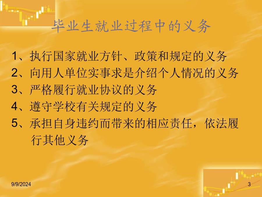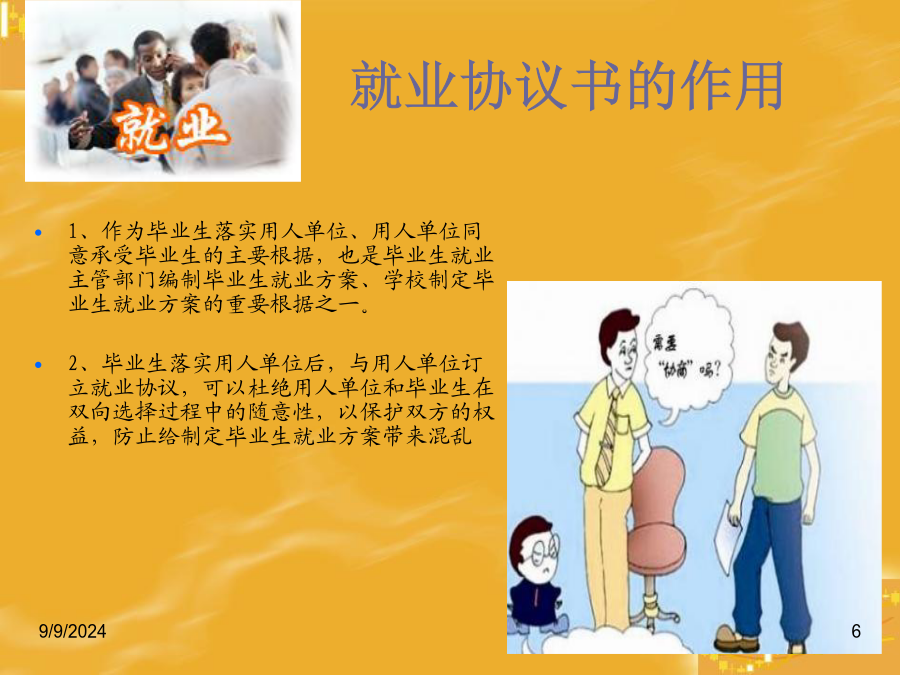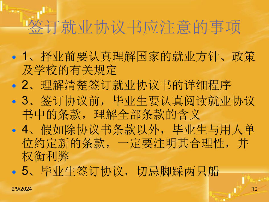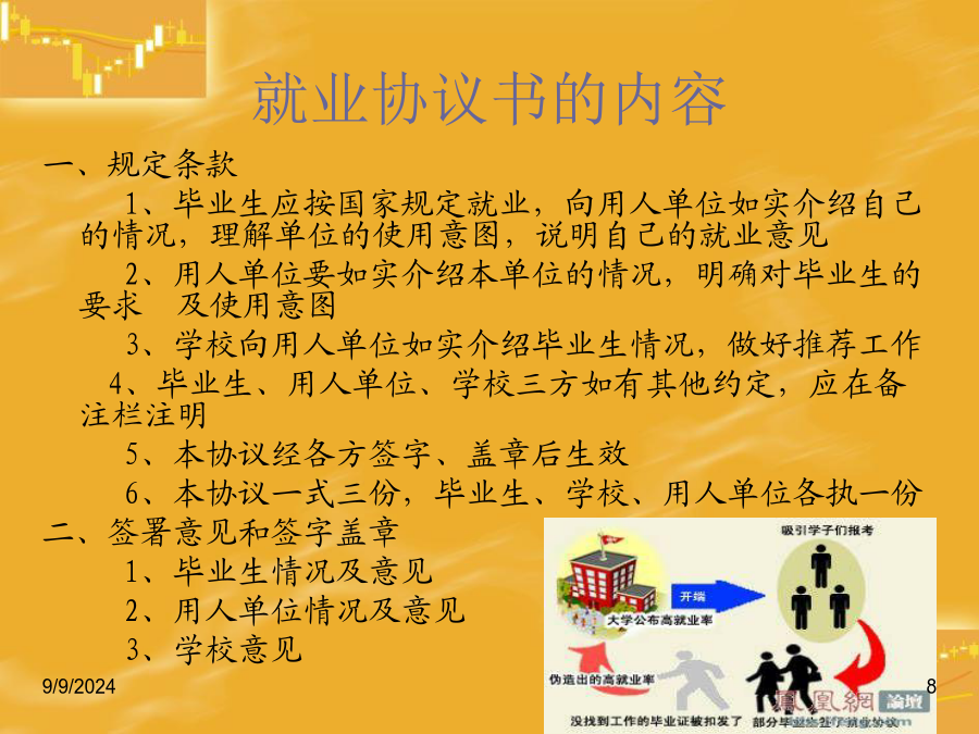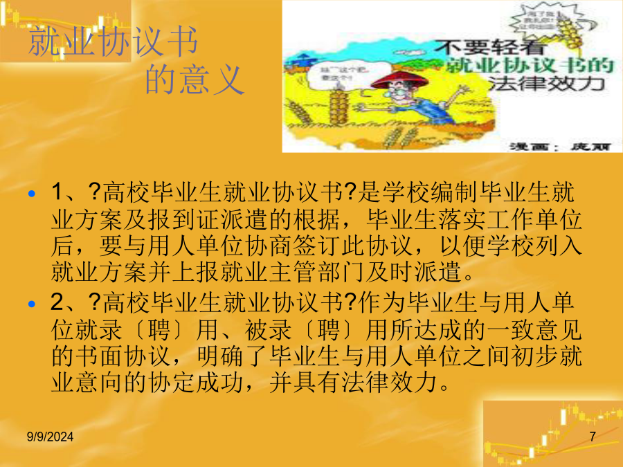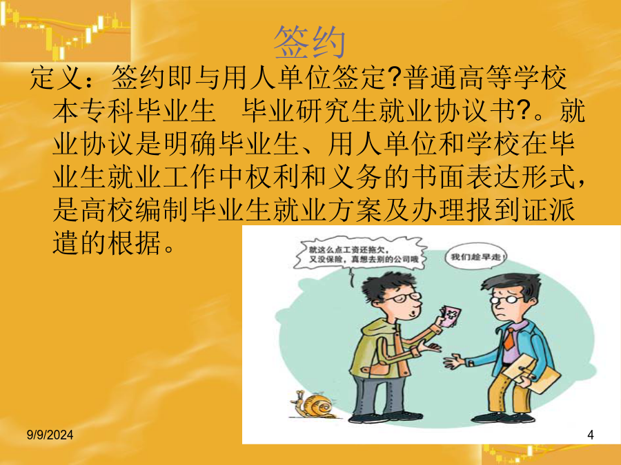 第七章就业协议毕业生就业过程中的权利毕业生就业过程中的义务签约第一部分就业协议就业协议书的作用就业协议书的意义就业协议书的内容就业协议书的程序签订就业协议书应注意的事项毕业生签订?毕业生就业协议书?后违约有那些影响无效协议第八章武汉元兴物贸全体员工签订劳动合同9/9/20242007年6月29日,十届全国人大常委会第二十八次会议高票表决通过?劳动合同法?,国家主席胡锦涛签署主席令予以公布,自2021年1月1日起施行。?中华人民共和国劳动合同法?第十七条劳动合同应当具备以下条款:〔一〕用人单位的名称、住所和法定代表人或者主要负责人;〔二〕劳动者的姓名、住址和居民身份证或者其他有效身份证件号码;〔三〕劳动合同期限;〔四〕工作内容和工作地点;〔五〕工作时间和休息休假;〔六〕劳动报酬;〔七〕社会保险;〔八〕劳动保护、劳动条件和职业危害防护;〔九〕法律、法规规定应当纳入劳动合同的其他事项。劳动合同的期限劳动合同的期限分为有固定期限、无固定期限和以完成一定的工作为期限。无固定期限的劳动合同是指不约定终止日期的劳动合同。以完成一定工作为期限是指以工作完毕的时间为合同终止期限的劳动合同。工作内容即所从事的职位与详细负责的事物。劳动保护和劳动条件比方每天上班8小时、每周不能超过40小时等。用人单位与劳动者协商一致,可以订立无固定期限劳动合同。有以下情形之一,劳动者提出或者同意续订、订立劳动合同的,除劳动者提出订立固定期限劳动合同外,应当订立无固定期限劳动合同:〔一〕劳动者在该用人单位连续工作满十年的;〔二〕用人单位初次实行劳动合同制度或者国有企业改制重新订立劳动合同时,劳动者在该用人单位连续工作满十年且距法定退休年龄缺乏十年的;〔三〕连续订立二次固定期限劳动合同,且劳动者没有本法第三十九条和第四十条第一项、第二项规定的情形,续订劳动合同的。用人单位自用工之日起满一年不与劳动者订立书面劳动合同的,视为用人单位与劳动者已订立无固定期限劳动合同。劳动合同的终止条件即:劳动合同期满或者当事人约定的劳动合同终止条件出现,劳动合同即行终止。劳动者在医疗期、孕期、产期和哺乳期内,劳动合同期限届满时,劳动合同的期限应自动延续至医疗期、孕期、产期和哺乳期满为止。劳动合同的变更即履行劳动合同过程中由于情况发生变化,经双方当事人协商一致,可以对劳动合同部分条款进展修改、补充。劳动合同的未变更部分继续有效。劳动合同的解除是指劳动合同订立后,尚未全部履行以前,由于某种原因导致劳动合同一方或双方当事人提早中断劳动关系的法律行为。劳动合同的解除分为法定解除和约定解除两种。根据?中华人民共和国劳动法?的规定,劳动合同既可以由单方依法解除,也可以双方协商解除。案例分析补充资料:有关试用期的规定签订劳动合同应注意的事项无效的劳动合同新劳动合同规定的八大提醒★就业协议书与劳动合同的不同两者的法律效力、效力时段不同协议书:属部颁规章签订之日至到工作岗位报到之时合同:国家根本法律根据签订的时限两者发生问题处理的部门不同协议书:首先由毕业生和用人单位进展协商,假如获得一致意见,那么报送毕业生所属的学校主管部门,由学校主管部门审查认可后,报上级主管部门批准,予以调整合同:毕业生和用人单位需要向劳动争议调解委员会或劳动仲裁机构,还可以根据?中华人民共和国劳动法?处理劳动纠纷9/9/2024★案情回放解析:案例二小赵国际贸易专业专业毕业。在招聘会上,他看上了一家待遇和条件都不错的外贸公司,经过“过五关、斩六将〞被公司录用了。当他报到时,公司负责人告诉他:“你刚毕业,没什么工作经历,我们给你8000元,待遇是很高,今后,公司还会给你提供很多培训时机,要培养你。为了防止日后由于你个人原因给公司造成损失,在咱们正式签订劳动合同签,请你先交1万元风险抵押金,这是公司的规定。〞小王很看中这份工作,但不知是交还是不交?解析:案例三小郝毕业后被某公司录用,做了一名工人,签了两年劳动合同。没想到公司经常加班,一次公司为赶任务,又要求员工加班,并提出如不加班,予以辞退,每天只有3个小时的休息时间。过了一周,小郝实在熬不住了,于是向老板提出需要休息的要求,老板不准,并说:“谁要不继续加班,不仅要扣除当月的工资、奖金,而且立即辞退。〞小郝气不过向老板递交理解除劳动合同的通知,并要求工厂向他支付解除劳动合同经济补偿金。“你跟我解除合同?我先辞退了你,而且要扣你的工资、扣你的奖金!跟我要补偿金,你做梦去吧!〞老板狠狠的说。小郝回敬到:“你不能这样霸道,咱们找地方评理去……〞解析: