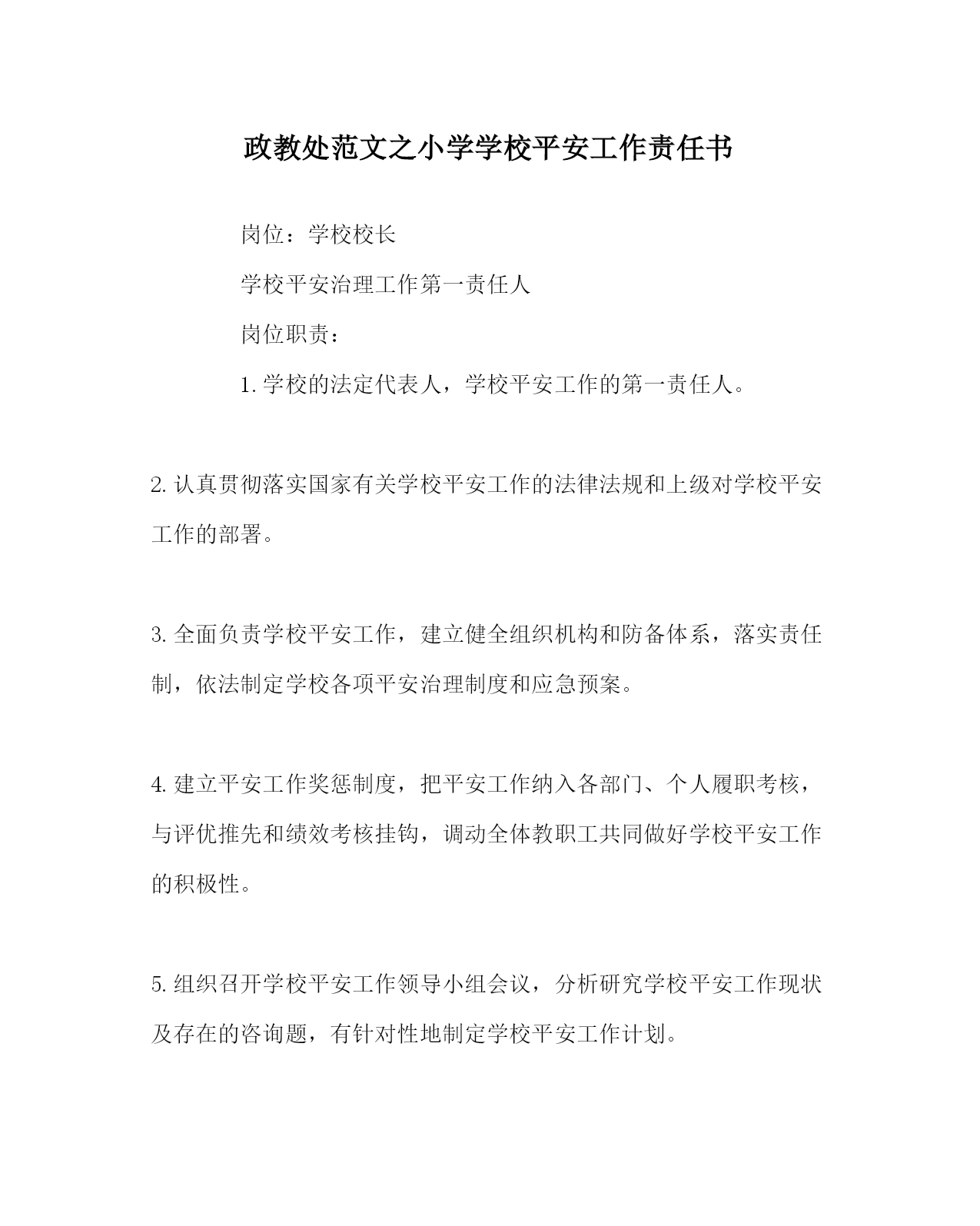 2022年政教处范文小学学校安全工作责任书