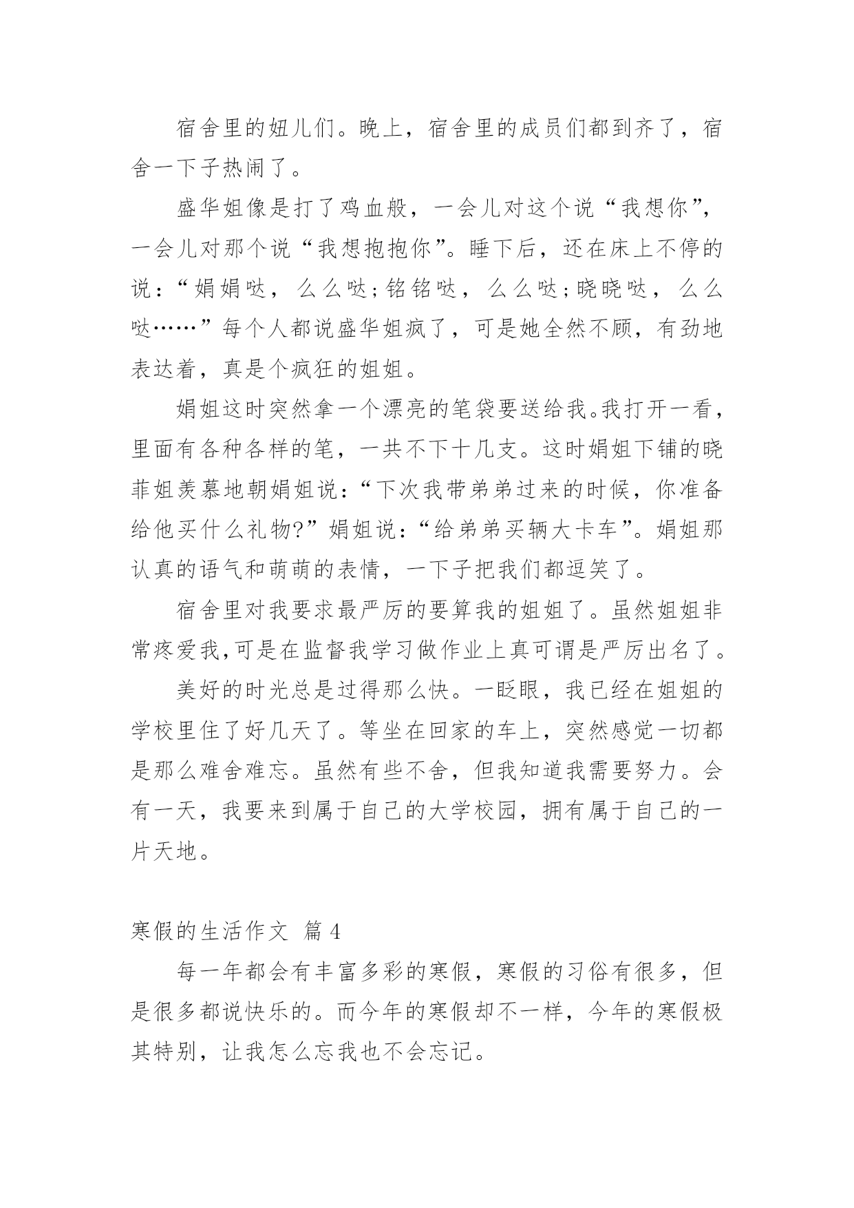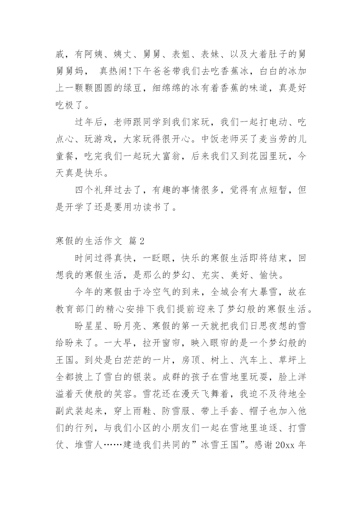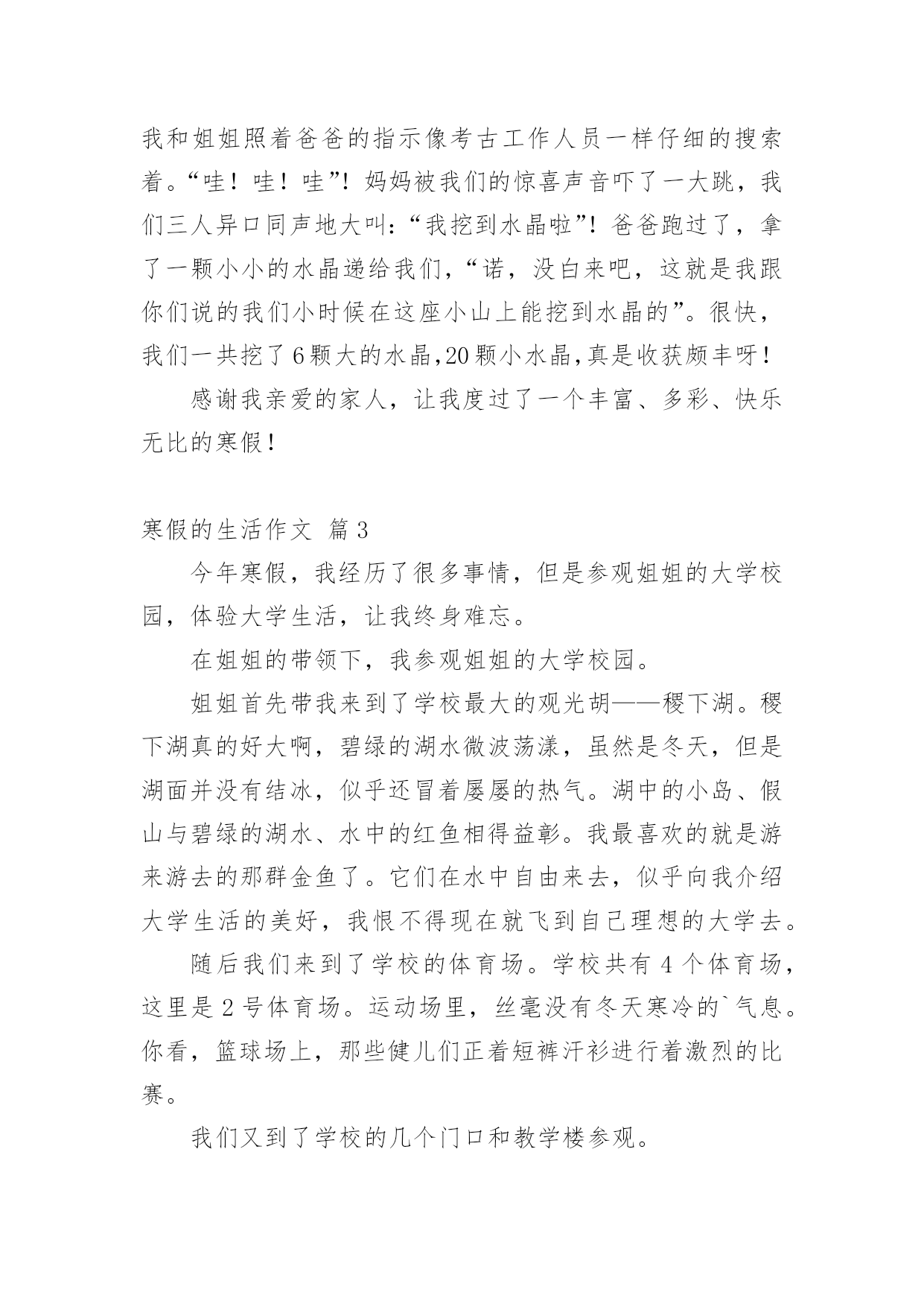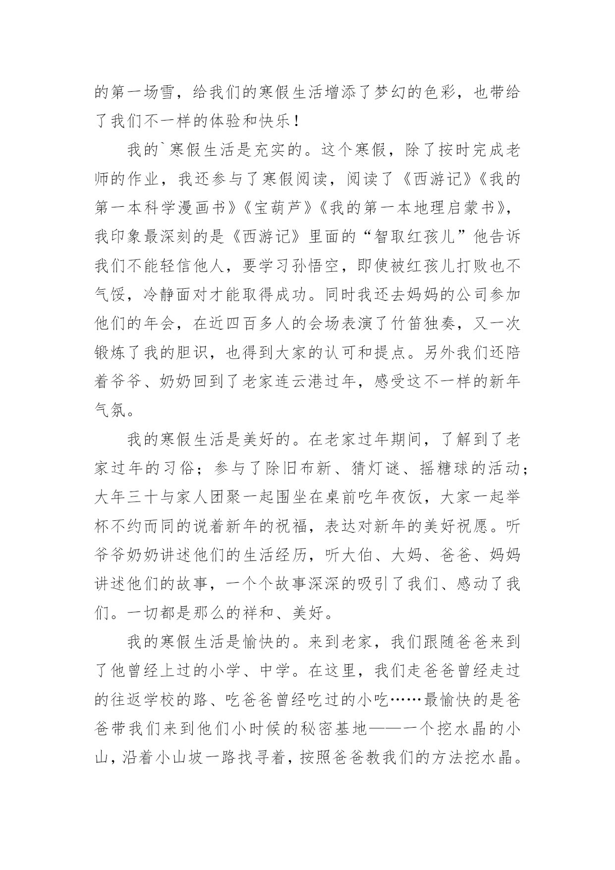 寒假的生活作文实用的寒假的生活作文汇编十篇在现实生活或工作学习中,许多人都有过写作文的经历,对作文都不陌生吧,写作文是培养人们的观察力、联想力、想象力、思考力和记忆力的重要手段。作文的注意事项有许多,你确定会写吗?以下是小编帮大家整理的寒假的生活作文10篇,欢迎大家借鉴与参考,希望对大家有所帮助。寒假的生活作文篇1四个礼拜的假期,真不知是长还是短?因为寒假中每天都像渡日如年,等到开学的前几天,才觉得怎么一下就过去了。回竹山爷爷家时,爸爸带我去文昌武圣庙拜拜。爸爸告诉我文昌拜的是孔子、武圣拜的是关公。拜孔子可以保祐考试考好、学业进步,拜关公可以保祐一年都平平安安。一进到庙里就看到很多人在排队,爸爸说那些人是要安太岁;安太岁后倒楣的事、不好的'事就不会来。烧金纸的时候,看到金炉会把金纸捲进去炉里烧,根本不用人一张张丢进去,很神奇的。年初二时,一大早我们就出发去外公家,因为大年初二是习俗中回娘家的日子。开了二个小时的车到了外婆家,外婆家外面都是一大片的池塘及田,我跟表姐在空地骑自行车。中午在空地上吃饭,二张大圆桌满满丰盛的菜;有好多的亲戚,有阿姨、姨丈、舅舅、表姐、表妹、以及大着肚子的舅舅舅妈,真热闹!下午爸爸带我们去吃香蕉冰,白白的冰加上一颗颗圆圆的绿豆,细绵绵的冰有着香蕉的味道,真是好吃极了。过年后,老师跟同学到我们家玩,我们一起打电动、吃点心、玩游戏,大家玩得很开心。中饭老师买了麦当劳的儿童餐,吃完我们一起玩大富翁,后来我们又到花园里玩,今天真是快乐。四个礼拜过去了,有趣的事情很多,觉得有点短暂,但是开学了还是要用功读书了。寒假的生活作文篇2时间过得真快,一眨眼,快乐的寒假生活即将结束,回想我的寒假生活,是那么的梦幻、充实、美好、愉快。今年的寒假由于冷空气的到来,全城会有大暴雪,故在教育部门的精心安排下我们提前迎来了梦幻般的寒假生活。盼星星、盼月亮、寒假的第一天就把我们日思夜想的雪给盼来了。一大早,拉开窗帘,映入眼帘的是一个梦幻般的王国。到处是白茫茫的一片,房顶、树上、汽车上、草坪上全都披上了雪白的银装。成群的孩子在雪地里玩耍,脸上洋溢着天使般的笑容。雪花还在漫天飞舞着,我迫不及待地全副武装起来,穿上雨鞋、防雪服、带上手套、帽子也加入他们的行列,与我们小区的小朋友们一起在雪地里追逐、打雪仗、堆雪人……建造我们共同的”冰雪王国”。感谢20xx年的第一场雪,给我们的寒假生活增添了梦幻的色彩,也带给了我们不一样的体验和快乐!我的`寒假生活是充实的。这个寒假,除了按时完成老师的作业,我还参与了寒假阅读,阅读了《西游记》《我的第一本科学漫画书》《宝葫芦》《我的第一本地理启蒙书》,我印象最深刻的是《西游记》里面的“智取红孩儿”他告诉我们不能轻信他人,要学习孙悟空,即使被红孩儿打败也不气馁,冷静面对才能取得成功。同时我还去妈妈的公司参加他们的年会,在近四百多人的会场表演了竹笛独奏,又一次锻炼了我的胆识,也得到大家的认可和提点。另外我们还陪着爷爷、奶奶回到了老家连云港过年,感受这不一样的新年气氛。我的寒假生活是美好的。在老家过年期间,了解到了老家过年的习俗;参与了除旧布新、猜灯谜、摇糖球的活动;大年三十与家人团聚一起围坐在桌前吃年夜饭,大家一起举杯不约而同的说着新年的祝福,表达对新年的美好祝愿。听爷爷奶奶讲述他们的生活经历,听大伯、大妈、爸爸、妈妈讲述他们的故事,一个个故事深深的吸引了我们、感动了我们。一切都是那么的祥和、美好。我的寒假生活是愉快的。来到老家,我们跟随爸爸来到了他曾经上过的小学、中学。在这里,我们走爸爸曾经走过的往返学校的路、吃爸爸曾经吃过的小吃……最愉快的是爸爸带我们来到他们小时候的秘密基地——一个挖水晶的小山,沿着小山坡一路找寻着,按照爸爸教我们的方法挖水晶。我和姐姐照着爸爸的指示像考古工作人员一样仔细的搜索着。“哇!哇!哇”!妈妈被我们的惊喜声音吓了一大跳,我们三人异口同声地大叫:“我挖到水晶啦”!爸爸跑过了,拿了一颗小小的水晶递给我们,“诺,没白来吧,这就是我跟你们说的我们小时候在这座小山上能挖到水晶的”。很快,我们一共挖了6颗大的水晶,20颗小水晶,真是收获颇丰呀!感谢我亲爱的家人,让我度过了一个丰富、多彩、快乐无比的寒假!寒假的生活作文篇3今年寒假,我经历了很多事情,但是参观姐姐的大学校园,体验大学生活,让我终身难忘。在姐姐的带领下,我参观姐姐的大学校园。姐姐首先带我来到了学校最大的观光胡——稷下湖。稷下湖真的好大啊,碧绿的湖水微波荡漾,虽然是冬天,但是湖面并没有结冰,似乎还冒着屡屡的热气。湖中的小岛、假山与碧绿的湖水、水中的红鱼相得益彰。我最喜欢的就是游来游去的那群金鱼了。它们在水中自由来去,似乎向我介绍大学生活的美好,我恨不得现在就飞到自己理想的大学去。随后我们来到了学校的体育场。学校共有4个体育场,这里是