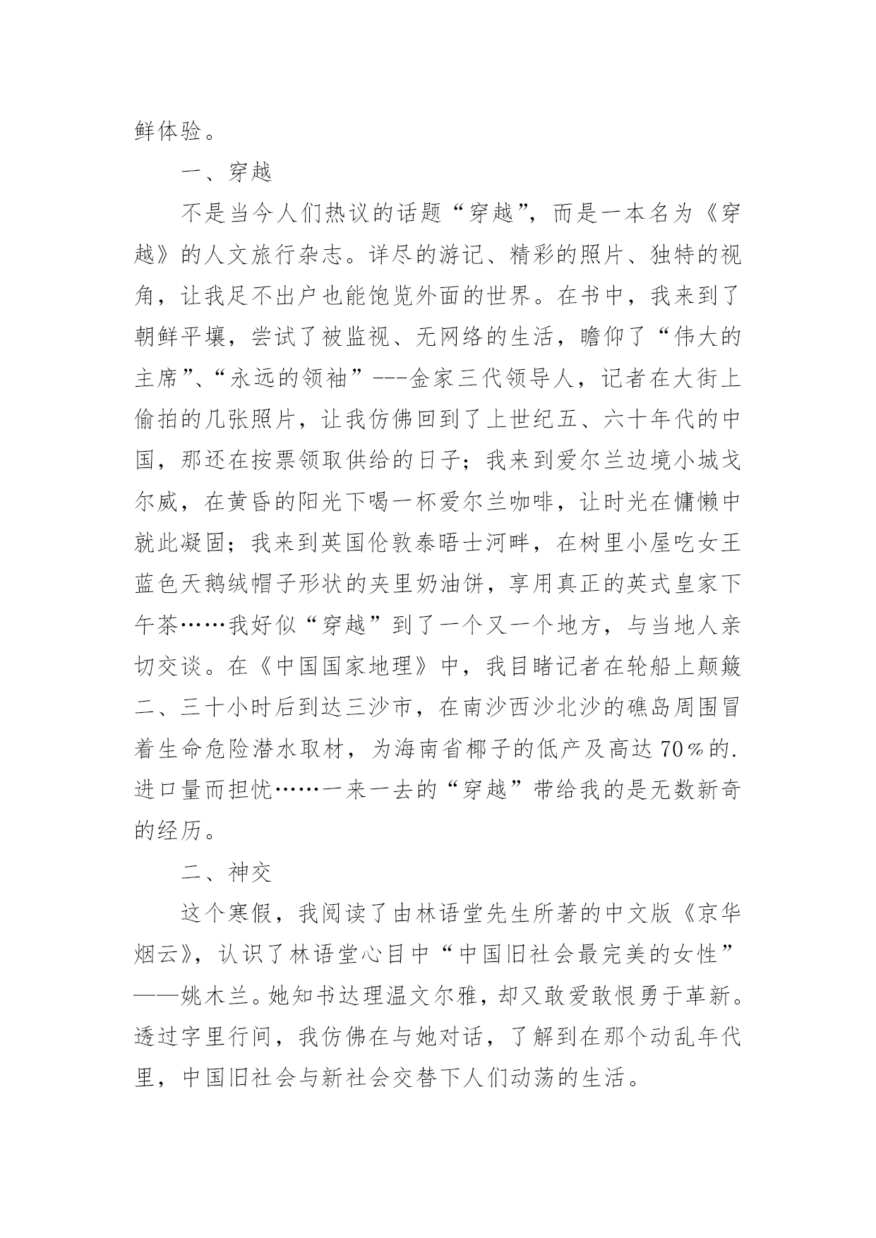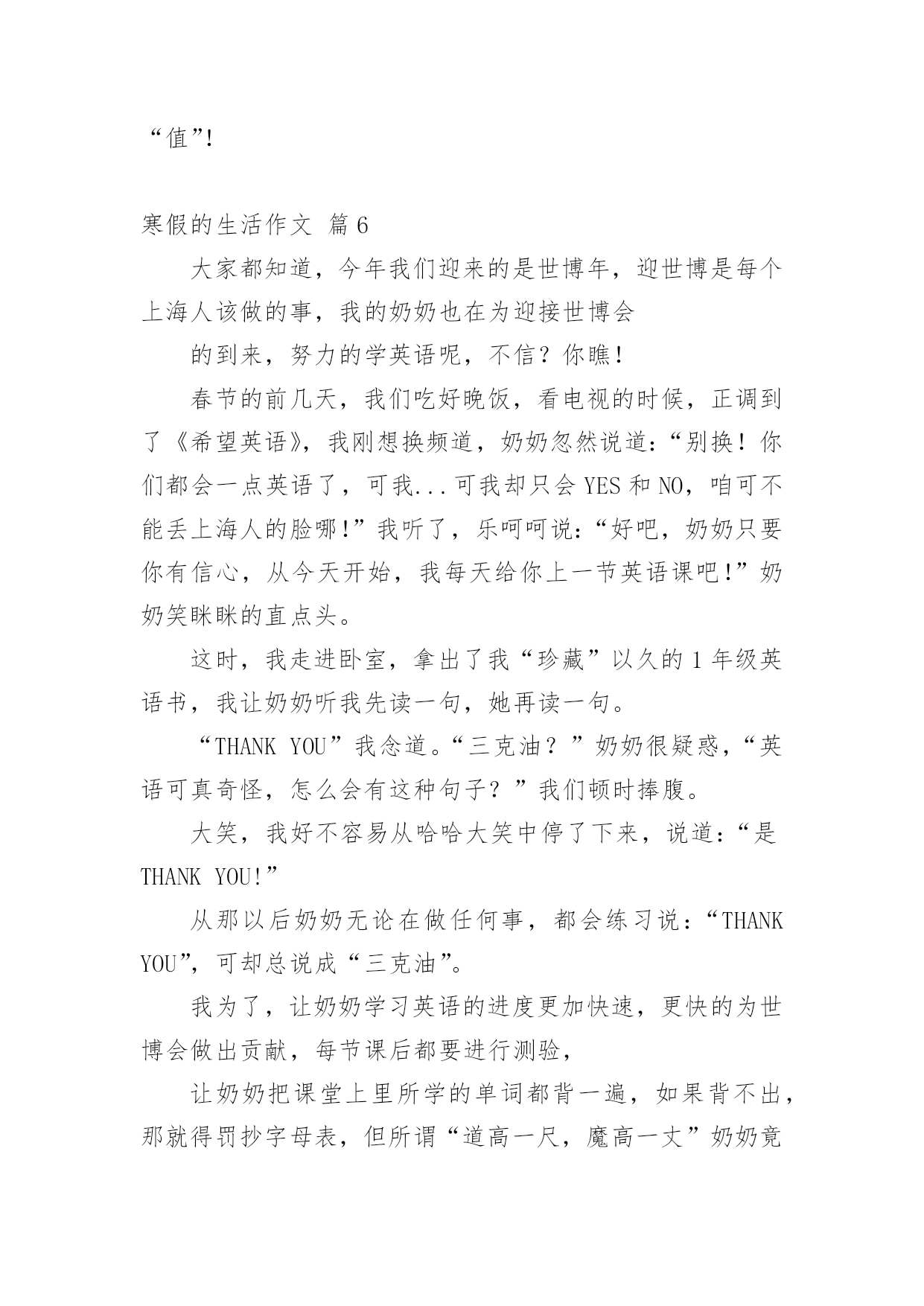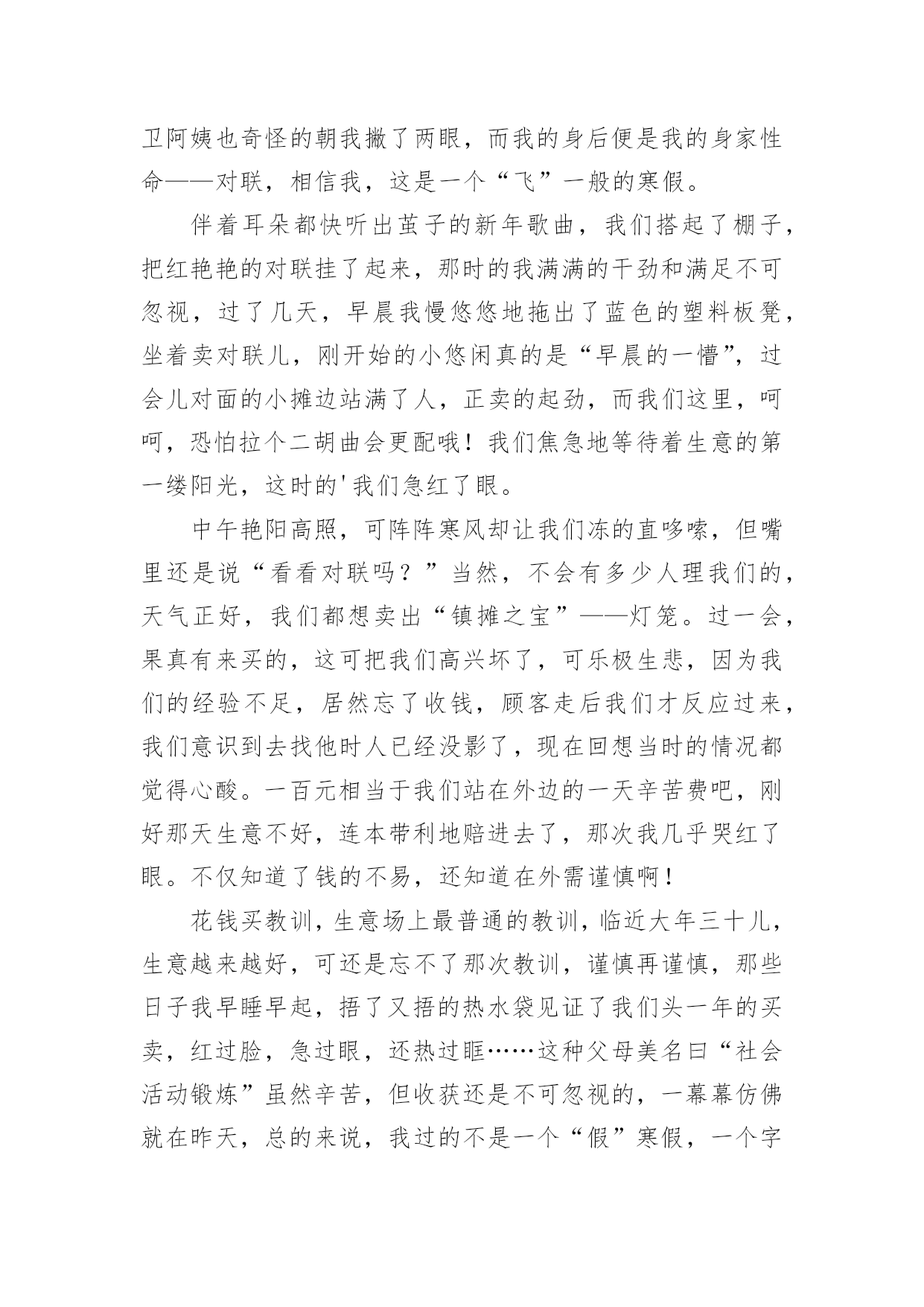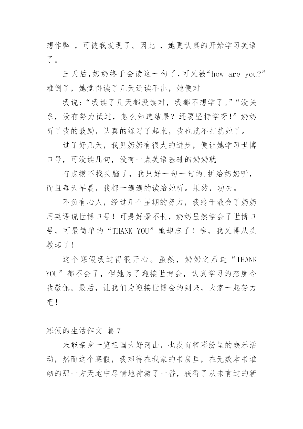 寒假的生活作文实用的寒假的生活作文汇编十篇在现实生活或工作学习中,许多人都有过写作文的经历,对作文都不陌生吧,写作文是培养人们的观察力、联想力、想象力、思考力和记忆力的重要手段。作文的注意事项有许多,你确定会写吗?以下是小编帮大家整理的寒假的生活作文10篇,欢迎大家借鉴与参考,希望对大家有所帮助。寒假的生活作文篇1四个礼拜的假期,真不知是长还是短?因为寒假中每天都像渡日如年,等到开学的前几天,才觉得怎么一下就过去了。回竹山爷爷家时,爸爸带我去文昌武圣庙拜拜。爸爸告诉我文昌拜的是孔子、武圣拜的是关公。拜孔子可以保祐考试考好、学业进步,拜关公可以保祐一年都平平安安。一进到庙里就看到很多人在排队,爸爸说那些人是要安太岁;安太岁后倒楣的事、不好的'事就不会来。烧金纸的时候,看到金炉会把金纸捲进去炉里烧,根本不用人一张张丢进去,很神奇的。年初二时,一大早我们就出发去外公家,因为大年初二是习俗中回娘家的日子。开了二个小时的车到了外婆家,外婆家外面都是一大片的池塘及田,我跟表姐在空地骑自行车。中午在空地上吃饭,二张大圆桌满满丰盛的菜;有好多的亲戚,有阿姨、姨丈、舅舅、表姐、表妹、以及大着肚子的舅舅舅妈,真热闹!下午爸爸带我们去吃香蕉冰,白白的冰加上一颗颗圆圆的绿豆,细绵绵的冰有着香蕉的味道,真是好吃极了。过年后,老师跟同学到我们家玩,我们一起打电动、吃点心、玩游戏,大家玩得很开心。中饭老师买了麦当劳的儿童餐,吃完我们一起玩大富翁,后来我们又到花园里玩,今天真是快乐。四个礼拜过去了,有趣的事情很多,觉得有点短暂,但是开学了还是要用功读书了。寒假的生活作文篇2时间过得真快,一眨眼,快乐的寒假生活即将结束,回想我的寒假生活,是那么的梦幻、充实、美好、愉快。今年的寒假由于冷空气的到来,全城会有大暴雪,故在教育部门的精心安排下我们提前迎来了梦幻般的寒假生活。盼星星、盼月亮、寒假的第一天就把我们日思夜想的雪给盼来了。一大早,拉开窗帘,映入眼帘的是一个梦幻般的王国。到处是白茫茫的一片,房顶、树上、汽车上、草坪上全都披上了雪白的银装。成群的孩子在雪地里玩耍,脸上洋溢着天使般的笑容。雪花还在漫天飞舞着,我迫不及待地全副武装起来,穿上雨鞋、防雪服、带上手套、帽子也加入他们的行列,与我们小区的小朋友们一起在雪地里追逐、打雪仗、堆雪人……建造我们共同的”冰雪王国”。感谢20xx年的第一场雪,给我们的寒假生活增添了梦幻的色彩,也带给了我们不一样的体验和快乐!我的`寒假生活是充实的。这个寒假,除了按时完成老师的作业,我还参与了寒假阅读,阅读了《西游记》《我的第一本科学漫画书》《宝葫芦》《我的第一本地理启蒙书》,我印象最深刻的是《西游记》里面的“智取红孩儿”他告诉我们不能轻信他人,要学习孙悟空,即使被红孩儿打败也不气馁,冷静面对才能取得成功。同时我还去妈妈的公司参加他们的年会,在近四百多人的会场表演了竹笛独奏,又一次锻炼了我的胆识,也得到大家的认可和提点。另外我们还陪着爷爷、奶奶回到了老家连云港过年,感受这不一样的新年气氛。我的寒假生活是美好的。在老家过年期间,了解到了老家过年的习俗;参与了除旧布新、猜灯谜、摇糖球的活动;大年三十与家人团聚一起围坐在桌前吃年夜饭,大家一起举杯不约而同的说着新年的祝福,表达对新年的美好祝愿。听爷爷奶奶讲述他们的生活经历,听大伯、大妈、爸爸、妈妈讲述他们的故事,一个个故事深深的吸引了我们、感动了我们。一切都是那么的祥和、美好。我的寒假生活是愉快的。来到老家,我们跟随爸爸来到了他曾经上过的小学、中学。在这里,我们走爸爸曾经走过的往返学校的路、吃爸爸曾经吃过的小吃……最愉快的是爸爸带我们来到他们小时候的秘密基地——一个挖水晶的小山,沿着小山坡一路找寻着,按照爸爸教我们的方法挖水晶。我和姐姐照着爸爸的指示像考古工作人员一样仔细的搜索着。“哇!哇!哇”!妈妈被我们的惊喜声音吓了一大跳,我们三人异口同声地大叫:“我挖到水晶啦”!爸爸跑过了,拿了一颗小小的水晶递给我们,“诺,没白来吧,这就是我跟你们说的我们小时候在这座小山上能挖到水晶的”。很快,我们一共挖了6颗大的水晶,20颗小水晶,真是收获颇丰呀!感谢我亲爱的家人,让我度过了一个丰富、多彩、快乐无比的寒假!寒假的生活作文篇3今年寒假,我经历了很多事情,但是参观姐姐的大学校园,体验大学生活,让我终身难忘。在姐姐的带领下,我参观姐姐的大学校园。姐姐首先带我来到了学校最大的观光胡——稷下湖。稷下湖真的好大啊,碧绿的湖水微波荡漾,虽然是冬天,但是湖面并没有结冰,似乎还冒着屡屡的热气。湖中的小岛、假山与碧绿的湖水、水中的红鱼相得益彰。我最喜欢的就是游来游去的那群金鱼了。它们在水中自由来去,似乎向我介绍大学生活的美好,我恨不得现在就飞到自己理想的大学去。随后我们来到了学校的体育场。学校共有4个体育场,这里是